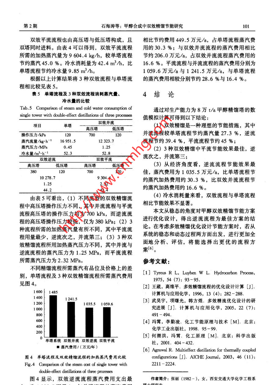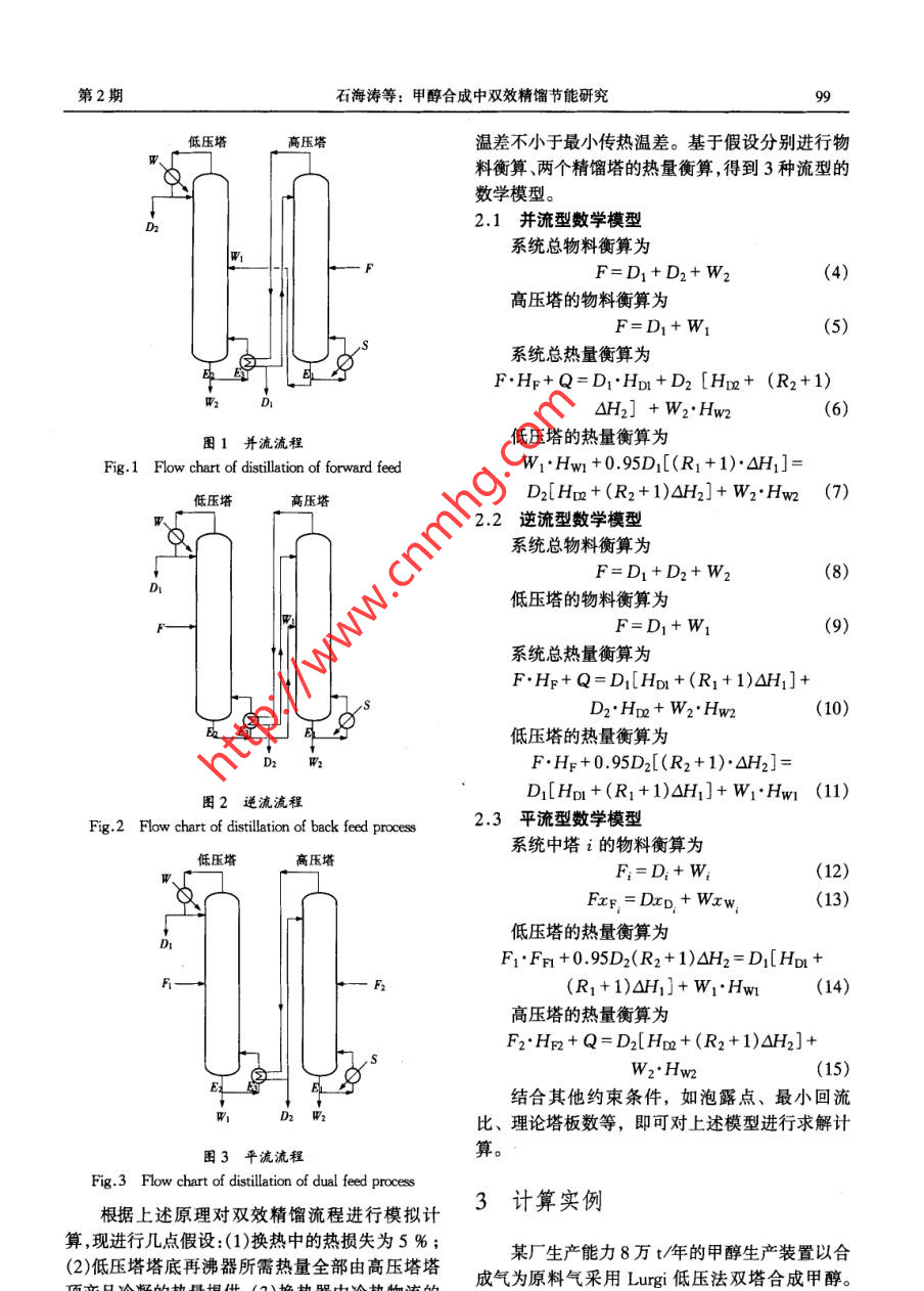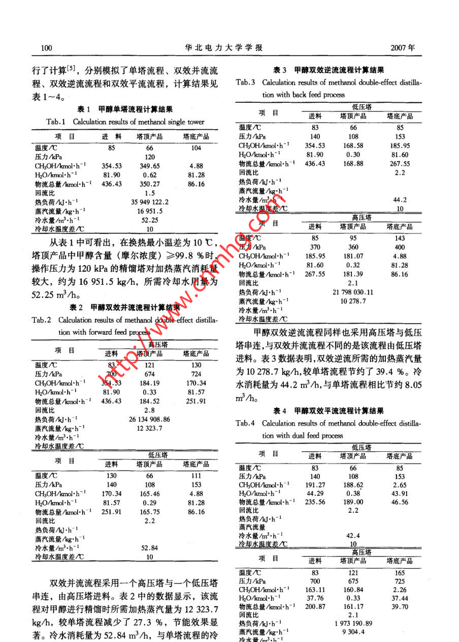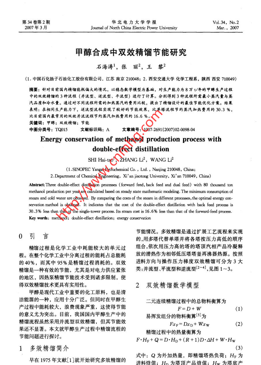 第34卷第2期華北電力大學(xué)學(xué)報(bào)Vol.34, No.22007年3月Journal of North China Electric Power UniversityMar., 2007甲醇合成中雙效精餾節(jié)能研究石海濤,張麗2,王黎2(1.中國(guó)石化揚(yáng)子石油化工股份有限公司,江蘇南京210048; 2. 西安交通大學(xué)化學(xué)工程系,陜西西安710049)摘要:針對(duì)目前國(guó)內(nèi)精餾能耗偏大的情況,以穩(wěn)態(tài)數(shù)學(xué)模型為基礎(chǔ),對(duì)生產(chǎn)能力為8萬t/年的甲醇生產(chǎn)過程中的雙效精餾的3種流程(并流型、逆流型、平流型)進(jìn)行了計(jì)算。分別得到3種流程所需最小蒸汽量與蒸汽品質(zhì)和冷水量。通過對(duì)不同流程所需的加熱蒸汽的費(fèi)用比較,提出了精餾設(shè)計(jì)的最佳節(jié)能優(yōu)化方案。結(jié)果表明:在相同生產(chǎn)能力下,逆流型流程實(shí)現(xiàn)了較好的節(jié)能效果,比單塔流程節(jié)約蒸汽加熱費(fèi)用約30.3 %,比目前國(guó)內(nèi)最常用的雙效并流流程節(jié)約蒸汽加熱費(fèi)用約16.6 %。關(guān)鍵詞:甲醇;雙效精餾;節(jié)能中圖分類號(hào): TQ015文獻(xiàn)標(biāo)識(shí)碼: A文章編號(hào): 1007-2691 (2007)02-0098-04Energy conservation of methanol production process withdouble-effect distillationSHI Hai-tao', ZHANG LR, WANG L;2(1.SINOPEC Yangzi Petrochemical Co.,Ltd. , Nanjing 210048, China;2.Department of Chemical Engineering, Xi' an jiaotong University, Xi' an 710049, China)Abstract: Three double-effect disilation processes (forward feed, back feed and dual feed) with 80 thousand tonmethanol production per year are calculated based on steady state mathematic modeling. The minimum consumption ofsteam and cold water are obtained. By comparing the costs of the steam in different processes, the optimal energy con-servation method is obtained. It indicates that the cost of the double efet dilltion with back feed process is30.3% less than that of the singletowver process. Its steam cost is 16.6% less than that of the forward-feed process.Key words: methanol; double effect disillation; energy conservation節(jié)能情況。多效精餾是通過擴(kuò)展工藝流程來實(shí)現(xiàn)0引言的,用多塔代替單塔并將各塔按壓力高低的順序精餾過程是化學(xué)工業(yè)中耗能較大的單元過組合,依次用壓力高的塔的塔頂汽相產(chǎn)品冷凝釋程。在整個(gè)化學(xué)工業(yè)中分離過程的能耗占總能耗放的潛熱作為相鄰低壓塔塔釜再沸器熱源。按照的40%,而其中95%是精餾過程消耗的。雙效進(jìn)料方向與操作壓力梯度雙效精餾可分為3大精餾是- -種有效的節(jié)能,尤其是對(duì)電力供應(yīng)緊張類:并流型、平流型和逆流型[2~41 ,見圖1~3。的地區(qū),因熱泵精餾節(jié)能技術(shù)受到諸多限制,使得雙效精餾技術(shù)更具有實(shí)用性。2雙效精餾數(shù)學(xué)模型甲醇是現(xiàn)代工業(yè)中重要的化工原料,也是清潔能源的- -種,應(yīng)用十分廣泛。但同時(shí)在甲醇生二元連續(xù)精餾過程中的總物料衡算為產(chǎn)過程中能耗較大,浪費(fèi)現(xiàn)象嚴(yán)重,這使得節(jié)能F=D+ w(1)的意義尤為突出。目前,我國(guó)國(guó)內(nèi)甲醇生產(chǎn)中的易揮發(fā)組分的物料衡算[5]為精餾流程雖然采用并流型雙效精餾,但其節(jié)能效Fxp= Dxp+ Wxw(2)果還不顯著。本文就甲醇生產(chǎn)過程中精餾流程的精餾過程中的熱量衡算為節(jié)能問題進(jìn)行探討。F.Hp+Q= D.Hp+(R +1)D.0H+ W.Hw1多效精餾簡(jiǎn)介(3)早在1975年文獻(xiàn)[1]就開始研究多效精餾的式中: Q為外加熱量,即精餾塔熱負(fù)荷; Hp 為進(jìn)料焓值; Hp為塔頂產(chǎn)品焓值; Hw為塔底產(chǎn)收稿月朔數(shù)糖09-30.品焓值; 0H為塔頂產(chǎn)品的氣化潛熱。第2期石海濤等:甲醇合成中雙效精餾節(jié)能研究99低壓塔高壓塔溫差不小于最小傳熱溫差?;诩僭O(shè)分別進(jìn)行物w、料衡算、兩個(gè)精餾塔的熱量衡算,得到3種流型的數(shù)學(xué)模型。D2.1并流型數(shù)學(xué)模型系統(tǒng)總物料衡算為1F=D1+ D2+ W2(4)高壓塔的物料衡算為F=D1+ W1(5)系統(tǒng)總熱量衡算為F.Hp+Q=D1.Hpr+D2 [Hn2+ (R2+1)W0H2] + W2* Hwz(6)困1并流流程低壓塔的熱量衡算為Fig.1 Flow chart of distllation of forward feedW:.Hwn +0.95D[(R1 + 1).0H;]=D2[Hp2+ (R2+ 1)0H2]+ W2:Hw2 (7)2.2逆 流型數(shù)學(xué)模型F=D1+D2+ W2(8)低壓塔的物料衡算為(9)F.Hp+ Q= DI[Hp1 +(R1+ 1)0H]+D2:Hpe+ W2* Hw2(10)D2 WF.Hp+ 0.9SD2[(R2 + 1).0H2]=D[Hp +(R1+ 1)0H]+ W:.HwI (11)日2 逆流流程2.3平 流型數(shù)學(xué)模型Fig.2 Flow chart of disillation of back feed process系統(tǒng)中塔i的物料衡算為低壓堵F;=D;+ W;(12)W、Fxp,= Dxp,+ Wxw,(13)FA.Fr +0.95D2(R2+ 1)AH2= D[Hpr+一F(R1+ 1)0H]+ W. Hwn(14)高壓塔的熱量衡算為F2.Hn+ Q= D2[Ho2+ (R2 + 1)0H2]+W2* Hw2(15)EEL結(jié)合其他約束條件,如泡露點(diǎn)、最小回流D2 Wz比、理論塔板數(shù)等,即可對(duì)上述模型進(jìn)行求解計(jì)困3平 流流程算。Fig.3 Flow chart of disillation of dual feed process根據(jù)上述原理對(duì)雙效精餾流程進(jìn)行模擬計(jì)3計(jì)算實(shí)例算,現(xiàn)進(jìn)行幾點(diǎn)假設(shè):(1)換熱中的熱損失為5 %;某廠生產(chǎn)能力8萬t/年的甲醇生產(chǎn)裝置以合(2)低壓塔塔底再沸器所需熱量全部由高壓塔塔成氣為原料氣采用Lurgi低壓法雙塔合成甲醇。頂產(chǎn)品冷凝的熱量提供;(3)換熱器中冷熱物流的運(yùn)用上述數(shù)學(xué)模型對(duì)其生產(chǎn)過程中的精餾流程進(jìn)100華北電力大學(xué)學(xué)報(bào)2007年行了計(jì)算[5],