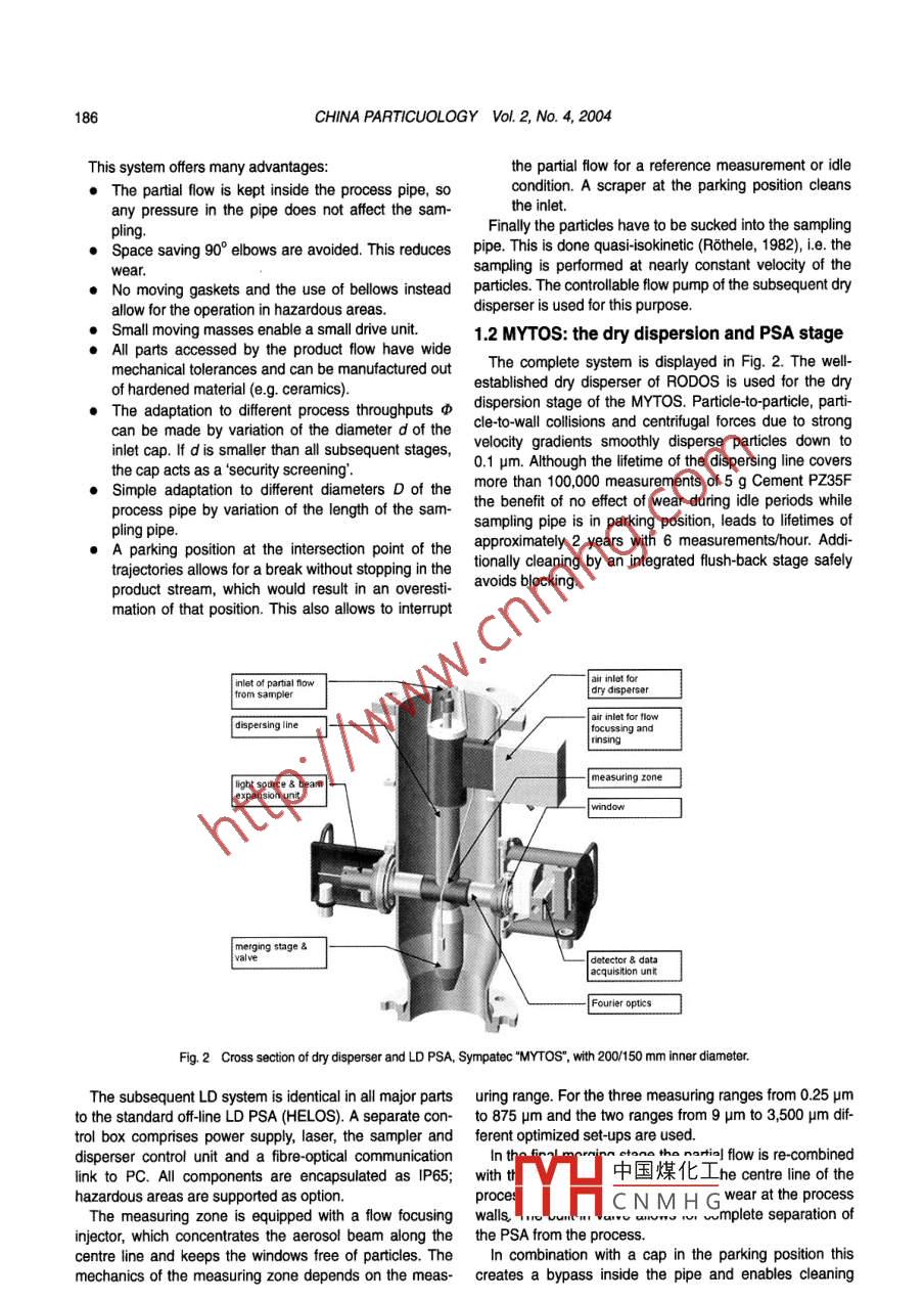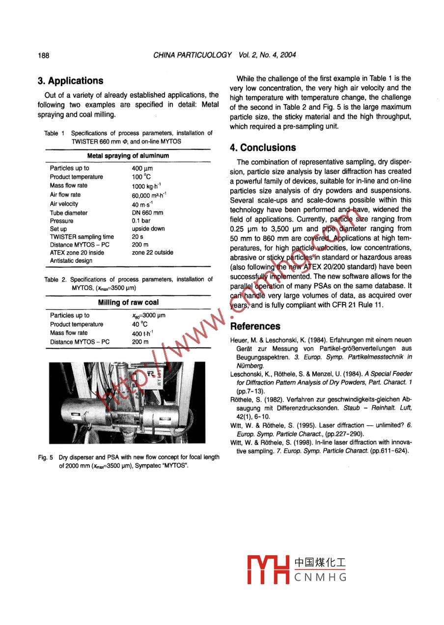 CHINA PARTICUOLOGY Vol. 2, No. 4, 185- 188, 2004IN-LINE PARTICLE SIZING FORPROCESS CONTROL IN NEW DIMENSIONSWolfgang Witt, Michael Heuer and Markus SchallerSympatec GmbH, System-Partikel Technik, Burgtatter StraBe 6, D .38678 Clausthal-llerfeld, GemanyAbstract The combination of laser dffraction with upstream sampling realized a break-through for the in and on-lineparticles size analysis in industrial applications. Today, the combination of representative sampling, dry dispersion, parti-cle size analysis by laser dffraction and integrated feedback of the sample is well accepted in many industrial applica-tions. No more interactions of the user are required, and for standard applications the on.line monitoring of particle sizesbecame nearly as simple as the monitoring of any other process parameter. The increase of inspection interval from24-hour operation to months has increased user confidence in this technology, and industies with more demandingmeasurement requirements are seeking to benefit from this performance. This challenge could not be solved with simplescale-ups or scale-downs. New solutions had to be found for the sampling system, the measuring sensor, the adaptationto the environmental conditions and the processing of fast growing volume of data.Keywords in-line, particle size analysissplit samples, the remaining errors resulting from sampling1.Introductionstrongly dominate. So for reliable in-line particle sizeAn on-line system for particle size analysis (PSA) withanalysis representative sampling is of decisive importance.In a pipe the whole cross-section has to be scanned and allthe subsequent stages of representative sampling, effec~areas must contribute equally weighted. The mechanicaltive dry dispersion (Leschonski et al, 1984) and PSA by solution ofered by the TWISTER mechanics is shown inmeans of laser dffraction (LD) was already displayedFig. 1. The opening of the sampling tip is driven on a spiralabout two decades ago (e.g., Heuer & Leschonski, 1984).line with varying velocity v. The velocity is contrlled in aAs many subsequent process stages are connected by way that equal areas are scanned in equal times. Thepipes an innovative solution was offered by (Witt & Rothele,change of the aspect ratio of the opening due to the incli-1995; Witt & Rothele, 1998), which itegrated the complete nation is also taken into account. In the patented em-sampling and measuring system inside a pipe- repre- bodiment e.g. a system of connected levers is used, assenting a real in-line system. This solution consists outof displayed in Fig. 1. Combined with the rotation a nut istwo devices, the representative sampler "TWISTER" and driven on a vertical thread varying the value of z and hencethe subsequent dry disperser and PSA“MYTOS".the value rvia Eq. (1).1.1 TWISTER: the representative samplingstageH| ((H-1)(1)As modern LD PSAs usually have reproducibilty interms of standard deviations of less than 0.1% for wellO中國煤化工MYHCNMHGFig. 1 Let: tajetories of sampling orifice, centre: lever actin, right: sampling finger mechanics.186CHINA PARTICUOLOGY Vol. 2, No. 4, 2004This system offers many advantages:the partial flow for a reference measurement or idle●The partial flow is kept inside the process pipe, socondition. A scraper at the parking position cleansany pressure in the pipe does not affect the sam-the inlet.Finally the particles have to be sucked into the samplingpling.Space saving 90° elbows are avided. This reduces pipe. This is done qusisokinetic (Rothele, 1982), i.e, thewear.sampling is performed at nearly constant velocity of the●No moving gaskets and the use of bllws instead partcles. The cotollablel flow pump of the subsequent dnyallow for the operation in hazardous areas.disperser is used for this purpose.●Small moving masses enable a small drive unit.1.2 MYTOS: the dry dispersion and PSA stageAll parts accessed by the product flow have wideThe complete system is displayed in Fig. 2. The well.mechanical tolerances and can be manufactured outestablished dry disperser of RODOS is used for the dryof hardened material (e.g. ceramics).●The adaptation to dferent process throughputs φdispersion stage of the MYTOS. Particle-to-particle, parti-can be made by variation of the diameter d of thecle-to-wall collisions and centrifugal forces due to stronginlet cap. If d is smaller than all subsequent stages,velocity gradients smoothly disperse particles down to0.1 um. Although the lifetime of the dispersing line coversthe cap acts as a 'security screening' .Simple adaptation to diferent diameters D of themore than 100,000 measurements of 5 g Cement PZ35Fprocess pipe by variation of the length of the sam-the benefit of no eftect of wear during idle periods whilesampling pipe is in parking position, leads to lifetimes ofpling pipe.A parking position at the intersection point of theapproximately 2 years with 6 measurementshour. Addi-trajectories allows for a break without stopping in thetionally cleaning by an integrated flush-back stage safelyproduct stream, which would result in an overesti-avoids blocking.mation of that position. This also allows to interrupt| aitr inlet forinlet of parial flowfrom samplerl dry disperserI air inlet for flowI dispersing linefocussing andrinsingmeasuring zone[ light source & bean| expansion unitwindow| merging stage名| detector & dataacquistion untFourier opticsFig.2 Cross section of dry disperser and LD PSA, Sympatec "MYTOS" with 200/150 mm inner diameter.The subsequent LD system is identical in all major parts uring range. For the three measuring ranges from 0.25 umto the standard f-line LD PSA (HELOS). A separate con- to 875 um and the two ranges from 9 um to 3,500 μm dif-trol box comprises power supply, laser, the sampler and ferent optimized setups are used.disperser control unit and a fibre-optical communication| flow is re-combinedlink to PC. All components are encapsulated as IP65; with tl中國煤化工he centre line of thehazardous 
