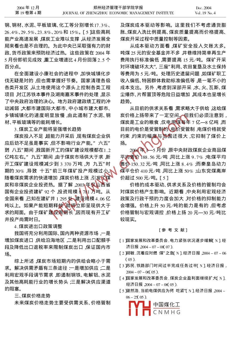 2004年12月鄭州經(jīng)濟(jì)管理干部學(xué)院學(xué)報(bào)Dec. 2004第19卷第4期JOURNAL OF ZHENGZHOU ECONOMIC MANAGEMENT INSTTUTEVol.19 No.4煤炭供求關(guān)系與價(jià)格走勢呂朝暉(鄭州經(jīng)濟(jì)管理干部學(xué)院管理系河南鄭州451191 )摘要在相當(dāng)長的時(shí)期內(nèi)煤炭產(chǎn)業(yè)仍是我國重要的基礎(chǔ)產(chǎn)業(yè)。長期看煤炭供小于求短期看供略小于求供求關(guān)系應(yīng)較為協(xié)調(diào)。目前的煤炭供求關(guān)系不協(xié)調(diào)主要受制于煤炭運(yùn)輸、電煤價(jià)格管制等因素。未來煤炭價(jià)格走勢主要受供需關(guān)系、價(jià)格管制及煤炭成本驅(qū)動等影響。關(guān)鍵詞煤炭供給需求煤炭價(jià)格預(yù)測中圖分類號:F407 .25文獻(xiàn)標(biāo)識碼:A文章編號:1671 - 4989( 2004 )4 - 0016- 03-、煤炭長期供求關(guān)系要百年以上的時(shí)間。當(dāng)前我國再生能源、核能、氫煤炭是我國最廉價(jià)、最可靠、完全可以清潔利用能、風(fēng)能、太陽能的開發(fā)利用雖然有了很大發(fā)展,但和不可再生的自然資源。在一次能源生產(chǎn)和消費(fèi)構(gòu)是開發(fā)利用速度依然趕不上石油和天然氣資源枯竭成中20世紀(jì)80年代煤炭始終保持在75%以上現(xiàn)的速度。綜上所述煤炭依然是我國最主要的能源。在仍保持在70%左右。經(jīng)能源專家預(yù)測,2020 年以煤炭是最廉價(jià)的能源。煤炭開發(fā)利用成本低。前煤炭依然是我國的主要能源,在一次能源消費(fèi)構(gòu)據(jù)我國一五”到九五"的統(tǒng)計(jì)資料顯示,雖然煤炭成中的比重不會低于60% ,50 年內(nèi)不會低于50%。工業(yè)總投資2450.83億元,僅為石油工業(yè)投資在將來相當(dāng)長的時(shí)期內(nèi)煤炭產(chǎn)業(yè)仍將是我國重要(5637.09億元)的43.5% ,但煤炭在我國一次能源的基礎(chǔ)產(chǎn)業(yè)煤炭仍將是我國能源安全的基石。生產(chǎn)或消費(fèi)總量的比重,始終是石油和天然氣的3豐富的煤炭資源是我國最可靠的能源。據(jù)統(tǒng)倍以上國家以較小的投入獲得較大的能源供應(yīng)份計(jì)我國查明化石能源資源量為7456億噸標(biāo)準(zhǔn)煤。額。在國際上按同等熱值計(jì)算天然氣、石油的價(jià)格煤炭、石油、天然氣累計(jì)查明資源儲量分別為10201是煤炭的4- -5倍。2000 年,我國原油進(jìn)口7 026.5億噸、160億噸、20 606億立方米分別占不可再生能萬噸噸油耗資211.5美元當(dāng)年我國國有重點(diǎn)煤礦源查明資源儲量7 456 億噸標(biāo)準(zhǔn)煤的96. 57%、出礦價(jià)僅為139.69元/噸。由此看來,國內(nèi)石油和3.06%、0.37%。世界上煤炭資源的開采年限大大天然氣價(jià)格大大高于煤炭價(jià)格。高于石油和天然氣。煤炭是完全可以清潔利用的能源。我國煤炭主.我國近期可替代煤炭的能源資源品種雖多但要是用于發(fā)電?;痣娛俏覈饕慕K端能源。當(dāng)數(shù)量有限。當(dāng)前水能和核能發(fā)展較快,但仍存在許前我國燃煤電廠采用煙氣脫硫措施的火電機(jī)組容多制約因素。水能開發(fā)周期長投資大對生態(tài)環(huán)境量僅為500萬千瓦左右,占 2002年火電裝機(jī)容量26影響大舉世聞名的三峽工程遭遇反對的聲音很強(qiáng)555萬千瓦的1.9%,因此煤炭產(chǎn)品粗放式燃燒是烈這是重要的原因。三門峽大壩的修建方案受蘇我國當(dāng)前重要的煤煙型污染源。目前國內(nèi)外先進(jìn)聯(lián)專家的主導(dǎo)未考慮排沙上游泥沙淤積造成了生火力發(fā)電的實(shí)踐充分證明燃煤電廠可以安裝高效態(tài)問題。核能建設(shè)周期更長投資更大,且核燃料棒脫硫設(shè)備高效除塵設(shè)備和可以減少氧化氮的燃燒的來源及廢棄處理存在困難??傊?在相當(dāng)長的時(shí)器等環(huán)境保護(hù)設(shè)備消除煤煙型污染。燃煤電廠采期內(nèi)水能和核能在能源總量構(gòu)成中還會大大低于用脫硫、除塵和燃?xì)饴?lián)合循環(huán)發(fā)電技術(shù)完全可以實(shí)煤炭、石油的比重。雖然核能、氫能和可以再生的新現(xiàn)煤炭清潔燃燒和提高發(fā)電效率。能源將進(jìn)一步開發(fā)和利用,最終會取代化石能源的中國煤化工|對短缺的國家。1992主體地位但據(jù)專家初步估計(jì)實(shí)現(xiàn)這一轉(zhuǎn)變至少需年我MYHCNMH G生產(chǎn)能源總量,從1993收稿日期2004-09 - 23作者簡介:呂朝暉( 1966- ),女 河南焦作人鄭州經(jīng)濟(jì)管理干部學(xué)院管理系副教授。6..呂朝暉煤炭供求關(guān)系 與價(jià)格走勢年起就成為石油凈進(jìn)口國。2000年我國能源生產(chǎn)以上。[2在許多電廠里預(yù)備夏季高峰期的庫存電總量為10.9億噸標(biāo)準(zhǔn)煤能源消費(fèi)總量為12. 8億煤被提前消耗部分電廠煤炭庫存僅夠用2- -3天,噸標(biāo)準(zhǔn)煤。中國能源消費(fèi)約占全世界的1/10成為遠(yuǎn)低于正常的庫存警戒線。世界.上僅次于美國的第二大能源消費(fèi)大國能源缺但以上情況并不表明煤炭供應(yīng)將在未來3--5口達(dá)14. 84%,2003 年我國進(jìn)口石油達(dá)9 112 萬噸。年內(nèi)持續(xù)緊張。原因在于:隨著我國實(shí)現(xiàn)工業(yè)化和全面建設(shè)小康社會取得進(jìn)1.煤炭的供應(yīng)環(huán)節(jié)能力受限并不表明供應(yīng)量本展能源的缺口還會進(jìn)一步加大能源供需矛盾日益身的稀缺突出。我國用煤地區(qū)主要集中在