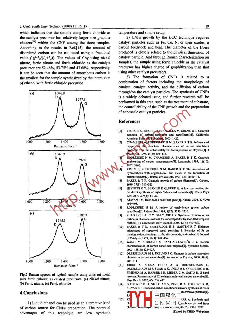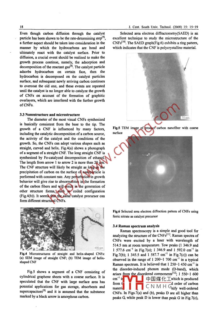 J Cent. South Univ. TechnoL. (2008)15: 15-19DOI:10.1007/s1l771-008000402 SpringerSynthesis of carbon nanofibers by ethanol catalytic combustion techniqueLI Fei(李飛, ZoU Xiao-ping(鄒小平, CHENG Jin(程進(jìn), ZHANG Hong-dan(張紅丹)REN Peng"fei(任鵬飛), WANG Mao-fa(王茂發(fā)), ZHU Guang(朱光)( Research Center for Sensor Technology, Beijing Information Technology Institute, Beijing 100101, China)Abstract: a general, simple and economic synthetic method for synthesizing carbon nanofibers was presented. In the method,ethanol was employed as carbon source; metal salts such as nickel nitrate, ferric nitrate and ferric chloride were used as catalystrecursor respectively; copper plate was employed as the support material. A lot of products were obtained by catalytic combustiodeposition of ethanol vapor. Then the as-prepared carbon nanofibers were characterized by field-emission scanning electronicroscopy, transmission electron microscopy, Raman spectroscopy, energy dispersion X-ray spectroscopy and selected-area electrondiffractometry. By analyzing the results of characterization, the conclusions are as follows: 1)the large catalyst particles tend to formlarge-diameter CNFs, small catalyst particles are inclinable to form small-diameter CNFs; 2)the morphology of the catalyst canaffect the final morphology of the CNFs. Moreover, the possible growth mechanisms were proposed and the degree of graphitizationof samples was estimated by Raman spectroscopy characterizationKey words: synthesis; ethanol catalytic combustion; carbon nanofibers; growth mechanism; degree of graphitizationI Introduction2 Experimentalrecent years, carbon nanofibers(CNFs)haveCNFs were formed by ECC over catalyst derivedbecome a promising research direction. It is considered from the catalyst precursors(ferric nitrate or nickelto have widely potential applications for their remarkable nitrate or ferric chloride supported on substrate.Theproperties that are similar to those of carbon nanotubes, remarkable feature of the synthetic method is the use ofsuch as high elastic modulus, strong strain, and highthe very common laboratory ethanol burnersconductivity. Syntheses of CNFs have been investigatedThe experimentsperformed in air underfor a wide range of applications today because CNFs of atmospheric pressure. The first step was to prepare thedifferent morphologies are required. So many synthetic catalyst particles that approximately determined the finalapproaches have been developed for synthesizing carbon diameter of the CNFs. Here, the wet chemical methodnanofibers, for instance, electric arc discharge, plasma was used, that is, a liquid solution containing catalystenhanced chemical vapor deposition (PECVD) and precursor in the form of metal salts such as ferric nitratechemical vapor deposition(CVD)2). However, current or nickel nitrate or ferric chloride was dropped to thesubstrate. Some quantities of metal salt were dissolved insynthetic methods suffer from high cost, complex the pure ethanol. And then the prepared solution wassonicated for tens of minutes to form a suspension ofCNFs(also known as carbon filaments) can be catalyst precursor, which provided small catalystgrown from the catalytic decomposition of certain precursor particles. One drop of the saturated catalysthydrocarbons over small catalyst particles such as iron, precursor solution was dropped with a dip-pen to thecobalt, nickel, some metal alloys and metal oxide. The copper support material, which was then placed in andiameter of the nanostructure is generally controlled by inner flame for several minutes without introducing anyhe size of the catalyst particleother gases for the CNFs growth. After a desired time,In this work, an altermative way was developed to wool-like products accumulated on the copper platesynthesize carbon nanofibres by ethanol catalytice carbon deposits were collected from thecombustion(ECC) technique by using pure ethanolsubstrate. And then the samples were examined by athe fuel, metal salt as the catalyst precursor and copper as JEOL 6500F scanning electron microscope(SEM),the substrate materialhich was used to observe the morphology of the CNfsFoundation item: Project(66167044)supported by the Academic Human Resources Deyg under the Jurisdictionof Beijing, China; Project(66062021)supported by the Science andH中國煤化工ωFellow Abroad.CNMHGCorresponding author: ZOU Xiao-ping, PhD; Tel: +86-10-64884673-816; Fax: +86-10-64879486: E-mail: xpzou2005@gmail. ccJ. Cent. South Univ. Technol. (2008)15: 15-19For transmission electron microscopy (TEM) agglomerations. These agglomerations may be the resultsbservations, the samples were prepared by sonicating in as follows: firstly, the strong cohesive forces of thepure ethanol for several minutes, followed by deposition catalyst particles can result in this case; secondly, theof a few drops of the resulting suspension on the tEm random flowing gas of air can result in the flamecopper grid. TEM with a JEOL 2010 microscope was perturbations that drive the catalyst particles to move onloyed to characterize the structure of the CNFs. the substrate, and then the metal catalyst particlesRaman spectroscopy was used to characterize the degree metal oxide catalyst particles are driven to coalesce intoof graphitization of the CNFslarge particles. Due to the high movement and reactivityof the catalyst particles, the catalyst nanoparticles are3 Results and discussionoften in the shape of catalyst agglomerations that canform carbon nanofiber clusters(as shown in Fig. 2(b)).3.1 Catalytic effectsThe morphology of the catalyst nanoparticleIt is well-known that the size of the CNF formed is approximately determines the final mordirectly related to that of the catalyst particles Fig 1 CNFs. Fig. 2(c)shows a TEM image of a pear-shapedshows TEM images of CNFs synthesized by using nickel substance inside CNF formed by using ferric chloride asnitrate, ferric nitrate and feric chloride as the c