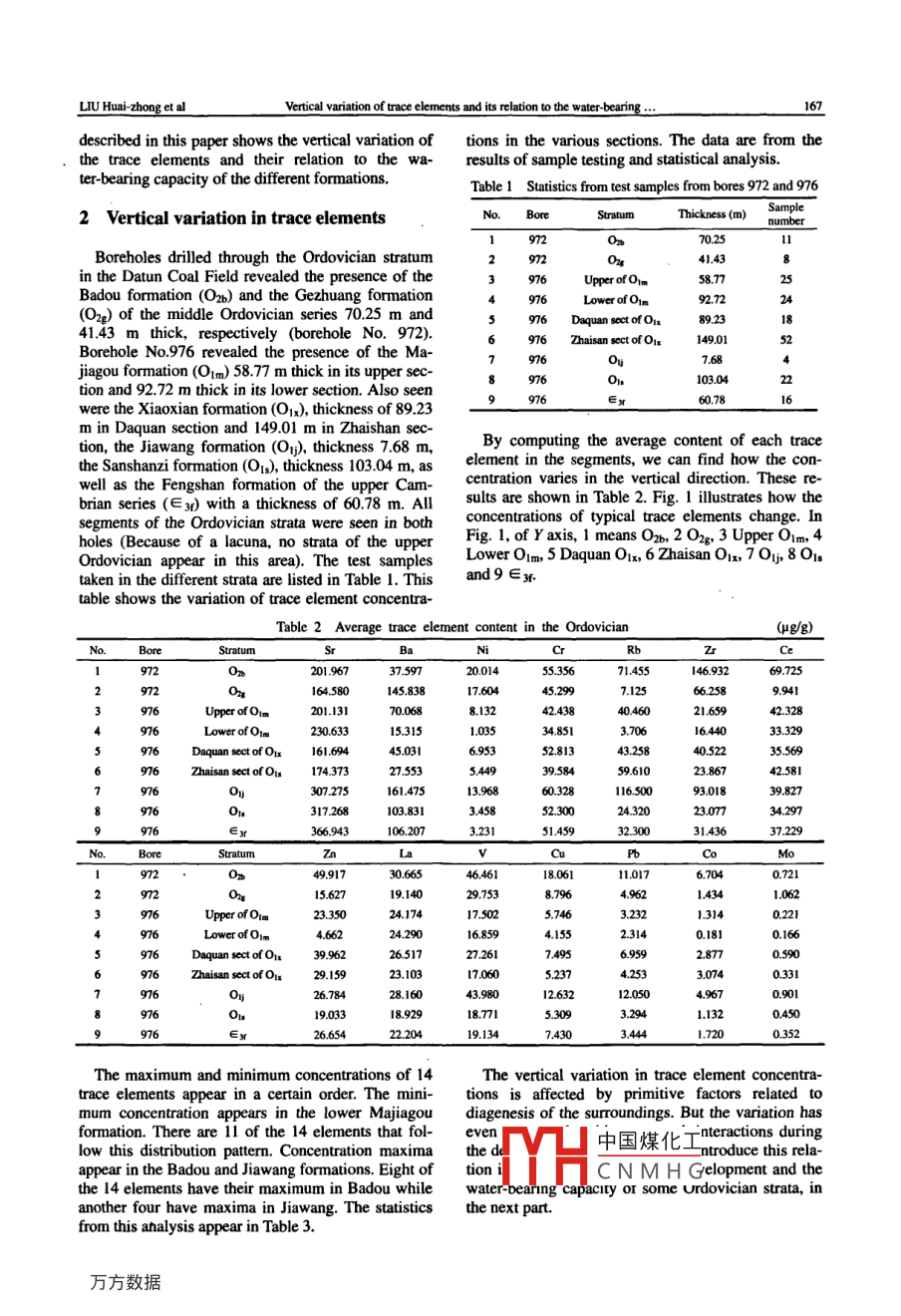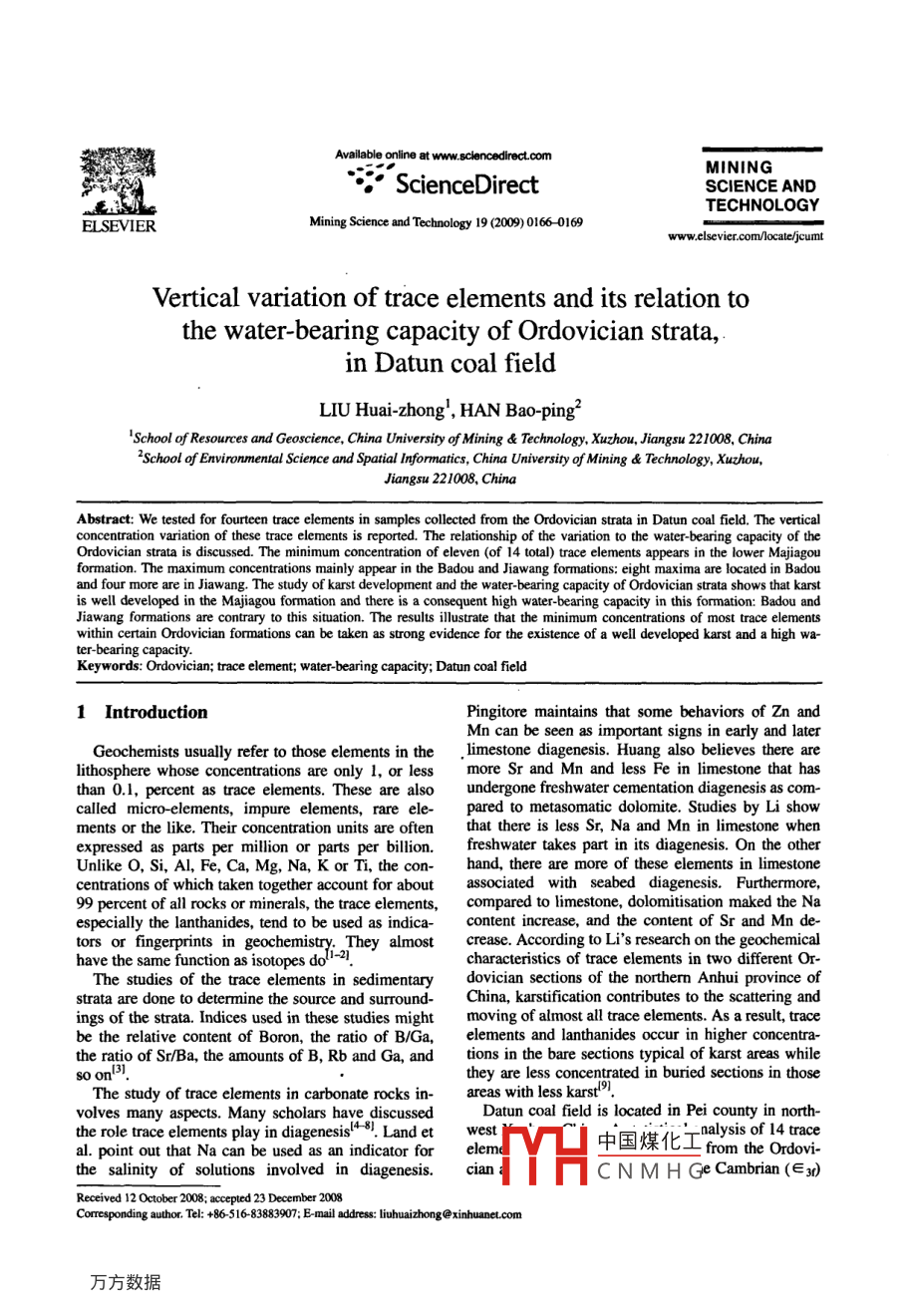 leonlineatwww.sciencedirectcomMININGScienceDirectSCIENCE ANDTECHNOLOGYELSEVIERMining Science and Technology 19(2009)0166-0169www.elsevier.com/locate/jcumtVertical variation of trace elements and its relation tothe water-bearing capacity of Ordovician strata,n Datun coal fieldLIU Huai-zhong, HAN Bao-pingSchool of Resources and Geoscience, China Universiry of Mining& Technology, Xuzhou, Jiangsu 221008, ChinaSchool of Environmental Science and Spatial informatics, China University of Mining Technology, XuzhouJiangsu 221008, ChinaAbstract: We tested for fourteen trace elements in samples collected from the Ordovician strata in Datun coal field. The verticalconcentration variation of these trace elements is reported. The relationship of the variation to the water-bearing capacity of theOrdovician strata is discussed. The minimum concentration of eleven(of 14 total) trace elements appears in the lower Majiagouformation. The maximum concentrations mainly appear in the Badou and Jiawang formations: eight maxima are located in Badouand four more are in Jiawang. The study of karst development and the water-bearing capacity of Ordovician strata shows that karstis well developed in the Majiagou formation and there is a consequent high water-bearing capacity in this formation: Badou andJiawang formations are contrary to this situation. the results illustrate that the minimum concentrations of most trace elementswithin certain Ordovician formations can be taken as strong evidence for the existence of a well developed karst and a high wa-Keywords: Ordovician; trace element; water-bearing capacity; Datun coal field1 IntroductionPingitore maintains that some behaviors of Zn andMn can be seen as important signs in early and laterGeochemists usually refer to those elements in the, limestone diagenesis. Huang also believes there arelithosphere whose concentrations are only l, or less more Sr and Mn and less Fe in linmestonethan 0.1, percent as trace elements. these are also undergone freshwater cementation diagenesis as com-called micro-elements, impure elements, rare elepared to metasomatic dolomite. Studies by Li showments or the like. Their concentration units are often that there is less Sr, Na and Mn in limestone whenexpressed as parts per million or parts per billion. freshwater takes part in its diagenesis. On the otherUnlike O, Si, Al, Fe, Ca, Mg, Na, K or Ti, the conhand, there are more of these elements in limestonecentrations of which taken together account for about associated with seabed diagenesis. Furthermore,99 percent of all rocks or minerals, the trace elements, compared to limestone, dolomitisation maked the Naespecially the lanthanides, tend to be used as indica- content increase, and the content of Sr and Mn de-have the same function as isotopes do/l-a"ey almost crease. According to Lis research on the geochemicaltors or fingerprints incharacteristics of trace elements in two different or-The studies of the trace elements in sedimentary dovician sections of the northern Anhui province oftrata are done to determine the source and surround- China, karstification contributes to the scattering andings of the strata Indices used in these studies might moving of almost all trace elements. As a result, tracebe the relative content of Boron, the ratio of B/Ga, elements and lanthanides occur in higher concentra-the ratio of Sr/Ba, the amounts of B, Rb and Ga, and tions in the bare sections typical of karst areas whileso othey are less concentrated in buried sections in thoseThe study of trace elements in carbonate rocksareas with less karst 91olves many aspects. Many scholars have discussedDatun coal field is located in Pei county in north-the role trace elements play in diagenesis. Land et westal. point out that Na can be used as an indicator for elem中國煤化工 from the ordothe salinity of solutions involved in diagenesisclanCN Ge Cambrian(E3dCorrespondingauthorTel+86516-83883907:E-mailaddressliuhuaizhong@xinhuanet.comLIU Huai-zhong et alertical variation of trace elements and its relation to the water- bearingdescribed in this paper shows the vertical variation of tions in the various sections. The data are from thethe trace elements and their relation to the wa- results of sample testing and statistical analysis.ter-bearing capacity of the different formations.able 1 Statistics from test samples from bores 972 and 9762 Vertical variation in trace elementsNo. BoreStratumThickness(m) SamplenumbeBoreholes drilled through the Ordovician stratumin the Datun Coal Field revealed the presence of theUpper of O,m58.77Badou formation(Ozb)and the Gezhuang formation9272Dee) of the middle Ordovician series 70.25 m and976 Daquan sect of o892341.43 m thick, respectively (borehole No. 972)976 Zhaisan sect of lsBorehole No 976 revealed the presence of the Ma-jiagou formation(Olm)58.77 m thick in its upper sec-10304tion and 92.72 m thick in its lower section. Also seenwere the Xiaoxian formation(O), thickness of 89.23m in Daquan section and 149.01 m in Zhaishan setion, the Jiawang formation(On), thickness 7.68 m,By computing the average content of each tracethe Sanshanzi formation(01,), thickness 103.04 m, as element in the segments, we can find how the con-well as the Fengshan formation of the upper Camcentration varies in the vertical direction. These re-brian series(E3d with a thickness of 60.78 m. Allsults are shown in Table 2. Fig. I illustrates how thesegments of the Ordovician strata were seen in both concentrations of typical trace elements change.Inholes( Because of a lacuna, no strata of the upper Fig. I, of Y axis, I means Ozb, 2 O2e,3 Upper Olm,4Ordovician appear in this area). The test samplesLower Olm, 5 Daquan O1x, 6 Zhaisan Oix, 7O1j, 8Otaken in the different strata are listed in Table 1. This and 9 e3table shows the variation of trace element concentra-Table 2 Average trace element content in the Ordovician2019%67200147145569.7251458387.125Upper of Oim201.1314243840442.328Lower of Olm23063