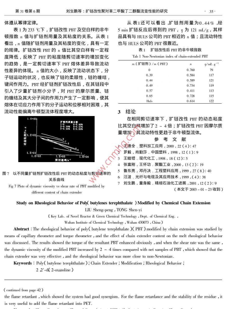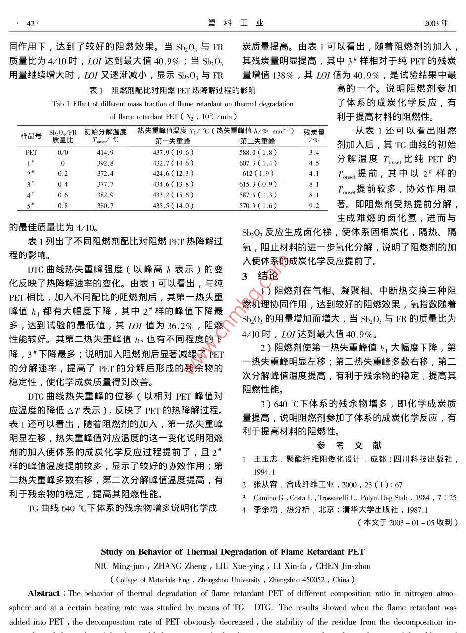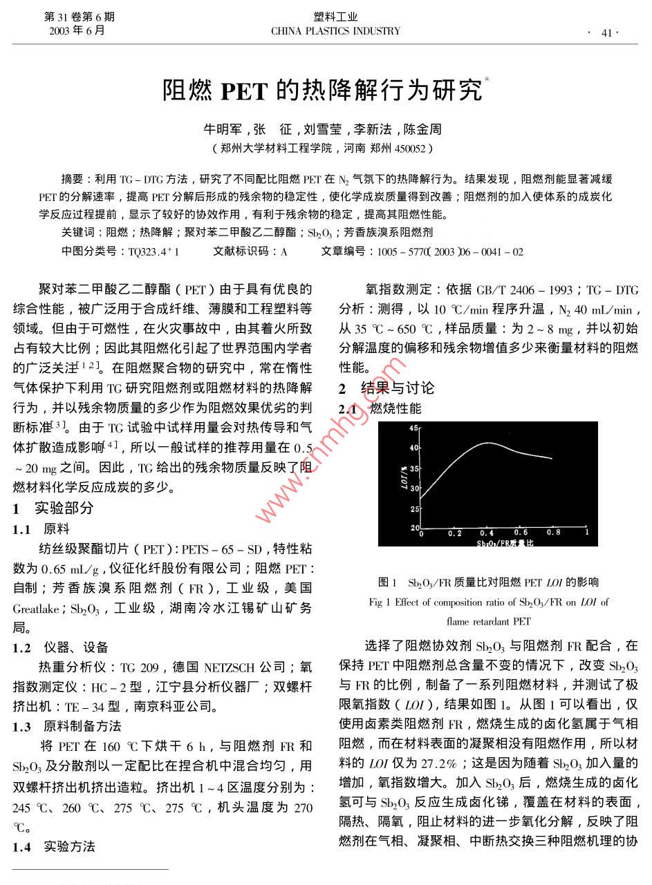 第31卷第6期塑料工業(yè)2003年6月CHINA PLASTICS INDUSTRY阻燃PET的熱降解行為研究牛明軍,張征,劉雪瑩,李新法,陳金周鄭州大學(xué)材料工程學(xué)院,河南鄭州450052)摘要∶利用τG-rG方法,研究了不同配比阻燃P在№2氣氛下的熱降解行為。結(jié)果發(fā)現(xiàn),阻燃劑能顯著減緩PET的分解速率,提高PET分解后形成的殘余物的穩(wěn)定性,使化學(xué)成炭質(zhì)量得到改善;阻燃劑的加入使體系的成炭化學(xué)反應(yīng)過程提前,顯示了較好的協(xié)效作用,有利于殘余物的穩(wěn)定,提高其阻燃性能。關(guān)鍵詞∶阻燃冫熱降解;聚對苯二甲酸乙二醇酯冫SO3;芳香族溴系阻燃劑中圖分類號(hào):T0323.4+1文獻(xiàn)標(biāo)識(shí)碼:A文章編號(hào):1005-577(2003)6-0041-02聚對苯二甲酸乙二醇酯(PET)由于具有優(yōu)良的氧指數(shù)測定:依據(jù)GBT2406-1993;TG-DI綜合性能,被廣泛用于合成纖維、薄膜和工程塑料等分析:測得,以10℃/min程序升溫,N’40m/min,領(lǐng)域。但由于可燃性,在火災(zāi)事故中,由其著火所致從35℃~650℃,樣品質(zhì)量:為2~8mg,并以初始占有較大比例;因此其阻燃化引起了世界范圍內(nèi)學(xué)者分解溫度的偏移和殘余物增值多少來衡量材料的阻燃的廣泛關(guān)注12J。在阻燃聚合物的研究中,常在惰性性能。氣體保護(hù)下利用TG研究阻燃劑或阻燃材料的熱降解2結(jié)果與討論行為,并以殘余物質(zhì)量的多少作為阻燃效果優(yōu)劣的判2,1燃燒性能斷標(biāo)準(zhǔn)3。由于TG試驗(yàn)中試樣用量會(huì)對熱傳導(dǎo)和氣體擴(kuò)散造成影呵4],所以一般試樣的推薦用量在0.5~20mg之間。因此,TG給出的殘余物質(zhì)量反映了阻燃材料化學(xué)反應(yīng)成炭的多少實(shí)驗(yàn)部分11原料紡絲級(jí)聚酯切片(PET):PEIN-65-SD,特性粘數(shù)為0.65mL/g,儀征化纖股份有限公司:阻燃PET自制;芳香族溴系阻燃劑(FR),工業(yè)級(jí),美國圖1Sb2O3/FR質(zhì)量比對阻燃 PET LO的影響Greatlake;SbO3,工業(yè)級(jí),湖南冷水江錫礦山礦務(wù)Fig 1 Effect of composition ratio of Sb O,/FR on LOl of局flame retardant PET1.2儀器、設(shè)備選擇了阻燃協(xié)效劑Sh2O3與阻燃劑FR配合,在熱重分析儀:TG209,德國 NETZSCH公司;氧保持PT中阻燃劑總含量不變的情況下,改變S2O3指數(shù)測定儀:HC-2型,江寧縣分析儀器廠;雙螺桿與H的比例,制備了一系列阻燃材料,并測試了極擠出機(jī):T-34型,南京科亞公司限氧指數(shù)(DO),結(jié)果如圖1。從圖1可以看出,僅13原料制備方法使用鹵素類阻燃劑FR,燃燒生成的鹵化氫屬于氣相將PE在160℃下烘干6h,與阻燃劑FR和阻燃,而在材料表面的凝聚相沒有阻燃作用,所以材Sh2O3及分散劑以一定配比在捏合機(jī)中混合均勻,用料的O僅為27.2%;這是因?yàn)殡S著Sh2O3加入量的雙螺桿擠岀機(jī)擠岀造粒。擠岀機(jī)1~4區(qū)溫度分別為增加,氧指數(shù)增大。加入S2O3后,燃燒生成的鹵化245℃、260℃、275℃、275℃,機(jī)頭溫度為270氫可與S2O3反應(yīng)生成鹵化銻,覆蓋在材料的表面,隔熱、隔氧,阻止材料的進(jìn)一步氧化分解,反映了阻1.4實(shí)驗(yàn)方法燃劑在氣相、凝聚相、中斷熱交換三種阻燃機(jī)理的協(xié)塑料工業(yè)2003年同作用下,達(dá)到了較好的阻燃效果。當(dāng)Sh2O3與FR炭質(zhì)量提高。由表1可以看出,隨著阻燃劑的加入,質(zhì)量比為4/10時(shí),JO達(dá)到最大值40.9%;當(dāng)Sh2O3其殘?zhí)苛棵黠@提高,其中3樣相對于純PE的殘?zhí)坑昧坷^續(xù)增大時(shí),LOⅠ又逐漸減小,顯示SbO3與F量增值138%,其LO/值為40.9%,是試驗(yàn)結(jié)果中最表1阻燃劑配比對阻燃PET熱降解過程的影響高的一個(gè)。說明阻燃劑參加Tab 1 Effect of different mass fraction of flame retardant on thermal degradation了體系的成炭化學(xué)反應(yīng),有of flame retardant PET( N,, 10%C/min利于提高材料的阻燃性。樣品號(hào)S2O/H初始分解溫度熱失重峰值溫度Ty/℃(熱失重峰值h/%min-)殘?zhí)苛繌谋?還可以看出阻燃第一失重峰第二失重峰劑加入后,其TG曲線的初始414.9432.7(14.6)607.3(1.4)分解溫度T比純PET的424.6(12.3)612(1.9)4.1T提前,其中以2#樣的382.9433.2(15.6)587.5(1.3)T灬提前較多,協(xié)效作用顯380.7435.5(14.0)570.3(1.6)9.2著。即阻燃劑受熱提前分解,生成難燃的鹵化氫,進(jìn)而與的最佳質(zhì)量比為4/10。表1列出了不同阻燃劑配比對阻燃PE熱降解過S2O3反應(yīng)生成鹵化銻,使體系固相炭化,隔熱、隔氧,阻止材料的進(jìn)一步氧化分解,說明了阻燃劑的加入使體系的成炭化學(xué)反應(yīng)提前了。DG曲線熱失重峰強(qiáng)度(以峰高h(yuǎn)表示)的變3結(jié)論P(yáng)ET相比,加入不同配比的阻燃劑后,其第一熱失重1)阻燃劑在氣相、凝聚相、中斷熱交換三種阻峰值h1都有大幅度下降,其中2“樣的峰值下降最燃機(jī)理協(xié)同作用,達(dá)到較好的阻燃效果,氧指數(shù)隨著多,達(dá)到試驗(yàn)的最低值,其LO/值為36.2%,阻燃b2O3的用量增加而增大,當(dāng)Sh2O3與HR的質(zhì)量比為性能較好。其第二熱失重峰值h2也有不同程度的下4/10時(shí),LO達(dá)到最大值40.9%。降,3*下降最多;說明加入阻燃劑后顯著減緩了PET2)阻燃劑使第一熱失重峰值h大幅度下降,第的分解速率,提高了PET的分解后形成的殘余物的穩(wěn)定性,使化學(xué)成炭質(zhì)量得到改善。的次分解峰值溫度提高,有利于殘余物的穩(wěn)定,提高其DG曲線熱失重峰的位移(以相對PE峰值對阻燃性能。應(yīng)溫度的降低ΔT表示),反映了P