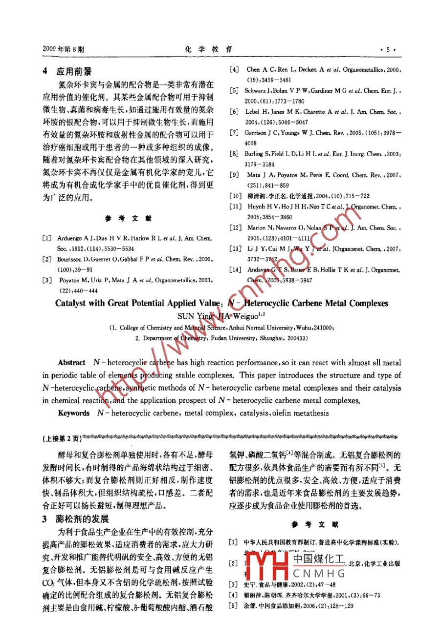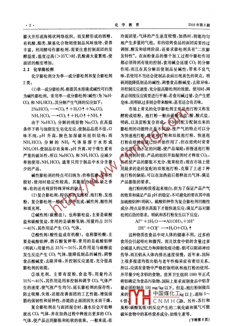 2009年第8期化學(xué)教育生活中的食品添加劑之膨松劑簡(jiǎn)介化孫玉婷林丹(華中師范大學(xué)化學(xué)教育研究所湖北武漢 430079)學(xué)摘要膨松劑是常見的食品添加劑之一,一般分為生物膨松劑和化學(xué)膨松劑,不同膨松劑的.使用原理是一致的。常用的的膨松劑是含鋁的泡打粉,而飲食中鋁的含量過多會(huì)減退人的記憶力和抑制免疫功能,所以無鋁膨松劑將是膨松劑新的發(fā)展趨勢(shì)。關(guān)鍵詞膨松劑 食品添加劑碳酸氫鈉明礬《普通高中化學(xué)課程標(biāo)準(zhǔn)(實(shí)驗(yàn))》中選修課程“化加堿來中和。而在堿性條件下維生素則極易被破學(xué)與生活”的內(nèi)容標(biāo)準(zhǔn)明確指出“知道常見的食品添壞。目前市場(chǎng)上有很多種自發(fā)面粉或是發(fā)酵粉,如加劑的組成、性質(zhì)和作用”心。而膨松劑是常見的食果用“自發(fā)面粉”或“發(fā)酵粉”來發(fā)面,當(dāng)然會(huì)更加便品添加劑之- -,廣泛地應(yīng)用到人們的日常飲食當(dāng)中。捷 ,但營(yíng)養(yǎng)就損失多了。因?yàn)槠渲懈緵]有酵母菌,所以讓學(xué)生了解更多膨松劑的知識(shí)是有必要的。而是小蘇打等幾種產(chǎn)氣化學(xué)物質(zhì),它們不僅不能提1膨松劑的使用 原理高營(yíng)養(yǎng)價(jià)值,反而會(huì)把面粉中的B族維生素破壞.膨松劑是在以小麥粉為主的焙烤食品中添加,掉。因此對(duì)于這一一點(diǎn)要特別注意。在選擇發(fā)酵面食并在加工過程中受熱分解產(chǎn)生氣體,使面胚起發(fā),形成品時(shí),也最好不要選擇用“自發(fā)面粉”或“發(fā)酵粉”成致密多孔組織,從而使制品具有膨松、柔軟或酥脆做的,而要盡量選用酵母發(fā)酵而成的。的- -類物質(zhì)凹。2.1.2酵母發(fā)酵膨松劑也稱膨脹劑、疏松劑或發(fā)粉。它不僅可酵母是面制品中一種十分重要的膨松劑。它不提高食品的感官質(zhì)量,而且也有利于食品的消化吸僅能使制品體積膨大,組織呈海棉狀,而且能提高面收,這在今天大力發(fā)展方便食品并強(qiáng)調(diào)其營(yíng)養(yǎng)作用制品的營(yíng)養(yǎng)價(jià)值和風(fēng)味。時(shí)具有一一定的重要性。過去食品中大量使用壓榨酵母、鮮酵母,由于其不同的膨松劑在原理上是一致的,即都是通過不易久存,制作時(shí)間長(zhǎng),現(xiàn)在已被由壓榨酵母經(jīng)低溫發(fā)酵劑在面團(tuán)中產(chǎn)生大量二氧化碳?xì)怏w,在蒸煮過干燥而成的活性千酵母替代?;钚郧Ы湍甘褂脮r(shí)應(yīng)程中,二氧化碳受熱膨脹,于是面團(tuán)就變得松軟,形先用30C左右溫水溶解并放置10 min左右,使酵成疏松的結(jié)構(gòu)。膨松劑不僅能使食品產(chǎn)生松軟的海母菌活化。棉狀多孔組織,使之體積膨大、口感柔松可口;而且酵母是利用面團(tuán)中的單糖作為其營(yíng)養(yǎng)物質(zhì)。它能使咀嚼時(shí)唾液很快滲人制品的組織中,以溶出制有2個(gè)來源:一是在配料中加入蔗糖經(jīng)轉(zhuǎn)化酶水解品內(nèi)可溶性物質(zhì),刺激味覺神經(jīng),使之迅速反應(yīng)該食成轉(zhuǎn)化糖;二是淀粉經(jīng)- - 系列水解最后成為葡萄糖。品的風(fēng)味;食品進(jìn)入胃之后,各種消化酶能快速進(jìn)入其生成過程為:食品組織中,使食品容易、快速地被消化、吸收,避免2(C%HoO3)n +2nH2O-β淀粉酶營(yíng)養(yǎng)損失0]。nCi2Hz2Ou(麥芽糖)2膨松劑分類膨松劑可以分為生物膨松劑和化學(xué)膨松劑。C1pHn2O1+HO-麥芽糖酶2C&H2O<(葡萄糖)廉精轉(zhuǎn)化酶2.1生 物膨松劑Cr H2On(蔗糖) +H2O生物膨松劑是依靠能產(chǎn)生CO2氣體的微生物CH2O%(葡萄糖)+C;H2O<(果糖)發(fā)酵而產(chǎn)生起發(fā)作用的膨松劑。有氧呼吸SH20+2822 kJ2.1.1 老面發(fā)酵中國煤化工老面(又稱老肥、面肥、老酵頭等)發(fā)酵是- -種比CN M H G2CO2+100kJ較原始的發(fā)酵方法,它是靠來自空氣中的野生酵母酵母菌利用這些糖類及其他營(yíng)養(yǎng)物質(zhì),先后進(jìn)行和各種雜菌(主要是乳酸菌等)的發(fā)酵作用,由于產(chǎn)有氧呼吸與無氧呼吸,產(chǎn)生COh、醇.醛和一些有機(jī)酸。酸細(xì)菌較多,會(huì)使面團(tuán)產(chǎn)生不良的酸味,面發(fā)后必須生成的CO2被面團(tuán)中的面筋包圍,使制品體積●2●化學(xué)教育2009年第8期膨大并形成海棉狀網(wǎng)絡(luò)組織。而發(fā)酵形成的酒精、冷面團(tuán)里,氣體的產(chǎn)生速度較慢,加熱時(shí),則能均勻有機(jī)酸、酯類、羰基化合物則使制品風(fēng)味獨(dú)特、營(yíng)養(yǎng)地產(chǎn)生多量的氣泡。有的焙烤食品的面團(tuán)需要經(jīng)過豐富。利用酵母作膨松劑,需要注意控制面團(tuán)的發(fā)調(diào)制、醒發(fā)和焙烤階段,還要求膨松劑具有“二次膨酵溫度,溫度過高(> >35"C)時(shí),乳酸菌大量繁殖,使發(fā)特性”。在面粉食品的整個(gè)加工過程中膨松作用面團(tuán)的酸度增加。都必須得到有效的控制,食用堿會(huì)延緩COn的分解2.2化學(xué)膨松劑作用,而且在其分解后使制品呈堿性,帶來不良?xì)饣瘜W(xué)膨松劑分為單一成分膨松劑和復(fù)合膨松劑味,若使用不當(dāng)還會(huì)使制品表面出現(xiàn)黃色的斑點(diǎn)。明2類:礬則能降低制品的堿性,調(diào)整食品酸堿度,去除異味,(1)單--成分膨松劑,根據(jù)其水溶液成堿性可歸類并控制反應(yīng)速度,充分提高膨松劑的效能。使用時(shí),