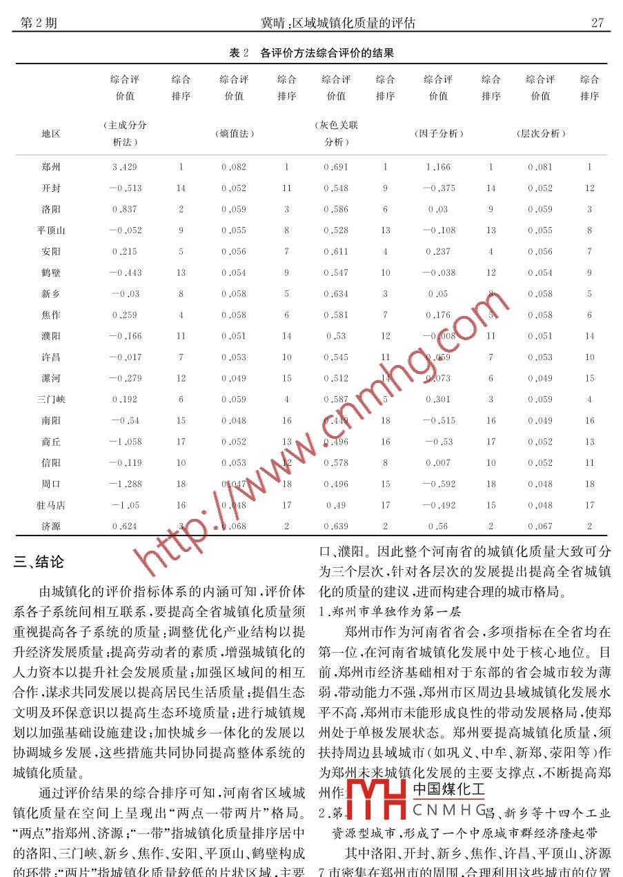 第32卷第2期西安航空學(xué)院學(xué)報(bào)Vol .32 No.22014年3月Journal of Xi' an A eronautical U niversityMar .2014區(qū)域城鎮(zhèn)化質(zhì)量的評(píng)估以河南省為例冀晴(鄭州大學(xué)商學(xué)院,河南鄭州450001 )滴要:城鎮(zhèn)化已成為社會(huì)經(jīng)濟(jì)發(fā)展以及可持續(xù)發(fā)展的必然趨勢(shì)。以河南省為例,并結(jié)合河南省的省情,借鑒河南省城鎮(zhèn)化進(jìn)程中出現(xiàn)的問題對(duì)城鎮(zhèn)化質(zhì)量進(jìn)行分析評(píng)估。采用多指標(biāo)綜合評(píng)價(jià)方法,得出評(píng)估結(jié)果。關(guān)鍵詞:城鎮(zhèn)化質(zhì)量;評(píng)價(jià)體系;河南省中圖分類號(hào):F299 .21文獻(xiàn)標(biāo)識(shí)碼:A文章編號(hào):1008-9233 (2014 )02-0025-04城鎮(zhèn)化在當(dāng)今全面建設(shè)小康社會(huì)過程中的地較衡量各指標(biāo)與現(xiàn)代化水平的目標(biāo)值”]。王家庭位日益凸顯,城鎮(zhèn)化的質(zhì)量更是備受關(guān)注。在快速等建立的評(píng)價(jià)指標(biāo)體系涵蓋經(jīng)濟(jì)、社會(huì)、環(huán)境及城推進(jìn)城鎮(zhèn)化的政策號(hào)召下,鄉(xiāng)鎮(zhèn)市民化的人口數(shù)量市化水平四個(gè)方面,并對(duì)30個(gè)大中城市通過主成與日俱增,與此同時(shí),冒進(jìn)式城鎮(zhèn)化問題成為一分分析法進(jìn)行實(shí)證分析”。常阿平則對(duì)30個(gè)省會(huì)大隱患,城鎮(zhèn)化過程中重?cái)?shù)量輕質(zhì)量傾向明顯,伴城市 及直轄市通過因子分析進(jìn)行比較。韓增林隨著交通、環(huán)境和生態(tài)的日益變化,各種城市病凸等通過分別選取我國286個(gè)地級(jí)市的31個(gè)指標(biāo)的顯,這些城鎮(zhèn)化進(jìn)程中的質(zhì)量問題困擾著我國大部樣本數(shù)據(jù),從經(jīng)濟(jì)發(fā)展、基礎(chǔ)設(shè)施、就業(yè)、居民生活、分省份城鎮(zhèn)化的發(fā)展。河南省作為中部大省以及社會(huì)發(fā)展、生態(tài)環(huán)境、用地質(zhì)量、創(chuàng)新質(zhì)量和城鄉(xiāng)協(xié)農(nóng)業(yè)大省,亟待解決城鎮(zhèn)化的問題,相對(duì)于東西部調(diào)等十個(gè)方面探討了城市化質(zhì)量的空間差異特地區(qū),河南省作為人口大省對(duì)其研究更具有代表征”。白先春等運(yùn)用綜合評(píng)價(jià)分析方法提出了測(cè)性。因此本文以河南省為例,構(gòu)建城鎮(zhèn)化質(zhì)量的評(píng)算城鎮(zhèn)質(zhì)量系統(tǒng)協(xié)調(diào)發(fā)展程度的- - 般計(jì)量模型6]。價(jià)指標(biāo)體系,衡量其具有空間聯(lián)系的城市圈的區(qū)域綜觀已有的關(guān)于城鎮(zhèn)化質(zhì)量的研究,研究多為城鎮(zhèn)化質(zhì)量,并根據(jù)評(píng)估結(jié)果有針對(duì)性地提出提升同一級(jí)別城市的比較,樣本數(shù)量由幾個(gè)到幾百個(gè)不河南省城鎮(zhèn)化質(zhì)量的相應(yīng)措施。這對(duì)于加速河南等,建立的指標(biāo)體系多為涵蓋經(jīng)濟(jì)、社會(huì)、生態(tài)等方省城鎮(zhèn)化的發(fā)展具有實(shí)際意義,對(duì)于其它省份的城面體現(xiàn)城鎮(zhèn)化內(nèi)涵的各類指標(biāo),運(yùn)用的定量分析測(cè)鎮(zhèn)化改革具有借鑒意義。度方法多為客觀賦權(quán)法(如主成分分析法、因子分析法、熵值法等)及主觀賦權(quán)法。然而對(duì)具有空間-、研究現(xiàn)狀聯(lián)系的城市都市圈的區(qū)域城鎮(zhèn)化質(zhì)量研究不多。目前,國內(nèi)對(duì)城鎮(zhèn)化質(zhì)量已進(jìn)行了初步研究。本文將在此基礎(chǔ)上,通過對(duì)已有評(píng)價(jià)指標(biāo)體系的綜葉裕民對(duì)我國9個(gè)超大城市(擁有300萬以上人口合地” 中國煤化工七內(nèi)涵的多項(xiàng)指標(biāo),并的城市) ,選取反映城市經(jīng)濟(jì)、基礎(chǔ)設(shè)施及人三個(gè)方運(yùn)HCNMHG價(jià)方法對(duì)河南省城鎮(zhèn)面的現(xiàn)代化水平的12個(gè)指標(biāo),采用主觀賦權(quán)法比化質(zhì)量進(jìn)行評(píng)價(jià) ,開對(duì)伴價(jià)結(jié)果比較分析,以尋求收稿日期:2014-01-28 .作者簡介:冀晴(1989 - ),女,河南駐馬店人,碩士研究生,研究方向?yàn)榻?jīng)濟(jì)預(yù)測(cè)與決策。26西安航空學(xué)院學(xué)報(bào)第32卷最合理的城鎮(zhèn)化質(zhì)量的評(píng)價(jià)結(jié)果,構(gòu)建合理的城市(- )評(píng)價(jià)體系格局??紤]影響城鎮(zhèn)化質(zhì)量的多方面的復(fù)合效應(yīng),本.二、河南省市域城鎮(zhèn)化質(zhì)量的評(píng)價(jià)文從經(jīng)濟(jì)發(fā)展質(zhì)量、社會(huì)發(fā)展質(zhì)量、居民生活質(zhì)量、生態(tài)環(huán)境質(zhì)量、基礎(chǔ)設(shè)施質(zhì)量、城鄉(xiāng)協(xié)調(diào)發(fā)展質(zhì)量本文以2011年河南省內(nèi)的鄭州、開封、洛陽、六個(gè)方面選取可獲得的20個(gè)具體指標(biāo)構(gòu)建城鎮(zhèn)化平頂山、安陽、鶴壁、新鄉(xiāng)、焦作、濮陽、許昌、漯河、質(zhì)量的綜合評(píng)價(jià)體系。指標(biāo)數(shù)據(jù)源自《河南省統(tǒng)計(jì)三門峽、南陽、商丘、信陽、周口駐馬店、濟(jì)源18個(gè)年鑒2012)》”。為了便于不同規(guī)模城市的城鎮(zhèn)化質(zhì)管轄市作為研究對(duì)象建立評(píng)價(jià)體系,對(duì)各城市的城量的指標(biāo)比較,多數(shù)指標(biāo)均采用人均指標(biāo),滿足指鎮(zhèn)化質(zhì)量進(jìn)