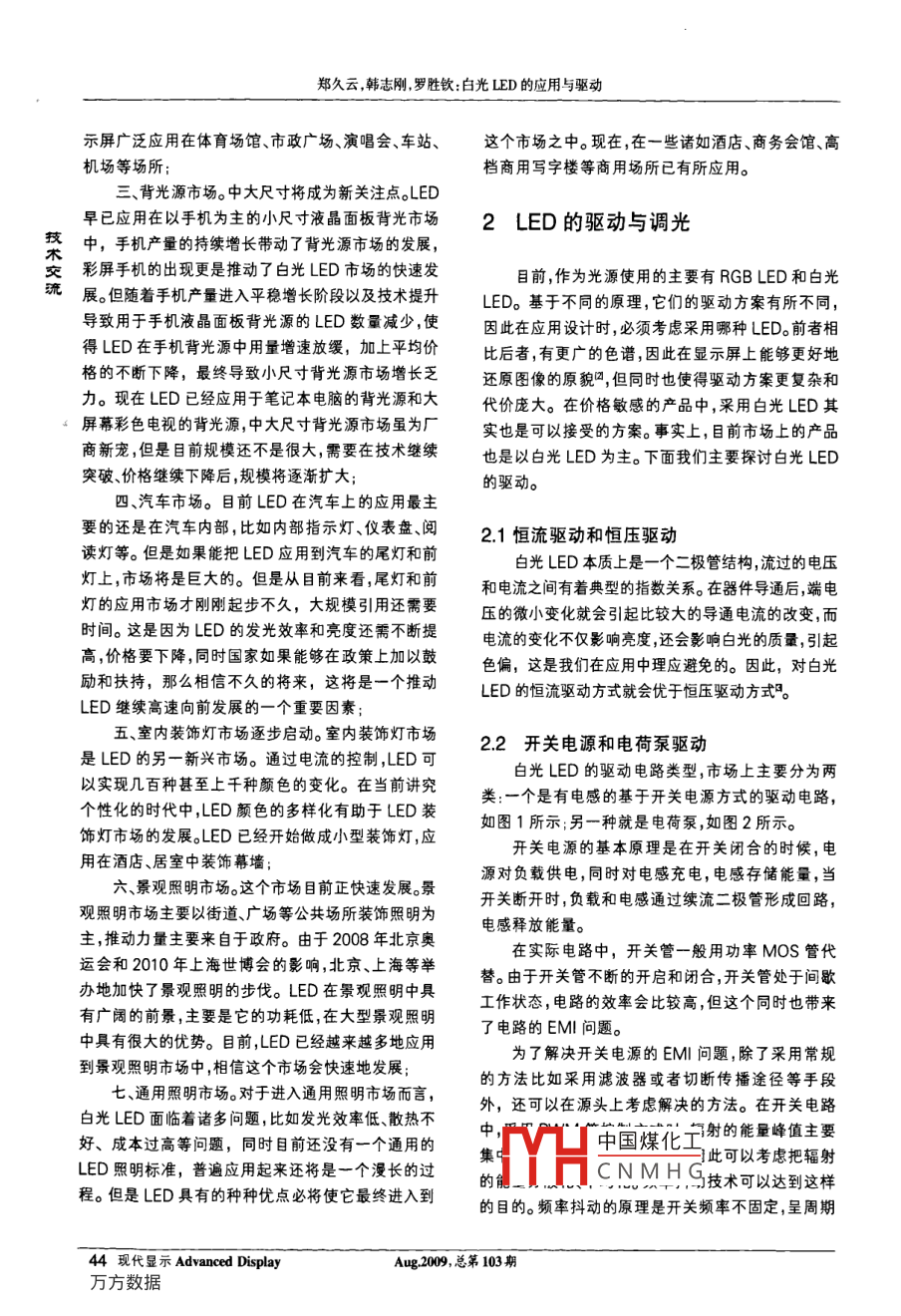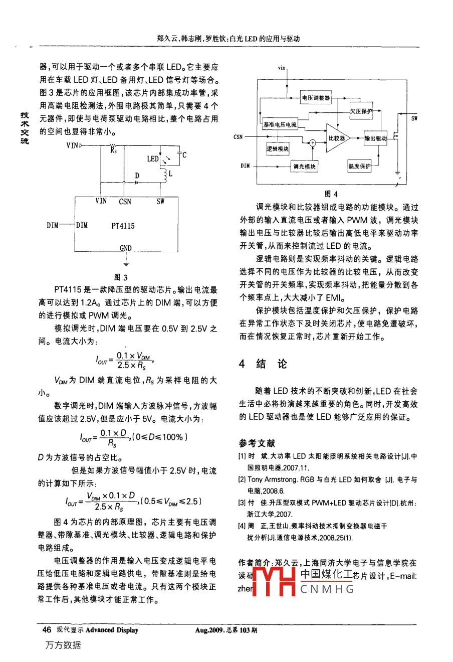 鄭久云韓志剛,羅勝欽:白光LED的應用與驅動文章編號:1006-6268(200908-0043-04白光LED的應用與驅動技術交鄭久云,韓志剛,羅勝欽上海同濟大學電子與信息學院,上海201800)摘要:隨著地球能源的不斷消耗和人們對綠色產品的追求,高效無污染的白光LED越來越受到人們的青睞。文中討論了白光LED的幾種主要驅動方式,并以PT4115驅動芯片為例闡逑開關電源驅動電路的原理與應用關鍵詞:白光LED;開關電源;PWM調光中圖分類號:TN431文獻標識碼:AThe Application and Driver of White-light LEDZHENG Jiu- Yun, HAN Zhi-gang, LUO Sheng-qinCollege of Electronics and information Engineering, Tongji University,Shanghai 201800, China)Abstract: With the constant consumption of energy and the people' s pursuit of the greenproduct, LED becomes more and more popular In this article we will describe severalmethods of driving white LEDs and theory of driver used in switching power with PT4115Keywords: white-light LED; switching power; PWM dimming1LED的應用性,使LED可以直接嵌入到產品之中,而無須考慮更換。因為在這個時間內,很多東西都已經要報廢處理,LED照明被稱為第4代照明技術,正以飛快的所以可以大大簡化一些產品的設計;另外,無污染,無速度向前發(fā)展。LED如此受到人們的青睞,是由于它輻射。白光LED中不含汞等有害重金屬,可以回收利所具備的各項優(yōu)點正符合了現(xiàn)在人們的追求。第一用,而且無輻射是真正的綠色光源LED具有很高的效率。由于能源的不斷消耗,人們對由于這些優(yōu)點,LED正不斷地應用到社會的各高效的產品顯然更感興趣。在傳統(tǒng)照明中普遍應用白個領域之中。熾燈而白熾燈的熱損耗高達95%,大部分的電能轉LED指示燈市場。這是LED最常規(guī)最普遍變成了熱能而耗散掉。在后來應用的熒光燈中功率的應用之一,這個市場的需求量大,但是對LED的損耗仍高達80%。而隨著LED不斷地發(fā)展,現(xiàn)在它質量要求一般不是很高價格比較便宜;的效率已經可以達到80%以上,極大提高了能源的顯示屏市場。這個市場是LED的主要應用利用率;第二,超長的壽命。LED在適當?shù)碾娏骱碗娛袌鲋袊夯ふ緩V場等各個地壓下工作,使用壽命可以長達10萬小時。這也是常規(guī)方比較好,因此價格照明用燈所無法比擬的一個優(yōu)勢。這樣的長壽命特會CNMH、,在也很活躍,整體市場超過指示燈市場。憑借著獨特優(yōu)勢,LED全彩顯收稿日期:2009-06-09g20,0第103期現(xiàn)代顯示 Advanced Display43鄭久云韓志剛羅勝欽:白光LED的應用與驅動示屏廣泛應用在體育場館、市政廣場、演唱會、車站、這個市場之中?,F(xiàn)在,在一些諸如酒店、商務會館、高機場等場所檔商用寫字樓等商用場所已有所應用。三、背光源市場。中大尺寸將成為新關注點。LED早已應用在以手機為主的小尺寸液晶面板背光市場2LED的驅動與調光技中,手機產量的持續(xù)增長帶動了背光源市場的發(fā)展交彩屏手機的出現(xiàn)更是推動了白光LED市場的快速發(fā)目前,作為光源使用的主要有 RGB LED和白光展。但隨著手機產量進入平穩(wěn)增長階段以及技術提升LED?;诓煌脑?它們的驅動方案有所不同,導致用于手機液晶面板背光源的LED數(shù)量減少,使因此在應用設計時,必須考慮采用哪種LED。前者相得LED在手機背光源中用量增速放緩,加上平均價比后者,有更廣的色譜,因此在顯示屏上能夠更好地格的不斷下降,最終導致小尺寸背光源市場增長乏還原圖像的原貌,但同時也使得驅動方案更復雜和力。現(xiàn)在LED已經應用于筆記本電腦的背光源和大代價龐大。在價格敏感的產品中,采用白光LED其屏幕彩色電視的背光源,中大尺寸背光源市場雖為廠實也是可以接受的方案。事實上,目前市場上的產品商新寵,但是目前規(guī)模還不是很大,需要在技術繼續(xù)也是以白光LED為主。下面我們主要探討白光LED突破、價格繼續(xù)下降后,規(guī)模將逐漸擴大;的驅動四、汽車市場。目前LED在汽車上的應用最主要的還是在汽車內部,比如內部指示燈、儀表盤、閱21恒流驅動和恒壓驅動讀燈等。但是如果能把LED應用到汽車的尾燈和前白光LED本質上是一個二極管結構,流過的電壓燈上,市場將是巨大的。但是從目前來看,尾燈和前和電流之間有著典型的指數(shù)關系。在器件導通后,端電燈的應用市場才剛剛起步不久,大規(guī)模引用還需要壓的微小變化就會引起比較大的導通電流的改變,而時間。這是因為LED的發(fā)光效率和亮度還需不斷提電流的變化不僅影響亮度還會影響白光的質量,引起高,價格要下降,同時國家如果能夠在政策上加以鼓色偏,這是我們在應用中理應避免的。因此,對白光勵和扶持,那么相信不久的將來,這將是一個推動LED的恒流驅動方式就會優(yōu)于恒壓驅動方式LED繼續(xù)高速向前發(fā)展的一個重要因素;五、窒內裝飾燈市場逐步啟動。室內裝飾燈市場是LED的另一新興市場。通過電流的控制,LED可22開關電源和電荷泵驅動以實現(xiàn)幾百種甚至上千種顏色的變化。在當前講究白光LED的驅動電路類型,市場上主要分為兩類:一個是有電感的基于開關電源方式的驅動電路,個性化的時代中,LED顏色的多樣化有助于LED裝如圖1所示;另一種就是電荷泵,如圖2所示。飾燈市場的發(fā)展。LED已經開始做成小型裝飾燈,應開關電源的基本原理是在開關閉合的時候,電用在酒店、居室中裝飾幕墻源對負載供電,同時對電感充電,電感存儲能量,當六