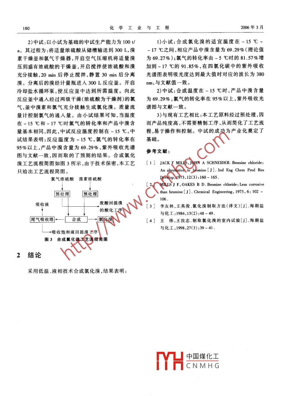 2006年3月化學工業(yè)與工程第23卷第2期Mar.2006CHEMICAL INDUSTRY AND ENGINEERINGVol 23 No. 2文章編號:1004-9533(2006)02-0178-03氯化溴合成工藝張淑芬,張德強2,王國強,李萌2,王俐聰1,姚穎(1.國家海洋局天津海水淡化與綜合利用研究所,天津300192;2.天津長蘆海晶集團,天津300451)摘要:本文介紹了氟化澳(BC)的應用領域及合成工藝。通過對已有工藝的比較與理論分析,可采用低溫液相合成。小試結果表明:在所研究的溫度范圍內,適宜的合成溫度在-15℃~-17℃之間,產品中溴的質量分數為69.29%(理論值為69.27%);在四氣化碳中,吸光度達到最大值時對應的波長為380m,與文獻值吻合。100Ⅵa中試亦取得了預期的結果。與已有工藝相比:本工藝簡化了流程,易于操作和控制。中試的成功為產業(yè)化奠定了基礎。關鍵詞:氯化溴;中試;低溫;合成工藝中圖分類號:TQ031.2文獻標識碼:BSynthesis Technology of Bromine ChlorideZHANG Shu-feng, ZHANG De-qiang, WANG Guo-qiang, LI Meng, WANG Li-cong, YAO Ying(1. Institute of Seawater Desalination and Multipurpose Utilization, State Oceanic Administration, Tianjin 300192, China;2. Tianjin Changlu Haijing Group Co, Ltd, Tianjin 300451, China)Abstract: In this paper, application and synthesis technology of bromine chloride( BrCI)are introduced. Basedon other technologies and theory analysis, low temperature - liquid synthesis technology is confirmed. The resultshows that the optimal temperature is between -15C and-17C, weight content of Br in BrCI is 69.26%(Theoretical value 69. 27 %). Dissolved in CCL, the maximal absorbance wave of BrCI is 380 nm in UVpectrophotometer, the value is in accordance with referenced value. pilot plant of 100 t/a also makesanticipative result Compared with other technologies, this process has many advantage such as simple processeasy operation and controlling. Pilot plant gives the foundation for the future commercializationKey words: bromine chloride; pilot scale; low temperature; synthesis technology氯化溴是一種鹵素互化物,主要用作溴化劑。成。由于產物與溶劑難于分離,不易得到純品氯化與溴素相比,其氧化速度快、氧化程度完全,含活性溴,因此其應用受到限制。溴比溴素高40%;對金屬、碳鋼和不銹鋼的腐蝕性上世紀70年代日本完成小試,其工藝為:將比溴素小1~2個數量級,且成本比溴低等優(yōu)點。合成溫度控制在30℃~70℃之間,連續(xù)向盛溴的由于其獨特的物化性質,隨著科技的發(fā)展,應用領域反應器內通入氯氣,使溴素與氯氣在氣液兩相中反不斷擴大,因此其合成技術引起人們的關注。應生成氯化溴。將含有氯化溴、氯氣和溴素的混合最初,氯化溴的合成是將等摩爾的溴素和氯氣氣控制在溴的沸點以下,氯化溴的沸點以上除去溴通入到四氯化碳中,以四氯化碳為溶劑,在溶液中合再改中國煤化工阻制品,進一步精制收稿日期:2005-05-11CNMHG基金項目:2003天津市科技攻關培育項目(033103711B)。作者簡介:張淑芬(1963-),女,天津人,高級工程師,主要從事海水提溴以及溴素的深加工技術的研究。聯(lián)系人:張淑芬,電話:(022)87898173,Emil: guanshan8811@163第23卷第2期張淑芬等:氯化溴合成工藝得純品。該工藝存在成本高、能耗大、工藝流程長和儀器:UV2450紫外分光光度計精制過程會產生污染等問題。14試驗在國內,王汝志4進行了小試研究。除對原料1)小試:向反應系統(tǒng)中通入干燥的空氣,將亠定溴素、氯氣進行干燥與合成溫度在40℃~42℃外,質量經過預處理的溴置于反應器中,并將反應器調其余與上述日本工藝相同。至所需溫度(通過NaC-H2O冰體系控制合成溫度),美國在20世紀80年代實現(xiàn)了產業(yè)化,其工藝以一定的流速通入氯氣并控制氯氣的通入量。為:在密閉反應器中加入等摩爾的溴素和氯氣,并充圖1為合成溫度與氯化溴中溴含量與氯氣轉化入惰性氣體,混合攪拌約30min,得產品氯化溴。目率的關系曲線。從圖中可以看出,隨著溫度的降低,前,我國尚沒有關于氯化溴中試或工業(yè)化的報導。氯氣的轉化率逐漸增加,由-5℃時的81.57%增加通過對上述工藝的分析比較,本研究提出低溫、液相到-17℃的91.85%,溴含量由6998%(質量分數合成。首先進行小試,在此基礎上進行中試。此工下同)減小到69.29%(理論值69.27%)。在-15℃藝的研究開發(fā)一方面加速氯化溴在我國的應用開發(fā)和-17℃時,氯氣的轉化率和產品中溴含量基本相進程;另一方面可使廉價的溴資源向高附加值轉化,同。圖2為氯化溴在四氯化碳中的紫外吸收光譜推動海洋提溴事業(yè)的大發(fā)展。圖,吸光度達到最大值時對應的波長為380mm,與文獻值一致。1試驗部分1.1技術原理及試驗條件的確定氯化溴的沸點為5℃,凝固點為-66℃,常溫63常壓下為橘紅色氣體,低于沸點時為發(fā)煙的深紅色液體。不同相態(tài)下,反應方程式為:B2(g)+%Cl2(g)=BrCl(g)-974.87J/mol(1)Br2(1)+Cl2(1)一BrCl(1)+29.29J/mol(2)由反應方程(1)和(2)可知,反應(1)為氣相吸熱反應,反應(2)為液相放熱反應,因此,低溫合成對溴的平衡轉化率更為有利。綜合考慮反應器的結構、合成溫度7/℃產物的回收以及反應物系的特點,確定反應溫度需要考慮以下幾個因素:使生成物氯化溴處于液態(tài)即●一氯氣轉化率;■一溴含量圖1反應溫度與氯氣收率以及溴含量關系圖要求反應溫度低于5℃;反應物之一Cl2,其沸點為34.6℃,若在反應條件下使Cl2完全處于液態(tài),反入=380m應溫度需在-3405℃以下,在該溫度下,反應速度將會很慢,同時制冷能力增大,導致成本過高,因此,確定小試的溫度范圍在-5℃~-20℃之間,