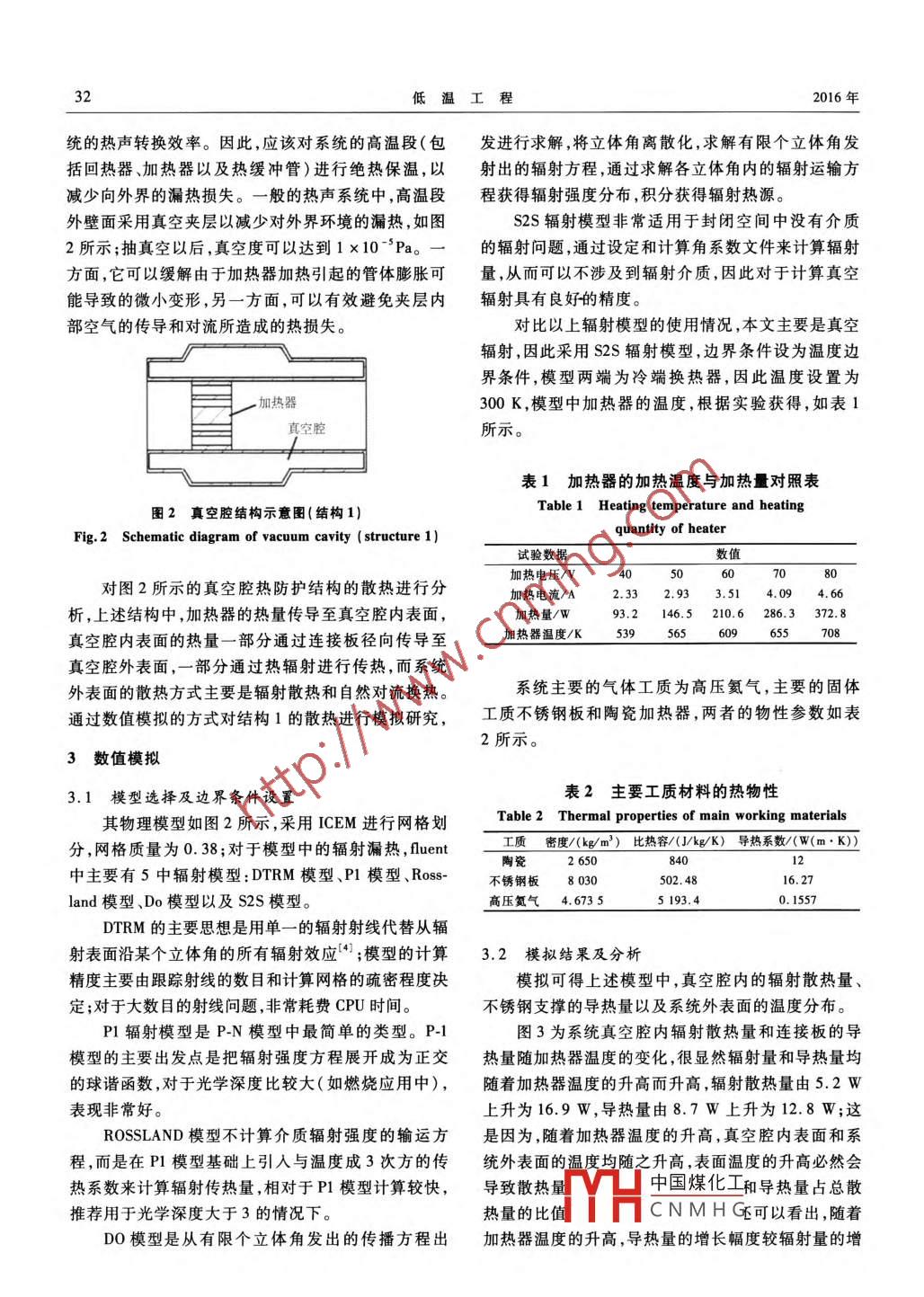 2016年第3期低溫工程No.32016總第211期CRYOGENICSSum No 211熱聲系統(tǒng)高溫段的漏熱分析與防護結(jié)構(gòu)的優(yōu)化設計李娟·2周剛李青(中國科學院理化技術(shù)研究所航天低溫推進劑技術(shù)國家重點實驗室北京100190)(2中國科學院大學北京100049)摘要:對熱聲系統(tǒng)高溫段的漏熱進行理論分析,建立高溫段真空防護結(jié)構(gòu)的物理模型,并基于uent中S2S模型,對模型進行了穩(wěn)態(tài)數(shù)值模擬,得到了輻射散熱量、導熱量、外表面的熱流量隨加熱溫度的變化,以及輻射和導熱占總漏熱量的比值;在此基礎(chǔ)上,對防護結(jié)構(gòu)進行優(yōu)化,提出防護結(jié)構(gòu)2,對比分析了兩種熱防護結(jié)構(gòu)的防漏熱效果。結(jié)果表明,真空防護結(jié)構(gòu)會有效的減少系統(tǒng)的漏熱,增大系統(tǒng)的熱聲轉(zhuǎn)換效率,且優(yōu)化后的結(jié)構(gòu)2較結(jié)構(gòu)1更能有效的減少系統(tǒng)漏熱。關(guān)鍵詞:熱聲高溫漏熱真空結(jié)構(gòu)設計中圖分類號:TB65文獻標識碼:A文章編號:100046516(2016)030030405Heat leakage analysis and optimum design of high temperaturesection of thermoacoustic systemLi juZhou gng( 'State Key Laboratory of Technologies in Space Cryogenic Propellants, Technical Instituteof Physics and Chemistry Chinese Academy of Sciences, Beijing 100190, China)Abstract: Theoretical analysis of heat leakage has been made in the high temperature section of thethermoacoustic system. Physical model of the vacuum cavity structure is established, the steady-state numerical simulation is carried out basing on S2S model. The amount of radiation, heat conduction and heatflux of the external surface with the change of the heating temperature, and the ratio of radiation and heatconduction to the total leakage rate were obtained. On this basis, an optimized structure, structure 2 is pro-posed. And thermal protection effect is compared between two different structures. The results show that thevacuum protection structure can effectively reduce the heat leakage of the system, increase the efficiency ofhe system, and the optimized structure 2 is more effective than the 1Key words: thermoacoustic; high temperature; vacuum cavity; structure design1引言動部件、工作可靠性高、可使用低品位熱源和環(huán)保的工作介質(zhì)等優(yōu)點,因此應用前景十分廣闊。根據(jù)系統(tǒng)熱聲發(fā)動機是一種利用熱聲效應將熱能轉(zhuǎn)化為中聲場的特性可以將熱聲發(fā)動機分為駐波熱聲發(fā)動聲能的新型熱力機械,具有結(jié)構(gòu)簡單、無或極少有運機和行波熱聲發(fā)動機,行波熱聲發(fā)動機中,氣體微粒中國煤化工收稿日期:201604-21;修訂日期:20160601CNMHG作者簡介:李娟,女,24歲,碩士研究生。第3期熱聲系統(tǒng)高溫段的漏熱分析與防護結(jié)構(gòu)的優(yōu)化設計31所經(jīng)歷的熱力學循環(huán)為類似于理想的斯特林循環(huán),因K,溫度較高,對流和輻射漏熱較大。在不采用減少此其效率高于駐波熱聲發(fā)動機。對于理想的熱聲發(fā)漏熱措施的情況下,高溫段的漏熱,主要包括自然對動機,其熱聲轉(zhuǎn)換效率E其中E為聲功流,Q流換熱E對和輻射漏熱E額(包括對外界環(huán)境的輻射漏熱和對冷端換熱器的輻射漏熱)。本次主要針為熱流,對應可得熱聲轉(zhuǎn)換效率,然而對于實際的熱對高溫段對外界環(huán)境的漏熱進行研究,因此,計算中聲發(fā)動機,由加熱器加入到系統(tǒng)中的熱量,不僅用于忽略對冷端換熱器的輻射漏熱,以下所指輻射散熱即回熱器的熱聲轉(zhuǎn)換,導熱、流動損失、回熱器的非理為對外界環(huán)境的輻射散熱,總漏熱指對外界環(huán)境的輻想性均會對發(fā)動機的熱聲轉(zhuǎn)換效率造成較大比例射散熱與自然對流散熱之和。按自然對流換熱系數(shù)的影響其中高溫段(包括加熱器、回熱器和熱緩沖6W/m2K,高溫段面積為9.24×103m2,溫度為管)的漏熱是熱聲系統(tǒng)熱損失的主要來源之一,因650K對自然對流換熱和輻射漏熱量進行計算:此十分有必要對該高溫段的漏熱進行理論分析和E對流=hA△t=6×9.24×10模擬研究。(650-300)W=19.4W(1)關(guān)于熱聲系統(tǒng)漏熱的研究很少,對于高溫段的漏Eg=cA(r-Tn)=0.4×567×102x熱研究,李山峰"通過實驗的手段,測量得到在發(fā)動9.24×103×(6504-3004)=35.7W(2)機熱端溫度550℃以上時,通過保溫層的漏熱量達到式中:h為自然對流傳熱系數(shù),W/m2K;A為高200W以上,從而提出,通過減小回熱器以及熱緩沖溫段的表面面積,m2;b為不銹鋼面的發(fā)射率;為管管壁的厚度降低導熱損失減小熱端換熱器以及次黑體輻射常數(shù)其值為567×108W/(m2·K“)。水冷器表面的黑度來降低輻射換熱損失,并改進保溫措施以減少漏熱。另外與一般的流動換熱不同,熱聲容腔系統(tǒng)內(nèi)是交變流動換熱。在交變流動換熱的研究中,主冷端換熱器Dean, smith等2對管內(nèi)交變流動傳熱進行實驗研究,引入復努塞爾數(shù),獲得每一階熱流密度和溫差以及兩者間的相位角,進而求得每一階的復換熱系數(shù)以回熱器及復努塞爾數(shù)。然而周期換熱的情況未給出,使得其加熱器研究結(jié)果無法推廣應用于一般情況的交變流動傳熱計算。 Bouvier等3針對圓管內(nèi)交變流動傳熱進行了熱緩沖管實驗研究,采用反傳熱的方法,通過測量壁面內(nèi)的溫副冷端換熱器度或是流體的溫度,推導得到交界面處的熱流密度和溫度以及無量綱換熱系數(shù),但是其測量方法比較困難,精度難以保證。