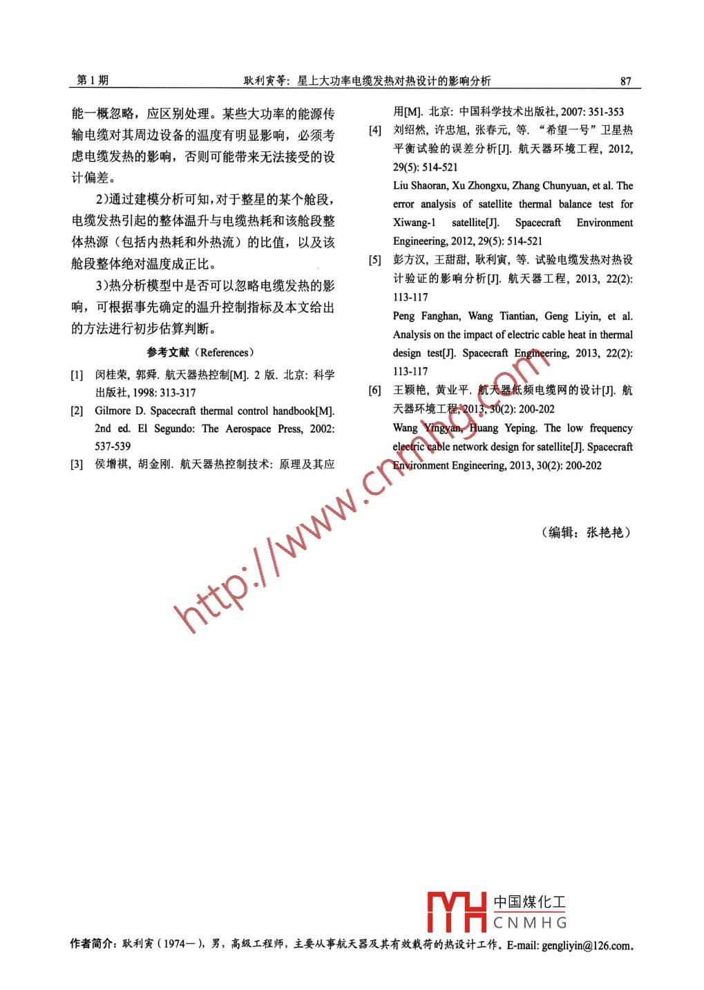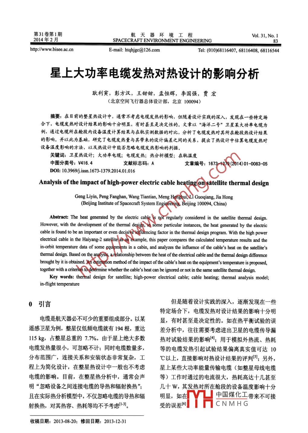 第31卷第1期天器環(huán)境工程Vol 31. No. 12014年2月SPACECRAFT ENVIRONMENT ENGINEERINGhttp://www.bisee.accnE-mail:htqhjgc(@126.comTel:(010)68116407,68116408,68116544星上大功率電纜發(fā)熱對熱設(shè)計的影響分析耿利寅,彭方漢,王甜甜,孟恒輝,李國強,賈宏(北京空間飛行器總體設(shè)計部,北京100094)摘要:在目前的整星熱設(shè)計中,通常不考慮電纜發(fā)熱的影響,但隨著設(shè)計實踐的深入,發(fā)現(xiàn)在一些特定場合下,電纜發(fā)熱對設(shè)計結(jié)果的影響十分明顯,有時甚至是決定性的。文章以“海洋二號”衛(wèi)星某大功率電纜為例,通過電纜所在艙段內(nèi)設(shè)備溫度計算結(jié)果與在軌實測數(shù)據(jù)的對比,分析了電纜發(fā)熱對其所在艙段熱設(shè)計結(jié)果的影響。并以此為基礎(chǔ),研究了電纜發(fā)熱量與其帶來的設(shè)計偏差之間的關(guān)系,提出了熱設(shè)計中估算電纜發(fā)熱對設(shè)備溫度影響的方法,以及熱設(shè)計中能否忽略電纜發(fā)熱影響的判據(jù)關(guān)鍵詞:衛(wèi)星熱設(shè)計;大功率電纜;電纜發(fā)熱;熱分析模型;在軌溫度中圖分類號:V416.4文獻標(biāo)志碼:A文章編號:1673-1379(2014)01-008305Do:10.3969iss.1673-1379201401.016Analysis of the impact of high-power electric cable heating on satellite thermal designGeng Liyin, Peng Fanghan, Wang Tiantian, Meng Henghui, Li Guoqiang, Jia Hong( Beijing Institute of Spacecraft System Engineering, Beijing 100094, China)Abstract: The heat generated by the electric cable is not regularly considered in the satellite thermal designHowever, with the development of the thermal design, in some particular instances, the heat generated by the electriccable is found to be an important or even decisive influencing factor in the thermal design program. With the high powerelectrical cable in the Haiyang-2 satellite as an example, this paper compares the calculated temperature results and thein-orbit temperature data of some equipments in a cabin, and analyzes the influence of the cable's heat on the satellite'sthermal design. Based on the analysis, a relationship between the heat of the electrical cable and the thermal design differencebrought by it is obtained. An estimation method of the impact of the cable 's heat on the equipment,'s temperature is proposed,together with a criterion to determine whether the cable's heat can be ignored or not in the same satellite thermal design.Key words: thermal design for satellite; high-power electrical cable; cable heating; thermal analysis model0引言但是隨著設(shè)計實踐的深入,逐漸發(fā)現(xiàn)在一些特定場合下,電纜發(fā)熱對設(shè)計結(jié)果的影響十分明電纜是航天器必不可少的重要組成部分。以某顯,有時甚至是決定性的。如在熱平衡試驗的誤遙感衛(wèi)星為例,整星僅低頻電纜就有194根,重達差分析中,往往需要考慮進出衛(wèi)星的電纜傳導(dǎo)漏11}kg,占整星總重的7%。由于星上絕大多數(shù)熱對試驗結(jié)果的影響;用于模擬外熱流、熱耗電纜發(fā)熱量很小,可忽略不計;同時電纜數(shù)量多,等的電纜發(fā)熱引起試驗結(jié)果偏離真實值可達10分布范圍廣,連接關(guān)系和安裝狀態(tài)非常復(fù)雜,工℃以上,直接影響對熱設(shè)計結(jié)果的評判;另外,程上為簡化設(shè)計,在整星熱設(shè)計中一般也不考慮星上某些大功率能量傳輸電纜(如整星母線電纜電纜的影響。目前,在整星熱分析中,通常會聲等)工作時通過的電流很大,熱耗高達十幾甚至明“忽略設(shè)備之間連接電纜的導(dǎo)熱和輻射換熱”;幾十W,其發(fā)熱對所在艙段的設(shè)備溫度影響十分且在實際熱分析模型中,不僅忽略電纜的導(dǎo)熱和輻明顯,如在中國煤化工帶來不可接射換熱,對其熱容、熱耗等均不予考慮引。受的誤差CNMHG收稿日期:2013-08-20;修回日期:2013-1231天器環(huán)境工程本文以“海洋二號”衛(wèi)星為例,通過熱設(shè)計切板上。計算結(jié)果與在軌飛行數(shù)據(jù)的對比,分析星上一根相關(guān)艙段的熱設(shè)計情況為:因y面向陽,故y大功率電纜發(fā)熱對其所在小艙設(shè)備溫度的影響,小艙僅底面(-x向)外側(cè)開設(shè)有散熱面,+zy小艙并以此為基礎(chǔ),研究電纜發(fā)熱量與其帶來的設(shè)計僅對地面開設(shè)散熱面,散熱面類型均為OSR。偏差之間的關(guān)系,分析熱設(shè)計中電纜發(fā)熱對設(shè)備溫度影響的估算方法,以期獲得熱設(shè)計中能否忽略電纜發(fā)熱影響的判斷依據(jù)。1問題的提出1.1大功率電纜所在艙段情況簡介海洋二號”衛(wèi)星運行在降交點地方時為6:00的太陽同步近圓軌道上,軌道標(biāo)稱高度圖1大功率電纜的布置與走向Fig 1 Layout and direction of the large power electric cable970.732km、傾角9934015°,軌道周期104456min正常飛行姿態(tài)下,衛(wèi)星+z軸指向地心,+x軸為飛行方向,+y方向為衛(wèi)星的背陽面。為排除其他因素對研究的影響,本文僅分析星上與大功率電纜相關(guān)的艙段情況。電纜W050是由太陽電池陣到電源控制器的功率傳輸通道來自太陽電池陣的所有電能均通過該電纜輸送到星上。該電纜布置在衛(wèi)星服務(wù)艙的+zy小艙和y小艙內(nèi)(見圖1)。其中,+zy小艙內(nèi)布置了5臺圖2大功率電纜所在艙段內(nèi)的設(shè)備布局設(shè)備,y小艙內(nèi)布置了4臺設(shè)備(見圖2)。表Fig 2 Equipment layout in the cabin where large power列出了這些設(shè)備的工作熱耗,其中除電源控制electric cable place器布置在+z外壁板內(nèi)側(cè)外,其他設(