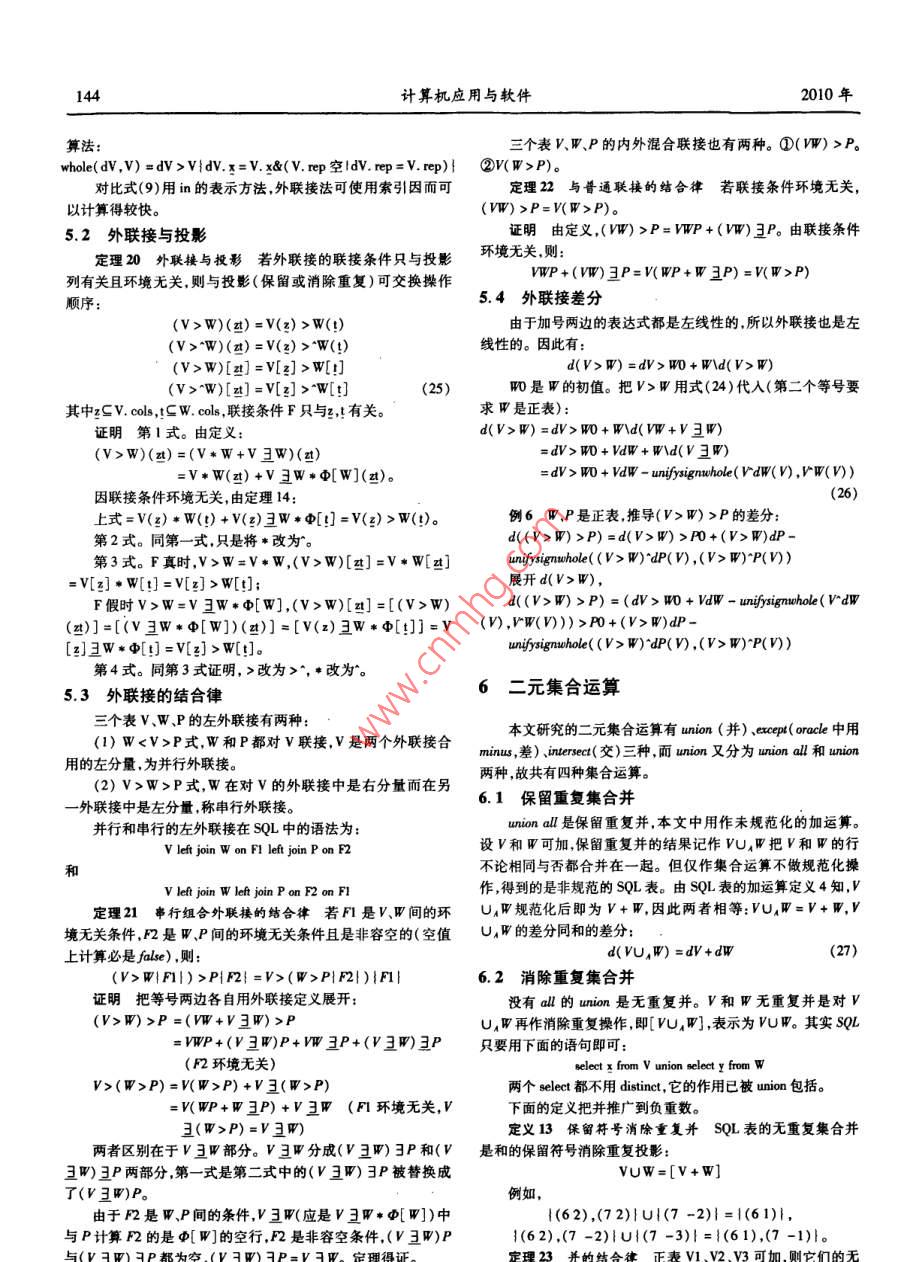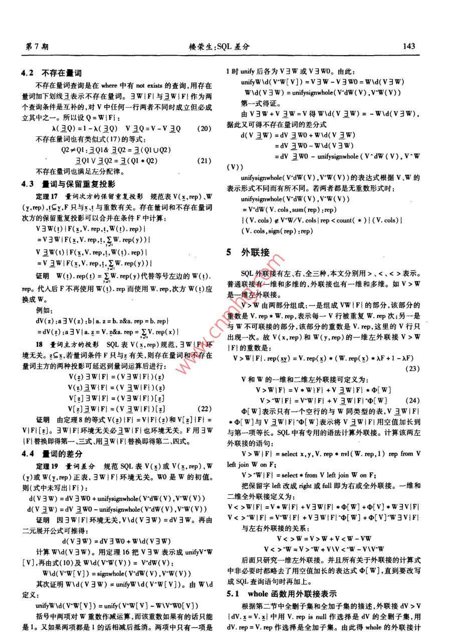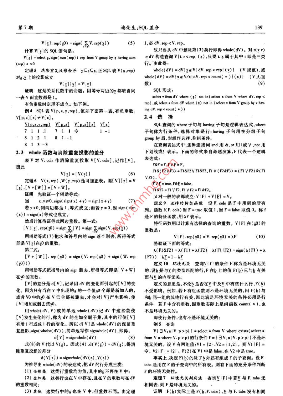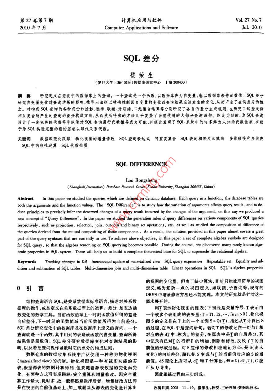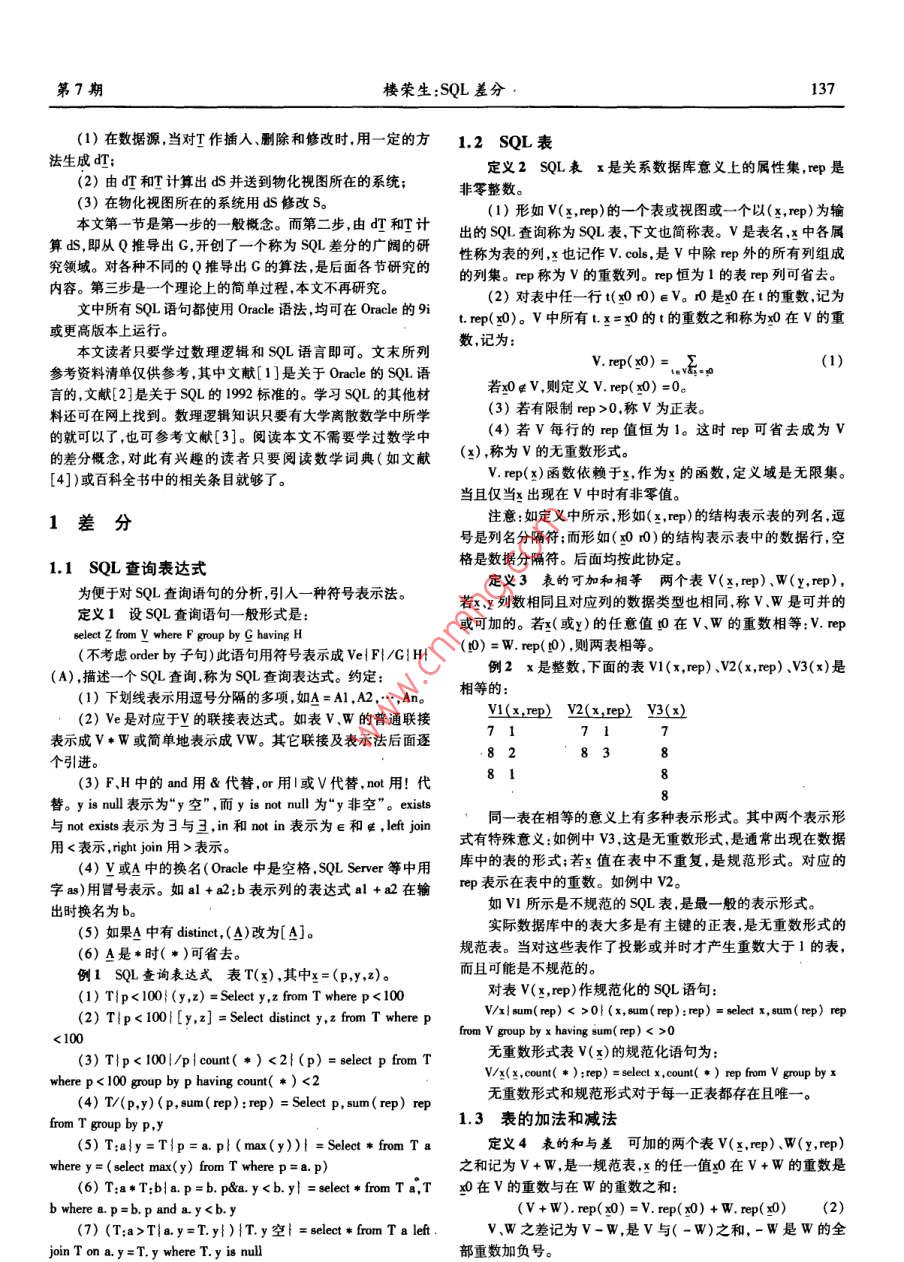 第27卷第7期計算機應用與軟件Vol. 27 No. 72010年7月Computer Applications and SoftwareJul.2010SQL差分樓榮生(復且大學上海(國際)數(shù)據(jù)庫研究中心上海200433)摘要研究定義在變化中的數(shù)據(jù)庫上的查詢。一個查詢是一個函數(shù),以數(shù)據(jù)庫表為自變量,也以數(shù)據(jù)庫表作函數(shù)值。SQL差分研究自變量變化對查詢結(jié)果的影響,推導出法則以精確推斷因自變量的變化而查詢結(jié)果應該發(fā)生的變化,從而產(chǎn)生了查詢差分的概念。對構(gòu)成sL查詢的各種成份如投影、選擇、聯(lián)接、外聯(lián)接、二元集合運算等分別研究了各自的差分生成規(guī)則,也研究了這些成份相互復合所產(chǎn)生的查詢的差分構(gòu)成方法,從而使所得出的方法幾乎復蓋了當前使用的大部分查詢語句。以此為目的,為SQL查詢設計了一套完善的代數(shù)符號以使對SQL查詢進行代數(shù)推導成為可能,并據(jù)此發(fā)現(xiàn)了SQL系統(tǒng)中的許多鮮為人知的代數(shù)性質(zhì),有助于為SQL構(gòu)造完整的理論基礎(chǔ)以取代關(guān)系代數(shù)。關(guān)鍵詞數(shù)據(jù)庫變化跟蹤物化視圖的增量修改SQL查詢表達式可重復集合SQL表的相等及加減法多維聯(lián)接和多維表SQL中的線性運算SL代數(shù)性質(zhì)SQL DIFFERENCEou tongshenAbstract In this paper we studied the queries which are defined on dynamic database. Each query is a function, the database tables areoth the arguments and the function values. The "SQL Difference"is to study how the variation of arguments affects query result, and to de-duce principles to precisely infer the deserved changes of a query result incurred by the changes of the argument, on this way we produced anew concept of"Query Difference". In the paper we studied the generation rules of query differeomponents of SQLrespectively, such as projection, selection, join, out- join and binary set operations, etc. as well as studied the composition of difference ofthe queries derived from the mutual compositing of those components. As a result, the solution provided in this paper almost covers a greatpart of the query syntaxes that are currently in use. To achieve above objective, in this paper a set of complete algebra symbols are designedfor SQL query, so that the algebra reasoning on SQL querying becomes possible. During the course, we discovered many rarely known alge-braic properties in SQL system. These will help us to build a complete theoretical base for SQL to supersede the relational algebraKeywords Tracking changes in DB Incremental update of materialized view SQL query expression Repeatable set Equality and ad-dition and subtraction of SQL tables Multi-dimension join and multi-dimension table Linear operations in SQL SQLs algebra properties的視圖的變化量。但由于缺少算法,目前只能處理簡單的視圖0引言定義,略為復雜一點的視圖定義,如聯(lián)接、子查詢等,現(xiàn)有的DBMS中增量修改方法還不能實現(xiàn)。本文的研究就是針對這結(jié)構(gòu)查詢語言SQL,是關(guān)系數(shù)據(jù)庫標準語言,描述對關(guān)系數(shù)需求展開的。據(jù)庫的操作,或是定義在關(guān)系數(shù)據(jù)庫上的運算。差分,是表達函用T表示物化視圖的源表(下劃線是矢量符號T表示由數(shù)變化的數(shù)學工具。當前函數(shù)值減上一時刻函數(shù)值所得的差是個或多個表組成的表矢量:T=T,T2,…,Tn;n>0),物化視向后差分,下一時刻的函數(shù)值減當前函數(shù)值所得為向前差分。圖S的定義是在T上的一個查詢S=Q(T),描述從T計算出SSQL差分研究變化中的數(shù)據(jù)庫及在數(shù)據(jù)庫上定義的查詢。一個的過程在SQL中是查詢語句。若對T的修改記在一組與T相查詢就是一個函數(shù)其中用到的表是該函數(shù)的自變量查詢所得對應的表中稱為T的差分,在源表中是T的向后差分,其結(jié)果集是函數(shù)值。SQL差分研究數(shù)據(jù)庫變化對查詢結(jié)果的影中記錄有已對T的行所作的增加、刪除和修改,反映了T的當響,以及若把查詢視作函數(shù)時它的差分的構(gòu)成法則。前值的形成過程。對S應作的修改相應地記為ds,是S(尚未數(shù)據(jù)倉庫的數(shù)據(jù)收集系統(tǒng)中廣泛使用一種稱為物化視圖變化)的向前差分藉以把S變成與T的當前值對應的S的當( materialized view)的機制。物化視圖是一種有視圖功能的實前值。dS理論上應可從娌和T計算出:dS=C(哩,T),G應表根據(jù)源表的數(shù)據(jù)計算得到,但要隨著源表數(shù)據(jù)的變化而變可從Q導出。化。有兩種方式可實現(xiàn)跟蹤:完全重算和增量修改。因完全重因此跟蹤過程由三步組成:算工作量大耗時多故一般都愿意選擇后者。增量修改方法即是在視圖的當前值基礎(chǔ)上,加上或刪除從源表的變化量計算出收稿日期:2008-11-19。樓榮生,教授,主研領(lǐng)域:數(shù)據(jù)庫技術(shù)第7期樓榮生:SQL差分137(1)在數(shù)據(jù)源當對作插人、刪除和修改時用一定的方1.2SQL表法生成dT;定義2SQL表x是關(guān)系數(shù)據(jù)庫意義上的屬性集,ep是(2)由d和計算出dS并送到物化視圖所在的系統(tǒng);非零整數(shù)。(3)在物化視圖所在的系統(tǒng)用ds修改S。1)形如v(x,rep)的一個表或視圖或一個以(x,rep)為輸本文第一節(jié)是第一步的一般概念。而第二步由扛和計出的SQu查詢稱為SQL表下文也簡稱表。V是表名,中各屬算ds,即從Q推導出G開創(chuàng)了一個稱為SQL差分的廣闊的研性稱為表的列,x也記作v.cols,是V中除rep外的所有列組成究領(l