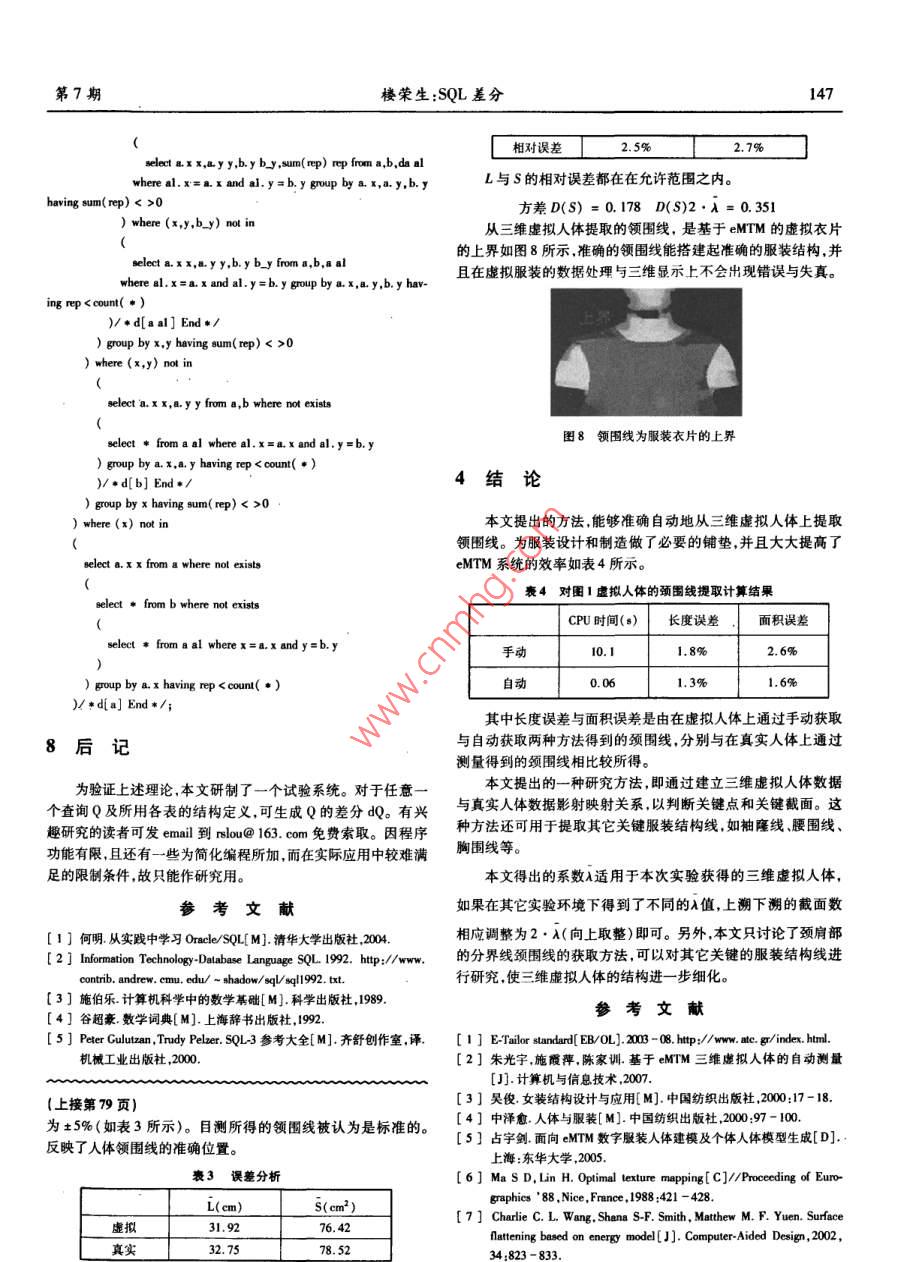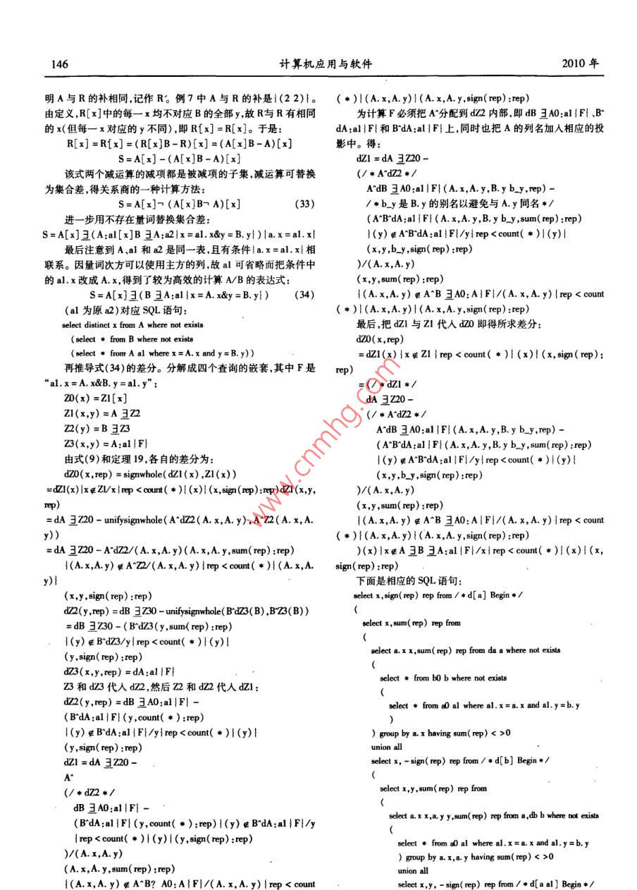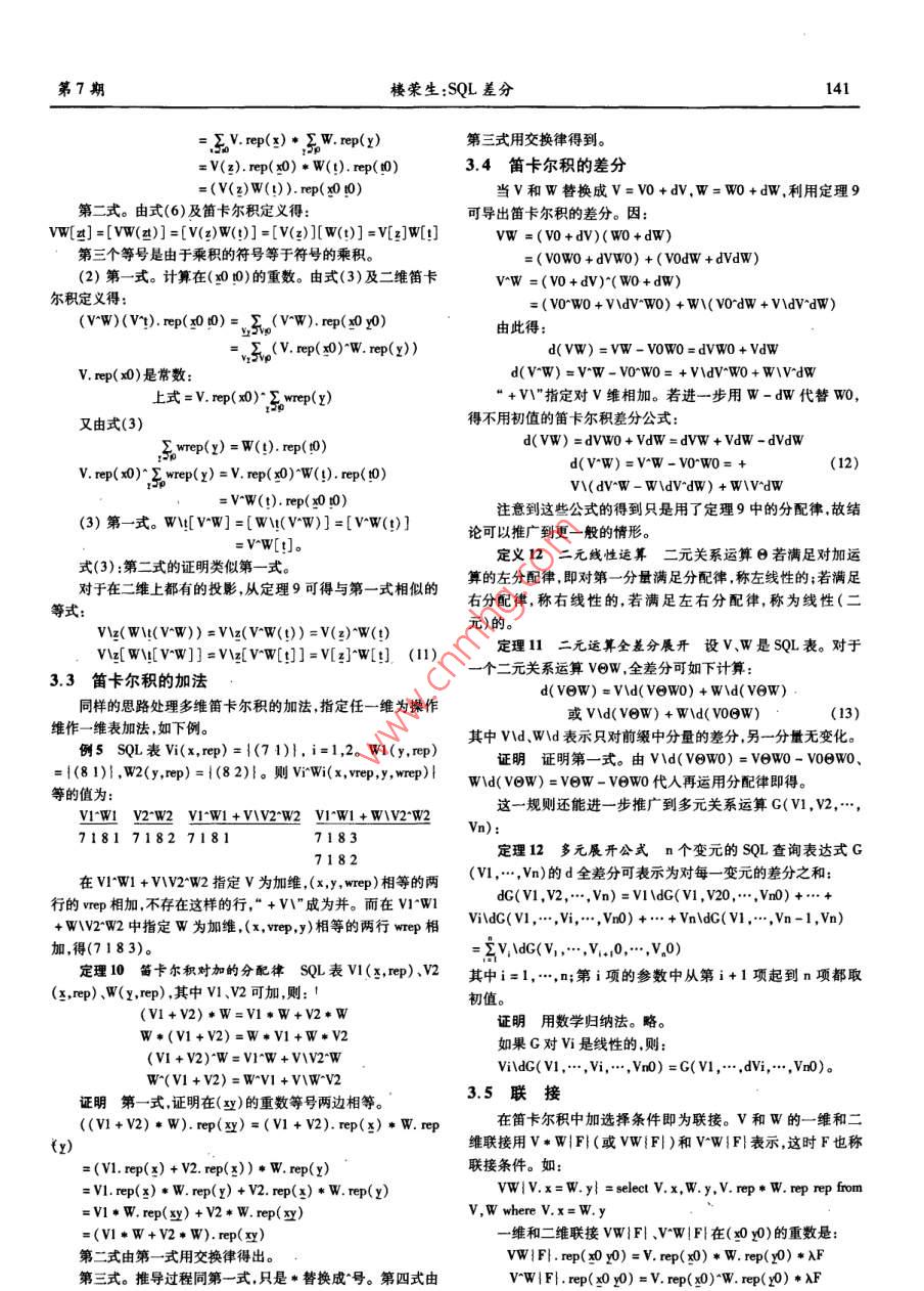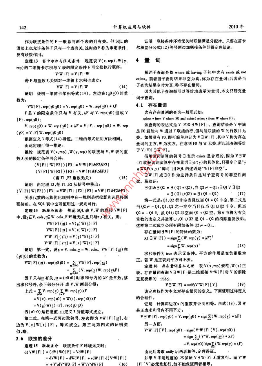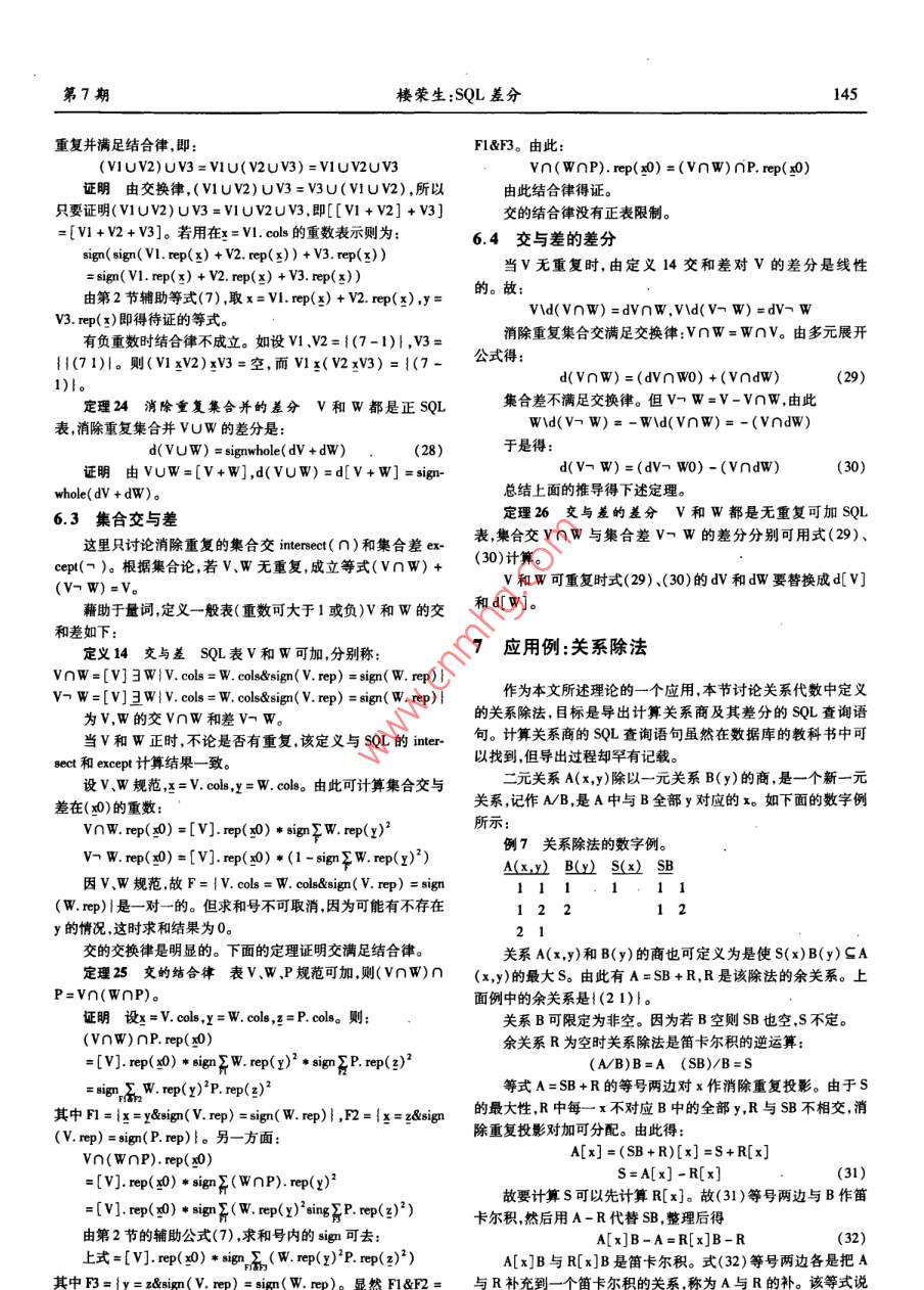 第27卷第7期計算機應用與軟件Vol. 27 No. 72010年7月Computer Applications and SoftwareJul.2010SQL差分樓榮生(復且大學上海(國際)數(shù)據(jù)庫研究中心上海200433)摘要研究定義在變化中的數(shù)據(jù)庫上的查詢。一個查詢是一個函數(shù),以數(shù)據(jù)庫表為自變量,也以數(shù)據(jù)庫表作函數(shù)值。SQL差分研究自變量變化對查詢結(jié)果的影響,推導出法則以精確推斷因自變量的變化而查詢結(jié)果應該發(fā)生的變化,從而產(chǎn)生了查詢差分的概念。對構(gòu)成sL查詢的各種成份如投影、選擇、聯(lián)接、外聯(lián)接、二元集合運算等分別研究了各自的差分生成規(guī)則,也研究了這些成份相互復合所產(chǎn)生的查詢的差分構(gòu)成方法,從而使所得出的方法幾乎復蓋了當前使用的大部分查詢語句。以此為目的,為SQL查詢設計了一套完善的代數(shù)符號以使對SQL查詢進行代數(shù)推導成為可能,并據(jù)此發(fā)現(xiàn)了SQL系統(tǒng)中的許多鮮為人知的代數(shù)性質(zhì),有助于為SQL構(gòu)造完整的理論基礎(chǔ)以取代關(guān)系代數(shù)。關(guān)鍵詞數(shù)據(jù)庫變化跟蹤物化視圖的增量修改SQL查詢表達式可重復集合SQL表的相等及加減法多維聯(lián)接和多維表SQL中的線性運算SL代數(shù)性質(zhì)SQL DIFFERENCEou tongshenAbstract In this paper we studied the queries which are defined on dynamic database. Each query is a function, the database tables areoth the arguments and the function values. The "SQL Difference"is to study how the variation of arguments affects query result, and to de-duce principles to precisely infer the deserved changes of a query result incurred by the changes of the argument, on this way we produced anew concept of"Query Difference". In the paper we studied the generation rules of query differeomponents of SQLrespectively, such as projection, selection, join, out- join and binary set operations, etc. as well as studied the composition of difference ofthe queries derived from the mutual compositing of those components. As a result, the solution provided in this paper almost covers a greatpart of the query syntaxes that are currently in use. To achieve above objective, in this paper a set of complete algebra symbols are designedfor SQL query, so that the algebra reasoning on SQL querying becomes possible. During the course, we discovered many rarely known alge-braic properties in SQL system. These will help us to build a complete theoretical base for SQL to supersede the relational algebraKeywords Tracking changes in DB Incremental update of materialized view SQL query expression Repeatable set Equality and ad-dition and subtraction of SQL tables Multi-dimension join and multi-dimension table Linear operations in SQL SQLs algebra properties的視圖的變化量。但由于缺少算法,目前只能處理簡單的視圖0引言定義,略為復雜一點的視圖定義,如聯(lián)接、子查詢等,現(xiàn)有的DBMS中增量修改方法還不能實現(xiàn)。本文的研究就是針對這結(jié)構(gòu)查詢語言SQL,是關(guān)系數(shù)據(jù)庫標準語言,描述對關(guān)系數(shù)需求展開的。據(jù)庫的操作,或是定義在關(guān)系數(shù)據(jù)庫上的運算。差分,是表達函用T表示物化視圖的源表(下劃線是矢量符號T表示由數(shù)變化的數(shù)學工具。當前函數(shù)值減上一時刻函數(shù)值所得的差是個或多個表組成的表矢量:T=T,T2,…,Tn;n>0),物化視向后差分,下一時刻的函數(shù)值減當前函數(shù)值所得為向前差分。圖S的定義是在T上的一個查詢S=Q(T),描述從T計算出SSQL差分研究變化中的數(shù)據(jù)庫及在數(shù)據(jù)庫上定義的查詢。一個的過程在SQL中是查詢語句。若對T的修改記在一組與T相查詢就是一個函數(shù)其中用到的表是該函數(shù)的自變量查詢所得對應的表中稱為T的差分,在源表中是T的向后差分,其結(jié)果集是函數(shù)值。SQL差分研究數(shù)據(jù)庫變化對查詢結(jié)果的影中記錄有已對T的行所作的增加、刪除和修改,反映了T的當響,以及若把查詢視作函數(shù)時它的差分的構(gòu)成法則。前值的形成過程。對S應作的修改相應地記為ds,是S(尚未數(shù)據(jù)倉庫的數(shù)據(jù)收集系統(tǒng)中廣泛使用一種稱為物化視圖變化)的向前差分藉以把S變成與T的當前值對應的S的當( materialized view)的機制。物化視圖是一種有視圖功能的實前值。dS理論上應可從娌和T計算出:dS=C(哩,T),G應表根據(jù)源表的數(shù)據(jù)計算得到,但要隨著源表數(shù)據(jù)的變化而變可從Q導出。化。有兩種方式可實現(xiàn)跟蹤:完全重算和增量修改。因完全重因此跟蹤過程由三步組成:算工作量大耗時多故一般都愿意選擇后者。增量修改方法即是在視圖的當前值基礎(chǔ)上,加上或刪除從源表的變化量計算出收稿日期:2008-11-19。樓榮生,教授,主研領(lǐng)域:數(shù)據(jù)庫技術(shù)第7期樓榮生:SQL差分137(1)在數(shù)據(jù)源當對作插人、刪除和修改時用一定的方1.2SQL表法生成dT;定義2SQL表x是關(guān)系數(shù)據(jù)庫意義上的屬性集,ep是(2)由d和計算出dS并送到物化視圖所在的系統(tǒng);非零整數(shù)。(3)在物化視圖所在的系統(tǒng)用ds修改S。1)形如v(x,rep)的一個表或視圖或一個以(x,rep)為輸本文第一節(jié)是第一步的一般概念。而第二步由扛和計出的SQu查詢稱為SQL表下文也簡稱表。V是表名,中各屬算ds,即從Q推導出G開創(chuàng)了一個稱為SQL差分的廣闊的研性稱為表的列,x也記作v.cols,是V中除rep外的所有列組成究領(l