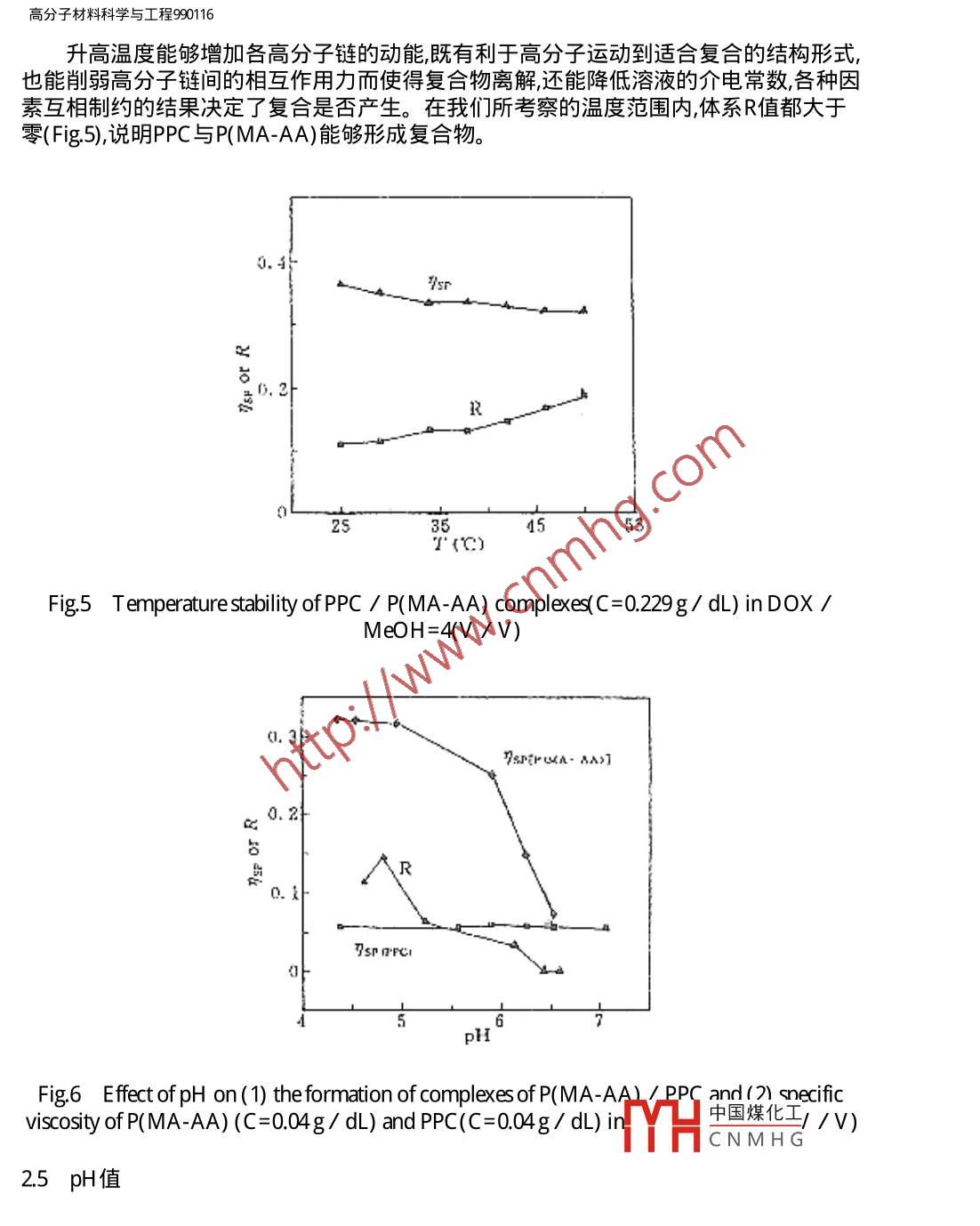 高分子材料科學(xué)與工程990116高分子材料科學(xué)與工程舊萬(wàn)萬(wàn)數(shù)據(jù)chilPOLYMERMATERIALS科技期刊WANFANG DATAscienceENGINEERING1999年第1期No.11999聚碳酸亞丙酯與丙烯酸甲酯-丙烯酸共聚物復(fù)合作用研究林欣欣陳立班余愛(ài)芳(中國(guó)科學(xué)院廣州化學(xué)研究所,廣州,510650)摘要研究了聚碳酸亞丙酯與丙烯酸甲酯-丙烯酸垬聚物的混合稀溶液性質(zhì),發(fā)現(xiàn)在定條件下兩種高分子可以生成氬鍵復(fù)合物。其氬鍵強(qiáng)度、復(fù)合物的穩(wěn)定性受溶劑類(lèi)型、體系pH值、溫度、聚合物的組成和分子量的影響。關(guān)鍵詞聚碳酸亞丙酯,丙烯酸甲酯-丙烯酸共聚物,氫鍵復(fù)合物COMPLEXATION BETWEEN POLY(PROPYLENECARBONATE) ANDACRYLIC ACID-METHYL ACRYLATE COPOLYMERLin Xinxin, Chen Liban, Yu AifangGuangzhou Institute of Chemistry, Academia Sinica, GuangzhouABSTRACT Dilute solution properties of poly(propylene carbonate)(I), acrylicacid-methyl acrylate copolymer(I)and their mixtures were studied. The results conformedthe presence of hydrogen-bonding in the solution of the mixed polymers through-COOH ofII and -CO3-of i. It was found that the formation of complexes was influenced bysolvents, blending ratio, concentration and molecular weight of the polymers. In the case ofcombining a random copolymer Il containing 33 mass of Aa and the polymer Il withMn lager than 3000, good complexation is obtained when pH=5. DOX/MeOH=4(V/v)and i/i=0. 6(unite mole ratioKeywords poly(propylene carbonate), acrylic acid-methyl acry late copolymerhydrogen-bonding complexes不同聚合物間組成氫鍵復(fù)合物,是增強(qiáng)分子間作用和顯著改善聚合物的性能的有效途徑。已有文獻(xiàn)報(bào)導(dǎo)芳香型聚碳酸酯(PC)可以和某些聚合物生廣了亡〔中國(guó)煤花為PC上的苯環(huán)在氫鍵形成中起了作用[11。由CO2和環(huán)氧化物共聚CNMHG碳酸酯。但這類(lèi)聚碳酸酯不含芳香基團(tuán)。尚無(wú)文獻(xiàn)討論過(guò)可否用它生成氬鍵復(fù)合物及復(fù)合物的組成方式。本文用丙烯酸甲酯-丙烯酸共聚物[P(MA-AA)]提供氫鍵質(zhì)子,考察它fle∥ E yak/gfzclky×ygc/gfzc99gfzc9901/99016hm(第1/7頁(yè))20103221945:18高分子材料科學(xué)與工程990116與聚碳酸亞丙酯(PPC)的相互作用方式與規(guī)律。1實(shí)驗(yàn)部分PPC按已公布的方法[2]合成。P(MAAA)是70℃下在丙酮中,以過(guò)氧化苯甲酰引發(fā)聚合得到單體摩爾比為MA/AA=1.6共聚物中AA含量為0.36摩爾分?jǐn)?shù)。二氧六環(huán)(DOX)、甲醇(MeOH)和NN-二甲基甲酰胺(DMF)均為AR級(jí)試劑未進(jìn)一步處理。兩種聚合物均以稀溶液混合除非文中特別提到,復(fù)合組分質(zhì)≌量比為P(PA-AA)/PC·1。PC的Mn=33×104[3]。DOX占混合溶劑體積的80%、粘度用烏氏粘度計(jì)在35℃C測(cè)定。溶液的pH值用HC棫或KOH的甲醇溶調(diào)節(jié),pH值用上海第二分析儀器廠的PHS2型酸度計(jì)測(cè)定。用 ANALECF REF-65F-R儀測(cè)定了IR譜圖。2結(jié)果與討論在使P(MAAA)濃度 CP(MA-AA)恒定的條件下按各種比例配制它與PPC的混合溶液。發(fā)現(xiàn)體系的pH值隨PPC含量的增大而升高(Tab.1),此時(shí)IR譜圖不岀現(xiàn)原P(MA-AA羧基上的羥基吸收峰320cm1但有比P(MA-AA)分子內(nèi)氫鍵的伸縮振動(dòng)峰2956cm1能量更低的2913cm吸收峰。PPC酯基上醚鍵吸收峰1240cm1在復(fù)合前后無(wú)變化,而羰基的波數(shù)從復(fù)合前的174719cm1移到了173940cm1。這些數(shù)據(jù)說(shuō)明兩種聚合物之間形成了新形式的氫鍵:一C-0…HO-C不存在組分相互作用的混合溶液體系的比濃粘度符合以下關(guān)系[4]7,.C=W、!C1+W2,/C2式中W為質(zhì)量分?jǐn)?shù)C為濃度為增比粘度:下標(biāo)Q12分別表示混合溶液、聚合物1和聚合物2n91和門(mén)92分別是聚合物1和聚合物2在混合體系沖度為[中的粘度。本文所有實(shí)驗(yàn)中混合溶液是由濃度為C1的組分1和濃度為C2的∏CNMH成。n1和92的值是將C和C2的溶液分別稀釋一倍后測(cè)定的。在這種條件下式(1)簡(jiǎn)化fle∥/ E Vak/gfzclkxygd/gfzc9ygzc901/990116hm(第2/7頁(yè))20103221945:18高分子材料科學(xué)與工程990116為n92-2當(dāng)稀溶液中組分之間有氫鍵作用時(shí)體系粘度小。根據(jù)變化值△n=2n甲ns(os,定義一個(gè)粘度增長(zhǎng)因子:R=△n/2我們對(duì)脂肪族聚碳酸酯與含羧基聚合物進(jìn)行考察證實(shí)了復(fù)合物的形成,也說(shuō)明了復(fù)合確實(shí)是通過(guò)羧基氫與碳酸酯中羰基的作用實(shí)現(xiàn)的。0.0.Dvolumc (raction of MeOh or DMFFig 1 Solvents effect on the formation of complexes between P(MA-AA)and PPC: in meoh/dox, 2.in dme/dOX中國(guó)煤化工CNMHGfle∥ E yak/gfzclk×ygc/gfzc99gfzc9901/99016hm(第3/7頁(yè))20103221945:18高分子材料科學(xué)與工程9901160.20.40.6volume fraction of MxOr! oT DMFFig 2 Dependences of reduced viscosity of P(MA-AA)(C=0.040g /dL)and PPC(C=0.045 g/dL)on different solvents1: P(MA-AA)in DMF /DOX; 2: P(MA-AA)in MeoH /DoX; 3: PPC in MeOH /DOX; 4PPC in DMF/DOX3公le0.81.6PPC/P(MA-AA)