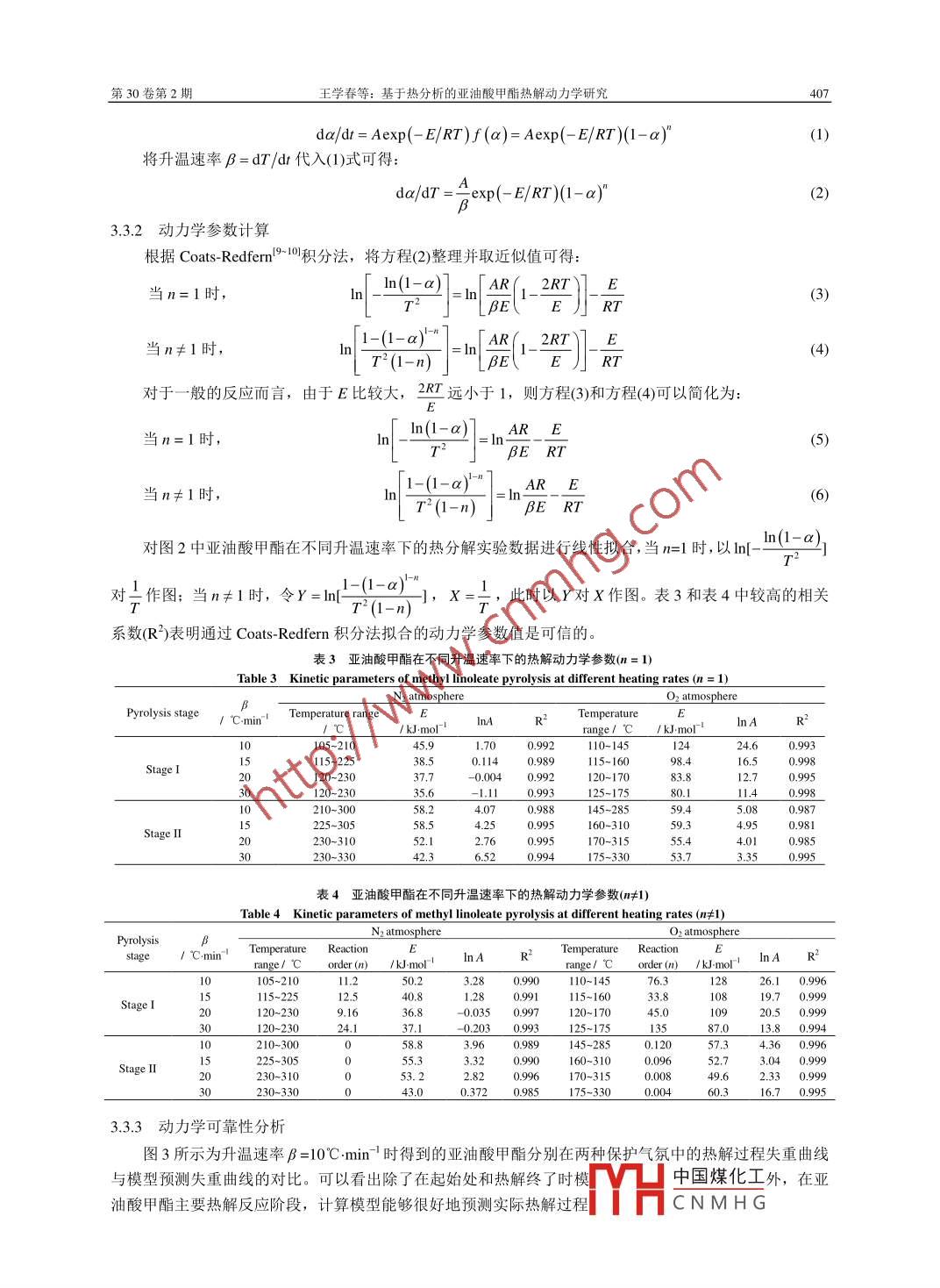 第30卷第2期高校化學工程學報4月Journal of Chemical Engineering of Chinese UniversitiesN2901603-9015(2016)02-0404-06基于熱分析的亞油酸甲酯熱解動力學研究王學春2,方建華2,陳波水2,陳爾余!,賈賢補1(1.武警杭州士官學校車輛維修系,浙江杭州3100232.后勤工程學院軍事油料應用與管理工程系,重慶401311)摘要:采用熱重分析方法研究了亞油酸甲酯在氮氣和氧氣氣氛中的熱分解特性,并采用 Coats-Redfern積分法對亞油酸甲酯的熱解過程進行動力學分析,建立了熱分解動力學模型,計算了相應的動力學參數(shù)。結果表明,亞油酸甲酯在j種氣氛中的熱分解均為兩步分解過程,且在氧氣氣氛中的熱安定性較差。隨著升溫速率提高,熱解區(qū)間向高溫區(qū)移動,熱解活化能和指前因子呈較好的動力學補償效應,且在不同升溫速率下具有不同的熱解反應機理函數(shù)。熱分解率計算值與實測值的誤差統(tǒng)計分析結果表明,數(shù)值模擬計算值與實測值的誤差在10%左右,動力學模型可有效預測亞油酸甲酯的熱分解過程。關鍵詞:亞油酸甲酯:熱重分析:熱解特性;動力學圖分類號:TQ050文獻標識碼:ADOI:10.3969/ L.Issn.1003-9015.201602.022Studies of Methyl Linoleate Thermo-Decomposition Kinetics by Thermal AnalysisWANG Xue-chun", FANG Jian-hua, CHEN Bo-shui, CHEN Er-yu, JIA Xian-bu(1. Department of Vehicle Maintenance, Hangzhou Academy of Non-Commisioned Officer of CAPFHangzhou 310023, China; 2. Department of Military Oil Application Administration EngineeringLogistical er401311, China)Abstract: Thermo-decomposition characteristics of methyl linoleate were investigated using agravimetric analyzer under nitrogen and oxygen atmospheres, respectively. The decomposition kineticsof methyl linoleate was analyzed by Coats-Redfern integral method. The kinetic models and parameters forthermo-decomposition of methyl linoleate were built and calculated. The results indicate thatthermo-decomposition of methyl linoleate under nitrogen or oxygen atmosphere is a two-step process, andmethyl linoleate exhibits relatively worse thermo-stability under oxygen atmosphere. Moreover, thedecomposition temperature of methyl linoleate increases with the increase of heating rates. The decompositionactivation energy and the pre-exponential factor present good kinetic compensation effects, and the kineticmechanism functions are different under different heating rates. Furthermore, statistical analysis also show thethe relative error of the decomposition rate between calculated and experimental values is about 10%demonstratesthat the kinetic models are reliable and effective in predicting thermo-decomposition processes ofmethyl linoleateKey words: methyl linoleate; thermo-gravimetric analysis; thermo-decomposition characteristics; kinetic前言隨著能源消耗量日益增加以及礦物燃料的日趨枯竭,迫切要求新型石油替代能源的快速發(fā)展,其中,生物柴油作為一種新型能源,已受到世界各國的普遍關注3。研究表明4,發(fā)動機在高溫條件下工作收稿日期:2014-12-17;修訂日期:2015-0409中國煤化工基金項目:國家自然科學基金(51375491):重慶市自然科學基金CSTC,2014 ICYJAA50021):后勤作者簡介:王學春(1990-),男,甘肅宕昌人,武警杭州士官學校助教,碩士。通訊聯(lián)系人:方建華HaCNMHG30卷第2王學春熱分析的亞油酸甲酯熱解動力學研究過程中,燃料會通過滲流或燃氣夾帶進入曲軸箱,造成發(fā)動杋油持續(xù)稀釋和污染等問題。然而,由于生物柴油熱解化學行為和機制的復雜性,致使學者對生物柴油誘導發(fā)動機潤滑油品質(zhì)衰變的熱分解特性和動力學研究至今還沒有深入的開展。實際上,生物柴油的熱不穩(wěn)定性是受其組成中不飽和脂肪酸的甲酯結構的影響,因此,研究和揭示不飽和脂肪酸甲酯的熱分解行為及動力學特性,對了解生物柴油誘導發(fā)動機油劣化的本質(zhì)具有十分重要的理論意義和工程應用價值。本文采用熱分析法對亞油酸甲酯的熱分解特性及其動力學規(guī)律進行初步的研究,以期進一步了解生物柴油的熱分解特性及其對發(fā)動機油的影響2實驗部分2.1材料與儀器(1)亞油酸甲酯:分析純,昊?;瘜W(上海)有限公司。(2)SDTQ600型熱分析儀(TG-DSC:美國范德比爾特公司生產(chǎn)。22實驗方法采用SDrQ600熱分析儀對亞油酸甲酯進行熱重分析。取試樣7mg置于熱天平的托盤內(nèi),選擇4個不同升溫速率,從室溫至600℃進行熱重分析,自動記錄熱解過程的質(zhì)量變化,可以得到連續(xù)熱重(TG)記錄曲線和微分質(zhì)量損失熱解(DTG)曲線。熱天平的操作條件為:分別以高純氮氣和氧氣為載氣,氣體流速為50 mL min-1,程序升溫3結果與討論3.1亞油酸甲酯熱解特性不同性質(zhì)的熱解氣氛對試樣熱解特性的影響很大。在升溫速率B=10℃min4的條件下,考察亞油酸甲酯在氧氣氛下的熱氧化分解特性。為對比相同條件下,反應氣氛對亞油酸甲酯的熱分解特性的影響,在氮氣氛下同時進行熱解實驗。兩種不同氣氛下亞油酸甲酯 TG/DTG曲線見圖1,熱解特性參數(shù)見表1。4.11%DIGDIG喜60|17c165℃-84.7%269℃0100200300400500600100emperature/℃(a)N2 atmosphere(b)O2 atmosphe圖1油酸甲酯在不同氣氛下的 TG/DTG曲線(B=10℃min2)Fig 1 TG/DTG curves of methyl linoleate at different atmospheres(B= 10C.min表1亞油酸甲酯在不同氣氛下熱解特性參數(shù)Table 1is parameters of methyl linoleate at different atmosphereTemperatureAtmosphere(dMldr)max Loss mass Temperature Tma(dm/d r)matLoss massange/℃rae/% range/℃rate /%o170l10~1450.1654.11ak temperature of DTG curve. C:(dM/d t)max the maximum weight loss rate.r-7269Stage II 210-30094.9由圖