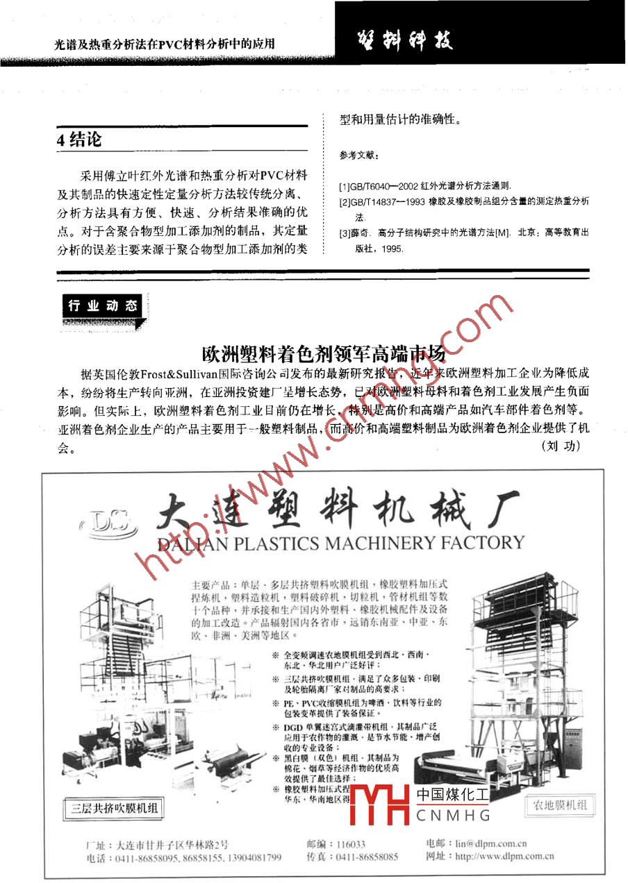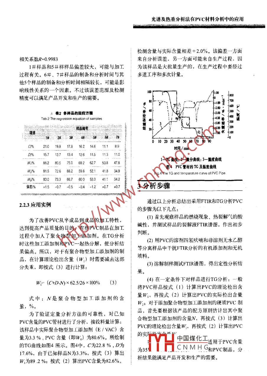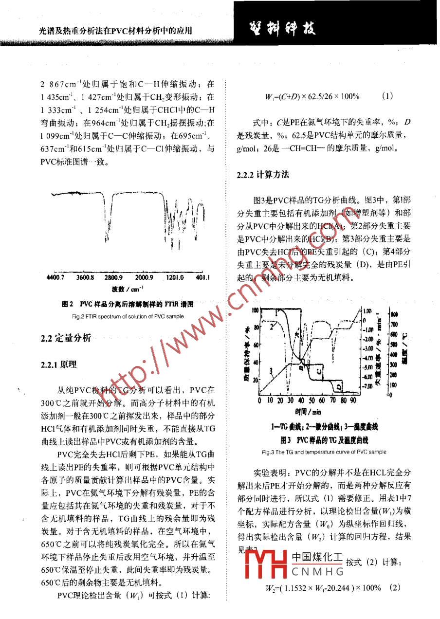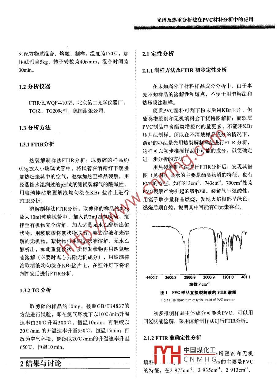擁鏵技文章編號(hào):1005-3360(2007)09009005光譜及熱重分析法在PVC材料分析中的應(yīng)用The Utilization of spectrum and tg analyses in thePVC Material Stud齊齊哈爾齊盟塑料制吊有限公司黑龍江齊齊啥爾161000Qiqihar Qisu Plastic Products Co, Ltd, Qiqihar 161000, China摘要:詳細(xì)介紹對(duì)于未知PVc樣品先用裂解法制樣進(jìn)行紅外光譜分析初步定性,再用溶解法制樣進(jìn)行紅外光譜分析驗(yàn)證;PVC材料熱分解過程較復(fù)雜,不能童接從熱量檢測(cè)結(jié)果(TG曲線)讀出各組分含量,需將檢測(cè)結(jié)果通過線性回歸方程計(jì)算得出PVc的含量,PVC含量在30%80%范國(guó)內(nèi)具有較好的線性關(guān)系(R=0.9983)。與傳統(tǒng)的分離,分析方法相比,此方法具有方便、快速、分析結(jié)果準(zhǔn)確的優(yōu)點(diǎn)Abstract: For unknown Pvc product, to make a sample by splitting method is to determine its primaryquality through FTIR spectrometric analysis, then to make another sample by solution methodis to validated by FtiR analysis. It is difficult to get the readout of the content of each ingredientdirectly from the TG curve due to the complication of Pvc material, it needs to calculate andtranslate the measured results into pvc content through the linear regression equation. Thereis good linear relationship in the rangs 30%-80% content of PVc(R=0. 9983). The method is moreonvenient, and reliable than traditional mu關(guān)鍵詞:光譜分析;熱分析;PVc含量;定性定量分析中圖分類號(hào):TQ320.77文獻(xiàn)標(biāo)識(shí)碼:BKey words: Spectral analysis; TG analysis; PVC content; Qualitative and quantitative analysisPVC制品中往往加入了無機(jī)填料和對(duì)紅外光11樣品配方及加工方法:具有較強(qiáng)吸收的醋類增塑劑,由于增塑劑和無機(jī)填料的干擾,按上述方法直接用FTIR分析較困樣品配方見表1難;其次,PVC為非結(jié)晶物質(zhì),用DSC分析觀用德國(guó)產(chǎn) Brabendar加工性能試驗(yàn)儀將表1所察不到熔融、結(jié)晶峰,玻璃化轉(zhuǎn)變也不明顯,不能測(cè)出其熔點(diǎn)或用7來驗(yàn)證FTR分析結(jié)果A衰1禪品配方Tab. 1 The sample fomula再次,PⅤC熱分解過程較復(fù)雜,在增塑劑等有機(jī)助劑揮發(fā)出來的同時(shí),還會(huì)有PVC分解的氯樣品編號(hào)原化氫(HCl)氣體揮發(fā)出來,這給定量分析帶來21314陣-#了困難。針對(duì)PVC制品的這些特殊性,筆者經(jīng)反復(fù)試驗(yàn)和分析,總結(jié)出…套PVC定性定量分析方碳酸鈣33法,并且已經(jīng)成功地應(yīng)用于檢測(cè)工作。中國(guó)煤化工CNMHG.. 251實(shí)驗(yàn)部分H歌片順權(quán)據(jù)70207光譜及熱重分析法在PVC材料分析中的應(yīng)用列配方物質(zhì)混合、熔融、制樣,溫度為170℃,加2.1定性分析壓砝碼重kg,轉(zhuǎn)子轉(zhuǎn)數(shù)為40r/min,混合時(shí)間為211制樣方法及FTIR初步定性分析12分析儀器在未知高分子材料樣品成分分析中,由于事先不知樣品的溶解性和熔點(diǎn),不便于用溶解法和FTR儀WQF-410型,北京第二光學(xué)儀器廠;熱壓膜法制樣TG儀,TG209c型,德國(guó)耐弛公司。硬質(zhì)PⅤC塑料叮刮下粉末后用KBr壓片,但酯類增塑劑和無機(jī)填料會(huì)干擾譜圖解析;而軟質(zhì)3分析方法PVC制品中含酯類增塑劑的量更多,不能用KBr壓片法制樣。所以在不清楚樣品成分的情況下,13.1FTIR分析最好的辦法是先用熱裂解制樣法進(jìn)行FTR分析,這樣可以初步推測(cè)樣品中可能的成分,以便確定熱裂解制樣法FTIR分析:取剪碎的樣品約氵進(jìn)一步分析的方法0.5g放入小玻璃試管中,將試管在酒精燈下緩慢用熱裂解制樣法進(jìn)行FTIR分析后,發(fā)現(xiàn)其譜加熱趕走其中的空氣,繼續(xù)加熱至樣品裂解,用圖(見圖1)顯示的主要是酯類物質(zhì)的特征,也有經(jīng)蒸餾水濕潤(rùn)過的pH試紙測(cè)試裂解氣的酸堿性,PVC的特征,如在813cm1、743cm、700m處為用玻璃棒沾取裂解液均勻涂在KBr鹽片上進(jìn)行PVC裂解產(chǎn)物引起的吸收峰。裂解氣呈強(qiáng)酸性FTIR分析。用鑷子取少量樣品燃燒,發(fā)現(xiàn)火焰根部呈綠色,溶解制樣法FT分析:取剪碎的樣品約0.2g氵燃燒后期自熄,說明其中可能有C元素存在。放入10ml玻璃試管中,加入約2m四氫吠喃,攪拌至有機(jī)物完全溶解,加人適量無水乙醇析出絮狀物,用玻璃棒將絮狀物取出,棄去溶液和未溶解的無機(jī)物。絮狀物再用四氫吠喃溶解、無水乙醇析出,如此重復(fù)數(shù)次,所得絮狀物再用四氫吠喃溶解(必要時(shí)離心去除無機(jī)成分),用玻璃棒沾取清液均勻涂在KBr鹽片上,在紅外燈下將溶劑揮發(fā)后進(jìn)行FTR分析。460730292m9tm0-i波數(shù)/cm1.32TG分析圖PVC樣品直接裂解液的PTR譜圖Fig 1 FTIR spectrum of lysis liquid of PVC sample取剪碎的樣品約0mg,按照GBT14837的方法進(jìn)行試驗(yàn),即在氮?dú)猸h(huán)境下以10℃min升溫初步推測(cè)樣品主體成分可能為PVC??梢杂盟俾视?0℃升至300℃,恒溫10min;再繼續(xù)以:四氫吠喃溶解,采用溶解制樣法進(jìn)行FTR分析。20℃/min的升溫速率升至550℃,恒溫15min;再改為空氣環(huán)境,繼續(xù)以20℃/min的升溫速率升至2.1.2FTIR準(zhǔn)確定性分析650℃,恒溫10min。中國(guó)煤化工增塑劑和無機(jī)2結(jié)果與討論填料CNMH示的主要是PⅤC的特征,在2975cm、2935cm1、2913cm、光譜及熱重分析法在PVC材料分析中的應(yīng)用擁鏵蘞2867cm處歸屬于飽和C-H伸縮振動(dòng);在1435cm、1427cm處歸屬于CH變形振動(dòng);在W=(C+D)×625/26×100%1333cm、1254cm處歸