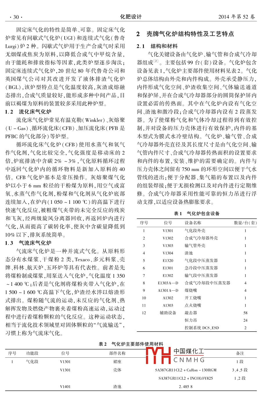第52卷第3期化肥設(shè)計(jì)June 20142014年6月Chemical Fertilizer Design生產(chǎn)技術(shù)殼牌煤氣化爐的設(shè)備特性及技術(shù)管理郭丹(貴州天?;び邢挢?zé)任公司,貴州福泉550501 )摘要:簡(jiǎn)述了煤化工常用氣化爐的分類及特點(diǎn);介紹了殼牌氣化爐的主要設(shè)備和材料;分析了殼牌氣化爐的工藝及設(shè)備特點(diǎn)及其技術(shù)管理要點(diǎn);提出了殼牌氣化爐常見問題的解決方案。關(guān)鍵詞:煤氣化爐;殼牌氣化爐;設(shè)備特性;技術(shù)管理doi : l0.3969/j. issn. 1004 - 8901. 2014. 03. 009中圖分類號(hào): TQ545文獻(xiàn)標(biāo)識(shí)碼:B文章編號(hào):1004 - 8901 (2014 )03 -0029 -04Equipment Characteristic of Shell Gasifier and Technical ManagementGUO Dan( Guizhou Tianfu Chemical Engineering Company Lud. ,F(xiàn)uquan Guizhou 550501 China)Abstract: Author has brielly described the category and feature for ordinarily used gasifer in chenical engineering of coal; has introduced the mainequipment and material of Shell gasification plant ; has analyzed the process and equipment features for Shell gasification plant and its technical manage-ment gist; has presented the solution scheme for common problems of Shell gasifier.Key words:coal gasifier; Shell gasifier; equipment feature; technical managementdoi: 10.3969/j. isn. 1004 - 8901. 2014.03. 009煤氣化是煤炭清潔高效利用和煤化工的起低污染的煤氣化工藝(技術(shù))是發(fā)展煤化工的重要點(diǎn),也是煤炭清潔高效綜合利用最重要的單元技前提,其中氣化爐便是工藝的核心,可以說氣化工術(shù),而整個(gè)單元又以煤氣化爐為核心設(shè)備。煤制.藝的發(fā)展是隨著氣化爐的發(fā)展而發(fā)展的,為了提合成氨、煤制甲醇煤制油、煤制烯烴、煤制天然氣高煤氣化的氣化率和氣化爐氣化強(qiáng)度,改善環(huán)境,等現(xiàn)代煤化工技術(shù)和IGCC技術(shù)都是以煤氣化為新一代煤氣化技術(shù)的開發(fā)總的方向:①氣化壓力核心單元,以氣化爐為中心。隨著世界能源格局由常壓向中高壓(8.5MPa)發(fā)展;②氣化溫度向高的變化,以及現(xiàn)代煤氣化技術(shù)的發(fā)展,大規(guī)模煤氣溫(1 500~1 600 C)發(fā)展;③氣化原料向多樣化發(fā)化技術(shù)作為一種高效、潔凈的煤轉(zhuǎn)化技術(shù)日益受展;④固態(tài)排渣向液態(tài)排渣發(fā)展。當(dāng)前煤氣化爐主到重視,廣泛用于合成化學(xué)品和制氣等眾多領(lǐng)域。要有3種類型:固定床、流化床、氣流床。煤氣化爐的設(shè)計(jì)、制造、安裝、運(yùn)行管理對(duì)煤氣化1.1 固定床氣化爐項(xiàng)目的成敗起著至關(guān)重要的作用。在對(duì)常用煤氣固定床氣化也稱移動(dòng)床氣化。固定床一般以化爐型進(jìn)行介紹的基礎(chǔ)上,筆者著重對(duì)當(dāng)前技術(shù)塊煤或焦煤為原料。煤由氣化爐頂加人,氣化劑由先進(jìn)的氣流床殼牌煤氣化爐的設(shè)備特性和技術(shù)管爐底加入。流動(dòng)氣體的上升力不致使固體顆粒的理進(jìn)行分析。相對(duì)位置發(fā)生變化,即固體顆粒處于相對(duì)固定狀中國(guó)煤化工變,因而稱為固定床氣1煤氣化爐分類化。:fYHCNM H G于煤從爐頂加人,含有煤氣化爐的分類",也是煤炭氣化技術(shù)的分殘?zhí)康臓t渣自爐底排出,氣化過程中,煤粒在氣化類,一般按氣化爐的化學(xué)工程特征和反應(yīng)器形式爐內(nèi)緩慢往下移動(dòng),因而又稱為移動(dòng)床氣化。進(jìn)行分類。氣化爐的形式在很大程度上影響煤炭作者簡(jiǎn)介:郭丹(1973年- ) ,男,貴州金沙人,1995年畢業(yè)于貴州工的轉(zhuǎn)化效率和產(chǎn)品的制造成本,采用高效、低耗、業(yè)大學(xué),工程師,現(xiàn)從事煤化工企業(yè)的經(jīng)營(yíng)發(fā)展等管理工作。.30●化肥設(shè)計(jì)2014年第52卷固定床氣化的特性是簡(jiǎn)單、可靠。固定床氣化2殼牌氣化爐結(jié)構(gòu)特性及 工藝特點(diǎn)爐常見有間歇式氣化爐( UGI)和連續(xù)式氣化(魯奇Lurgi)爐2種。閃歇式氣爐用于生產(chǎn)合成氣時(shí)采用2.1結(jié)構(gòu)和材料無煙煤或焦炭為原料,以降低合成氣中甲烷含量,氣化關(guān)鍵設(shè)備由氣化爐、輸氣管和合成氣冷卻由于能耗和排放指標(biāo)等因素,此類爐型逐步淘汰;器組成12。主要包括99臺(tái)(套)設(shè)備。氣化爐包含固定床連續(xù)式氣化爐,20世紀(jì)80年代魯奇公司和設(shè)備見表1,氣化爐主要部件使用材料見表2。氣化英國(guó)煤氣公司對(duì)其改進(jìn)開發(fā)了液體排渣氣化爐爐總體結(jié)構(gòu)由外殼和內(nèi)件構(gòu)成。外殼承受靜壓力,(BGL),該爐型特點(diǎn)是氣化溫度較高,灰渣成熔融內(nèi)件形成氣化空間、爐渣收集空間、氣體輸送通道態(tài)排出,合成氣質(zhì)量較好,能形成多種中間產(chǎn)品,目和保護(hù)屏,并在合成氣冷卻器部分的圓筒保護(hù)屏內(nèi)前以褐煤為原料的裝置較多采用此種爐型。設(shè)置必需的傳熱面。其中在氣化爐內(nèi)設(shè)有氣化空1.2 流化床氣化爐間、渣池和激冷段;合成氣冷卻器內(nèi)設(shè)有2段蒸發(fā)流化床氣化爐常見有溫克勒( Winkler)、灰熔聚器。為了使煤粉氣化和氣體冷卻過程得到有效控(U - Gas)、循環(huán)流化床(CFB)、加壓流化床(PFB是制,并對(duì)設(shè)備的壓力殼體進(jìn)行有效保護(hù),內(nèi)件的基PFBC的氣化部分)等爐型。本型式為膜式水冷璧結(jié)構(gòu)。氣化爐、輸氣管、合成循環(huán)流化床