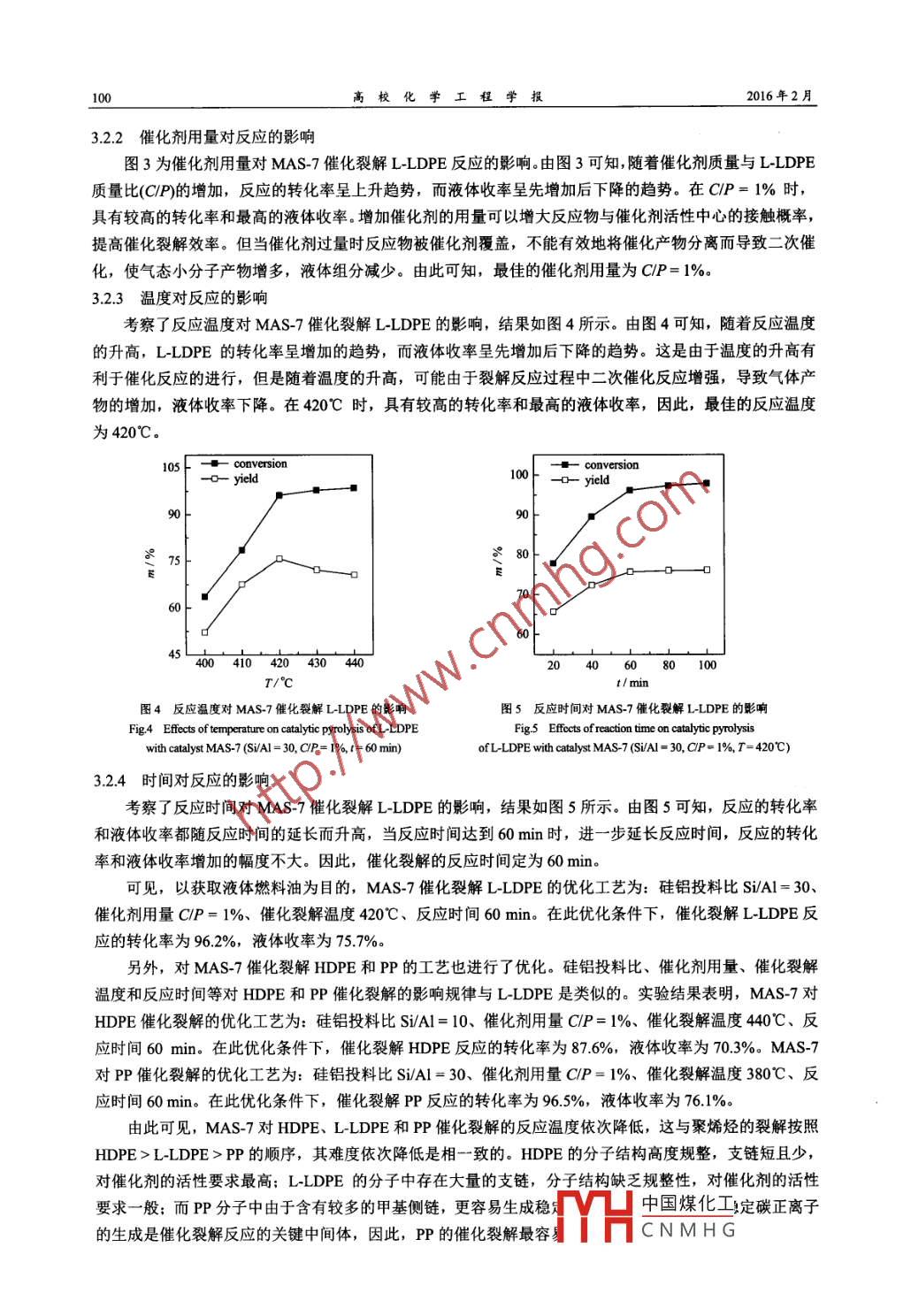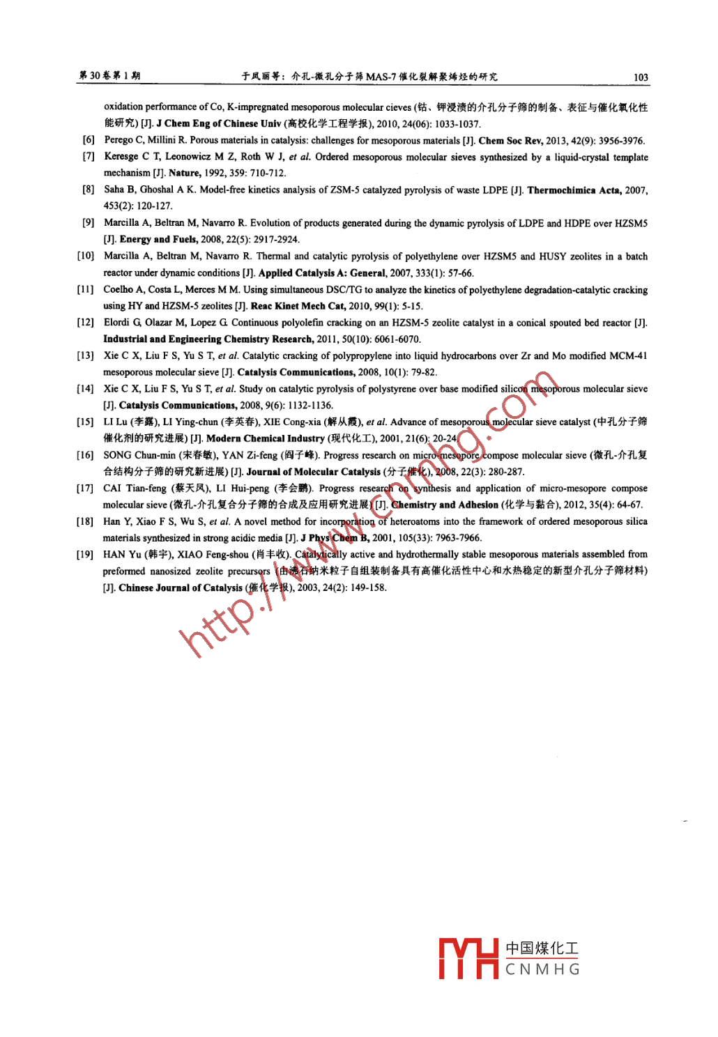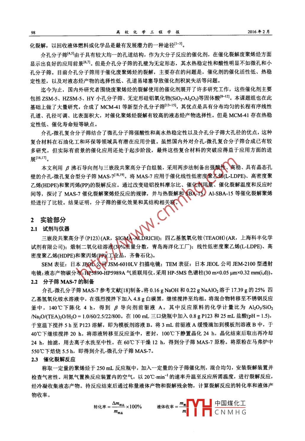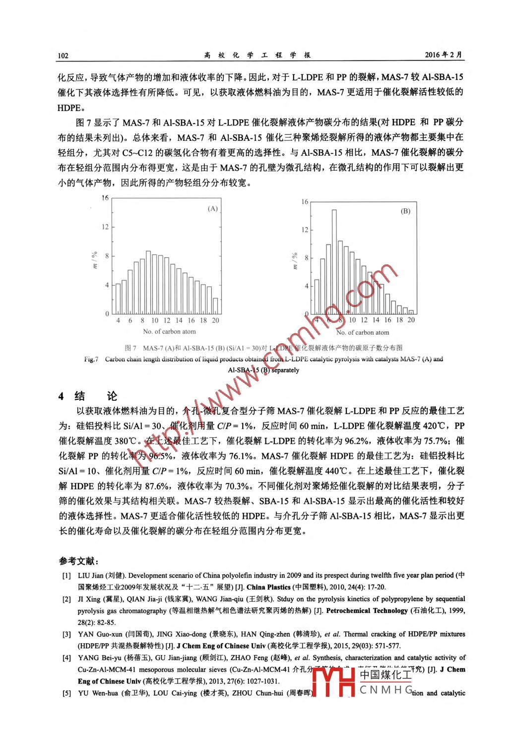第30卷第1期高?;瘜W(xué)工程學(xué)報(bào)No. 1 VoL302016年2月Journal of Chemical Engineering of ChiFeb.2016文章編號:10039015(2016010097-07網(wǎng)絡(luò)出版地址:htp/www.cnkinet/kcms/detai3141TQ.201512210460html介孔微孔分子篩MAS-7催化裂解聚烯烴的研究于鳳麗’,侯海坤’,李露,解從霞,于世濤,劉福勝2(1.青島科技大學(xué)化學(xué)與分子工程學(xué)院;2.青島科技大學(xué)化工學(xué)院,山東青島266042)摘要:采用兩步法制備強(qiáng)酸性、高水熱穩(wěn)定性以及具有晶態(tài)孔壁的介孔微孔復(fù)合型分子篩MAS-7,將其應(yīng)用于催化裂解線性低密度聚乙烯(L-LDPE)、髙密度聚乙烯(HDPE)和聚丙烯(P)。詳細(xì)考察了硅鋁投料摩爾比、催化劑用量、催化裂解溫度和反應(yīng)時間等對反應(yīng)的影響,以獲取液體燃料油為目的,分別優(yōu)選出三種聚烯烴催化裂解的最佳工藝在最佳工藝下,催化裂解 L-LDPE、PP和HDPE的轉(zhuǎn)化率分別為962%96.5%和876%,液體收率分別為757%761%和70.3%。探討了MAS-7催化裂解聚烯烴反應(yīng)的規(guī)律,并與熱裂解和SBA-15、ASBA-15等催化裂解聚烯烴進(jìn)行了比較。結(jié)果證明,分子篩的催化效果和其結(jié)構(gòu)相關(guān)聯(lián)。MAS7對聚烯烴的催化裂解具有最高的催化活性和對液體產(chǎn)物較好的選擇性,更適合于催化活性較低的HDPE關(guān)鍵詞;聚烯烴;催化裂解;介孔分子篩:微孔分子篩;MAS-7中圖分類號:06433;TQ0313文獻(xiàn)標(biāo)識碼:ADoI:10.3969jss1003-9015201500.035Catalytic Pyrolysis of Polyolefins with a Meso-MicroporousMolecular Sieve MAS-7 CatalystYU Feng-li, HOU Hai-kun, LI Lu, XIE Cong-xia, YU Shi-tao, LIU Fu-sheng(1. College of Chemistry and Molecular Engineering, Qingdao University of Science and Technology,2. College of Chemical Engineering, Qingdao University of Science and Technology, Qingdao 266042)Abstract: A meso-microporous molecular sieve MAS-7 with strong acidity, high hydrothermal stability andcrystalline walls was synthesized by a two-step method, and it was applied for the catalytic pyrolysis ofpolyolefins including linear-low density polyethylene(L-LDPE), high density polyethylene(HDPE)andpolypropylene(PP). The effects of Si/Al molar ratio, catalyst dosage, pyrolysis temperature and reaction timeon catalytic pyrolysis were investigated. The optimal reaction conditions were obtained for pyrolyzing the threepolyolefins in order to prepare liquid fuels. The conversion rates of L-LDPE, PP and HDPE are 96.2%, 96.5%and 87.6%, with liquid selectivity of 75.7%, 76.1% and 70.3%, respectively. The performance of the preparedcatalyst is campared with thermal cracking and other catalysts( SBA-15 and Al-SBA-15). The results show thatthe catalytic effect is related to the structure of the molecular sieves MAS-7 shows the highest catalytic activityand excellent liquid selectivity, and is especially suitable for catalytic pyrolysis of inactive HDPEKey words: polyolefin; catalytic pyrolysis; mesoporous molecular sieve; microporous molecular sieveMAS-71前塑料樹脂日益廣泛的應(yīng)用為人們生活帶來了極大的便利,但由于其(尤其是聚烯烴類)生物降解性能差,同時也帶來了嚴(yán)重的環(huán)境污染和巨大的資源浪費(fèi)。目前我國廢塑料年擁有量已達(dá)2000萬噸,居世界首位。在廢塑料中聚乙烯和聚丙烯所占比例最大,約占廢塑料總量的70%。為了貫徹國家的可持續(xù)發(fā)展戰(zhàn)略,如何處理并回收利用這些廢塑料已成為人們十分關(guān)注的問題。其中,對廢舊塑料進(jìn)行熱裂解或催收稿日期:201410-30;修訂日期:20150303,網(wǎng)絡(luò)出版時間:2015-12221046:51基金項(xiàng)目:山東省高等學(xué)校科技計(jì)劃項(xiàng)目(JLB05),「H中國煤化工作者介:于風(fēng)麗(197),女,山東冠縣人,青島科技大學(xué)副教授,博士。通訊聯(lián)系人:解從霞,CNMHG高?;瘜W(xué)工程學(xué)報(bào)2016年2月化裂解,以回收液體燃料或化學(xué)品是最有發(fā)展?jié)摿Φ囊环N途徑-3,介孔分子篩{4由于具有較大均一的孔道結(jié)構(gòu),作為大分子反應(yīng)的催化劑,在催化裂解廢聚烯烴方面顯示出良好的應(yīng)用前景7。但是介孔分子篩的孔壁為無定形態(tài),其水熱穩(wěn)定性和酸性明顯不如微孔和小孔分子篩。目前介孔分子篩用于催化廢聚烯烴的裂解,主要存在的問題是,催化劑的催化活性低、熱穩(wěn)定性差,以及對液態(tài)烴產(chǎn)物的選擇性低、孔道易堵塞導(dǎo)致催化劑積炭失活等問題。迄今為止,國內(nèi)外研究者圍繞廢聚烯烴的裂解使用的催化劑展開了許多研究工作,這些催化劑主要包括ZSM5、HZSM5、HY小孔分子篩、無定形硅鋁氧化物(SO2-Al2O3)等固體酸8-12。本課題組也在此基礎(chǔ)上做了大量研究,合成了MCM41等新型介孔分子篩131,其優(yōu)點(diǎn)是具有分布均勻的長程有序線性孔道、孔徑可調(diào)、比表面積大,對催化聚烯烴裂解有較高的液態(tài)烴產(chǎn)物選擇性。但是MCM41存在熱穩(wěn)定性低、催化壽命短等缺點(diǎn)。介孔-微孔復(fù)合分子篩結(jié)合了微孔分子篩強(qiáng)酸性和高水熱穩(wěn)定性以及介孔分子篩大孔徑的優(yōu)點(diǎn),這種復(fù)合材料在石油化工和環(huán)保等領(lǐng)域具有潛在應(yīng)用價值。雖然國內(nèi)外對介孔微孔復(fù)合分子篩合成已有較多研究,但實(shí)際有前景的催化應(yīng)用還處于起步階段,最終這些復(fù)合材料的突破應(yīng)得益于應(yīng)用方面的進(jìn)展1617本文利用B沸石導(dǎo)向劑與三嵌段共聚高分子自組裝,采用兩步法制備出強(qiáng)酸性、高