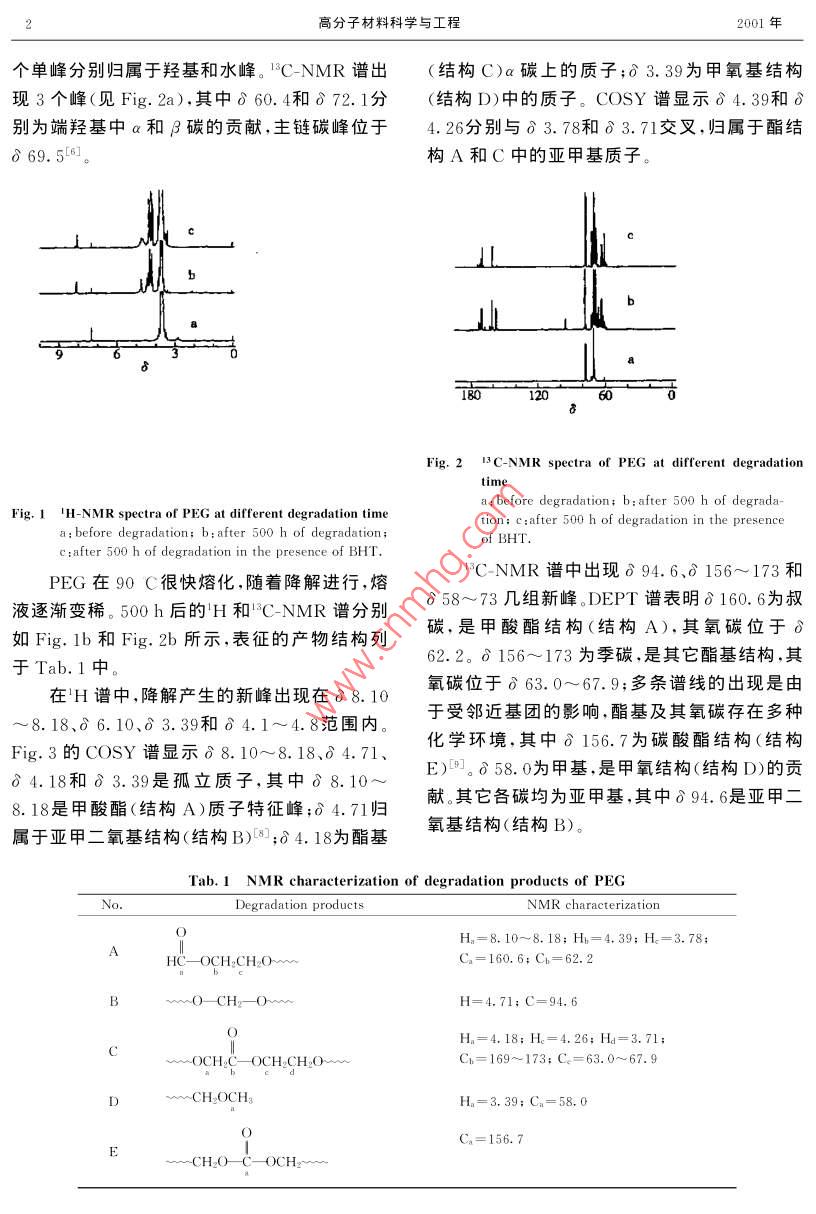 第17卷第4期高分子材料科學(xué)與工程Vol. 17. No. 42001年7月POLYMER MATERIALS SCIENCE AND ENGINEERINGJul.2001NMR研究聚乙二醇的熱氧降解羅善國(guó)',陳福泰1,譚惠民1,張建國(guó)2,滿光磊1,羅運(yùn)軍1北京理工大學(xué)化工與材料學(xué)院,北京100081;2中國(guó)科學(xué)院長(zhǎng)春應(yīng)化所,吉林長(zhǎng)春130022)摘要:采用H、C和2DNMR技術(shù)研究了聚乙二醇(PEG)的熱氧降解,對(duì)產(chǎn)物結(jié)構(gòu)作了詳細(xì)分析和表征,并定量討論了抗氧劑2,6-二叔丁基-4-甲基酚(BHT)對(duì)其熱氧降解的影響。PEG的氧化降解發(fā)生在醚鍵氧碳上遵循自由基氧化機(jī)理,最后形成大量的甲酸酯等酯類以及甲基、亞甲二氧基和醇。抗氧劑BHT不僅降低了PEG的氧化降解程度,而且改變了降解產(chǎn)物的結(jié)構(gòu)分布,顯著抑制了碳酸酯和亞甲二氧基結(jié)構(gòu)的生成,相對(duì)增加了端羥基和端甲基結(jié)構(gòu)關(guān)鍵詞:聚乙二醇;熱氧降解;核磁共振中圖分類號(hào):O632.3文獻(xiàn)標(biāo)識(shí)碼:A文章編號(hào):1000-7555(2001)04-0128-0聚醚的熱氧降解已有不少報(bào)道~3,對(duì)產(chǎn)500h后的樣品做NMR實(shí)驗(yàn)物的結(jié)構(gòu)表征基本上采用紅外光譜法1.3NMR實(shí)驗(yàn)(IR)4:5。然而IR不能區(qū)分一些結(jié)構(gòu)相似的基在 UNITY-400NMR譜儀上測(cè)定。以氘代團(tuán),并且很難給出定量結(jié)果。近幾年來,用核磁氯仿(CDCl3)為溶劑,采用φ5mm樣品管,質(zhì)共振技術(shù)(NMR)研究高分子降解已有一些報(bào)子譜以ns=0.0,碳譜以acn=77.00為譜道,但大都以H譜為依據(jù)。由于H譜化學(xué)線參考位移范圍較窄,信號(hào)重疊嚴(yán)重,提供的信息有C-NMR實(shí)驗(yàn):觀察頻率為100.58MHz限。C譜則可以提供較寬的且分辨很好的結(jié)90°脈沖,重復(fù)周期為7.1s,譜寬21kHz,16K構(gòu)信息;此外,二維化學(xué)位移相關(guān)譜可以提供碳數(shù)據(jù)點(diǎn),反轉(zhuǎn)門控去偶方法(NNE)用于定量測(cè)和氫相互關(guān)聯(lián)的信息,從而可以確定分子骨架定,6000次以上累加。的連接方式。本文采用多種NMR技術(shù)研究聚H-NMR實(shí)驗(yàn):觀察頻率為399.95MHz乙二醇(PEG)在熱氧降解過程中的結(jié)構(gòu)變化,譜寬為4.2kHz,64K數(shù)據(jù)點(diǎn),90·脈沖,重復(fù)周并定量討論抗氧劑2,6-二叔丁基4甲基酚期為2.3。H-H同核相關(guān)實(shí)驗(yàn)COsY):觀察(BHT)對(duì)其熱氧降解的影響頻率為399.95MHz,取F1=F2=3.5kHz,2K數(shù)據(jù)點(diǎn),90°脈沖,重復(fù)周期為2.1s,累加32次1實(shí)驗(yàn)部分F1維取數(shù)256,數(shù)據(jù)處理采用正弦鐘窗函數(shù)1.1試劑聚乙二醇(PEG6000):日本進(jìn)口分裝,M2結(jié)果與討論6000,平均官能度為2;2,6-二叔丁基4-甲基1NMR分析產(chǎn)物結(jié)構(gòu)酚(BHT):AR,上?;瘜W(xué)試劑站分裝廠。PEG鏈結(jié)構(gòu)具有對(duì)稱規(guī)整性,其H-NMR1.2熱氧老化實(shí)驗(yàn)譜中大致出現(xiàn)3組峰(見Fig.1a),其中δ3.70將PEG鋪開在直徑約為8cm的蒸發(fā)皿的強(qiáng)峰是主鏈上的質(zhì)子,δ1.95和δ2.82的兩中,置于90C老化烘箱中并保持通風(fēng),取老化2高分子材料科學(xué)與工程2001年個(gè)單峰分別歸屬于羥基和水峰。C-NMR譜岀(結(jié)構(gòu)C)a碳上的質(zhì)子;?3.39為甲氧基結(jié)構(gòu)現(xiàn)3個(gè)峰(見Fig.2a),其中δ60.4和δ72.1分(結(jié)構(gòu)D)中的質(zhì)子。COSY譜顯示δ4.39和δ別為端羥基中α和β碳的貢獻(xiàn),主鏈碳峰位于4.26分別與δ3.78和δ3.71交叉,歸屬于酯結(jié)構(gòu)A和C中的亞甲基質(zhì)子。Fig. 2 3C-NMR spectra of PEG at different degradationFig. 1H-NMR spectra of PEG at different degradation timea: before degradation i b: after 500 h of degradation:c: after 500 h of degradation in the presencea: before degradation: b: after 500 h of degradationof BHIc: after 500 h of degradation in the presence of Bht.PEG在90C很快熔化,隨著降解進(jìn)行,熔C-NMR譜中出現(xiàn)δ94.6、6156~173和液逐漸變稀。500h后的H和NMR譜分別58~73幾組新峰。DEPT譜表明160.6為叔如Fig.1b和Fig.2b所示,表征的產(chǎn)物結(jié)構(gòu)列碳,是甲酸酯結(jié)構(gòu)(結(jié)構(gòu)A),其氧碳位于δ于Tab.1中62.2。δ156~173為季碳,是其它酯基結(jié)構(gòu),其在H譜中,降解產(chǎn)生的新峰岀現(xiàn)在δ8.10氧碳位于δ63.0~67.9;多條譜線的出現(xiàn)是由8.18、06.10、03.39和δ4.1~4.8范圍內(nèi)于受鄰近基團(tuán)的影響,酯基及其氧碳存在多種Fig.3的COSY譜顯示δ8.10~8.18、64.71、化學(xué)環(huán)境,其中δ156.7為碳酸酯結(jié)構(gòu)(結(jié)構(gòu)64.18和δ3.39是孤立質(zhì)子,其中δ8.10E)。858.0為甲基,是甲氧結(jié)構(gòu)(結(jié)構(gòu)D)的貢8.18是甲酸酯(結(jié)構(gòu)A)質(zhì)子特征峰:04.71歸獻(xiàn)其它各碳均為亞甲基其中94.6是亞甲二屬于亞甲二氧基結(jié)構(gòu)(結(jié)構(gòu)B);04.18為酯基氧基結(jié)構(gòu)(結(jié)構(gòu)B)。Tab 1 NMR characterization of degradation products of PEGDegradation productsNMR characterizationH2=8.10~8.18;Hb=4.39;H=3.78;HC-OCH, CHO-Ca=160.6;Ch=62.2wO-CH2-OH=4.71;C=94.6wOCH C-OCH,CHOvCb=169~173;C=63.0~67.9Ca=156.7CH,OC-OCH第4期羅善國(guó)等:NMR研究聚乙二醇的熱氧降解Tab. 2 Effect of BHT on the degradation products of PEGSample compositionCarbonate MethylenedioxyFormateOther estersNo BHT2.752.131.589.182.050.20ontaining 0. 2% BHT1.250.16Based on the total peak area of oxygen-linked crabons[3 Hahner U, Habicher W D, Schwetlick K. PolymerDegradation and Stability, 1991. 34: 111-118.Polymer.1991,3
