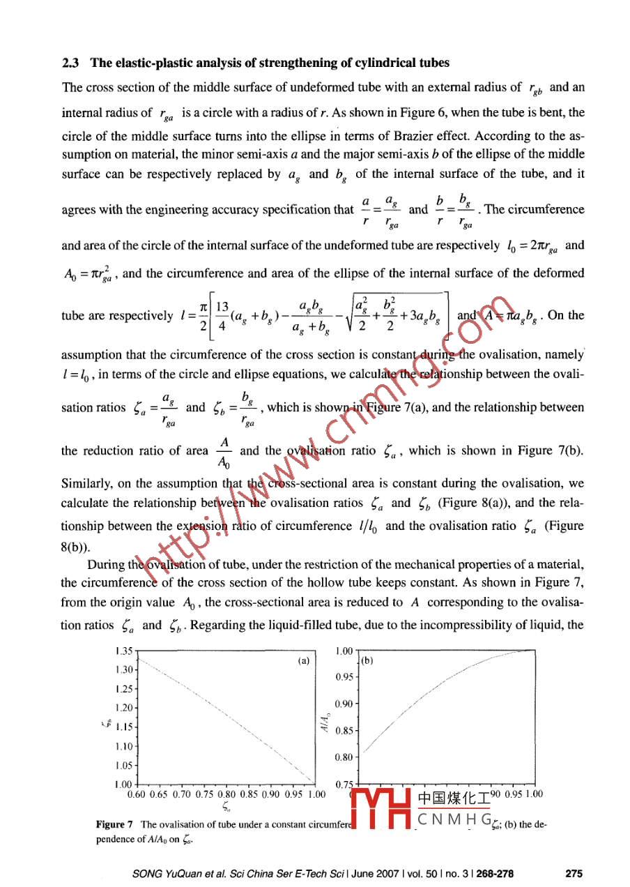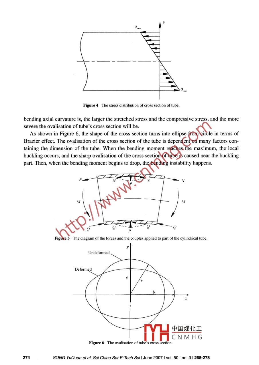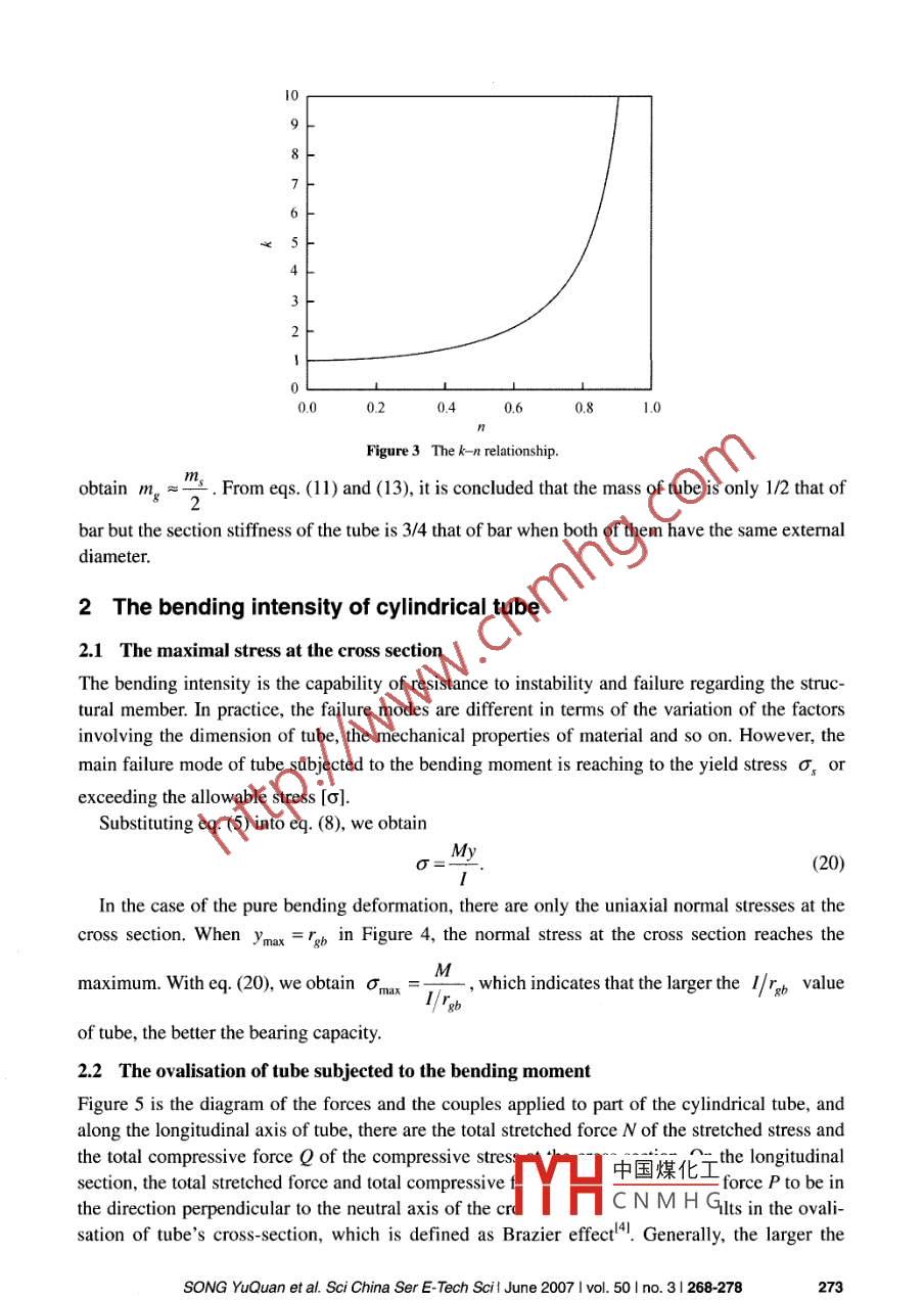 Science in China Series E: Technological Sciences◎2007Science in China PressSpringer-VerlagThe analysis of the bending stiffness andintensity of cylindrical tubesSONG YuQuan#, GUAN ZhiPing', NIE YuQin2 & GUAN XiaoFang'1 Superplastic and Plastic Research Institute, Jlin University, Changchun 130025, China;2 Department of Engineering Mechanics, Institute of Mechanical Science and Engineering, Jilin University,Changchun 130025, ChinaBased on the mechanics of material, the bending stiffness and intensity of cylin-drical bar and tube are analyzed. By comparing the cylindrical tube whose ratio ofoutside diameter to internal diameter is 0.7 with the cylindrical bar, it is concludedthat when both of them have the same mass, the section stiffness of the cylindricaltube is three times that of the cylindrical bar; when both of them have the sameexternal diameter, the mass of the cylindrical tube is only 1/2 that of the cylindricalbar, but the section stiffness of the cylindrical tube is 3/4 that of the cylindrical bar.By virtue of the elemental elastic-plastic theory, the yield stress of the liquid-filledcylindrical tube is investigated. Due to the incompressibility of liquid and the strainhardening effect of material, the yield stress of the liquid-filled tube is enlargedcompared with the hollow tube, thus raising its bending intensity. Under the dy-namic load, compared with the hollow tube, the impact resistance of the liquid-filledtube is also raised due to elastic recovery, Because the hydraulic pressures per-pendicular to the inner surface are identical everywhere, the local stress concen-tration resulting from the ovalisation of the tube would be decreased, and the re-sistance to buckling would be improved.bending of cylindrical tube, liquid flled sifness, intensityToday, the hollow structural members are widely used instead of the solid ones in manufacturingindustry, and have a good developing trend in future. In the report of American Iron and SteelInstitute (AISD), the proportion of light hollow members in the typical autos made in NorthAmerica has been raised to 16% from 10% in the past fifeen years'". Now, by the hydroformingtechnology, General Motor Corporation (GM) has made many light hollow members, including theengine cradle, the radiator cradle, the underbeam, the shed cover joist, the inner support, and so on.The hollow members have a high performance/mass ratio, and especially the ones formed by hy-droforming technology have a special advantage regarding the stiffness and bearing capacity due to中國煤化工Received September 3, 2006; accepted October 20, 2006doi: 1.007511431 007-0031-3MHCNMHGCorresponding author (email: syq@jlu.edu.cn)Supported by the Innovation Foundation of Jilin University and“985 Project" of Jili Universitywww.scichina.com www.springerlink.comSci China Ser E Tech Scil June 2007 Ivol. 50 Ino. 3 I 268-278strain hardening effect' 23 . The further improvement of the stiffness and intensity of the hollowmember would be required to economize material and develop the technology. During the 10thFive-Year Plan period in China, the investment on the railroad industry reached to 350 billion yuan,and more than 1000 km railroads are to be built annually and the rails of more than 900000 tonsincluding the replacing rails of about 600000 tons will be used up for repair. The replacement of therails by the hollow members will be significant to sustainable development. In this paper, thebending stiffness and intensity of cylindrical tubes are investigated in the light of the elementalelastic-plastic theory under the condition that material is continuous and homogeneous, and Hook'slaw is obeyed during the elastic deformation and the assumption of constant volume is obeyedduring the plastic deformation. In particular, by analyzing the liquid-filled cylindrical tube, it isconcluded that regarding the improvement of the stiffness and intensity of the members, someliquid-filled members have superiority over the hydroforming members.1 The stiffness of cylindrical bars and tubesRigidity is the capability of resistance to elastic deformation regarding the essence of material, andthe modulus of elasticity E, which is the important mechanical index determining the rigidity ofmaterial, mainly depends on the property of atomic bond, the bond strength and the lattice type.Stiffness is the capability of resistance to elastic deformation regarding the structural member,including section stiffness Tj and member stiffness T. The section stiffness Tj under the pure tensileor compressive load is expressed as the product of E and the cross-sectional area; the bendingsection stiffness is expressed as EI, where I is the moment of inertia of the cross-sectional areaabout the neutral axis; the bending member stiffness T is dependent on the section stiffness EI andthe span of member.After the couples are applied to the cylindrical bar, the material is stretched above the neutrallayer and compressed below it. The neutral axis is the intersecting line between the neutral layerand cross section. The neutral axis on the cross section is taken as z axis of the coordinate system;the symmetric axis perpendicular to the neutral axis is taken as y axis; the axis normal to the crosssection is taken as x axis. According to the geometry of deformation shown in Figure 1, we obtainmn=dx= ρdθ,(1)mn'=(ρ- y)d0,(2)m'n' -mn .(3)mnlxSubstituting eqs. (1) and (2) into eq. (3), we obtain(4)PSubstuting eq. (4) into Hook's law, we obtainEσ=-=y.(5)p'1.1 The bending moment中國煤化工When the bar is subjected to the couple M at the ends, th,MYHC N M H Gasses dependentSONG YuQuan et al. Sci China Ser E-Tech Scil June 2007 Ivol. 50 Ino.3 I 268-278269▲”n'ndFigure 1 Geometry of deformation of bending tube.on bending moment at the cross section. According to the equilibrium condition,[ odA, the totalforce of the internal forces σdA at the cross section, is equal to the axial force N applied to theCross section, wh