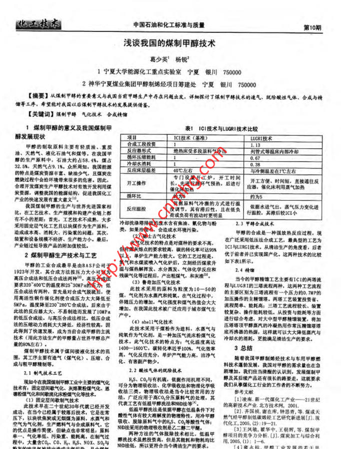 化工技術(shù)中國(guó)石油和化工標(biāo)準(zhǔn)與質(zhì)量I第10期淺談我國(guó)的煤制甲醇技術(shù)葛少英'楊銳'1中夏大學(xué)能源化工重點(diǎn)實(shí)驗(yàn)室寧夏銀川7500002神華寧夏煤業(yè)集團(tuán)甲醇制烯烴項(xiàng)目籌建處寧夏銀川75000[摘要]從煤制甲酵的重要意義與我國(guó)當(dāng)前甲畔生戶中存在問題出發(fā)。詳細(xì)探討了謀制甲疇枝術(shù)的逢氣就除酸性氣體、合成與精飾等工序,希望能葉我國(guó)以后煤制甲醇技術(shù)的發(fā)展提供借鑒。[關(guān)鍵詞]煤制甲畔氣化技術(shù) 合成精餾表1 1CI技術(shù)與LUCRI技術(shù)比較1煤制甲醇的意義及我國(guó)煤制甲1CL技術(shù)(基準(zhǔn))LUGRI技術(shù)醇發(fā)展現(xiàn)狀合成工段投資甲醇的制取原料主要有輕質(zhì)油,重質(zhì)反皮器形式地?zé)岽彩芏喽卧蠚饫渖搅泄苁降雀4矁?nèi)部冷卻油、天然氣、液化石6油氣和堂等。在我國(guó)甲0.67醇的生產(chǎn)原料中,石油大的占58.錢爆點(diǎn)2.5%天熱氣占9. 1%.眾所周知。我國(guó)能源反應(yīng)床層溫差40C左右專門收置開工爐。開工時(shí)間與冷側(cè)溫發(fā)在7心左右的特點(diǎn)是煤炭資源豐富,缺油少氣且煤黨在開工方便、時(shí)間短,直接通往反燃繞過程中會(huì)給環(huán)境帶來很多的危者。因此,開工操作長(zhǎng)。先進(jìn)行循環(huán)氣預(yù)熱,后進(jìn)行應(yīng)器。 催化床利用蒸氣加熱合理開發(fā)煤賓生產(chǎn)甲都技術(shù)對(duì)有效開發(fā)利用煤佳化床加熱炭費(fèi)源。調(diào)整我國(guó)的能源結(jié)構(gòu),促進(jìn)我因化工循環(huán)比的為的為5產(chǎn)業(yè)的這發(fā)展有重大意義"。依據(jù)原料氣沖激的方式進(jìn)行溫依據(jù)水進(jìn)氣出, 高氣壓力交化進(jìn)的生產(chǎn)與世界先進(jìn)國(guó)家相反皮租控度調(diào)節(jié),其有滯后性,且在低負(fù)行溫控。其海后較ICI我國(guó)深制甲醉的生產(chǎn)與世界比,在工藝技術(shù),生產(chǎn)規(guī)模和構(gòu)建產(chǎn)業(yè)鏈上都尚或負(fù)荷有波動(dòng)時(shí)更明顯有不小的差距:首先。工藝技術(shù)不成勢(shì),大多沖卻扶海塔排放的廢水含有焦油, 氯化物與冊(cè)2.1中群合成技術(shù)采用固定層氣化工藝凡以塊煤作為生產(chǎn)原料,類,如果治理不,會(huì)造成水環(huán)境污染。甲靜的合成是一種強(qiáng)放熱反應(yīng)過程,現(xiàn)造成成本高、消耗大、污染重的問題:其次。(2)夠士古氣化技術(shù)在廣泛采用低壓法合成工藝。最典型的工藝為裝置和設(shè)備規(guī)模不經(jīng)濟(jì)。生產(chǎn)能力小。最后,此氣化技術(shù)的特點(diǎn)是對(duì)煤種的要求不高,1C1與URGI技術(shù)。從清潔生產(chǎn)的角度看,后者產(chǎn)業(yè)鏈過短導(dǎo)敗產(chǎn)品的附加值較低。但對(duì)煤灰熔點(diǎn)的要求較高,碳的轉(zhuǎn)化事可達(dá)95%優(yōu)于的者并已實(shí)現(xiàn)國(guó)產(chǎn)化。這兩種技術(shù)的比它的工藝過程是,2煤制甲醇生產(chǎn)技術(shù)與工藝以上。單爐生產(chǎn)能力較大。它的工素探裝升如下表1質(zhì)示。氧氣和水煤漿噴入氣化爐后,立刻經(jīng)歷煤漿升2.4精館甲醇的工業(yè)合成最早是由BASP公司于租與煤熱解揮發(fā)。水分惠發(fā)。氣體化學(xué)反應(yīng)和1923年開發(fā),其合成方法技?jí)毫Υ笮】煞譃樘?化等過程后, 產(chǎn)出粗煤氣 和灰渣”。當(dāng)今的甲醉精飾工藝主要有ICI的兩塔流高壓合成法和低壓合成法兩種回。高壓合成法(3)魯奇加壓氣化技術(shù)程與LUGRT的三塔流程兩種。這兩種工藝流程要求20-400C的溫度和25 30MPa的壓力:低此技術(shù)采用的原料為粒度為10-50的的主要區(qū)別為三墻 流程有一個(gè)壓力的0, 7MP的壓合成法有兩種,首先是對(duì)合成氣脫破后,使煤,氣化劑為水燕汽和純氧。在氣化過程中, 加壓操作的主糖餛塔。兩塔工藝裝置投資省。用高話性制作值化劑使合成壓力大大降低至壓力的增加。氣化強(qiáng)度和煤氣熱值會(huì)大大洗程間單,能耗高、能耗高三墻工藝流程較長(zhǎng)、裝置SP.遍度降至230280個(gè)合成法。后來由于作隨壓力的物批機(jī)廣泛應(yīng)用于城市煤氣生較復(fù)雜、操作能耗輕低。從投責(zé)與能托等方面SMPo.遵度降至230 280工合成體。增加。 在我國(guó)此此法的反應(yīng)幕太大,不易制造而發(fā)展了10MPa產(chǎn)中。進(jìn)行綜合考慮。對(duì)大中型甲醇精館裝置。將加的低壓合成法。與高壓合成法相比。低壓合成(4) shell氣化技術(shù)壓塔塔項(xiàng)甲醇蒸汽的冷凝熱用作常法的壓暗動(dòng)力消耗大大降低,經(jīng)濟(jì)性較高,因此技術(shù)采用干煤粉作為進(jìn)料。水蒸氣與底再佛器的熱源, 這樣就可以大大降低就汽與此得到了快速發(fā)展。成為當(dāng)前合成甲靜的主流純氧作為氣化劃。是一-種加壓氣流床粉煤氣化冷卻水的消耗, 更能滿足情潔生產(chǎn)的要求。技術(shù)(用此方法生產(chǎn)的甲醇量占世界甲醇總產(chǎn)技術(shù)。此氣化技術(shù)的特點(diǎn)為氣化溫度高達(dá)3總結(jié)量的80%左右) .1400 1600醫(yī)轉(zhuǎn)化率近手100%。氣化發(fā)率煤制甲靜技術(shù)屬于保間樓液化技術(shù)的范高。高,氣化反應(yīng)充分,,單爐產(chǎn)氣能力高,潔凈氣隨著我國(guó)甲醇制婚烴技術(shù)與車用甲圖,其工序主要有速造氣(煤氣化).壓縮、合化