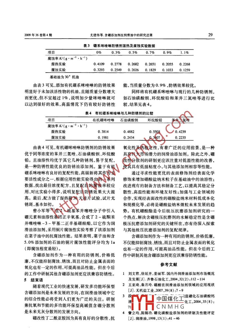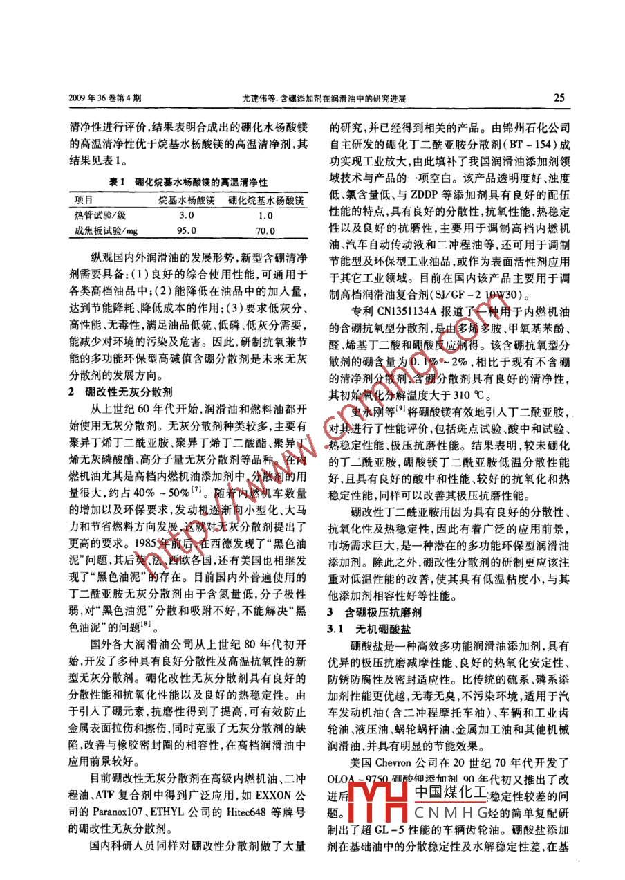 合成潤滑材料24SYNTHETIC LUBRICANTS2009年36卷第4期.文章編號(hào):1672 -4364(2009)04 -0024 -07含硼添加劑在潤滑油中的研究進(jìn)展尤建偉李芬芳(中南大學(xué)化學(xué)化工學(xué)院,長沙410083)摘要:含硼添加劑可明顯改善和提高潤滑油的抗氧化性防銹性、熱穩(wěn)定性能及抗磨減摩性能等。介紹了含硼添加劑的研究進(jìn)展,包括含硼清凈劑、含硼分散劑、含硼極壓抗磨劑和含硼防銹劑,認(rèn)為多功能含硼添加劑是未來的發(fā)展方向。關(guān)鍵詞:礪;添加劑;潤滑油;研究進(jìn)展中圖分類號(hào):TE 624. 82文獻(xiàn)標(biāo)識(shí)碼:A上世紀(jì)30年代以前,潤滑油中幾乎不使用添生產(chǎn)的工藝條件。采用冷凍蝕刻電鏡觀察了試生加劑。但50年代以來,隨著現(xiàn)代工業(yè)的發(fā)展,特別產(chǎn)產(chǎn)品的膠體結(jié)構(gòu),并評(píng)價(jià)了其熱氧化安定性。結(jié)是汽車行業(yè)的發(fā)展,對(duì)潤滑油的質(zhì)量要求越來越果表明,高堿值硼化石油磺酸鈣產(chǎn)品的堿值越高、高,由于受到法規(guī)變化等的影響,如清潔空氣法規(guī)、膠體體系中膠粒顆粒的平均粒徑越小、粒徑分布越發(fā)動(dòng)機(jī)設(shè)計(jì)變化、環(huán)保法規(guī)等,要求潤滑油要具有窄,熱氧化安定性和清凈性越好。經(jīng)分析評(píng)定,該良好的抗氧化安定性、抗磨性、清凈分散性等,因此產(chǎn)品質(zhì)量優(yōu)良,常溫下具有流動(dòng)性能,且有較好的添加劑在內(nèi)燃機(jī)油及工業(yè)動(dòng)力設(shè)備用油中得到廣抗磨性高溫清凈性和熱氧化安定性。其工藝條件泛應(yīng)用,發(fā)展速度也越來越快。近年來,隨著人可望應(yīng)用于工業(yè)化生產(chǎn),并將制得的高性能硼化金們對(duì)硼元素的物理及化學(xué)性質(zhì)的認(rèn)識(shí),發(fā)現(xiàn)硼元素屬清凈劑用于調(diào)配高檔內(nèi)燃機(jī)油。引人潤滑油添加劑中可改善和提高油品的抗磨性訾立均等[4]利用均勻試驗(yàn)設(shè)計(jì)及其數(shù)據(jù)處理能以及熱穩(wěn)定性能等,硼改性添加劑可較好地解決軟件建立相應(yīng)的數(shù)學(xué)模型,研制開發(fā)了以硼酸鈣為因含有害組分和部分金屬添加劑受限制而使添加堿值儲(chǔ)備的高堿性磺酸鹽清凈劑。所研制的添加劑加人量減少所出現(xiàn)的油品功能降低的問題,硼元?jiǎng)┡c相應(yīng)的高堿性磺酸鹽添加劑對(duì)比,在抗氧化能素賦予了油品節(jié)能性與環(huán)保性(2]。因此,含硼添加力、水解穩(wěn)定性熱穩(wěn)定性和摩擦磨損等方面,均顯劑已逐漸成為潤滑油的重要組成部分。示了較好的特性。特別是與ZDDP復(fù)合使用后,抗1含硼清凈劑氧化能力有顯著的加合效應(yīng)。常用的潤滑油清凈劑主要包括磺酸鹽、硫化烷牛治剛等[5]利用成焦板四球試驗(yàn)機(jī)考察了各基酚鹽、水楊酸鹽、硫磷酸鹽及環(huán)烷酸鹽等,其中磺種清凈劑在中間基和加氫基礎(chǔ)油中的感受性,結(jié)果酸鹽硫化烷基酚鹽、水楊酸鹽應(yīng)用較為廣泛。傳表明,對(duì)烷基水楊酸鎂鹽系列產(chǎn)品,無論是在溶劑統(tǒng)清凈劑的過堿度組分主要以碳酸鹽形式存在,這精制油中還是在加氫油中,硼化的產(chǎn)品要比傳統(tǒng)的種碳酸化的過堿度金屬清凈劑在苛刻運(yùn)行條件下以碳酸鈣成焦量小,且硼化產(chǎn)品的成焦量在兩種基會(huì)加速油品的氧化,導(dǎo)致金屬部件磨損。新型的硼礎(chǔ)油中的成焦量沒有太大的改變?;鍍魟┎粌H具有清凈劑的作用,而且具有良好的徐小紅等(6)等利用兩步法合成了硼酸鎂高堿氧化安定性、抗摩擦磨損、防銹等性能,已成為研究性水楊酸鹽金屬清凈劑,用成焦板試驗(yàn)(Q/LZJS.開發(fā)的重點(diǎn)之一。美國的Lubrizol 公司、日本的2001 )和熱管試驗(yàn)法( Q/SH018.0159)分別對(duì)硼化Nippon石油公司和Texaco公司,英國的Shell公司烷基水楊酸鹽清凈劑和烷基水楊酸清凈劑的高溫已進(jìn)行了工業(yè)化生產(chǎn),產(chǎn)品牌號(hào)為SAP -008。目前國內(nèi)對(duì)含硼清凈劑的研究剛剛起步,文獻(xiàn)中國煤化工報(bào)道較少。段天平等[3]對(duì)高堿值硼化石油磺酸鈣YHC N M H G林人,項(xiàng)士研究生,從的合成條件進(jìn)行了大量的實(shí)驗(yàn),根據(jù)添加劑裝置實(shí)事環(huán)境友好型潤滑材料方面的研究。E - mail: 85jianwei@ 163.際生產(chǎn)操作要求確定了高堿值硼化石油磺酸鈣試com。2009年36卷第4期尤建偉等。含碭添加劑在潤滑油中的研究進(jìn)展25清凈性:進(jìn)行評(píng)價(jià),結(jié)果表明合成出的硼化水楊酸鎂的研究,并已經(jīng)得到相關(guān)的產(chǎn)品。由錦州石化公司的高溫清凈性優(yōu)于烷基水楊酸鎂的高溫清凈劑,其自主研發(fā)的硼化丁二酰亞胺分散劑(BT-154)成結(jié)果見表1。功實(shí)現(xiàn)”工業(yè)放大,由此填補(bǔ)了我國潤滑油添加劑領(lǐng)表1硼化烷基水楊酸鎂的高溫清凈性域技術(shù)與產(chǎn)品的一項(xiàng)空白。該產(chǎn)品透明度好、濁度低氯含量低、與ZDDP等添加劑具有良好的配伍項(xiàng)目烷基水楊酸鎂硼 化燒基水楊酸鎂性能的特點(diǎn),具有良好的分散性,抗氧性能,熱穩(wěn)定熱管試驗(yàn)/級(jí)3.01.0成焦板試驗(yàn)/mg95.070.0性以及良好的抗磨性,主要用于調(diào)制高檔內(nèi)燃機(jī)油汽車自動(dòng)傳動(dòng)液和二沖程油等,還可用于調(diào)制縱