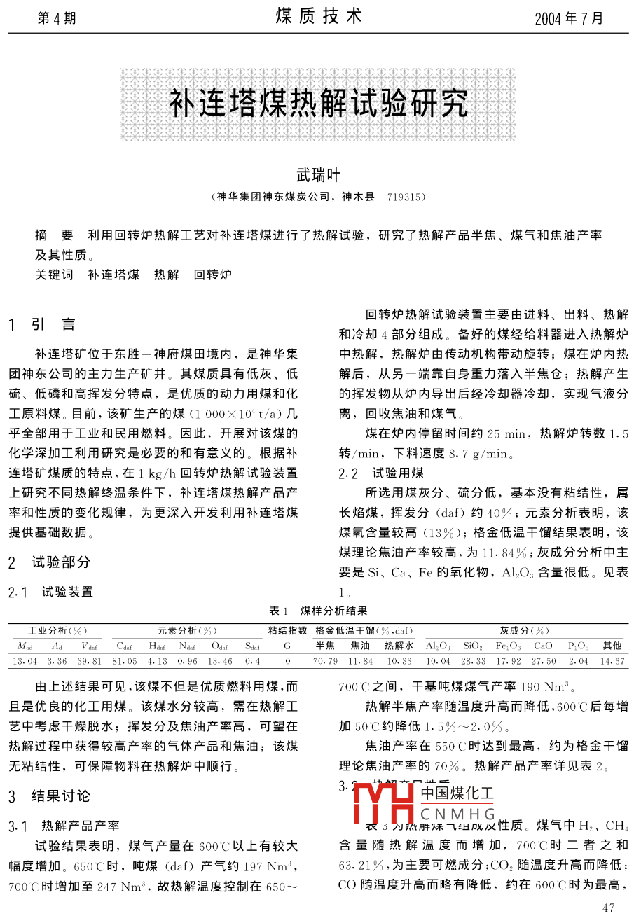 補(bǔ)連塔煤熱解試驗(yàn)研究