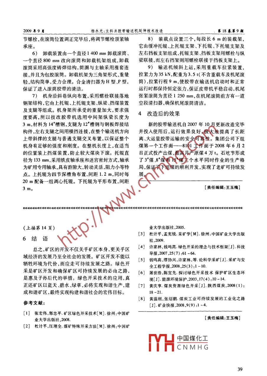 總第119期.doi; 10.3969/j. isn. 1005 - 2798.2009.09.005煤炭資源的綠色開(kāi)采朱海賓(新疆大學(xué),新疆烏魯木齊830046)摘要:通過(guò)分析煤炭在我國(guó)能源結(jié)構(gòu)中的重要地位及其開(kāi)采對(duì)環(huán)境的影響,闡述了礦業(yè)可持續(xù)發(fā)展和煤炭資源綠色開(kāi)采的必要性,總結(jié)了綠色開(kāi)采的內(nèi)涵及當(dāng)前存在的綠色開(kāi)采技術(shù),從而論述了實(shí)施煤炭資源綠色開(kāi)采的意義。關(guān)鍵詞:煤炭;綠色開(kāi)采;生態(tài)環(huán)境;可持續(xù)發(fā)展;綠色開(kāi)采技術(shù)體系中圖分類(lèi)號(hào):TD821文獻(xiàn)標(biāo)識(shí)碼:A文章編號(hào):1005- 2798(2009)09- 0012- 03Green Mining of Coal ResourceZHU Hai -bin(Xinjiang University , Urumqi 830046 ,China)Abstract:Through analyzing the important stalus of coal resource in resource structure of China and the infuence of coal mining to theenvironment, this thesis summarized the connotation of green mining and its current technical system. At the same time, the author ofthis thesis expounded the necessity of the green techniques as well as the sustainable development in coal mining. Thus the summarycan be concluded that the green mining is of great importance to the development of the regional economy, even to the whole society.Keywords :coal ;green mining; entironment ;sustainable development;technical system of green mining我國(guó)“十一-五”規(guī)劃要求能源行業(yè)“堅(jiān)持節(jié)約優(yōu)積、大幅度下降,地表植被千枯,自然景觀遭到破壞,先,立足國(guó)內(nèi),煤為基礎(chǔ),多元發(fā)展,構(gòu)建穩(wěn)定、經(jīng)濟(jì)、農(nóng)業(yè)產(chǎn)量下降。另一方面,煤炭開(kāi)采過(guò)程中產(chǎn)生的清潔的能源結(jié)構(gòu)體系”。在我國(guó)一-次能源結(jié)構(gòu)中,煤礦井水、洗煤水以及矸石淋溶水等廢污水,含有大量炭近幾年一直占70%左右,并將長(zhǎng)期作為我國(guó)的主的硫化物.重金屬離子等有害物質(zhì),嚴(yán)重污染了周?chē)茉?。眾所周?制約我國(guó)經(jīng)濟(jì)發(fā)展的突出瓶頸水環(huán)境。是能源,而能源中能比較主動(dòng)解決的是煤炭(油氣在2) 破壞土地資源。煤炭開(kāi)采對(duì)土地資源能造國(guó)外大量開(kāi)發(fā)帶來(lái)的是能源安全問(wèn)題)。因此,煤炭成嚴(yán)重破壞,井工開(kāi)采以地表塌陷和矸石山壓占為工業(yè)能否健康發(fā)展是事關(guān)我國(guó)能源安全與經(jīng)濟(jì)可持主,露天開(kāi)采則以直接挖損和外排土場(chǎng)壓占為主。據(jù)續(xù)發(fā)展的重大問(wèn)題。統(tǒng)計(jì),目前,我國(guó)因煤炭開(kāi)采引起的地表塌陷面積達(dá)55萬(wàn)hm2 ,平均開(kāi)采萬(wàn)噸煤的地表沉陷達(dá)0.19 hm';1煤礦開(kāi)采對(duì)環(huán)境的影響而我國(guó)大中型煤礦已有矸石山近2000座,矸石堆放多年來(lái),為保證國(guó)民經(jīng)濟(jì)高速發(fā)展,我國(guó)的煤炭量達(dá)40億t,占地面積3.4萬(wàn)hm2。.一直是在超能力生產(chǎn),原煤產(chǎn)量從1996年的13.6億t3)污染大氣環(huán)境。 我國(guó)煤礦每年排入大氣中上漲到2008年的28.1億t,年產(chǎn)量增長(zhǎng)了一倍多。的瓦斯達(dá) 120億m' ,瓦斯的主要成分是CH,其產(chǎn)生煤炭開(kāi)采在為社會(huì)建設(shè)和消費(fèi)提供能源的同時(shí),也的溫室效應(yīng)是CO2的21倍;每年排入大氣中的粉對(duì)生態(tài)環(huán)境造成了極大的破壞。采礦活動(dòng)對(duì)礦區(qū)環(huán)塵約47萬(wàn)1,這不僅對(duì)礦區(qū)環(huán)境造成了嚴(yán)重污染,而境的破壞主要體現(xiàn)在以下三個(gè)方面:且引發(fā)塵肺病患者達(dá)幾十萬(wàn)人。此外,煤礦矸石自.1)破壞和污染水資源。 一方面,在煤炭開(kāi)采燃產(chǎn)生大量s0. C0簍右毒氣體,是大氣環(huán)境的另過(guò)程中,人為疏干排水以及采動(dòng)影響形成的導(dǎo)水裂一個(gè)中國(guó)煤化工p我國(guó)國(guó)有煤礦中隙帶對(duì)煤系含水層的自然疏干,導(dǎo)致地下水位大面長(zhǎng)期MYHCNMHG礦區(qū)和周邊地區(qū)收稿日期:2009 04-17作者簡(jiǎn)介:朱海賓( 1984 - ),男,山東菏澤人,碩士研究生,研究方向?yàn)榈V床與區(qū)域成礦學(xué)。122009年9月朱海賓:煤炭資源的綠色開(kāi)采第18卷葦9期的大氣環(huán)境。簡(jiǎn)言之,煤炭資源綠色開(kāi)采的內(nèi)涵是努力遵循循環(huán)經(jīng)濟(jì)中的綠色工業(yè)原則,形成一-種與環(huán)境協(xié)調(diào)2可 持續(xù)發(fā)展與綠色開(kāi)采-致的“低開(kāi)采、低排放、高利用”的開(kāi)采技術(shù)。在國(guó)際社會(huì)上,礦業(yè)開(kāi)采造成的環(huán)境和生態(tài)問(wèn)4綠色開(kāi)采的技術(shù)體系題一直受到廣泛關(guān)注。1963年,“羅馬俱樂(lè)部”的報(bào)告就曾告誡世人,“世界的資源將無(wú)法應(yīng)對(duì)人類(lèi)的消煤礦綠色開(kāi)采是從廣義資源的角度來(lái)對(duì)待煤、瓦費(fèi)”。世界上礦業(yè)發(fā)達(dá)的國(guó)家,如:美國(guó)、澳大利亞、斯、水等一切可以利用的各種資源,其主旨是將煤礦德國(guó)等也早在20世紀(jì)70年代就開(kāi)展了礦山環(huán)境保開(kāi)采活動(dòng)對(duì)自然環(huán)境和生態(tài)的破壞降到最低限度,防護(hù)和治理。礦產(chǎn)資源開(kāi)發(fā)和環(huán)境保護(hù)- -體化已成為止或盡可能減輕因煤炭開(kāi)采對(duì)環(huán)境和其他資源的不當(dāng)前