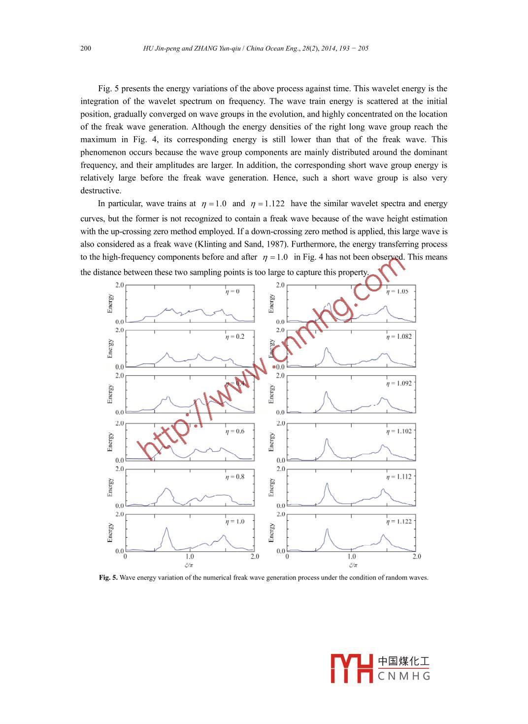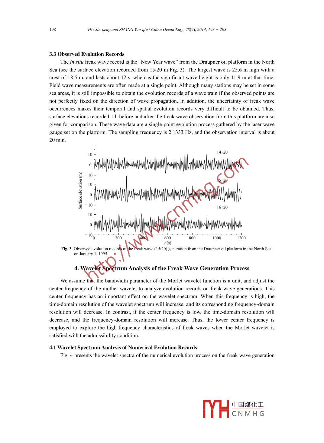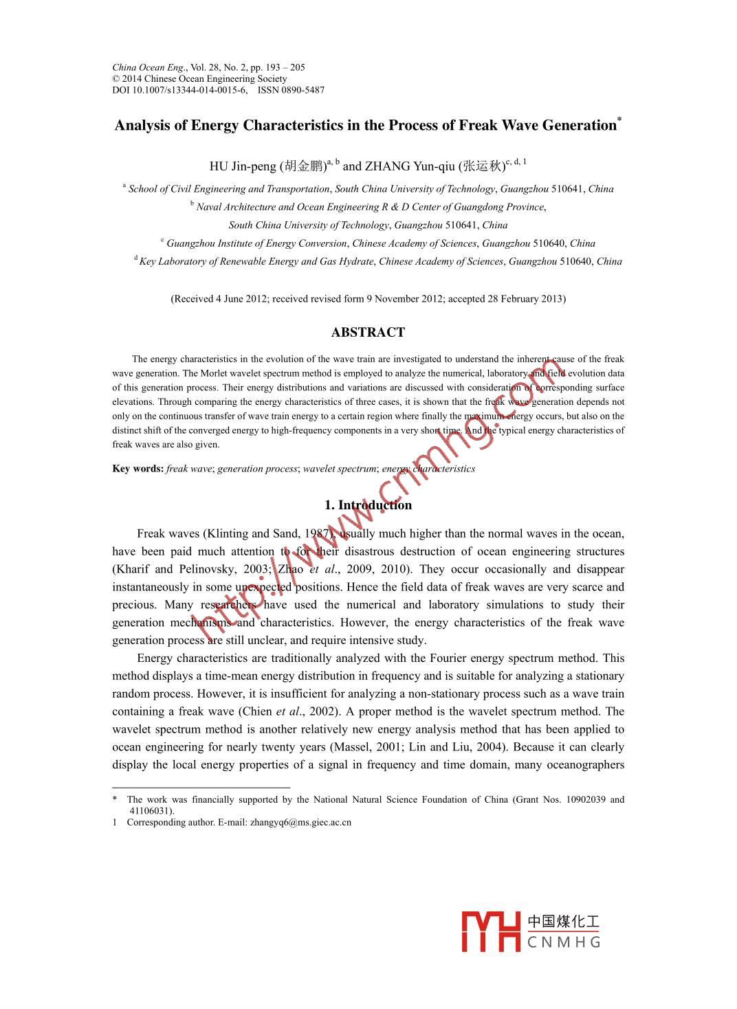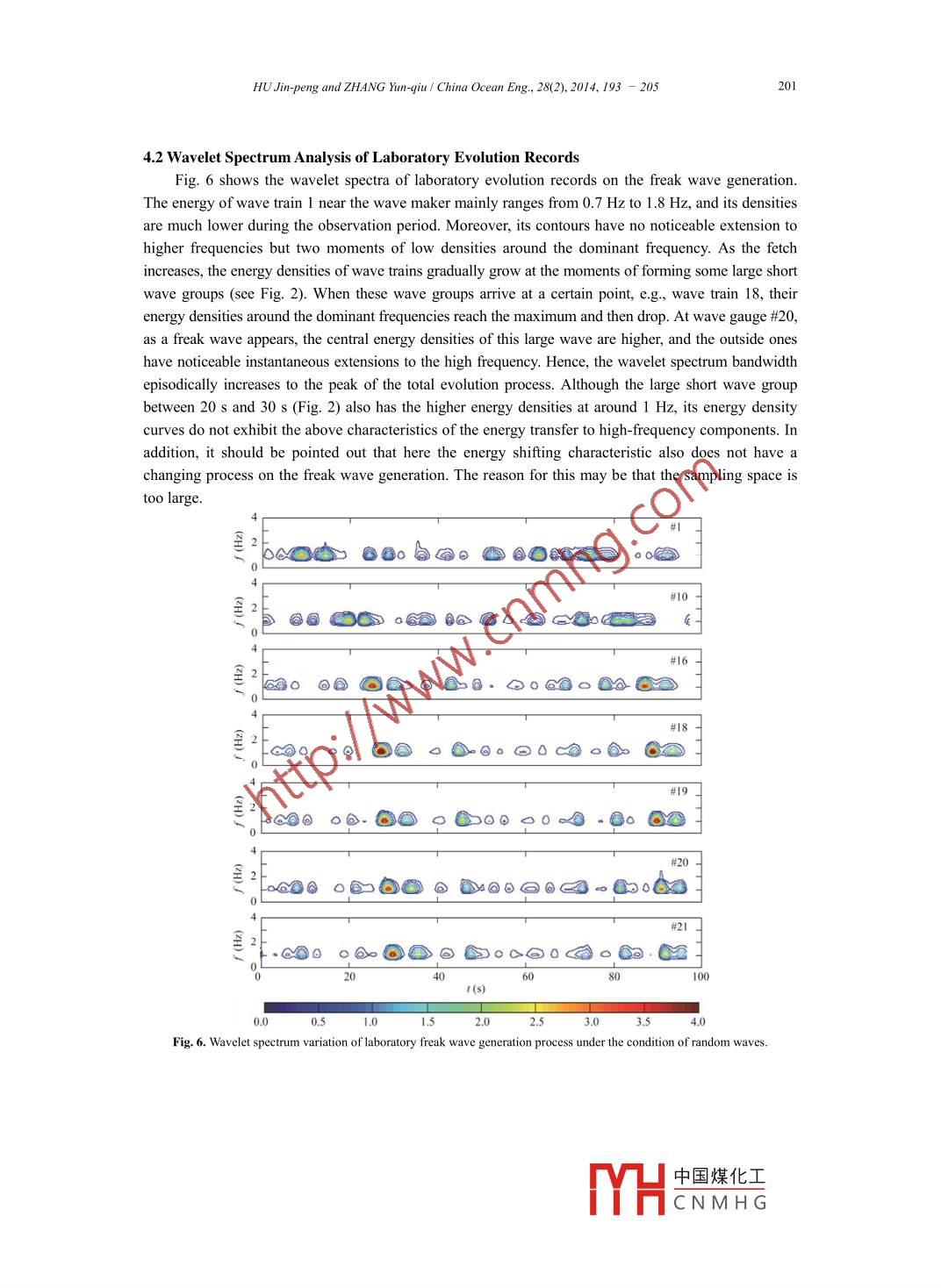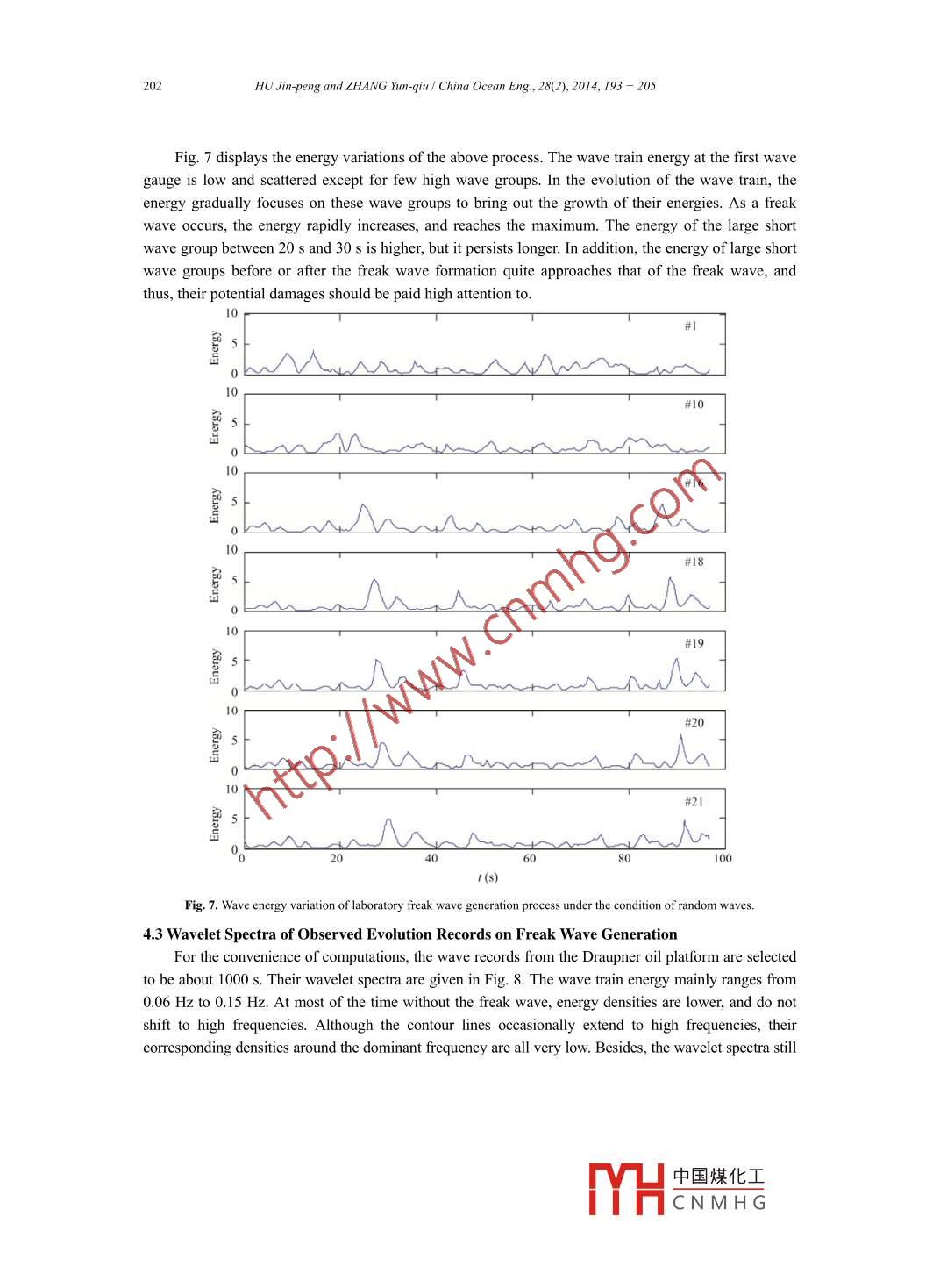 China Ocean Eng, Vol. 28, No.2, pp. 193 - 205◎2014 Chinese Ocean Engineering SocietyDOI 10.1007/s13344-014-0015-6,ISSN 0890-5487Analysis of Energy Characteristics in the Process of Freak Wave Generation*HU Jin-peng (胡金鵬).b and ZHANG Yun-qiu (張運秋):d1a School of Civil Engineering and Transportation, South China University of Technology, Guangzhou 510641, Chinab Naval Architecture and Ocean Engineering R & D Center of Guangdong Province,South China University of Technology, Guangzhou 510641, China“Guangzhou Institute of Energy Conversion, Chinese Academy of Sciences, Guangzhou 510640, Chinad Key Laboratory of Renewable Energy and Gas Hydrate, Chinese Academy of Sciences, Guangzhou 5 10640, China(Received 4 June 2012; received revised form 9 November 2012; acepted 28 February 2013)ABSTRACTThe energy characteristics in the evolution of the wave train are investigated to understand the inherent cause of the freakwave generation. The Morlet wavelet spectrum method is employed to analyze the numerical, laboratory and field evolution dataof this generation process. Their energy distributions and variations are discussed with consideration of corresponding surfaceelevations. Through comparing the energy charateristics of three cases, it is shown that the freak wave generation depends notonly on the continuous transfer of wave train energy to a certain region where finally the maximum energy occurs, but also on thedistinct shift of the converged energy to high-frequency components in a very short time. And the typical energy characteristics offreak waves are also given.Key words: freak wave; generation process; wavelet spectrum; energy characteristics1. IntroductionFreak waves (Klinting and Sand, 1987), usually much higher than the normal waves in the ocean,have been paid much attention to for their disastrous destruction of ocean engineering structures(Kharif and Pelinovsky, 2003; Zhao et al, 2009, 2010). They occur occasionally and disappearinstantaneously in some unexpected positions. Hence the field data of freak waves are very scarce andprecious. Many researchers have used the numerical and laboratory simulations to study theirgeneration mechanisms and characteristics. However, the energy characteristics of the freak wavegeneration process are still unclear, and require intensive study.Energy characteristics are traditionally analyzed with the Fourier energy spectrum method. Thismethod displays a time-mean energy distribution in frequency and is suitable for analyzing a stationaryrandom process. However, it is insufficient for analyzing a non-stationary process such as a wave traincontaining a freak wave (Chien et al, 2002). A proper method is the wavelet spectrum method. Thewavelet spectrum method is another relatively new energy analysis method that has been applied toocean engineering for nearly twenty years (Massel, 2001; Lin and Liu, 2004). Because it can clearlydisplay the local energy properties of a signal in frequency and time domain, many oceanographersThe work was financially supported by the National Natural Science Foundation of China (Grant Nos. 10902039 and41106031).1 Corresponding author. E-mail: zhangyq6@ms.gec.ac.cn中國煤化工YHCNMH G194HU Jin-peng and ZHANG Yun-qiu/ China Ocean Eng, 28(2), 2014, 193 - 205have used this method to analyze the energy structures of freak waves.Now the“New Year wave", measured in the Central North Sea on January 1, 1995, is still themost famous freak wave. Jakobsen et al. (2001) used the wavelet transformation to analyze this waverecord and noticed that, compared with the Mexican hat wavelet, the time-mean Morlet wavelet energyspectrum fits well with the Fourier energy spectrum. Liu and Mori (2000, 2001) and Mori et al. (2002)analyzed several periods of continuous wave records from the Sea of Japan during 1986-1990. Theirresults indicated that freak waves can be readily identified from the Morlet wavelet spectrum. At theinstant a freak wave occurs, its energy density is strong and instantly surges and seemingly carries overto the high-frequency components. They also regarded wavelet transform analysis as an ideal approachto discern the localized characteristics of freak waves. The freak wave event is also one of the frequenthazards around the Taiwan coast. Chien et al. (2002) used the Morlet wavelet spectrum to analyzecoastal freak waves from Cheng-Kung wave stations. The wavelet spectrum of a freak wave series,whose crest is much larger than its trough, shows its energy components are very complex, and itsfrequency band covers a wider range. Zhang (2008) analyzed 25 sets of freak wave records from 10years of Hualien buoy data. He found that at the moment when a freak wave occurred, the Morletwavelet spectrum was wide and the total energy was the largest. However, the moment when thelargest peak energy density emerges, does not necessarily indicate a freak wave. Wu et al. (2010) usedthe wavelet scalogram of the above records to investigate the energy characteristics during theoccurrence of freak waves. The wave energy and phase analysis illuminated that the component waveswould lead to constructive superposition due to similar phases. Lee et al. (2011) also studied these 25sets of data by using the Morlet spectrum, revealing that freak waves display the maximum waveenergies and the instantaneous phase spectrum concentrations. Different from these measured datainvestigations, Kwon et al. (2005) investigated the laboratory freak wave and its impact force throughMorlet transform. Their coherence analysis revealed that some high-frequency components werehighly correlated with the impact force. The study demonstrated that the wavelet transform can be analternative tool in the analysis of the strongly nonlinear freak wave and its impact. Huang et al. (2009)used the Morlet spectrum to study the time-frequency characteristics of laboratory freak wavegeneration process. They noticed that the energy distribution was distinct before an