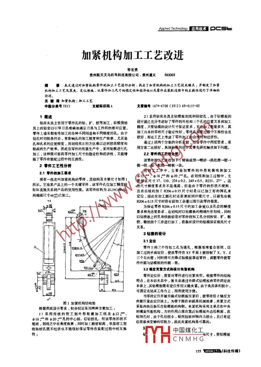 加緊機(jī)構(gòu)加工工藝改進(jìn)李發(fā)貴貴州航天天馬機(jī)電科技有限公司,貴州遭義563003萋本文通過(guò)對(duì)加緊機(jī)構(gòu)零件的加工工藝進(jìn)行分析,找出了加緊機(jī)構(gòu)的加工工藝技術(shù)難點(diǎn),并制定了加緊機(jī)構(gòu)加工工藝及裝夾、定位糟施,從拿件加工尺寸的穩(wěn)定性和經(jīng)濟(jì)性以及零件在裝配過(guò)程中的互提性進(jìn)行了訴細(xì)關(guān)鍵調(diào)加緊機(jī)構(gòu);加工工藝中圖分類(lèi)號(hào)TH13文獻(xiàn)標(biāo)識(shí)碼A文章號(hào)16146708(2012)69-0155-021述2)采用鉆床夾具及鉆模板劃線(xiàn)和鉆鉸孔,由于鉆模板的鉆床夾具主要用于零件孔的鉆、擴(kuò)、蛟等加工,鉆模供助設(shè)計(jì)就已充分考慮好了零件的外形和三個(gè)孔的位置關(guān)系和加工其上的鉆套以引導(dǎo)刀貝準(zhǔn)確地確定刀具與工件聞的相對(duì)位置,精度,只要鉆模的設(shè)計(jì)尺寸保證要求,無(wú)論加工數(shù)量多大,其零件上通常都有待加工的各種不同用途和不同精度的孔。由于加工出來(lái)的零件尺寸穩(wěn)定性好,零件在裝配過(guò)程中互換性也比鉆孔時(shí)切削條件差,常影響孔的加工精度和生產(chǎn)效率,尤其是較好,即在工藝上考慮了零件加工的合理性和經(jīng)濟(jì)性??缀涂紫档奈恢镁?用劃線(xiàn)找正的方法難以達(dá)到較高精度和通過(guò)上述兩個(gè)方案的分析比較,結(jié)合零件中圖紙要求,采較高的生產(chǎn)效率。因此在軍件的批量生產(chǎn)中,采用鉆模進(jìn)行孔用方案二比較好,具體鉆模的設(shè)計(jì)需要先研究解決如下問(wèn)題加工,這樣既可提高零件加工尺寸的穩(wěn)定性和經(jīng)濟(jì)性,又能增22零件的工藝性分析強(qiáng)了零件在裝配過(guò)程中的互換性該零件的工藝流程如下:精鑄成型→噴砂→熱處理一鉗一2零件工藝性分析銑→鉗、鉆→粗銑→精銑→表21零件的加工攝求在鉗工工序中,主要是劃零件的外形輪廓線(xiàn)和加工現(xiàn)有一批名叫加緊機(jī)構(gòu)的零件,其結(jié)構(gòu)及主要尺寸如圖1要保證尺寸17、10、24±02、249±05、R21、27°。這些尺寸精度要求井不是很高,但是由于零件的形狀不規(guī)則好壞直接關(guān)系到產(chǎn)品的使用性能。該零件材料為ZC5 CrAns,且在后續(xù)的加工R206±015尺寸時(shí)是以已加工好的圓孔來(lái)定位,因此在加工圓孔時(shí)還要兼顧到后續(xù)尺寸,以避免在銑R206±015尺寸時(shí)沒(méi)有留加工余量以致引起零件報(bào)廢媽為保證零件R206±0.15尺寸的加工余量以及孔位的精度要求和光潔度要求,在劃線(xiàn)時(shí)以鉆模板的精確外形劃線(xiàn),同時(shí)以鉆模板上的孔和快換鉆套對(duì)零件待加工孔分別按鉆、擴(kuò)、粗鉸、精鉸四個(gè)工步進(jìn)行加工,依靠所設(shè)計(jì)的鉆模保證相關(guān)尺寸關(guān)系。3鉆梗的設(shè)計(jì)零件上的三個(gè)待加工孔為通孔,根據(jù)基準(zhǔn)重合原則,以加工過(guò)的平面定位,使該零件在XY平面上被限制了X、Y、ZR717-L/三個(gè)自由度;同時(shí)將可升降式鉆模板靠近零件,調(diào)整零件使零件外囡與鉆模板的外圓一致。32確定突景方式和設(shè)計(jì)夾景帆梅零件定位后,需要對(duì)零件進(jìn)行壓緊夾牢。根據(jù)零件的結(jié)構(gòu)特點(diǎn),在本鉆夾具中,裝夾是通過(guò)升降式鉆模板將零件固定在本體上,其鉆模板既有定位作用又能夾緊。由于夾具體積較小,在鉆床工作臺(tái)上,因而使用方便當(dāng)零件定位并被升降式鉆模板壓緊后,使零件沿Z軸反方圖1加緊機(jī)構(gòu)結(jié)構(gòu)圖向被壓緊在定位塊上。為便于操作和提高機(jī)械效率,夾緊方式根據(jù)圖紙?jiān)O(shè)計(jì)要求,初步擬定采用兩種方案加工采取兩塊壓板壓在鉆模板的兩側(cè)。夾緊機(jī)構(gòu)采用支承點(diǎn)在中央1)采用傳統(tǒng)的鉗工劃外形輪廓加工線(xiàn)及12:的螺旋壓板機(jī)構(gòu),力的作用點(diǎn)落在靠近鉆模板外邊沿側(cè)面,在416和d20:孔的中心線(xiàn)。后鉆鉸孔。但該零件形狀不鉆削孔時(shí),由于孔徑較小,鉆削扭矩和軸向力較小,且已有定規(guī)則,劉線(xiàn)之中有角度換算,同時(shí)加工精度較高,單鉗工劃位底板承受軸向切削力,故此夾緊機(jī)構(gòu)是可靠的線(xiàn)鉆鉸孔既不經(jīng)濟(jì)也不能很好保證零件在裝配過(guò)程中的互換性TYH中國(guó)煤化工CNMHG】科技傳播》口cs=【用技術(shù) Applied Tec既具有按外形劃線(xiàn)功能,又具有鉆模功能。由于要求鉆模板具零件孔的加工精度起著精確保證作用;夾緊裝置主要由壓板有夾緊功能,所以設(shè)計(jì)鉆模板時(shí)應(yīng)使鉆模板具有一定的強(qiáng)度和彈簧、滑桿和螺柱等零件組成,主要作用是將工件壓緊夾牢,剛度,以防止由于變形而影響鉆套的位置精度和導(dǎo)向精度。同并保證工件在加工過(guò)程中正確位置不變。其結(jié)構(gòu)簡(jiǎn)圖如圖2所時(shí),為便于按鉆模板外形給加緊機(jī)構(gòu)零件劃線(xiàn),鉆模板的周邊外邊沿應(yīng)向內(nèi)側(cè)倒一定角度。另外鉆模板的導(dǎo)向孔和本體上的4.2鉆的工作原理導(dǎo)向柱應(yīng)為H7g6的間隙配合,以便于鉆模板的升降鉆模的工作原理如下:先將零件用游標(biāo)卡尺測(cè)量R236與34鉆套的設(shè)計(jì)R212之間的實(shí)際尺寸,兼顧R212與R206之間是否能保證
