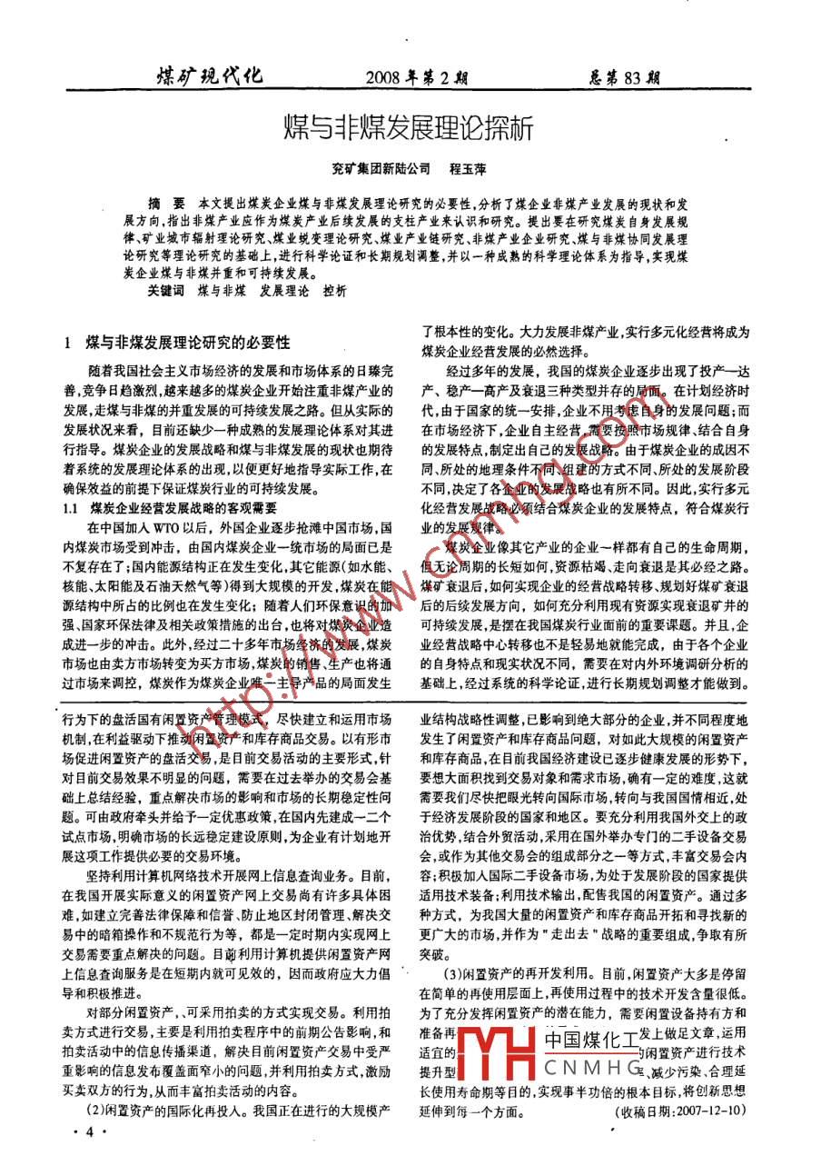煤礦現(xiàn)代化_2008年第2期總第83期煤與非煤發(fā)展理論探析兗礦集團(tuán)新陸公司程玉萍摘要本文提出煤炭企業(yè)煤與非煤發(fā)展理論研究的必要性,分析了煤企業(yè)非煤產(chǎn)業(yè)發(fā)展的現(xiàn)狀和發(fā)展方向,指出非煤產(chǎn)業(yè)應(yīng)作為煤炭產(chǎn)業(yè)后續(xù)發(fā)展的支柱產(chǎn)業(yè)來(lái)認(rèn)識(shí)和研究。提出要在研究煤炭自身發(fā)展規(guī)律、礦業(yè)城市輻射理論研究、煤業(yè)蛻變理論研究、煤業(yè)產(chǎn)業(yè)鏈研究、非煤產(chǎn)業(yè)企業(yè)研究、煤與非煤協(xié)同發(fā)展理論研究等理論研究的基礎(chǔ)上,進(jìn)行科學(xué)論證和長(zhǎng)期規(guī)劃調(diào)整,并以一種成熟的科學(xué)理論體系為指導(dǎo),實(shí)現(xiàn)煤炭企業(yè)煤與非煤并重和可持續(xù)發(fā)展。關(guān)鍵詞煤與非煤 發(fā)展理論 控析了根本性的變化。大力發(fā)展非煤產(chǎn)業(yè),實(shí)行多元化經(jīng)營(yíng)將成為1煤與非煤發(fā)展理 論研究的必要性煤炭企業(yè)經(jīng)營(yíng)發(fā)展的必然選擇。隨著我國(guó)社會(huì)主義市場(chǎng)經(jīng)濟(jì)的發(fā)展和市場(chǎng)體系的日臻完經(jīng)過(guò)多年的發(fā)展,我國(guó)的煤炭企業(yè)逐步出現(xiàn)了投產(chǎn)-達(dá)善,競(jìng)爭(zhēng)日趨激烈,越來(lái)越多的煤炭企業(yè)開(kāi)始注重非煤產(chǎn)業(yè)的產(chǎn)穩(wěn)產(chǎn)- -高產(chǎn)及衰退三種類型并存的局面。在計(jì)劃經(jīng)濟(jì)時(shí)發(fā)展,走煤與非煤的并重發(fā)展的可持續(xù)發(fā)展之路。但從實(shí)際的代,由于國(guó)家的統(tǒng)- -安排,企業(yè)不用考慮自身的發(fā)展問(wèn)題;而發(fā)展?fàn)顩r來(lái)看,目前還缺少一種成熟的發(fā)展理論體系對(duì)其進(jìn)在市場(chǎng)經(jīng)濟(jì)下,企業(yè)自主經(jīng)營(yíng),需要按照市場(chǎng)規(guī)律結(jié)合自身行指導(dǎo)。煤炭企業(yè)的發(fā)展戰(zhàn)略和煤與非煤發(fā)展的現(xiàn)狀也期待的發(fā)展特點(diǎn),制定出自己的發(fā)展戰(zhàn)略。由于煤炭企業(yè)的成因不著系統(tǒng)的發(fā)展理論體系的出現(xiàn),以便更好地指導(dǎo)實(shí)際工作,在同、所處的地理:條件不同、組建的方式不同、所處的發(fā)展階段確保效益的前提下保證煤炭行業(yè)的可持續(xù)發(fā)展。不同,決定了各企業(yè)的發(fā)展戰(zhàn)略也有所不同。因此,實(shí)行多元1.1 煤炭企業(yè)經(jīng)營(yíng)發(fā)展戰(zhàn)略的客觀需要化經(jīng)營(yíng)發(fā)展戰(zhàn)略必須結(jié)合煤炭企業(yè)的發(fā)展特點(diǎn),符合煤炭行在中國(guó)加入WTO以后,外國(guó)企業(yè)逐步搶灘中國(guó)市場(chǎng),國(guó)業(yè)的發(fā)展規(guī)律。內(nèi)煤炭市場(chǎng)受到?jīng)_擊,由國(guó)內(nèi)煤炭企業(yè)一統(tǒng)市 場(chǎng)的局面已是煤炭企業(yè)像其它產(chǎn)業(yè)的企業(yè)一樣都有自己的生命周期,不復(fù)存在了;國(guó)內(nèi)能源結(jié)構(gòu)正在發(fā)生變化,其它能源(如水能、但無(wú)論周期的長(zhǎng)短如何,資源枯竭、走向衰退是其必經(jīng)之路。核能、太陽(yáng)能及石油天然氣等)得到大規(guī)模的開(kāi)發(fā),煤炭在能煤礦衰退后,如何實(shí)現(xiàn)企業(yè)的經(jīng)營(yíng)戰(zhàn)路轉(zhuǎn)移、規(guī)劃好煤礦衰退源結(jié)構(gòu)中所占的比例也在發(fā)生變化;隨著人們環(huán)保意識(shí)的加后的后續(xù)發(fā)展方向,如何充分利用現(xiàn)有資源實(shí)現(xiàn)衰退礦井的強(qiáng)、國(guó)家環(huán)保法律及相關(guān)政策措施的出臺(tái),也將對(duì)煤炭企業(yè)造可持續(xù)發(fā)展,是擺在我國(guó)煤炭行業(yè)面前的重要課題。并且,企成進(jìn)-一步的沖擊。此外,經(jīng)過(guò)二十多年市場(chǎng)經(jīng)濟(jì)的發(fā)展,煤炭業(yè)經(jīng)營(yíng)戰(zhàn)略中心轉(zhuǎn)移也不是輕易地就能完成,由于各個(gè)企業(yè)市場(chǎng)也由賣方市場(chǎng)轉(zhuǎn)變?yōu)橘I方市場(chǎng),煤炭的銷售生產(chǎn)也將通的自身特點(diǎn)和現(xiàn)實(shí)狀況不同,需要在對(duì)內(nèi)外環(huán)境調(diào)研分析的過(guò)市場(chǎng)來(lái)調(diào)控,煤炭作為煤炭企業(yè)唯- -主導(dǎo)產(chǎn)品的局面發(fā)生基礎(chǔ)上,經(jīng)過(guò)系統(tǒng)的科學(xué)論證,進(jìn)行長(zhǎng)期規(guī)劃調(diào)整才能做到。行為下的盤活國(guó)有閑置資產(chǎn)管理模式,盡快建立和運(yùn)用市場(chǎng)業(yè)結(jié)構(gòu)戰(zhàn)略性調(diào)整,已影響到絕大部分的企業(yè),并不同程度地機(jī)制,在利益驅(qū)動(dòng)下推動(dòng)閑置資產(chǎn)和庫(kù)存商品交易。以有形市發(fā)生了閑置資產(chǎn)和庫(kù)存商品問(wèn)題,對(duì)如此大規(guī)模的閑置資產(chǎn)場(chǎng)促進(jìn)閑置資產(chǎn)的盤活交易,是目前交易活動(dòng)的主要形式,針和庫(kù)存商品,在目前我國(guó)經(jīng)濟(jì)建設(shè)已逐步健康發(fā)展的形勢(shì)下,對(duì)目前交易效果不明顯的問(wèn)題,需要在過(guò)去舉辦的交易會(huì)基要想大面積找到交易對(duì)象和需求市場(chǎng),確有- -定的難度,這就礎(chǔ)上總結(jié)經(jīng)驗(yàn),重點(diǎn)解決市場(chǎng)的影響和市場(chǎng)的長(zhǎng)期穩(wěn)定性問(wèn)需要我們盡快把眼光轉