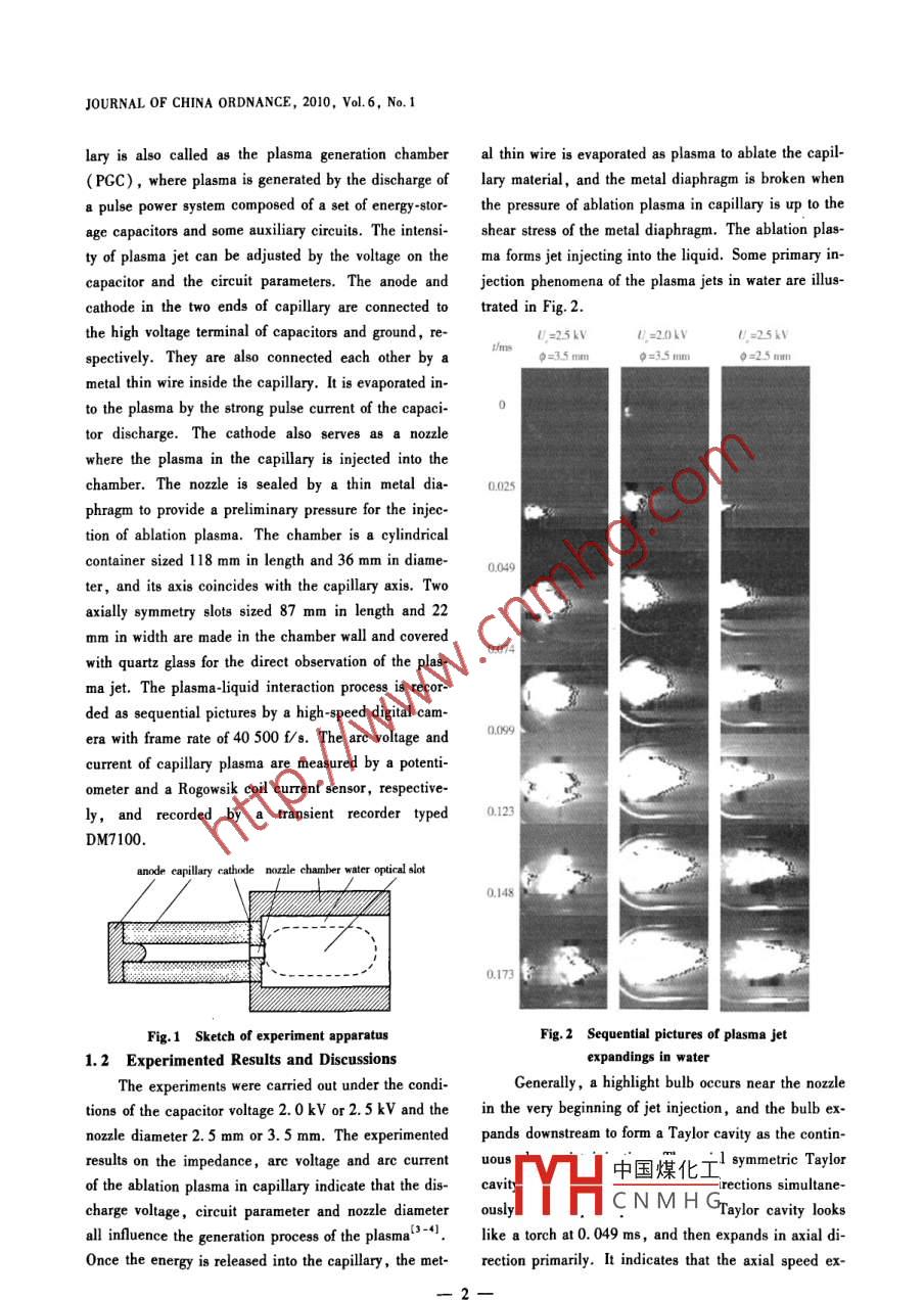 JOURNAL OF CHINA ORDNANCEExperiment and Calculation for Expansion Process ofAblation Plasma Jets in LiquidLIU Dong-yao(劉東堯)',WANG Yu-wei(王育維)2 , ZHOU Yan-huang(周彥煌)'(1. School of Power Engineering, Nanjing Universty of Science and Technology, Nanjing 210094 Jiangsu, China;2. Northwestern Institute of Mechanical and Eletrical Engineering, Xianyang 712099 Shaanxi, China)Abstract: The expansion process of ablation plasma jet in liquid was experimentally investigated by using high speed digitalcamera. The sequential pictures show that, in the initial stage of the jet, the Taylor cavity expands in the axial and radialdirections simultaneously, and then, ig subjected to the constraint of chamber wall, in axial direction mainly. The maxi-mum axial speed of the cavity's head ranges from 240 m/s to 280 m/s. Some strong heat conduction and mass transmissioneffects can be found in the surface of Taylor cavity , where the plasma cools down and condenses a solid particles while theliquid vaporizes as gas. Compared the expansion processes of the cavities among the different discharge energies and thenozzle diameters, it can be seen that the expansion speed of the cavity is directly proportional to the discharge energy andinversely to the nozzle diameter, and the efect of the discharge energy is stronger than that of the nozzle diameter. A set ofequations describing the expansion process of ablation plasma jet was derived under the assumption of momentum conserva-tion. The calculated resuls by use of the equations coincide with the experimented results bltterKey Words: mechanics of explosion; ablation plasma jet; Taylor cavity; experimental study; numerical calculationCLC Number: TJ012Document Code: AArticle ID: 1673 002X(2010)01-0001-04graph, measured the expansion speed of Taylor cavityIntroductionand the mass loss of water, and proposed a theoreticalFor the electro-thermal chemical propulsionmodel to calculate the expansion speed and mass ex-(ETC) reduces the requirements of energetic proper-change in the surface of Taylor cavity.ties, a lot of low exothermal or even endothermic mate-The expansion process of ablation plasma jet inrials can be used as candidates for the propellants. Thwater was investigated experimentally and theoreticallyinteraction mechanism of plasma jets with liquid is oneby the authors. The continuous growing processes ofof the most important issues in the studies on the ETCTaylor cavity were recoded by a high-speed digitalinterior ballistics. And, water is widely used as work-camera, and the propagation speed of the frontal sur-ing medium in the study on plasma-liquid interactionface of Taylor cavity was calculated according to itsfor its safety and nontoxic.traces in the consecutive pictures. A set of algebraicIn the past decades, many experimental and theo-equations was presented under the assumption of mo-retical studies on the interactions of plasma jets withmentum conservation to calculate the expansion param-liquids were carried out. K K Kuo'" investigated theeters of Taylor cavity. The calculated expansion speedsplasma-liquid interaction mechanism by using higof Taylor cavity were compared with the experimentedspeed movie camera and X-ray radiography, observedresults.the interaction process when the plasma jet penetrated1 Experimental Investigationinto the liquid, calculated the speed of Taylor cavity'shead , and analyzed the plasma density distribution ac-1.1 Experiment Apparatuscording to the X ray pictures. Arensburg(2] studied therists of a cpillarypenetration of plasma jet into water by X-ray shadow-and e中國(guó)煤化工rig. 1. The capilTHCNMHGReceived 2009.04-30Sponsored by the National Nature Science Foundation of China (10302102)Blography LIU Dongyao( 1969- ), male, asistant rearcher, liudong@ mail. njus. edu. cn一1一JOURNAL OF CHINA ORDNANCE, 2010, Vol.6, No.1lary is also called as the plasma generation chamberal thin wire is evaporated as plasma to ablate the capil-( PGC), where plasma is generated by the discharge oflary material, and the metal diaphragm is broken whena pulse power system composed of a set of energy-stor-the pressure of ablation plasma in capillary is up to theage capacitors and some auxiliary circuits. The intensi-shear stress of the metal diaphragm. The ablation plas-ty of plasma jet can be adjusted by the voltage on thema forms jet injecting into the liquid. Some primary in-capacitor and the circuit parameters. The anode andjection phenomena of the plasma jets in water are ilus-cathode in the two ends of capillary are connected totrated in Fig. 2.the high voltage terminal of capacitors and ground, re-1;=25kV1,=201V "1,.=25kVt/msspectively. They are also connected each other by aφ=3.5 mnφ=3.5 mm0=2.5 mmmetal thin wire inside the capillary. It is evaporated in.to the plasma by the strong pulse current of the capaci-0tor discharge. The cathode also serves as a nozzlewhere the plasma in the capillary is injected into thechamber. The nozzle is sealed by a thin metal dia-0.025phragm to provide a preliminary pressure for the injec-tion of ablation plasma. The chamber is a cylindricalcontainer sized 118 mm in length and 36 mm in diame- 0.040ter, and its axis coincides with the capillary axis. Twoaxially symmetry slots sized 87 mm in length and 22mm in width are made in the chamber wall and covered0.074with quartz glass for the direct observation of the plas-ma jet. The plasma-liquid interaction process is recor-ded as sequential pictures by a high-speed digital cam-.099era with frame rate of 40500 f/s. The arc voltage andcurrent of capillary plasma are measured by a potenti-ometer and a Rogowsik coil current sensor, respective-ly, and recorded by a transient recorder typed 0.23DM7100.anode eapillary eathode nozzle chamber water optical slot0.1480.173Fig.1 Sketch of experiment apparatusfig.2 Sequential pictures of plasma jet1.2 Experimented Results and Discussionsexpandings in waterThe experiments were carried out under th