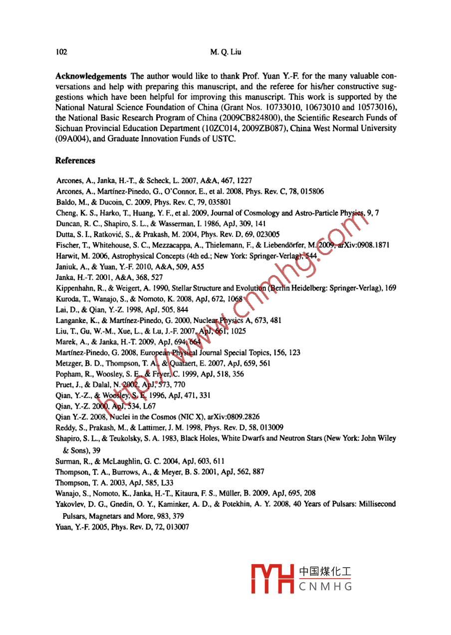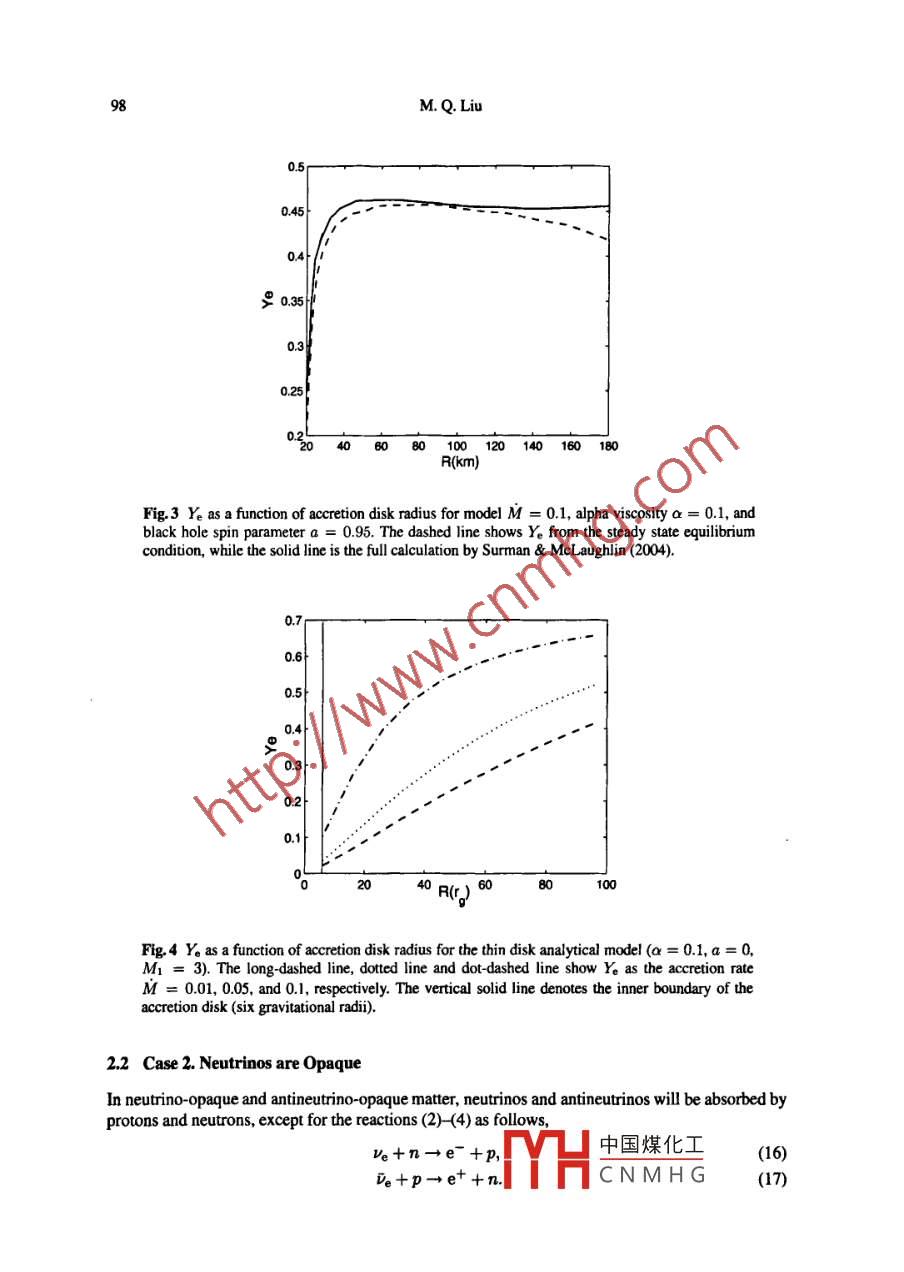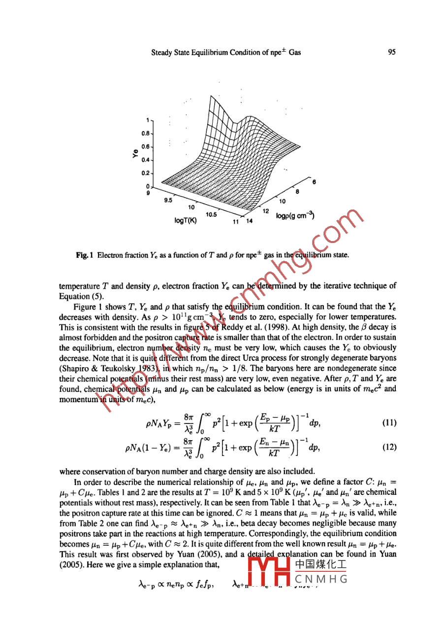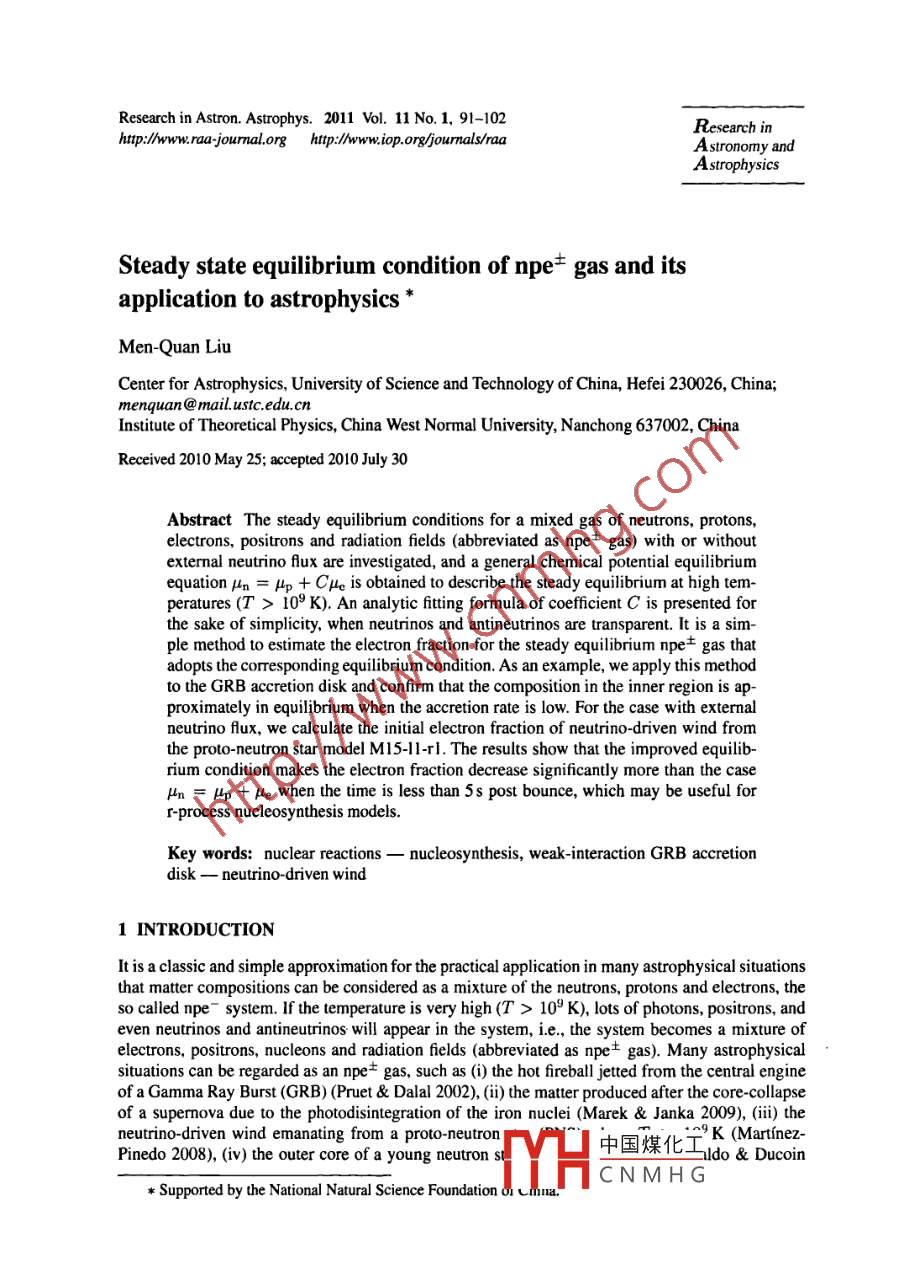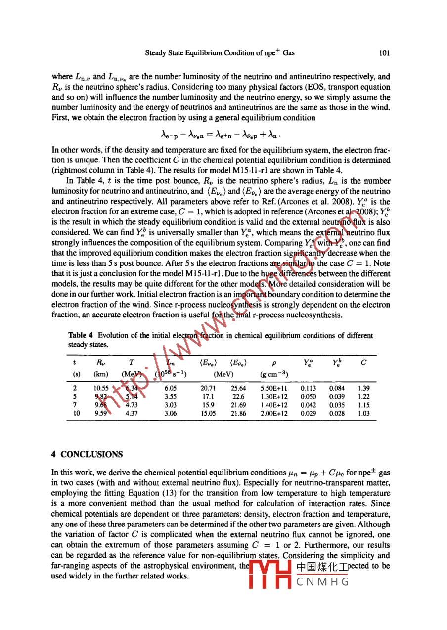 Research in Astron. Astrophys. 2011 Vol. 11 No. 1. 91-102Research inhttp://www.raa-joumalorghttp://www.ioporg/journals/raaAAstrophysicsSteady state equilibrium condition of npe* gas and itsapplication to astrophysicsMen-Quan LiuCenter for Astrophysics, University of Science and Technology of China, Hefei 230026, China;minquan@maiL.ustc.edu.cnInstitute of Theoretical Physics, China West Normal University, Nanchong 637002, ChinaReceived 2010 May 25: accepted 2010 July 30Abstract The steady equilibrium conditions for a mixed gas of neutrons, protons.electrons, positrons and radiation fields(abbreviated as npe gas)with or withoutexternal neutrino flux are investigated, and a general chemical potential equilibriumequation un=Ap Cue is obtained to describe the steady equilibrium at high tem-(T>109K)tic fitting formula of coefficient C isthe sake of simplicity, when neutrinos and antineutrinos are transparent. It is a sim-ple method to estimate the electron fraction for the steady equilibrium npe- gas thatadopts the corresponding equilibrium condition. As an example, we apply this methodto the grB accretion disk and confirm that the composition in the inner region is approximately in equilibrium when the accretion rate is low. For the case with extermalneutrino flux. we calculate the initial electron fraction of neutrino-driven wind fromthe proto-neutron star model MI5-11-rl. The results show that the improved equilib-rium condition makes the electron fraction decrease significantly more than the caseAn=Pp + He when the time is less than 5s post bounce, which may be useful forr-process nucleosynthesis modelsKey words: nuclear reactions nucleosynthesis, weak-interaction GRB accretiondisk- neutrino-driven wind1 INTRODUCTIONIt is a classic and simple approximation for the practical application in many astrophysical situationsthat matter compositions can be considered as a mixture of the neutrons, protons and electrons, theso called npe" system. If the temperature is very high(T> 10 K), lots of photons, positrons, andeven neutrinos and antineutrinos will appear in the system, i.e., the system becomes a mixture ofelectrons, positrons, nucleons and radiation fields(abbreviated as npe* gas ) Many astrophysicalsituations can be regarded as an npe* gas, such as(i)the hot fireball jetted from the central engineof a Gamma Ray Burst( GRB)(Pruet Dalal 2002), (i)the matter produced after the core-collapseof a supernova due to the photodisintegration of the iron nuclei( Marek Janka 2009),(iii)theneutrino-driven wind emanating from a proto-neutron中國煤化工:9K(Martinez-Pinedo 2008),(iv)the outer core of a young neutron staldo aucoinCNMHGSupported by the National Natural Science Foundation2009),(v)the accretion disk of a Grb Liu et al. 2007; Janiuk Yuan 2010)and(vi)the earlyuniverse before the decoupling of neutrinos( Dutta et al. 2004; Harwit 2006). In summary, npe andnpe gas is applied widely in present studies. The equilibrium steady state of npe or npt gasis an important stage for many cases. Many authors have addressed this issue for several decadesA typical approach to the steady state equilibrium of the npe system was proposed by ShapiroTeukolsky(1983). They gave an important result that Pn pp the for a steady equilibriumnpe system, where A's are the chemical potentials for neutrons, protons and electrons respectivelyThis result has been accepted by most authors. However, because Shapiro Teukolsky(1983)onlyconsidered the electron capture and its reverse interaction at 'low temperature, they ignored theappearance of positrons when the temperature of the system is high enough for this to be a factorRecently, Yuan(2005)argued that many positrons can exist at high temperatures, which leads to agreat increase of the positrons'capture rate. The positron capture significantly affects the conditionof steady state equilibrium. If the neutrinos can escape freely from the system with plenty of epairs, the equilibrium condition should be An =Ap +2e instead. However, for a more generalcondition when the temperature is moderate, the equilibrium condition has not be researched. Liuet al.(2007)have previously proposed a method in which they assume that the coefficient of pevaries exponentially from un =Hp +He to An=up+ 2ue in the accretion disk of GRBs, but itis not a rigorous method. Therefore, a detailed and reliable database or fitting function to describethe steady state equilibrium of the npe gas at any temperature is necessary. Furthermore, the abovediscussions are limited to an isolated system ignoring the external neutrino fux. In this paper, weinvestigate the chemical equilibrium condition for npe* gas at any temperature from 10 to 10 K,and give a concrete application to the grB accretion disk. we also calculate the initial electronfraction of the neutrino-driven wind in a PNS, in which the external strong neutrino flux cannot beignored. This paper is organized as follows In Section 2, we present the equilibrium conditions whenneutrinos are transparent or opaque for an isolated system. Section 3 contains a detailed discussionof the initial electron fraction of a neutrino-driven wind for the pn model M15-1l-rl(Arcones etal. 2007, 2008). Finally, we analyze the results and draw our conclusions2 EQUILIBRIUM CONDITION OF npeGAS WITHOUT THE EXTERNALNEUTRINO FLUXFor a mixed gas of npe and a radiation field in different physical conditions, we divide it into twocases: neutrino transparency and opacity. To guarantee self-consistency, we give a simple estimatefor the opaque critical density of the npe- gas. The mean free path of the neutrino islwhere n and nn are the number density of baryons and neutrons respectively. HereP(1-Ye)d gabe ar10-44( Kippenhanhn Weigert 1990), where E, is the energy of the neutrino, mec is the mass energy ofan electron, and c is the speed of light. In addition中國煤化工ob≈Epe≈CNMHGSteady State Equilibrium Condition of npe*Gas(Qian& Woosley 1996; Lai& Qian 1998), whereA=πGcos2(