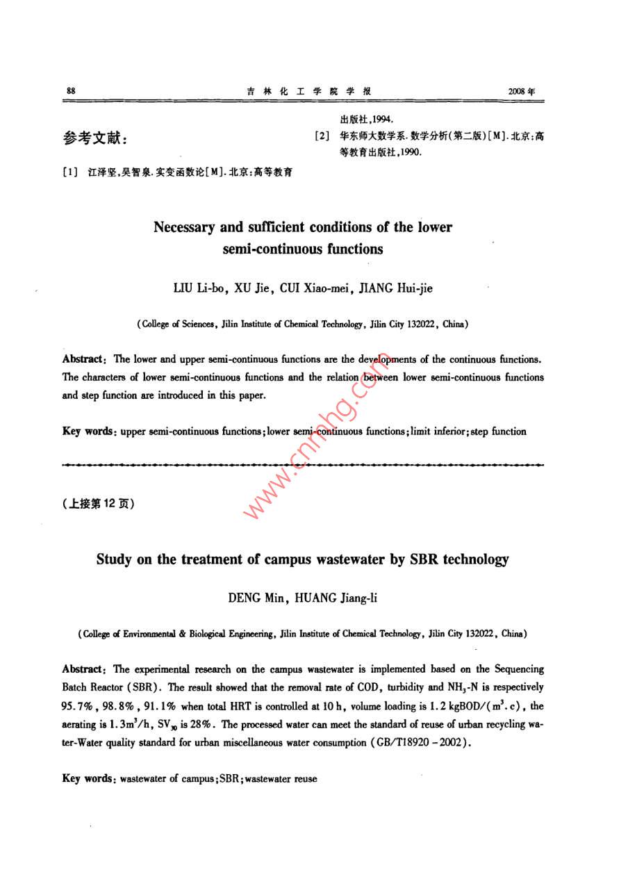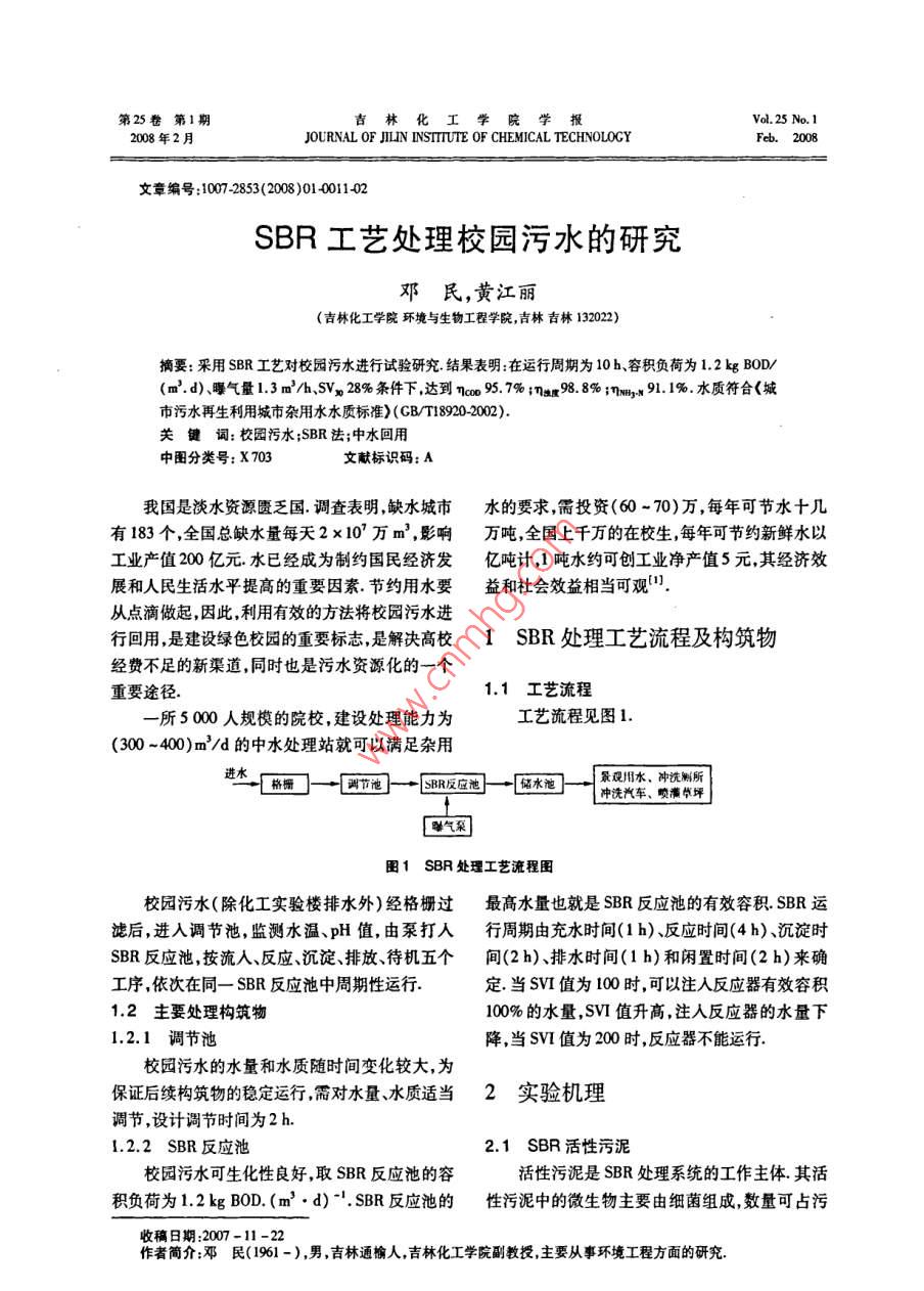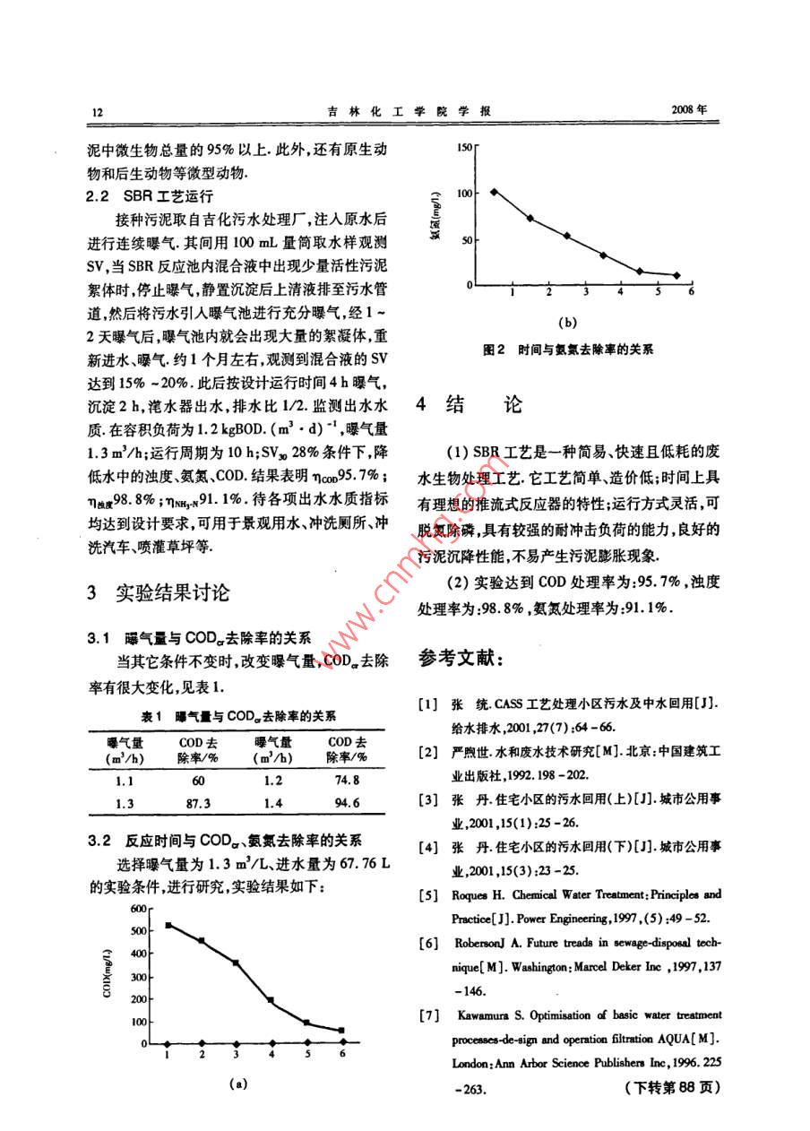 第25卷第1期Vol 25 No. 12008年2月JOURNAL OF JILIN INSTTTUTE OF CHEMICAL TECHNOLOGYFeb.2008文章編號:1007-2853(2008)01001102SBR工藝處理校園污水的研究鄧民,黃江麗(吉林化工學(xué)院環(huán)境與生物工程學(xué)院吉林吉林13202摘要:采用SBR工藝對校園污水進行試驗研究結(jié)果表明在運行周期為10h容積負荷為1.2 kg BOD(m.d)、曝氣量1.3m/h、SVx28%條件下達到no%5.7%;nr9.8%;nm9.1%水質(zhì)符合《城市污水再生利用城市雜用水水質(zhì)標準)(GB/T18920-200)關(guān)鍵詞:校園污水;SBR法;中水回用中圖分類號:X703文獻標識碼:A我國是淡水資源匱乏國調(diào)查表明缺水城市水的要求,需投資(60-70)萬,每年可節(jié)水十幾有183個,全國總?cè)彼棵刻?×107萬m3,影響萬噸全國上千萬的在校生,每年可節(jié)約新鮮水以工業(yè)產(chǎn)值200億元水已經(jīng)成為制約國民經(jīng)濟發(fā)億噸計,1噸水約可創(chuàng)工業(yè)凈產(chǎn)值5元,其經(jīng)濟效展和人民生活水平提高的重要因素節(jié)約用水要益和社會效益相當可觀從點滴做起,因此,利用有效的方法將校園污水進行回用,是建設(shè)綠色校園的重要標志是解決高校1SBR處理工藝流程及構(gòu)筑物經(jīng)費不足的新渠道,同時也是污水資源化的一個重要途徑1.1工藝流程所5000人規(guī)模的院校,建設(shè)處理能力為工藝流程見圖1(300-400)m3/d的中水處理站就可以滿足雜用遇一[格】一[泡一國應(yīng)]一[區(qū)木筆景觀用水、沖洗所沖洗汽車、噴灌草坪氣泵圖1SBR處理工藝流程圖校園污水(除化工實驗樓排水外)經(jīng)格柵過最高水量也就是SBR反應(yīng)池的有效容積SBR運濾后,進入調(diào)節(jié)池,監(jiān)測水溫、pH值,由泵打入行周期由充水時間(1h)、反應(yīng)時間(4h)沉淀時SBR反應(yīng)池,按流入、反應(yīng)沉淀、排放、待機五個間(2h)排水時間(lh)和閑置時間(2h)來確工序,依次在同一SBR反應(yīng)池中周期性運行定當SⅥ值為100時,可以注入反應(yīng)器有效容積1.2主要處理構(gòu)筑物100%的水量,SⅥ值升高注人反應(yīng)器的水量下1.2.1調(diào)節(jié)池降,當SⅥ值為200時,反應(yīng)器不能運行校園污水的水量和水質(zhì)隨時間變化較大,為保證后續(xù)構(gòu)筑物的穩(wěn)定運行需對水量、水質(zhì)適當2實驗機理調(diào)節(jié),設(shè)計調(diào)節(jié)時間為2h1.2.2SBR反應(yīng)池2.1SBR活性污泥校園污水可生化性良好,取SBR反應(yīng)池的容活性污泥是SBR處理系統(tǒng)的工作主體,其活積負荷為12 kg bOD.(m3·d).SBR反應(yīng)池的性污泥中的微生物主要由細菌組成數(shù)量可占污收稿日期:2007-11-22作者簡介:鄧民(1961-),男,吉林通榆人,吉林化工學(xué)院副教授,主要從事環(huán)境工程方面的研究吉林化工學(xué)院學(xué)泥中微生物總量的95%以上此外,還有原生動物和后生動物等微型動物22SBR工藝運行接種污泥取自吉化污水處理廠,注入原水后進行連續(xù)曝氣其間用100mL量筒取水樣觀測sV當SBR反應(yīng)池內(nèi)混合液中出現(xiàn)少量活性污泥絮體時,停止曝氣靜置沉淀后上清液排至污水管道然后將污水引入曝氣池進行充分曝氣,經(jīng)12天曝氣后曝氣池內(nèi)就會出現(xiàn)大量的絮凝體重新進水、曝氣約1個月左右觀測到混合液的Sv圖2時間與氨氮去除率的關(guān)系達到15%-20%此后按設(shè)計運行時間4h曝氣沉淀2h,潷水器出水,排水比1/2.監(jiān)測出水水4結(jié)論質(zhì)在容積負荷為12 kgBOD.(m3·d),曝氣量1.3m3/h;運行周期為10h;SVx28%條件下,降(1)SBR工藝是一種簡易、快速且低耗的廢低水中的濁度氨氮、COD.結(jié)果表明na9.7%;水生物處理工藝它工藝簡單、造價低;時間上具Ta988%;nm91.1%,待各項出水水質(zhì)指標有理想的推流式反應(yīng)器的特性;運行方式靈活可均達到設(shè)計要求可用于景觀用水沖洗廁所沖脫氮除磷具有較強的耐沖擊負荷的能力良好的洗汽車、噴灌草坪等.污泥沉降性能,不易產(chǎn)生污泥膨脹現(xiàn)象3實驗結(jié)果討論(2)實驗達到COD處理率為:957%,濁度處理率為:988%,氨氮處理率為91.1%3.1曝氣量與cOD。去除率的關(guān)系當其它條件不變時改變曝氣量,COD去除參考文獻:率有很大變化,見表1[1]張統(tǒng)CAS工藝處理小區(qū)污水及中水回用[]表1曝氣量與cOD。去除率的關(guān)系給水排水,2001,27(7):64-66曝氣量COD去曝氣量COD去(m3/h)除率/%(m3/h)除率/%[2]嚴煦世水和廢水技術(shù)研究[M]北京:中國建筑工74.8業(yè)出版社,1992.198-2021.38731.494.6[3]張丹住宅小區(qū)的污水回用(上)[冂].城市公用事業(yè),2001,15(1):25-26.32反應(yīng)時間與COD、氨氮去除率的關(guān)系[4]張丹住宅小區(qū)的污水回用(下)[]城市公用事選擇曝氣量為13m3/L進水量為6776L業(yè),2001,15(3):23-25.的實驗條件,進行研究,實驗結(jié)果如下[5] Roques H. Chemical Water Treatment: Principles andPractice[J]. Power Engineering, 1997, (5): 49-52[6 Roberson A. Future treads in sewage-disposal tech-nique[ M]. Washington: Marcel Deker Inc, 1997, 137[7] Kawamura S. Optimisation of basic water treatmentprocesMes-de sign and operation filtration AQUA[MLondon: Ann Arbor Science Publishers Inc, 1996. 225(下轉(zhuǎn)第88頁)吉林化工學(xué)院學(xué)報出版社,1994參考文獻:[2]華東師大數(shù)學(xué)系數(shù)學(xué)分析(第二版)[M]北京高等教育出版社,1990[1]江澤堅,吳智泉.實變函數(shù)論[M].北京:高等教育Necessary and sufficient conditions of the loweremi-continuous functionsIU Li-bo, XU Jie, CUI Xiao-mei, JIANG Hui-jieCollege of Sciences, Jilin