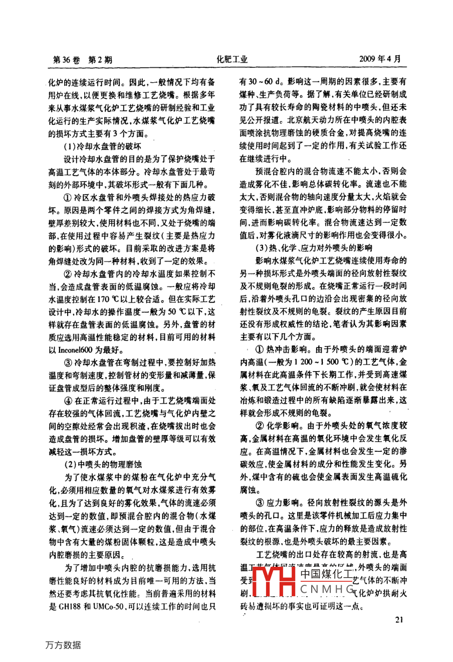第36卷第2期化肥工業(yè).2009年4月水煤漿氣化爐工藝燒嘴有關(guān)問題的探討劉孝弟,王岳,李兵科(北京航天動力研究所100076)摘要工藝燒嘴損壞是水堞漿氣化爐 不能長周期運行的主要原因。導(dǎo)致燒嘴損壞因素主要有冷卻水盤官損壞、物理磨蝕、熱沖擊、化學(xué)影響、應(yīng)力破壞等:提出了改進(jìn)措施以延長燒嘴的使用壽命,主要包括降低流速、改進(jìn)材質(zhì)、優(yōu)化結(jié)構(gòu)等,關(guān)鍵詞水煤漿氣化爐 燒嘴損壞措施Inquiry Into Problems Related To Process Burnerin Coal-Water Slurry GasifierLiu Xiaodi, Wang Yue, Li Bingke( Bejing Aerospace Propulsion Insitute 100076)Abstract Breakdown of the process bumer is the main cause for the coal-waler slumy gasifier tobe unable to run for a long period. The factors which lead to the breakdown are principally the break-down of the cooling water coil, physical abrasion, thermnal shock, and stress rupture. Improvementmeasures are proposed so a to prolong the service life of the bumer, including chiefly decrease inflowrate. , improvement in the material used, and optimization of the structure.Keywords coal-water slurry gasifier bumer breakdown measures1水煤漿加壓 氣化爐工藝燒嘴存在的問果。但中心氧的比例有一定的限制條件,一般為總氧量的5% ~25% (體積分?jǐn)?shù)) ,其余均作為外題氧。中心氧量不能太小,不然達(dá)不到對煤漿的稀1.1 工藝燒嘴設(shè)計的一般原則釋和加速作用。中心氧量太大,-方面會使預(yù)混(1)結(jié)構(gòu)形式為同心三套管形式。燒嘴中心合區(qū)的混合物流速增加太多,造成中心管出口處氧管的出口設(shè)計成縮口形式,目的是對中心氧進(jìn)的磨損加快,降低燒嘴的連續(xù)使用壽命,這一點正行加速,同時其端面距燒嘴斷面基準(zhǔn)面有一定的是影響燒嘴使用壽命的最主要因素;另一方面使縮入量,形成一個水煤漿與中心氧的預(yù)混合腔。燒嘴出口物料的軸向速度分量增大.徑向速度分水煤漿的出口管路也設(shè)計成縮口形式,使進(jìn)人預(yù)量減小,其結(jié)果使整個燒嘴出口的火焰形狀變得混合腔的水煤漿具備一定的速度。在預(yù)混合腔細(xì)長,無法與氣化爐的內(nèi)部型面匹配,造成較大直內(nèi),利用中心氧對水煤漿進(jìn)行稀釋和初加速.改善徑的煤粉顆粒在氣化爐內(nèi)的停留時間縮短.爐渣水煤漿的流變性能,共同的作用就是為了提高水中的含碳量增加,引起氣化效率降低,而且會使火煤漿在離開燒嘴后的霧化效果。外氧管口的縮口焰直沖爐底,影響爐底激冷環(huán)的工作。比例更大些,目的是提供更高流速的氧氣,使通過(3)中心氧的出口流速150~ 180 m/s,煤漿預(yù)混腔的水煤漿混合物得以良好霧化.以便在氣.出口流速2 ~4 m/s,預(yù)混合腔出口平均流速12 ~化爐內(nèi)獲得良好的氣化效果。20 r中國煤化工m/sc(2)無論是中心氧還是水煤漿及外氧的流通1.2CH.CNMHC素,面積,均需要滿足各自介質(zhì)的流量要求.在供應(yīng)壓水煤漿加比氣化技術(shù)的-大弱點就是其工藝力允許的情況下,力爭達(dá)到必要的混合和霧化效燒嘴的一次性連續(xù)使用壽命較短.影響了單臺氣20第36卷第2期化肥工業(yè)2009年4月.. 化爐的連續(xù)運行時間。因此,一般情況下均有備有30~60 d。影響這一周期的因素很多,主要有用爐在線,以便更換和維修工藝燒嘴。根據(jù)多年煤種、生產(chǎn)負(fù)荷等。據(jù)了解,有關(guān)單位已經(jīng)研制成來從事水煤漿氣化爐工藝燒嘴的研制經(jīng)驗和工業(yè)功了具有較長壽命的陶瓷材料的中噴頭,但還未化運行的生產(chǎn)實際情況,水煤漿氣化爐工藝燒嘴見公開報道。北京航天動力所在中噴頭的內(nèi)腔表的損壞方式主要有3個方面。面噴涂抗物理磨蝕的硬質(zhì)合金,對提高燒嘴的連(1)冷卻水盤管的破壞續(xù)使用時間起到了一定的作用,有關(guān)試驗工作還設(shè)計冷卻水盤管的目的是為了保護(hù)燒嘴處于在繼續(xù)進(jìn)行中。高溫工藝氣體的本體部分。冷卻水盤管處于最苛預(yù)混合腔內(nèi)的混合物流速不能太小。否則會刻的外部環(huán)境中,其破壞形式- -般有下面幾種。造成霧化不佳,影響總體碳轉(zhuǎn)化率。流速也不能①冷區(qū)水盤管和外噴頭焊接處的熱應(yīng)力破太大,否則混合物的軸向速度分量太大,火焰就會壞。原因是兩個零件之間的焊接方式為角焊縫,變得細(xì)長,甚至直沖爐底,影響部分物料的停留時壁厚差別較大,使用材料也不同,又處于燒嘴的端間,進(jìn)而影響碳轉(zhuǎn)化率?;旌衔锪魉龠_(dá)到一定數(shù)部,在使用過程中容易產(chǎn)生裂紋(主要是熱應(yīng)力值后,對霧化液滴尺寸的影響作用也會變得很小。的影響)形式的破壞。目前采取的改進(jìn)方案是將(3)熱、化學(xué)應(yīng)力對外噴頭的影響角焊縫處改為同- -種材料收到了一定的效果。影響水煤漿氣化爐工藝燒嘴連續(xù)使用壽命的②冷卻水盤管內(nèi)的冷卻水溫度如果控制不另一種損壞形式是外噴頭端面的徑向放射性裂紋當(dāng),會造成盤管表面的低溫腐蝕。-般應(yīng)將冷卻及不規(guī)則龜裂的形成。在燒嘴正常運行一段時間水溫度控制在170心以上較合適。但在實際工藝后,沿著外噴頭孔口的邊沿會出現(xiàn)密集的徑向放設(shè)計中,冷卻水的操作溫度一般為50 C以下,這射性裂紋及不規(guī)則的龜裂。裂紋的產(chǎn)生原因目前樣就存在盤管表面的低溫腐蝕。另外,盤管的