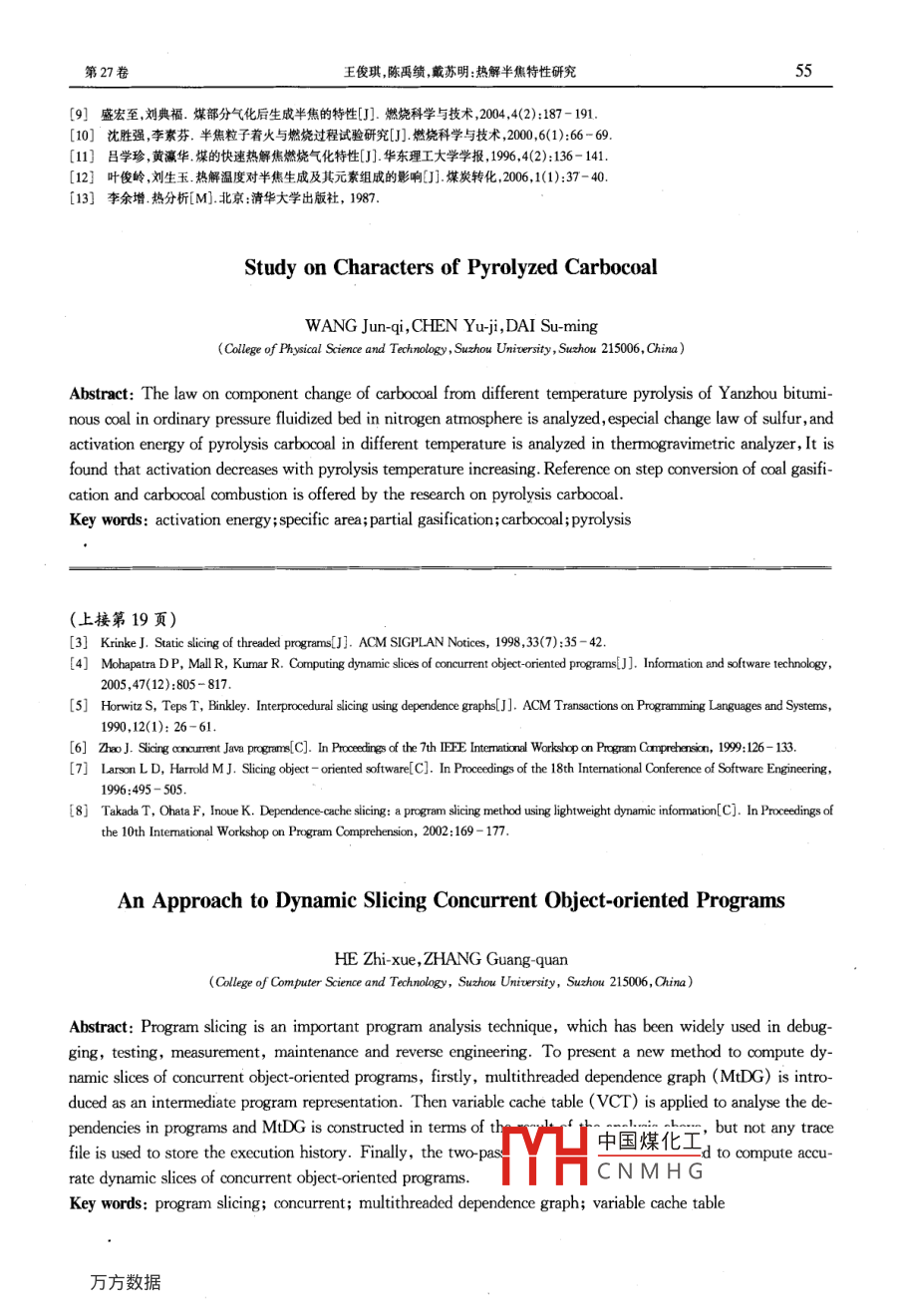 第27卷第3期蘇州大學學報(工科版Vol 27 No. 3200年6月JOURNAL OF SUZHOU UNIVERSITY ENGINEERING SCIENCE EDITIoN文章編號:1673-047X2007)03-0052-04熱解半焦特性研究王俊琪,陳禹績,戴蘇明(蘇州大學物理科學與技術學院,江蘇蘇州215006摘要:利用兗州煙煤在不同溫度下常壓流化床氮氣氣氛的熱解半焦作為樣品,分析了半焦成分變化的規(guī)律,特別是硫的變化規(guī)律,并利用熱重分析儀分析了不同溫度下熱解半焦的活化能,研究表明隨著熱解溫度的升高,活化能逐漸降低。熱解半焦的研究為煤氣化及半焦燃燒的分級轉(zhuǎn)化技術提供了參考。關鍵詞:活化能;比表面積;部分氣化;半焦;熱解中圖分類號:TK16文獻標識碼:A0引言我國的能源結(jié)構(gòu)以煤為主煤所占的比例大致為70%1-2),而煤作為一種含有多種雜質(zhì)的有機混合礦物,其不同的組分在化學反應性上差別很大煤中的低活性組分的反應特性決定了氣化過程必須采用高溫、高壓和長停留時間。將煤氣化過程近似用化學反應控制的縮核模型計算的全部氣化所需的停留時間將是氣化碳轉(zhuǎn)化率達到90%所需時間的兩倍3。若根據(jù)煤的不同組分和不同反應階段反應性不同的特點實施煤熱解、氣化燃燒分級轉(zhuǎn)化,則可使煤氣化技術48簡化,成本降低并可以解決煤中污染物的脫除問題。半焦作為煤部分熱解氣化后的產(chǎn)物,與原煤在組分上以及動力學特性上有很大的區(qū)別盛宏至等9研究了煤部分氣化后生成半焦的特性,并在管式沉降爐中進行了半焦燃燒試驗,計算了不同半焦的動力學參數(shù);沈勝強等10對半焦的著火與燃燒過程進行了深入的研究;呂學珍等利用快速熱解裝置研究了在氮氣氣氛和常壓條件下神府煤的熱解行為及熱解焦的燃燒氣化行為;葉俊嶺等12研究了熱解溫度對半焦生成及其元素組成的影響得出了半焦中HCOC與溫度的關系。本文以在不同溫度下流化床N2氣氛下獲得的半焦為樣品,分析了半焦組分隨溫度變化的規(guī)律,并利用熱重分析儀進行半焦燃燒試驗,求解半焦的活化能,為煤部分熱解氣化及半焦燃燒的分級轉(zhuǎn)換技術的應用提供了必要的參考。1試驗樣品與試驗裝置1.1試驗樣品試驗用煤為兗州煙煤,兗州煙煤的元素分析和工業(yè)分析見表1,原煤的粒徑為0.9~1.6mm和1.632mm。試驗所用半焦采用小型流化床的氮氣氣氛下的熱解半焦熱解溫度分別為824℃、788℃、712℃,半焦燃燒試驗在熱重分析儀上進行。中國煤化工CNMHG將局:份1922男)講,主要研究方向為媒燃燒熱解氣化多聯(lián)產(chǎn)技術第27卷俊琪,陳禹績戴蘇明:熱解半焦特性研究表1原煤的元素分析與工業(yè)分析工業(yè)分析元素分析煤樣Mad/% Aad/% Vad/% FCad/g Qb, ad(J/g)Cad/% Had%Nad/% St, ad/%Oad/%兗州煙煤1.7625092858441572437561063941.160446.551.2試驗裝置熱重試驗在TGA③SDTA851型熱天平上進行,自動取樣按照系統(tǒng)設定的升溫程序自動進行試驗。半焦用量約5mg,反應氣體為空氣,流量為40ml/min,升溫速率為50℃/mino2結(jié)果與分析21半焦工業(yè)分析在不同溫度下制得的半焦,其工業(yè)分析見數(shù)據(jù)表2。表2在不同溫度下制得的半焦工業(yè)分析數(shù)據(jù)項目VadFCad原煤粒徑單位%824℃半焦63.171.6~3.2mm788℃半焦2.79712℃半焦2.58284.6780℃半焦2.815469.160.6~1.6mm716℃半焦2.7324.716795}1--1---4--運行贏度(℃)瀑度(℃(a)不同半焦的水分(b)不同半焦的灰分運行福度(℃(c)不同半焦的揮發(fā)份(d)不同半焦的固定碳圖1半焦各組分隨溫度中國煤化工從圖1可見,兗州煤制備的熱解半焦隨著熱解溫度的HCNMHG,灰的百分含量迅速增加,揮發(fā)份的含量迅速下降,固定碳含量迅速降低。隨著熱解溫度的提高,由于水分和揮發(fā)份的進一步析出,半焦的灰分的百分含量增加揮發(fā)份含量急劇下降。同時由于試驗中采用的是普通氮氣,純度為98%蘇州大學學報(工科版)第3期高溫下導致部分碳發(fā)生了反應。而兗州煤為高揮發(fā)份和高灰分煤,揮發(fā)份和灰分占據(jù)很大的比例,這使得熱解后半焦的固定碳含量呈下降趨勢。2.2半焦硫元素分析由圖2可見,與原煤相比,半焦中硫的百分含量變化不雯是很大不同溫度下制得的半焦中的含硫量也相差不大博著熱解溫度的增加半焦中硫的含量略有下降,這主要是因如03F…÷.;+-1-為熱解過程中硫的析出過程比較穩(wěn)定,溫度對硫析出的過程d·影響不大。2.3半焦燃燒試驗半焦的動力學特性對半焦的燃燒過程有著重要的影響為了能夠較好地反應樣品的失重特性,半焦的熱重分析研究60780800820運行溫度主要針對失重最為劇烈的階段,對該階段的分析計算可構(gòu)建燃燒的表觀反應動力學模型和求解主要的反應動力學參數(shù)。圖2運行溫度和半焦硫的含量關系本文采用 Freeman-Carroll t微分方法13),通過對溫度微分的近似推導得到微分型方程:E△(△lg(1-a)4.575L△g(1△()可得表3熱解半焦動力學常數(shù)兗州煤一條直線,其斜率為-E/4.575,而截動力學參數(shù)824℃半焦788℃半焦712℃半焦距為反應級數(shù)n。熱解階段求解的動E/(k/mol)177.487168.965力學參數(shù)n和E見表3。3.37372.71381.8945另外,隨著反應溫度的增加,半焦相關系數(shù)0.98980.95330.9919燃燒的活化能逐漸升高,反應級數(shù)增加,這是因為隨著反應溫度的升高,揮發(fā)份進一步析出,而灰分增加,半焦的反應活性進一步變差,使得活化能升高,反應難度加大,反應級數(shù)增加3結(jié)論(1)通過對半焦樣品的