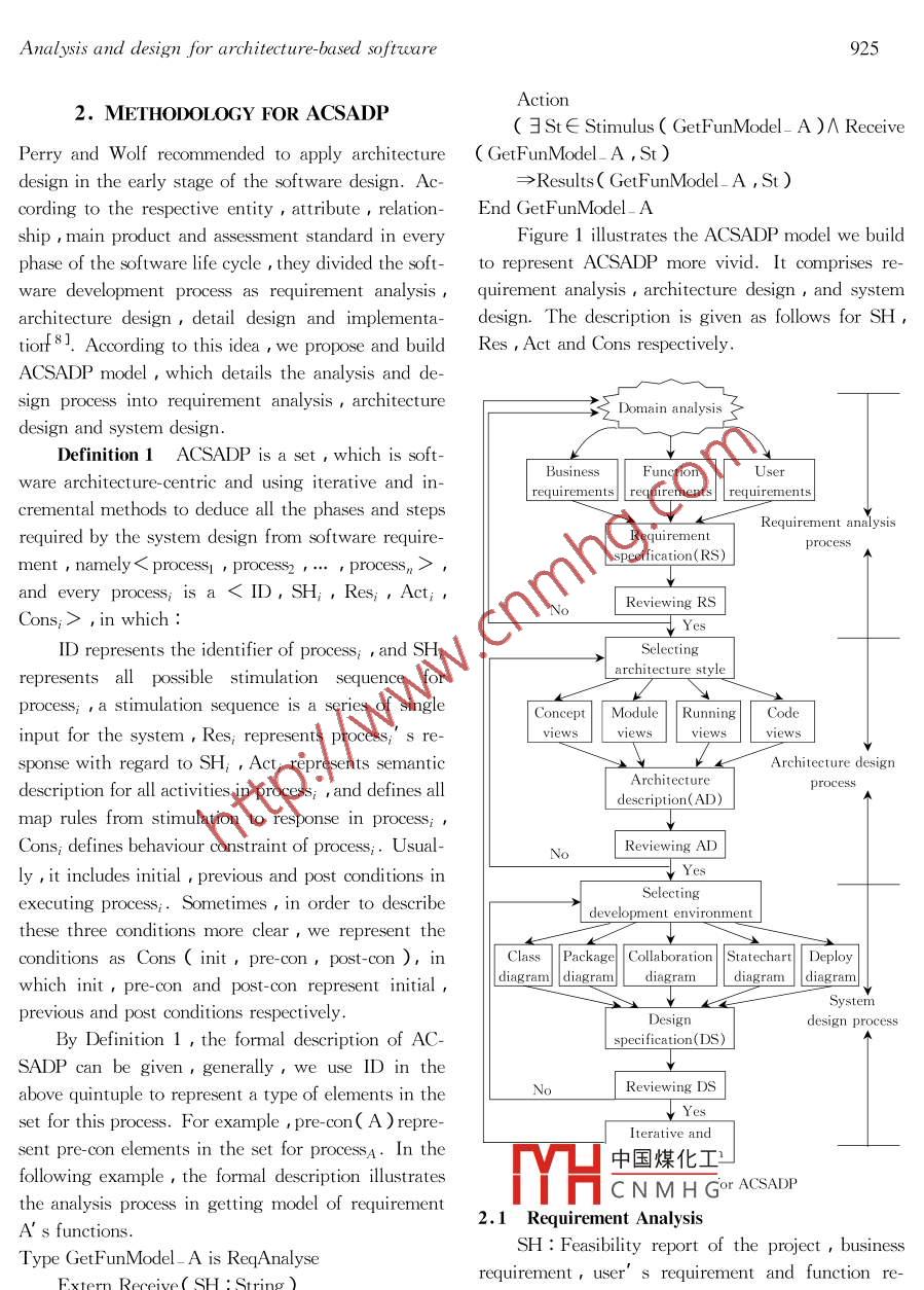 Journal of Systems Engineering and Electronics , Vol. 16 ,No.4 ,2005 ,pp. 924 ~ 930Analysis and design for architecture-based softwareJia Xiaolin ,He Jian , Qin Zheng & Wang XianghuaSchool of Electronics and Information ,Xi' an Jiaotong Univ. ,Xi' an 710049 ,P. R. China( Received July 25 ,2004 )Abstract :The technologies of software architecture are introduced , and the software analysis and-design process is divid-ed into requirement analysis , software architecture design and system design. Using these technologies , a model of archi-tecture- centric software analysis and design proces( ACSADP )is proposed. Meanwhile ,with regard to the completeness,consistency and correctness between the software requirements and design results , the theories of function and processcontrol are applied to ACSADP. Finally ,a model of integrated development environment( IDE) for ACSADP is pro-posed. It can be demonstrated by the practice that the model of AC SADP can aid developer to manage software processeffectively and improve the quality of software analysis and design.Key words : software process,software architecture , design space , traceability.1. INTRODUCTIONstructure and requirement to implementation smooth-ly1]Software engineering industry has proposed a series ofBefore the software architecture design ,wetheories , methods and tools to solve some problems inshould solve the problems how to define , describe andthe software development process , since the conceptrepresent software architecture ,which were the re-of software engineering was created by NATO insearch targets in 1990' s. Since then ,the researchers1968. However , the problems of long developmenthave developed many special field oriented softwareperiod , high cost and low quality in the software de-architecture description language ( ADL), such asvelopment still exist due to the inherent complexityWright-2] , Darwirf2] , XYZ/ADL3] ,and soon. Inand volatileness of the software. According to a greatdeal of statistics , 70% erroneousness is introduced2000,the computer association has approved theduring requirement and design phase in the large scaleIEEE 1471 standard , which defines the concept ofsoftware development. Moreover ,longer the erro-software architecture , this standard provides unifiedneousness exists in the system , more difficulty it canfile to describe software architecture practice correct-be found , and the cost for correcting the erroneous-1y41.With more and more mature in architecture tech-ness is higher.In order to improve the quality of software renologies,the problem how to integrate architecturequirement and design , software engineering industrytechnologies into software development process hashas brought out the concept of Software Requirementbecome the focus of current software architecture reEngineering and many technologies of modeling. Butsearch. D.J. P proposed architecture centric softwarethere still exists a gap between the requirement andproject management( ACSPM 351. Bass and Kazmandesign , namely , it lacks middle process that can rep-proposed the software development model based orresent the decision making and it is difficult to trans-architecture. These methods and models provideform requirement to correspondent design , therefore ,practitioner with references based on architecture.the concept of Software Architecture came into be-Hov中國煤化Ihe problemns how to in-ing. The researchers are trying to apply software ar-tegra:THCN M H Gion, software require-chitecture to the software development process ,tolenuumcilo allu uclall de:Jesign documents , andbridge the software requirement and design , they arehow to generate traceability of system requirementsolving the problems of transforming the system' swith regard to the architecture 71..as supported by the Shaanxi Provincial Science and Technology Development plan( 2000k08-G12 ).Analysis and design for architecture-based software925Action2. METHODOLOGY FOR ACSADP( 3 St∈Stimulus ( GetFunModel_ A )^ ReceivePerry and Wolf recommended to apply architecture( GetFunModel _A ,St )design in the early stage of the software design. Ac-→Results( GetFunModel A ,St )cording to the respective entity , attribute , relation-End GetFunModel _ Aship,main product and assessment standard in everyFigure 1 ilustrates the ACSADP model we buildphase of the software life cycle , they divided the soft-to represent ACSADP more vivid. It comprises reware development process as requirement analysis ,quirement analysis ,architecture design,and systemarchitecture design , detail design and implementa-design. The description is given as follows for SH ,tiort 81. According to this idea , we propose and buildRes , Act and Cons respectively.ACSADP model , which details the analysis and de-sign process into requirement analysis ,architecture立Domain analysisdesign and system design.Definition 1 ACSADP is a set , which is soft-BusinessFunctionUserware architecture-centric and using iterative and in-[ requirements requirements requirementscremental methods to deduce all the phases and steps↓r二Requirement analysisrequired by the system design from software require-Requirementprocessspecification( RS)↑ment , namely < process| , process2 ... , processn> ,↓and every process; is a < ID, SH; , Res;,Act; ,NoReviewing RSCons;> ,in which :YesID represents the identifier of process; ,and SH;Selectingarchitecture stylerepresents all possible stimulation sequence forprocess; ,a stimulation sequence is a series of single| ConceptModule|| RunningCodeinput for the system , Res; represents process;' s re-viewssponse with regard to SH; , Act; represents semanticArchitecture designdescription for all activities in process; , and defines allArchitecturedescription(AD)map rules from stimulation to response in process; ,Cons; defines behaviour constraint of process. Usual-Reviewing ADly ,it includes initial , previous and post conditions in↓YesSelecting :executing process;. Sometimes , i