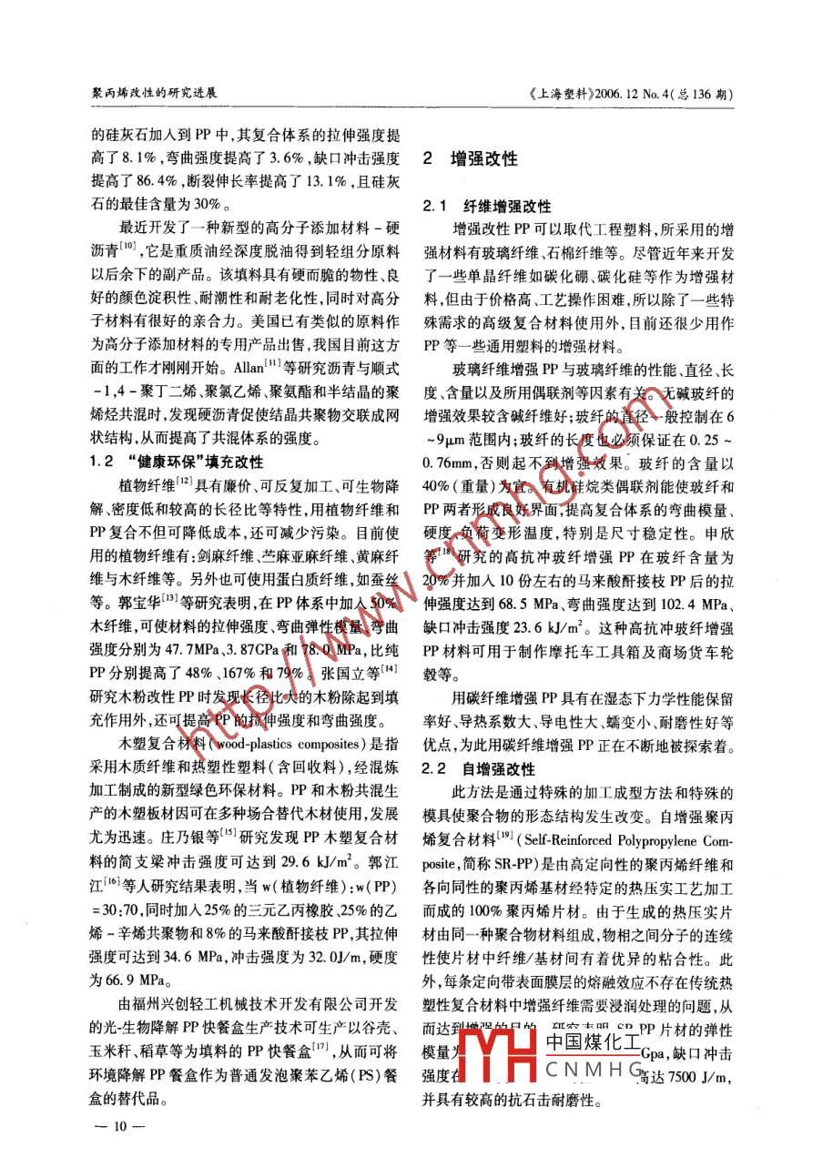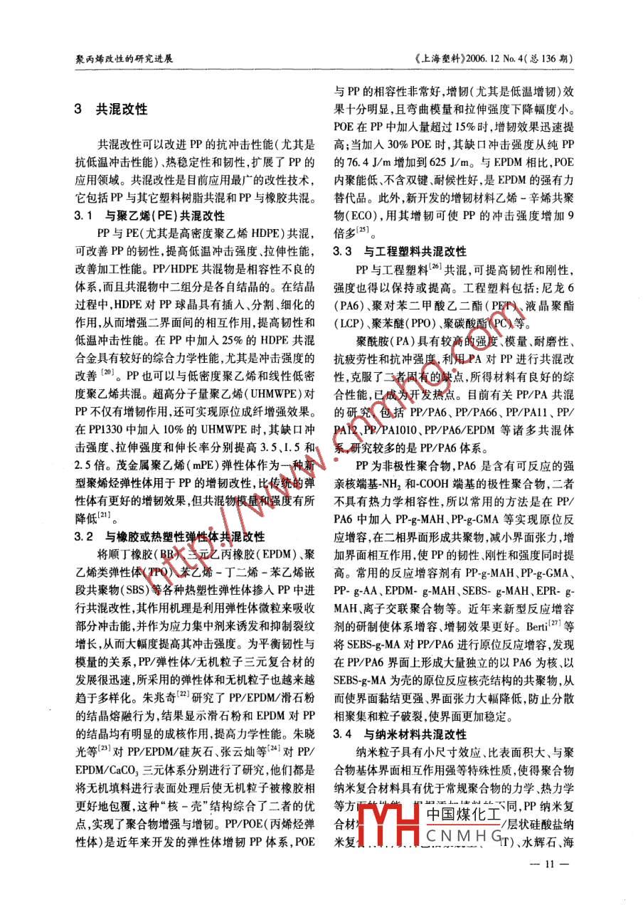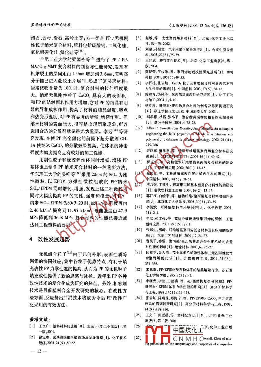 聚丙烯改性的研究進展《上海塑料》2006.12No.4(總136期)聚丙烯改性的研究進展殷錦捷,屈曉莉,王之濤,徐翠麗(遼寧工程大學阜新123000摘要:本文介紹了聚丙烯(PP)物理改性的各種方法(包括填充、共混、納來材料),綜逑了P各種物理改性的技術(shù)進展及對P共混體系性能的影響,最后簡介了PP改性技術(shù)的新進展。關(guān)鍵詞:聚丙烯;物理改性;納米材料;相容性中圖分類號:Q325.1文獻標識碼:A文章編號:100-599(004-00005PP中的分散性、填料和PP的界面作用等。前言1.1無機填充改性碳酸鈣(CaCO3)填充PP,可增加PP的剛度自1957年意大利 Montecatini公司實現(xiàn)PP工業(yè)化以來P已經(jīng)成為發(fā)展速度最快、產(chǎn)量最硬度、耐熱性、尺寸穩(wěn)定性,并降低成本和制品收縮率。適宜添加的CaCO3粒度為3μm左右,用量大、牌號最多用途最廣的合成樹脂品種之一。據(jù)般為30-40%。無機極性化合物CaCO4與非極性va2。其應(yīng)用領(lǐng)域也正向汽車、機械、運輸、工程PP之間缺乏親合性界面粘合性差,已有關(guān)于改善等領(lǐng)域擴展。近些年,增強PP已上升為汽車領(lǐng)PP與CaCO3界面粘合性的報道,如馬來酸酐或丙域應(yīng)用比例最大的合成樹脂品種如用彈性體改性烯酸酯接枝P以提高PP的極性或用乙烯-醋酸乙P目前在汽車保險杠中的應(yīng)用在歐洲已達到烯(EVA)作為表面涂層劑對GaCO3進行表面涂覆95%。但因PP低溫易脆斷、制品收縮率大,與其以降低CaCO3的極性。李懷棟等人研究表它極性聚合物和無機填料的相容性差,從而限制了明,用平均粒徑在10m在右烷氧焦磷酸酯型鈦酸P的應(yīng)用,所以必須對PP進行改性。P的改性酯等復合處理的caCO0增韌P,可使缺口沖擊強可采用物理改性如共混、填充、增強、加入添加劑而度提高至2.5~3倍,彎曲模量提高至12-14倍賦予P新的性能而且物理改性的工藝簡單、經(jīng)濟并在較少的彈性體用量條件下較大幅度地提高實用,有很好的發(fā)展前景已成為目前開發(fā)PP新品PP/彈性體共混材料的缺口沖擊強度同時保持較種的一個熱點。高的彎曲模量和熔體流動性?;厶畛銹P分為二類:一類是填充量為301填充改性~40%,提高熱變形溫度和彎曲模量;另一類是填充量為10~20%,可提高表面光潔度。采用活填充P的無機填料常用:碳酸鈣、滑石粉、云化滑石粉填充改性PP后大大提高了材料的剛性,母粉硅灰石等;常用的有機填料有:木粉稻殼粉、克服了制品的翹曲變形同時加入增韌劑及滑石玉米棒芯、花生殼粉等。為了得到性能優(yōu)良的填充粉,會使PP球晶變小,尺寸穩(wěn)定性好。PP,應(yīng)考慮以下幾點:填料種類、填料粒度、填料在天然硅灰石具有特殊的針狀結(jié)構(gòu),白色、無毒,在歐美占無機填料市場10-15%,可以作為石棉收稿日期:2006-07-7理想中國煤化工驛低了P的拉作者簡介殷錦捷(195-)女,遼寧人,教授。主要從事新型離高分伸強CNMHG敏感性。楊春子材料、有機化工等方面的研究工作。的粒徑為10聚丙烯改性的研究進展《上海塑料》2006.12Na.4(總136期)的硅灰石加人到PP中,其復合體系的拉伸強度提高了8.1%,彎曲強度提高了36%,缺口沖擊強度2增強改性提高了86.4%,斷裂伸長率提高了13.1%,且硅灰石的最佳含量為30%。2.1纖維增強改性最近開發(fā)了一種新型的高分子添加材料-硬增強改性PP可以取代工程塑料,所采用的增瀝青,它是重質(zhì)油經(jīng)深度脫油得到輕組分原料強材料有玻璃纖維、石棉纖維等。盡管近年來開發(fā)以后余下的副產(chǎn)品。該填料具有硬而脆的物性、良了一些單晶纖維如碳化硼、碳化硅等作為增強材好的顏色淀積性、耐潮性和耐老化性,同時對高分料,但由于價格高、工藝操作困難,所以除了一些特子材料有很好的親合力。美國已有類似的原料作殊需求的高級復合材料使用外,目前還很少用作為高分子添加材料的專用產(chǎn)品出售我國目前這方PP等一些通用塑料的增強材料。面的工作才剛剛開始。Alan等研究瀝青與順式玻璃纖維增強P與玻璃纖維的性能直徑長-1,4-聚丁二烯、聚氯乙烯、聚氨酯和半結(jié)晶的聚度、含量以及所用偶聯(lián)劑等因素有關(guān)。無堿玻纖的烯烴共混時,發(fā)現(xiàn)硬瀝青促使結(jié)晶共聚物交聯(lián)成網(wǎng)增強效果較含堿纖維好;玻纖的直徑一般控制在6狀結(jié)構(gòu),從而提高了共混體系的強度。~9μm范圍內(nèi);玻纖的長度也必須保證在0.251.2“健康環(huán)保”填充改性0.76mm,否則起不到增強效果。玻纖的含量以植物纖維2具有廉價、可反復加工、可生物降40%(重量)為宜。有機硅烷類偶聯(lián)劑能使玻纖和解、密度低和較高的長徑比等特性,用植物纖維和PP兩者形成良好界面,提高復合體系的彎曲模量PP復合不但可降低成本,還可減少污染。目前使硬度、負荷變形溫度,特別是尺寸穩(wěn)定性。申欣用的植物纖維有:劍麻纖維、苧麻亞麻纖維、黃麻纖等}研究的高抗沖玻纖增強PP在玻纖含量為維與木纖維等。另外也可使用蛋白質(zhì)纖維,如蠶絲20%并加入10份左右的馬來酸酐接枝PP后的拉等。郭寶華等研究表明在PP體系中加入50%伸強度達到685MPa、彎曲強度達到102.4MPa木纖維,可使材料的拉伸強度、彎曲彈性模量、彎曲缺口沖擊強度23.6kJ/m2。這種高抗沖玻纖增強強度分別為47.7MPa387GPa和78.0MPa,比純PP材料可用于制作摩托車工具箱及商場貨車輪PP分別提高了48%、167%和79%。張國立等轂等。研究木粉