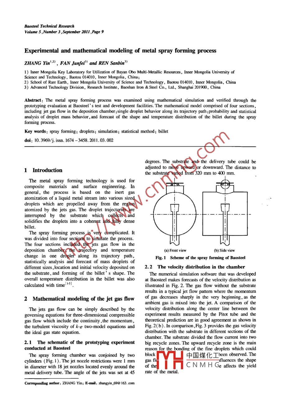 Baosteel Technical ResearchVolume 5 ,Number 3,September 2011 ,Page 9Experimental and mathematical modeling of metal spray forming processZHANG Yin':2) , FAN Junfei") and REN Sanbin?)1) Inner Mongolia Key Laboratory for Uilization of Bayan Obo Multi-Metallic Resources , Inner Mongolia University ofScience and Technology, Baotou 014010, Inner Mongolia, China;2) School of Rare Earth, Inner Mongolia University of Science and Technology, Baotou 014010, Inner Mongolia, China3) Advanced Technology Division, Research Instiute, Baoshan lron & Steel Co, Ltd, Shanghai 201900, ChinaAbstract: The metal spray forming process was examined using mathematical simulation and verified through theprototyping evaluation at Baosteel ' s test and development facilities. The mathematical model comprised of four sections ,including jet gas flow in the deposition chamber ;single droplet behavior along its trajectory path ;probability and statisticalanalysis of droplet mass behavior , and forecast of the shape and temperature distribution of the billet during the sprayforming process.Key words: spray forming; droplets; simulation; statistical method; billetdoi: 10. 3969/j. issn. 1674 - 3458.2011.03.002degrees. The substrate and the delivery tube could beadjusted to move upward or downward. The distance to1 Introductionthe substrate varied from 320 mm to 400 mm.The metal spray forming technology is used forcomposite materials and surface engineering. Itgeneral, the process is based on the inert gasatomization of a liquid metal stream into various sizeddroplets which are propelled away from the regionatomized by the jets gas. The droplet trajectories areinterrupted by the substrate which collects andsolidifies the droplets into a coherent and fully densebillet.The spray forming process is very complicated. Itwas divided into four sections to simulate the process.四The four sections included the jets gas flow in thedeposition chamber, the trajectory and temperature(a) Front view(b) Side viewchange in one droplet along its trajectory path,Fig. 1 Scheme of the spray forming of Baosteelstatistically analysis and forecast of mass droplets ofdifferent sizes ,location and initial velocity deposited on2.2 The velocity distribution in the chamberthe substrate, and forming of the billet' s shape. TheThe numerical simulation software that was developedoverall temperature distribution in the billet was alsoat Baosteel makes forecasts of the velocity distribution ascalculated with time1s5.illustrated in Fig. 2. The gas flow without the substrateresults in a typical jet flow pattem where the momentum2 Mathematical modeling of the jet gas flowof gas decreases sharply in the very beginning, as theambient gas is mixed into the jet. A comparison of theThe jets gas flow can be simply described by thevelocity distribution along the center line between thegoverming equations for three-dimensional compressibleexperiment results measured by the Pitot tube and thegas flow which include the continuity , the momentum,theoretical prediction are in good agreement as shown inthe turbulent viscosity of k-E two-model equations andFig. 2( b). In comparison,Fig. 3 provides the gas velocitythe ideal gas state equation.distribution with the substrate in different sections of thechamber. The substrate divided the flow current into two2.1 The schematic of the prototyping experimentbig recycle zones. The upward recycle zone is the mainconducted at Baosteelreason for the bonding of the fine droplets which couldThe spray forming chamber was conjoined by twoblock中國煤化工been observed. Thecylinders (Fig. 1). The jet nozzle restrictions were I mmgas flfrfluences the shapein diameter with 18 jet nozzles located evenly around theof theHCNMHGeafetstheyieldmetal delivery tube. The angle of the jets was set at 45rate of the metal. .Corresponding author: ZHANG Yin; E mail: zhangyin, 69@ 163. com10Baosteel Technical Research, Vol. 5, No.3, Sep. 2011Y(3)=0.10210 m/sSimulation resultl250-1- Experimental resultE200: 15100500.0.60.8(a) Velocity distribution in the chamber(b) Comparison of the detected andwith no deposition systemcalculated velocity in the axisFig.2 Velocity distribution in the 5 kg spray forming equipmentThe size distribution was determined by the Rozin-3 The trajectory and temperature change inRammler empirical equation.one droplet(2) The trajectory of the droplets was determined byeither the gravity force or the drag force only.3.1 Modeling assumptions(3) The temperature distribution in radius was(1) The droplet formed by the jets was a spheroid.neglected.事二t lE中國煤化工FYHCNMHG1---一一「ZHANG Yin, et al. Experimental and mathematical modeling of metal spray forming process11學(xué)Fig.3 Gas velocity distribution in difTerent planes3.2 Mathematical modelwhere ur。 and σ, are the expected value and the(1) Size distribution:variance of radius velocity distribution ,respectively.Circumferential even distribution:(1)u。=0R(d) = 0(/門]where R (dk) stands for the percentage of particles(4) Droplets move along the z direction:dwdnwith radius larger than dh occupying the whole particle'dr2“drgroup. Here n and d' are the experimental constants.(2) Position distribution function: .gpwQu c:C.(w)(6)Assume the liquid droplets are created in the samehorizontal plane.where Au= /(u-u) +(v-v])*+(w-w.)rAxis direction:(5) Temperature change and solidifcation model inz =Zoa droplet with the lumped heat capacity method:where z is the height of the created liquid droplets.d7Radial direction:pC"Vk =a(Tg -T)A. +F(r) = λe~"(2)where λ is the parameter describing the congregatingσse(ζ -T)A +pH,°πV. (7)degree of the created liquid droplets.Circumferential direction:where V="&,A =d,a= NF(0) =-(3)N。=2.0+0.6R時,二=一+-1(3) Initial velocity distribution:Solidification rate f;:F(u2) =一exp -(u-un)2(4)p0T>T2o;f, ={f(T) Ts≤T≤π (8)where un and σ: are the expected value and theT
