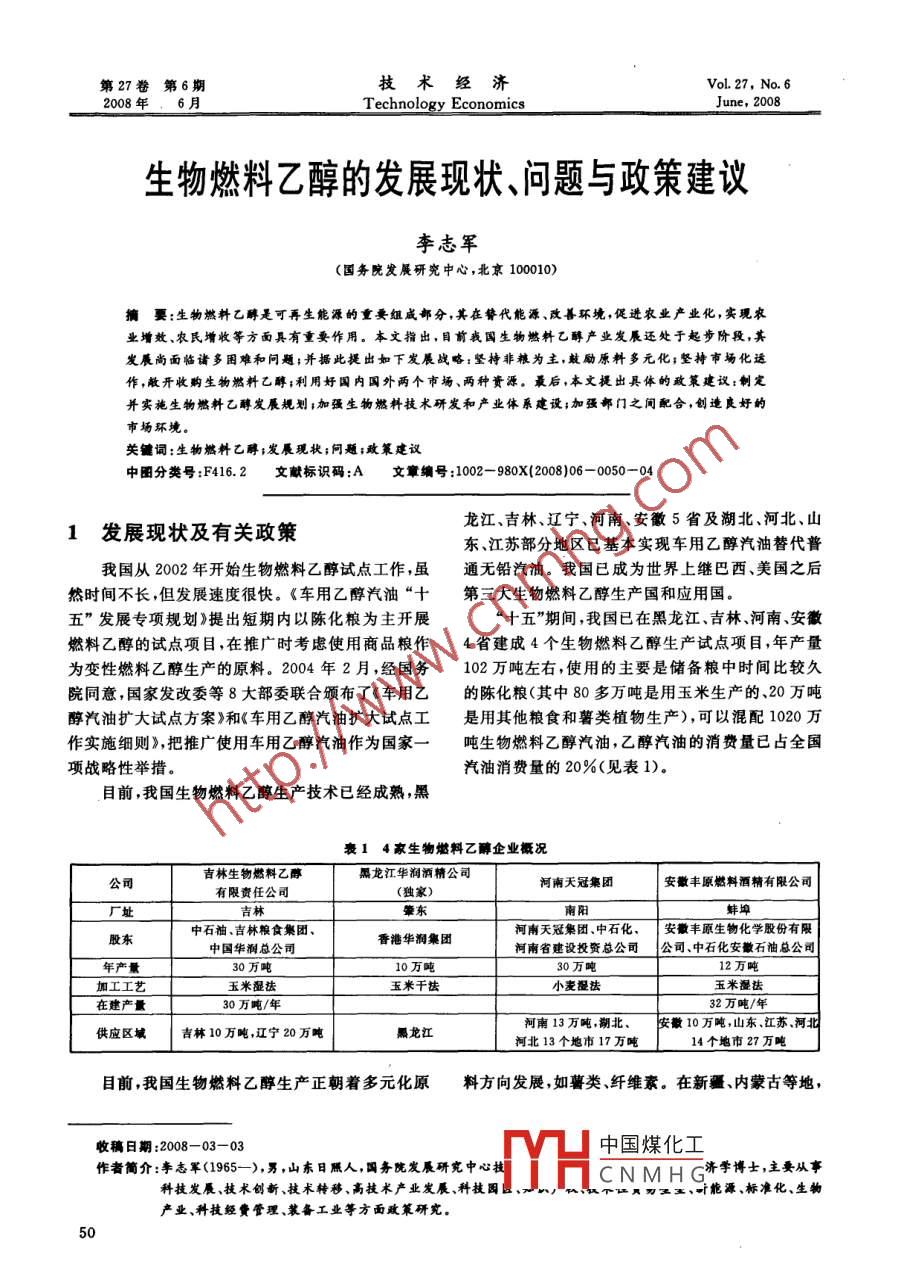 第27卷第6期技術(shù)經(jīng)濟(jì)Vol 27. No. 62008年6月Technology EconomicsJune, 2008生物燃料乙醇的發(fā)展現(xiàn)狀、問題與政策建議李志軍(國務(wù)院發(fā)展研究中心,北京100010)犢要:生物燃料乙畔是可再生能源的重要組成部分,其在簪代能源、改善環(huán)境,促進(jìn)農(nóng)業(yè)產(chǎn)業(yè)化,實(shí)現(xiàn)農(nóng)業(yè)增效、農(nóng)民增收等方面具有重要作用。本文指出,目前我國生物燃料乙醇產(chǎn)業(yè)發(fā)展還處于起步階段,其發(fā)展尚面臨諸多困難和問題;并據(jù)此提出如下發(fā)展戰(zhàn)略:堅(jiān)持非糧為主,鼓勵(lì)原料多元化;堅(jiān)神市場(chǎng)化運(yùn)作,敞開收購生物燃料乙醇;利用好國內(nèi)國外兩個(gè)市場(chǎng)、兩種資源。最后,本文提出具體的政策建議:制定并實(shí)施生物燃料乙醇發(fā)展規(guī)劃;加強(qiáng)生物燃料技術(shù)研發(fā)和產(chǎn)業(yè)體系建設(shè);加強(qiáng)部門之間配合,創(chuàng)造良好的市場(chǎng)環(huán)境關(guān)锽詞:生物燃料乙醇;發(fā)展現(xiàn)狀;問題;政策建議中圖分類號(hào):F416.2文獻(xiàn)標(biāo)識(shí)碼:A文章編號(hào):1002-980X(2008)06-0050-041發(fā)展現(xiàn)狀及有關(guān)政策龍江、吉林、遼寧、河南、安徽5省及湖北、河北、山東、江蘇部分地區(qū)已基本實(shí)現(xiàn)車用乙醇汽油替代普我國從2002年開始生物燃料乙醇試點(diǎn)工作,雖通無鉛汽油。我國已成為世界上繼巴西、美國之后然時(shí)間不長(zhǎng),但發(fā)展速度很快。《車用乙醇汽油“十第三大生物燃料乙醇生產(chǎn)國和應(yīng)用國五”發(fā)展專項(xiàng)規(guī)劃》提出短期內(nèi)以陳化糧為主開展十五”期間,我國已在黑龍江、吉林河南、安徽燃料乙醇的試點(diǎn)項(xiàng)目,在推廣時(shí)考慮使用商品糧作4省建成4個(gè)生物燃料乙醇生產(chǎn)試點(diǎn)項(xiàng)目,年產(chǎn)量為變性燃料乙醇生產(chǎn)的原料。2004年2月,經(jīng)國務(wù)102萬噸左右,使用的主要是儲(chǔ)備糧中時(shí)間比較久院同意,國家發(fā)改委等8大部委聯(lián)合頒布了《車用乙的陳化糧(其中80多萬噸是用玉米生產(chǎn)的、20萬噸醇汽油擴(kuò)大試點(diǎn)方案》和《車用乙醇汽油擴(kuò)大試點(diǎn)工是用其他糧食和薯類植物生產(chǎn)),可以混配1020萬作實(shí)施細(xì)則》把推廣使用車用乙醇汽油作為國家一噸生物燃料乙醇汽油,乙醇汽油的消費(fèi)量已占全國項(xiàng)戰(zhàn)略性舉措。汽油消費(fèi)量的20%(見表1目前,我國生物燃料乙醇生產(chǎn)技術(shù)已經(jīng)成熟,黑衰14家生物燃料乙醇企業(yè)概況吉林生物燃料乙醇黑龍江華潤(rùn)酒精公司公司河南天冠集團(tuán)安徽豐原燃料酒精有限公司有限責(zé)任公司(獨(dú)家)廠址吉林南陽河南天冠集團(tuán)、中石化、安徽豐原生物化學(xué)股份有限股東中石油、吉林糧食集團(tuán)香港華集團(tuán)河南省建設(shè)投資總公司公司、中石化安徽石油總公司30萬噸10萬噸30萬噸12萬噸加工工去玉米濕法玉米干法小麥濕法玉米漫法30萬噸/年32萬噸黑龍江河南13萬噸,湖北教10萬噸,山東、江蘇、河供應(yīng)區(qū)域吉林10萬噸遼寧20萬噸河北13個(gè)地市17萬噸14個(gè)地市27萬噸目前,我國生物燃料乙醇生產(chǎn)正朝著多元化原料方向發(fā)展如薯類、纖維素。在新疆、內(nèi)蒙古等地,收稿日期:2008-03-03H中國煤化工作者簡(jiǎn)介:李志軍(1965-),男,山東日膩人,國務(wù)院發(fā)展研究中心技CNMHG清博土,主要從事科技發(fā)展、技術(shù)創(chuàng)新、技術(shù)糟移、高技術(shù)產(chǎn)業(yè)發(fā)展、科技園、J,八個(gè)證離莖盞、可能源、標(biāo)準(zhǔn)化、生物產(chǎn)業(yè)、科技經(jīng)費(fèi)管理、裝備工業(yè)等方面政策研究。李志軍生物燃料乙醇的發(fā)展現(xiàn)狀問題與政策建議我國自行培育的具高抗逆性和可以在全國種植的甜用添加10%酒精的乙醇汽油。高粱,每公頃能產(chǎn)生物燃料乙醇6噸,比甘蔗高2)成本補(bǔ)貼。隨著我國生物燃料乙醇企業(yè)產(chǎn)30%比玉米高3倍。我國積極應(yīng)用轉(zhuǎn)基因技術(shù)選量的逐年上升,起初要消化的陳化糧已基本用完育和開發(fā)能源作物原料,已開發(fā)出利用甜高梁莖稈2001年,國內(nèi)生產(chǎn)乙醇原料中玉米原料占總量的比汁液等生物質(zhì)制取乙醇的技術(shù)工藝,已建設(shè)年產(chǎn)重為59%到2005年已經(jīng)上升到76%。玉米用量5000噸乙醇的甜高梁莖稈制取生物燃料乙醇工業(yè)在生物燃料乙醇生產(chǎn)中大幅度上升導(dǎo)致玉米價(jià)格持示范工程;纖維素廢棄物制取乙醇燃料技術(shù)已進(jìn)入續(xù)上漲。由于目前生物燃料乙醇的生產(chǎn)成本過高年產(chǎn)600噸規(guī)模的中試階段。此外,我國還開展了幾乎所有的生物燃料乙醇企業(yè)都處于虧損狀態(tài),國研究生物質(zhì)原料的高壓蒸汽爆破預(yù)處理技術(shù)、纖維家定點(diǎn)生產(chǎn)的幾家企業(yè)之所以能維持,是國家出臺(tái)素酶制備技術(shù)、大規(guī)模酶降解技術(shù)、戊糖己糖同步乙了補(bǔ)貼扶持政策。按目前的加工成本和生物燃料乙醇發(fā)酵技術(shù)微生物細(xì)胞固定化技術(shù)在線雜菌防治醇的價(jià)格來計(jì)算,生產(chǎn)一噸生物燃料乙醇要虧損技術(shù)以及副產(chǎn)品木質(zhì)素的深度加工利用技術(s