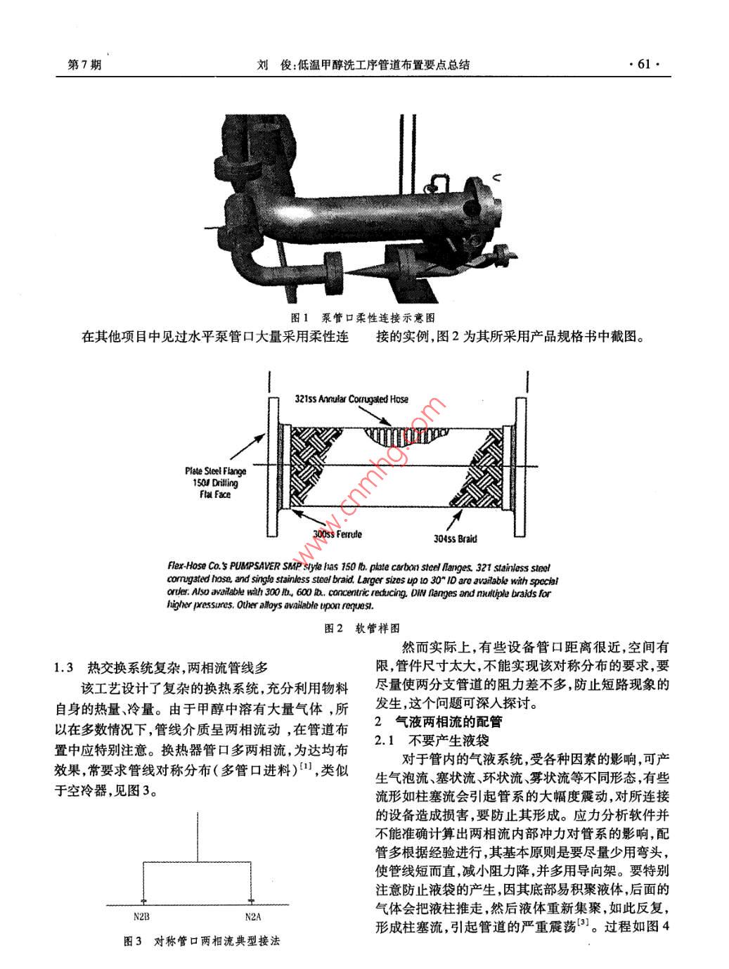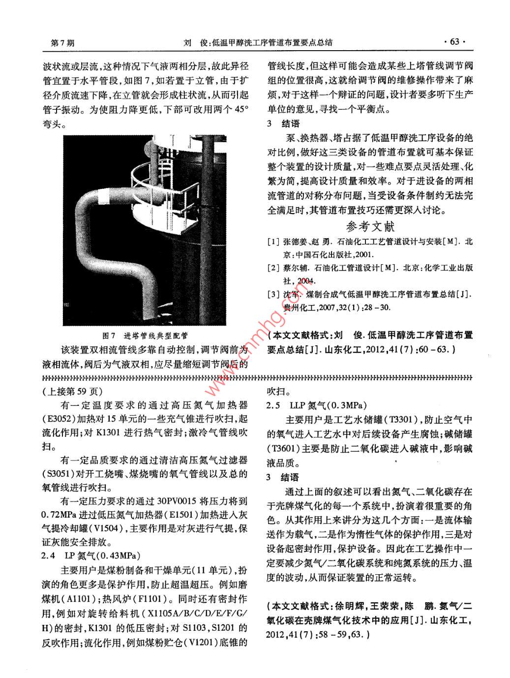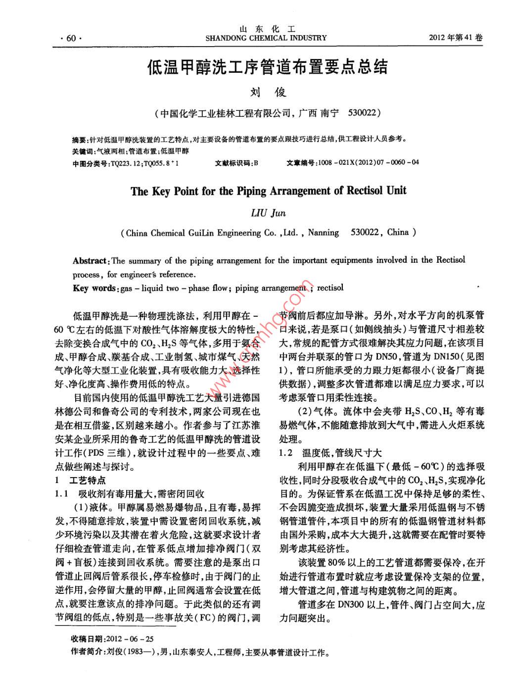 山東化工60SHANDONG CHEMICAL INDUSTRY2012年第41卷低溫甲醇洗工序管道布置要點總結(jié)劉俊(中國化學(xué)工業(yè)桂林工程有限公司,廣西南寧530022)摘要:針對低溫甲醇洗裝置的工藝特點,對主要設(shè)備的管道布置的要點跟技巧進行總結(jié)供工程設(shè)計人員參考。關(guān)鍵詞:氣液兩相;管道布置;低溫甲醇中圖分類號:TQ223.12;TQ055.8+1文獻標識碼:B文章編號:1008-021X(2012)07-000The Key Point for the Piping Arrangement of Rectisol UnitLIU JunChina Chemical GuiLin Engineering Co., Ltd., Nanning 530022, ChinaAbstract: The summary of the piping arrangement for the important equipments involved in the Rectisolprocess, for engineers referenceKey words: gas-liquid two-phase flow; piping arrangement rectisol低溫甲醇洗是一種物理洗滌法,利用甲醇在-節(jié)閥前后都應(yīng)加導(dǎo)淋。另外,對水平方向的機泵管60℃左右的低溫下對酸性氣體溶解度極大的特性,口來說,若是泵口(如側(cè)線抽頭)與管道尺寸相差較去除變換合成氣中的CO2、H2S等氣體,多用于氨合大,常規(guī)的配管方式很難解決其應(yīng)力問題,在該項目成、甲醇合成羰基合成、工業(yè)制氫、城市煤氣、天然中兩臺并聯(lián)泵的管口為DN50,管道為DN150(見圖氣凈化等大型工業(yè)化裝置,具有吸收能力大、選擇性1),管口所能承受的力跟力矩都很小(設(shè)備廠商提好凈化度高、操作費用低的特點。供數(shù)據(jù)),調(diào)整多次管道都難以滿足應(yīng)力要求,可以目前國內(nèi)使用的低溫甲醇洗工藝大量引進德國考慮泵管口用柔性連接。林德公司和魯奇公司的專利技術(shù),兩家公司現(xiàn)在也(2)氣體。流體中會夾帶H2S、CO、H2等有毒是在相互借鑒,區(qū)別越來越小。作者參與了江蘇淮易燃氣體,不能隨意排放到大氣中需進入火炬系統(tǒng)安某企業(yè)所采用的魯奇工藝的低溫甲醇洗的管道設(shè)處理。計工作(PDS三維),就設(shè)計過程中的一些要點、難1.2溫度低,管線尺寸大點做些闡述與探討。利用甲醇在在低溫下(最低-60℃)的選擇吸1工藝特點收性,同時分段吸收合成氣中的CO2、H2S,實現(xiàn)凈化11吸收劑有毒用量大,需密閉回收目的。為保證管系在低溫工況中保持足夠的柔性、(1)液體。甲醇屬易燃易爆物品,且有毒,易揮不會因脆變造成損壞,裝置大量采用低溫鋼與不銹發(fā),不得隨意排放,裝置中需設(shè)置密閉回收系統(tǒng),減鋼管道管件,本項目中的所有的低溫鋼管道材料都少環(huán)境污染以及其潛在著火危險,這就要求設(shè)計者由國外采購,成本大大提升,這就需要在配管時要特仔細檢査管道走向,在管系低點增加排凈閥門(雙別考慮其經(jīng)濟性。閥+盲板)連接到回收系統(tǒng)。需要注意的是泵出口該裝置80%以上的工藝管道都需要保冷,在開管道止回閥后管系很長,停車檢修時,由于閥門的止始進行管道布置時就應(yīng)考慮設(shè)置保冷支架的位置,逆作用,會停留大量的甲醇止回閥通常會設(shè)置在低增大管道之間,管道與構(gòu)建筑物之間的距離。點,就要注意該點的排凈問題。于此類似的還有調(diào)管道多在DN300以上,管件閥門占空間大,應(yīng)節(jié)閥組的低點特別是一些事故關(guān)(FC)的閥門,調(diào)力問題突出。收稿日期:2012-06-2作者簡介:劉俊(1983-),男,山東泰安人,工程師主要從事管道設(shè)計工作。第7期劉俊:低溫甲醇洗工序管道布置要點總結(jié)61圖1泵管口柔性連接示意圖在其他項目中見過水平泵管口大量采用柔性連接的實例,圖2為其所采用產(chǎn)品規(guī)格書中截圖。321ss Annular Corrugated HoseCQLIIIDMIDADPlate Sicel Flar300ss Ferle30455 BraidFlex-Hose Co s PUMPSAVER SMP styte has 150 Ah. plate carton steel Mlanges. 321 stainless steelre. Also awaitabe wah 300 b, 600 bD, concentric red cing, DIN flanges and nmpe brads ecorrugated hose, and single stainless steel braid, Larger sizos up to 30"iD are avaiable with spechigher pressures. Other alloys available upon request.2軟管樣圖然而實際上,有些設(shè)備管口距離很近,空間有1.3熱交換系統(tǒng)復(fù)雜,兩相流管線多限管件尺寸太大,不能實現(xiàn)該對稱分布的要求,要該工藝設(shè)計了復(fù)雜的換熱系統(tǒng),充分利用物料盡量使兩分支管道的阻力差不多防止短路現(xiàn)象的自身的熱量冷量。由于甲醇中溶有大量氣體,所發(fā)生,這個問題可深人探討。以在多數(shù)情況下,管線介質(zhì)呈兩相流動,在管道布2氣液兩相流的配管置中應(yīng)特別注意。換熱器管口多兩相流,為達均布2.1不要產(chǎn)生液袋效果,常要求管線對稱分布(多管口進料)(,類似對于管內(nèi)的氣液系統(tǒng),受各種因素的影響,可產(chǎn)生氣泡流塞狀流、環(huán)狀流、霧狀流等不同形態(tài),有些于空冷器,見圖3。流形如柱塞流會引起管系的大幅度震動,對所連接的設(shè)備造成損害,要防止其形成。應(yīng)力分析軟件并不能準確計算出兩相流內(nèi)部沖力對管系的影響,配管多根據(jù)經(jīng)驗進行,其基本原則是要盡量少用彎頭,使管線短而直,減小阻力降,并多用導(dǎo)向架。要特別注意防止液袋的產(chǎn)生,因其底部易積聚液體,后面的N2B氣體會把液柱推走,然后液體重新集聚,如此反復(fù),形成柱塞流,引起管道的嚴重震蕩。過程如圖4圖3對稱管口兩相流典型接法62SHANDONG CHEMICAL INDUSTRY2012年第41卷所示。塔的配管與確定管口方位緊密聯(lián)系在一起,兩者不能孤立開來,塔可分為操作側(cè)與配管區(q