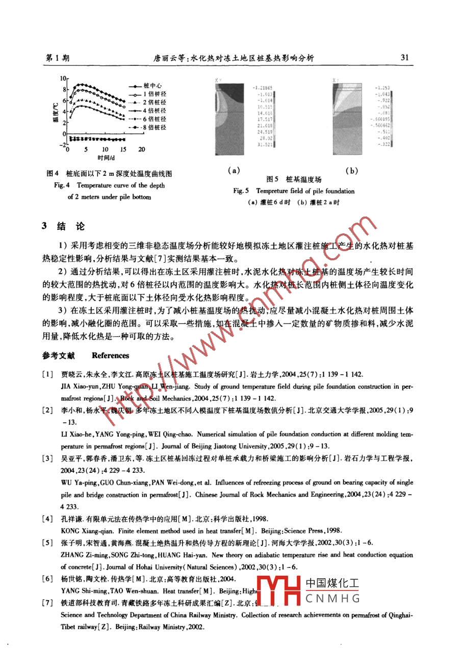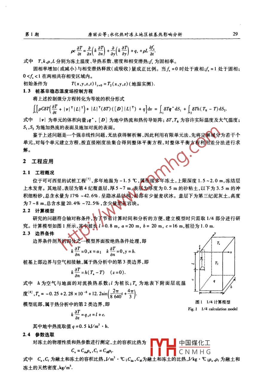 第31卷第1期西安科技大學(xué)學(xué)報(bào)Vol 31 No. 1201l年01月 JOURNAL OFⅪI'ANUNⅤ ERSITY OF SCIENCE AND TECHNOLOGYJun.2011文章編號(hào):1672-9315(2011)01-0028-05水化熱對(duì)凍土地區(qū)樁基熱影響分析唐麗云,楊更社,讓艷艷,王專兵西安科技大學(xué)建筑與土木工程學(xué)院陜西西安710054)摘要:針對(duì)凍土區(qū)灌注樁基礎(chǔ)施工會(huì)給凍土引進(jìn)一定的熱量,破壞凍土的穩(wěn)定凍結(jié)狀態(tài)問題,研究水化熱對(duì)樁基沿徑向溫度變化規(guī)律及影響樁周凍土溫度場的時(shí)間?;跇逗蛢鐾恋娜S非穩(wěn)態(tài)溫度場控制方程,并考慮邊界條件和凍融相變過程,建立了樁基非穩(wěn)態(tài)溫度場控制方程。對(duì)樁周溫度場的熱影響分析表明,澆筑混凝土后水化熱在第5d達(dá)到最大,水化熱對(duì)樁長范圍內(nèi)樁側(cè)土體徑向溫度變化的影響程度大于樁底面以下土體徑向受水化熱影響程度,水化熱對(duì)樁周圍土體有較大的影響而且時(shí)間長。得出的一些結(jié)論可為凍土區(qū)樁基設(shè)計(jì)施工提供參考關(guān)鍵詞:水化熱;凍土地區(qū);灌注樁;非穩(wěn)態(tài)溫度場;熱擾動(dòng);有限元分析中圖分類號(hào):TU47文獻(xiàn)標(biāo)志碼:A0引言凍土區(qū)灌注樁基礎(chǔ)施工會(huì)給凍土引進(jìn)一定的熱量,地溫場將相應(yīng)地發(fā)生變化,破壞凍土的穩(wěn)定凍結(jié)狀態(tài),尤其是混凝土灌注樁中的水化熱會(huì)給穩(wěn)定的凍土帶來很大的熱擾動(dòng)。水化熱對(duì)凍土樁基溫度場的影響已有一定的研究,但多集中在不同入模溫度下樁基的回凍時(shí)間2)、承載力變化及樁與凍土的相互作用方面,而水化熱對(duì)樁基沿徑向溫度影響規(guī)律及影響半徑問題未見討論。因此本文中針對(duì)上述問題運(yùn)用考慮相變的三維非穩(wěn)態(tài)有限元分析灌注樁施工中,水化熱對(duì)樁基溫度場的熱擾動(dòng)問題,為設(shè)計(jì)和施工提供參考1樁基非穩(wěn)態(tài)溫度場有限元模型1.1樁體溫度場控制方程及初始條件控制方程為(2)(2的)+(m)+cm式中T,k為混凝土的溫度和導(dǎo)熱系數(shù);9為單位時(shí)間內(nèi)單位體積中混凝土水化熱,,=C=Cck8其中為不同初始溫度和不同齡期混凝土絕熱溫升,℃,6,為混凝土最大絕熱溫升,℃,k為在初始溫度T時(shí)的混凝土水化熱化學(xué)反應(yīng)速率,d1,k=Ae,對(duì)于混凝土A=0.1362d-1,B=0.0553℃,t為絕熱溫升中實(shí)際養(yǎng)護(hù)時(shí)間,d,為絕熱溫升開始時(shí)間,dip,C為混凝土的密度及容積熱容量。初始條件為7(x,y,z,t)=T1(x,y,z)(實(shí)測得出)1.2凍土溫度場控制方程、初始條件凍土的伴有相變的三維非穩(wěn)態(tài)溫度場控制方程為中國煤化工收稿日期:2010-09-17CNMHG基金項(xiàng)目:國家自然科學(xué)基金項(xiàng)目(4087217,4080068);教育部博士點(diǎn)基金項(xiàng)目(200704001)通訊作者:唐麗云(1977-),女湖南祁陽人副教授博士,主要從事凍土工程和結(jié)構(gòu)工程的研究工作第1期唐麗云等:水化熱對(duì)凍土地區(qū)樁基熱影響分析aT-a/, aaq,+式中T,k,p,L分別為凍土溫度、導(dǎo)熱系數(shù)密度和相變潛熱f.為固相率固相率增加(或減小)與相變潛熱釋放(或吸收)量成正比例。當(dāng)∫,=0時(shí)處于液相:∫=1處于固相0