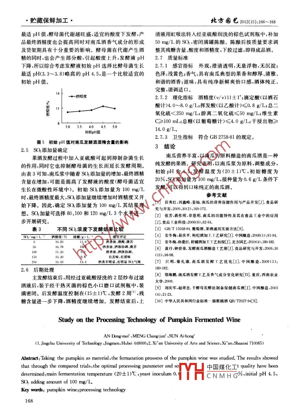 ·貯藏保鮮加工·此方園藝2012():166-168南瓜酒加工工藝研究安冬梅,孟長軍2,孫愛紅1(1荊楚理工學(xué)院,湖北荊門480002.西安文理學(xué)院,陜西西安710065)溫度為(20±1)℃、初始糖度20%初始pH4.5、接種量為0.6g/L、SO添加量100mg以發(fā)酵摘要:以南瓜為原料,研究了南瓜酒的發(fā)酵工藝。結(jié)果表明:南瓜酒最佳工藝參數(shù)為關(guān)鍵詞:南瓜酒;加工工藝中圖分類號:TS262.8文獻(xiàn)標(biāo)識碼B文章編號:1001-0009(2012)15-0166-03南瓜( Cucurbita moschata)為葫蘆科南瓜屬la生草本植物南瓜營養(yǎng)豐富",含有豐富淀粉胡蘿卜素還[團(tuán)肉團(tuán)國處畫瓜據(jù)“[畫之情原糖、脂肪、多種游離氨基酸、豐富的維生素及大量元素和微量元素2,并且還含有多種功能性成分。南瓜補(bǔ)中益氣,氣味甘溫,有明目、定喘之效。研究表明,南瓜具有保護(hù)胃粘膜、助消化、消除致癌物質(zhì)促生長發(fā)育防1.3操作要點(diǎn)治胃潰瘍、動脈粥樣硬化、糖尿病、腎結(jié)石等良好作用1.3.1原料預(yù)處理選擇成熟的南瓜,分選,清洗,人工近年來功能食品的開發(fā)成為了國內(nèi)外食品研究關(guān)注的去皮,人工切塊,斬拌熱點(diǎn)因此南瓜功能性成分的研究及開發(fā)逐漸備受關(guān)1.3.2打漿南瓜纖維含量較多,打漿困難,于是采用注。目前,南瓜的深加工產(chǎn)品主要有南瓜風(fēng)味香腸、南南瓜與水按1:1比例混合打漿瓜果脯、南瓜粉等,關(guān)于南瓜酒的報道不少,但是大都用1.3.3酶處理為了提高轉(zhuǎn)化率在南瓜漿中加入保藏酵母菌種擴(kuò)培后接種發(fā)酵同時需要高溫滅菌,工0.25%糖化酶與0.08%果膠酶,作用的溫度為45~50℃,藝繁瑣。現(xiàn)將活性干酵母活化后直接接入南瓜漿進(jìn)行pH46,保溫酶解3h發(fā)酵操作工藝簡便,成本低,生產(chǎn)效率高。成品具有酒1.3.4成分調(diào)整南瓜自然糖度約為9%打漿時按度低、清澈透明、成品穩(wěn)定、口感醇厚、功能性成分保存1:1南瓜與水配比打漿潛在酒精度不夠高發(fā)酵時用率高等特點(diǎn)。產(chǎn)品不但滿足不同層次消費(fèi)者的需求,同白砂糖提高潛在酒精度補(bǔ)充糖按1.7g糖可轉(zhuǎn)化成1%時提高南瓜經(jīng)濟(jì)價值。的酒來計算。并用檸檬酸調(diào)整酸度為8g/L,pH4.5左右。1材料與方法1.35干酵母的活化按0.6g/L稱取安琪葡萄酒活1.1試驗(yàn)材料性干酵母,用南瓜汁35~38℃恒溫培養(yǎng)30min,加入到試材為當(dāng)?shù)厥惺勰瞎?。營養(yǎng)分析見表1。試驗(yàn)儀南瓜漿中器:榨汁機(jī)、分析天平、電子天平、生化培養(yǎng)箱、酸度計、1.4試驗(yàn)方法斬拌機(jī)、水浴鍋、發(fā)酵罐等。1.4.1起始糖度的選擇將南瓜漿的起始糖度調(diào)整至表1南瓜汁基本成分分析g/.18%、20%、22%和24%添加S量為100mg/L,接種還原糖總糖滴定酸量為0.6g/L,起始pH4.5,(20±1)℃下恒溫發(fā)酵,每天9.38測定殘?zhí)呛?發(fā)酵結(jié)束后測定酒精度和殘?zhí)呛俊?生產(chǎn)工藝流程1.4.2接種量的選擇將南瓜漿的糖度調(diào)整至20%根據(jù)材料特點(diǎn),參考不同發(fā)酵工藝特點(diǎn),確定以添加S)量為100mg1,pH4.5,分別接種0.2,0.4、下丁藝流程。按GBT108940萄酒果酒通用實(shí)驗(yàn)0.60.81.0g1的活性干酵母,(20±1)℃下恒溫發(fā)酵,方法》進(jìn)行分析。發(fā)酵結(jié)束測定最終酒精度。3主發(fā)中國煤化工漿的糖度為20%第一作者簡介:安冬梅(1980),女碩士講師研究方向?yàn)槭称钒l(fā)pH4.5,添加CNMHG為0.6g/L,分別酵與釀造。Emil:andm2008@a163.com置于(15±10)、(20±1)、(25±1)、(30±1)℃恒溫發(fā)酵記收稿日期:2012-05錄發(fā)酵周期,發(fā)酵結(jié)束測定殘?zhí)呛烤凭炔⑵吩u166北方園藝20215):16-168·貯藏保鮮加工·1.4.4初始pH確定調(diào)整南瓜漿的糖度為20%,添加酵副產(chǎn)物,因此糖轉(zhuǎn)化為酒精轉(zhuǎn)化率低。另外,葡萄糖SO量為100mg/L,接種量為0.6g/L,pH調(diào)整為3.0、代謝物的積累產(chǎn)生了分解阻遏,使酵母細(xì)胞生存環(huán)境惡3.5、4.0、4.5、5.0,置于(20±1)℃恒溫發(fā)酵?;?使酵母細(xì)胞早衰并且發(fā)生過早自溶,最終產(chǎn)酒量低。1.4.5SO添加量的確定調(diào)整南瓜漿的糖度為20%,所以,適宜接種量確定為0.6g/L。pH45,接種量為0.6g/L,添加S量分別為0、50、100150、200mg/L,在(20±1)℃下恒溫發(fā)酵,研究SO2添加量對發(fā)酵的影響。2結(jié)果與分析2.1初始糖度確定酒精發(fā)酵過程中糖既是酒化酶的作用底物,同時也酵母接種gL是微生物生長的骨架和能量來源。初始糖濃度既影響圖3酵母接種量對發(fā)酵南瓜酒酒精含量的影響最終酒精度又影響徵生物生長。不同初始糖濃度發(fā)酵23主發(fā)酵溫度確定結(jié)果見圖1、2。由圖1可知,隨著初始含糖量的增加,糖由圖4可知,發(fā)酵溫度由(15±1)℃上升至(20±消耗速度逐漸減慢。隨著發(fā)酵的推進(jìn),高初始糖度最終1)℃,最終酒精度也在增加但發(fā)酵溫度繼續(xù)升高,最終能得到較高濃度酒精。由圖2可知,隨著初始糖濃度的酒精度增加不明顯,發(fā)酵溫度繼續(xù)升高至(30±1)℃最終增加,發(fā)酵最終酒精度也增加,說明酵母在初始糖度為酒精含量下降,可能是高溫下副產(chǎn)物較多,糖轉(zhuǎn)化成酒24%以下時,高糖濃度對發(fā)酵的影響不大。若南瓜酒目精的轉(zhuǎn)化率較低。可見(0±1)~(25±1)℃酵母菌代謝標(biāo)酒度為12,南瓜汁的初始糖度應(yīng)調(diào)整到20%6~22%將糖轉(zhuǎn)化成乙