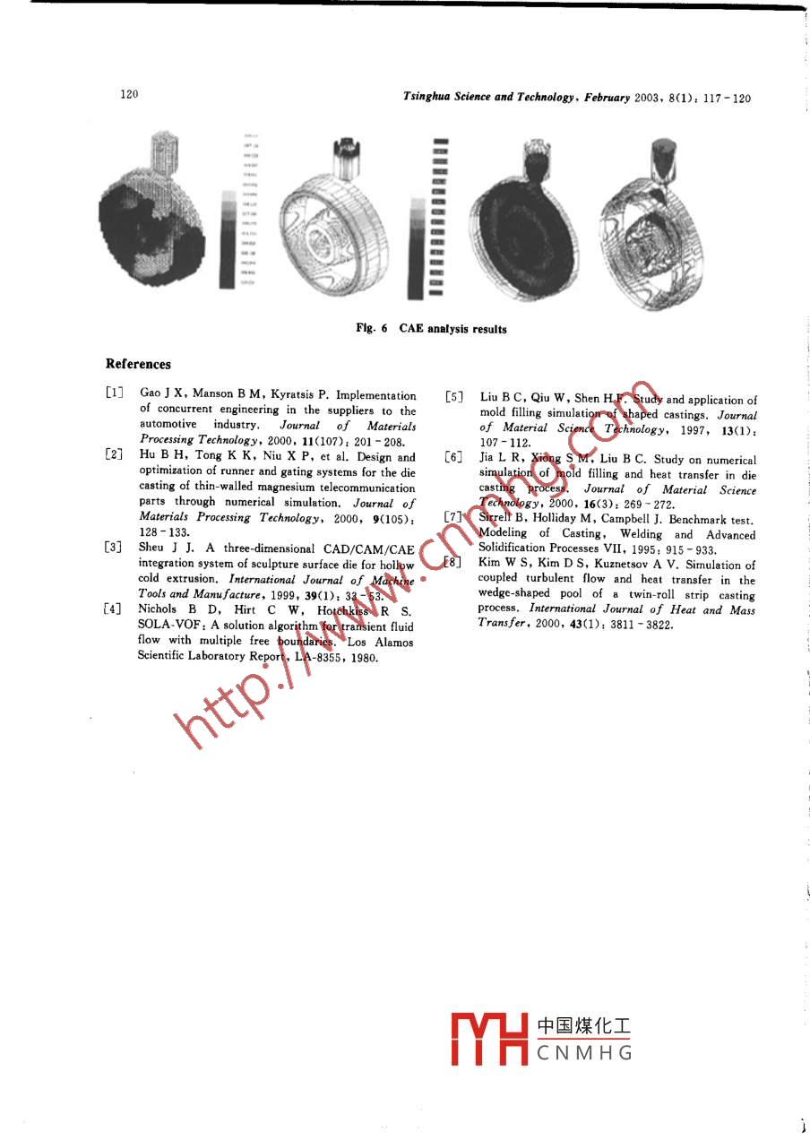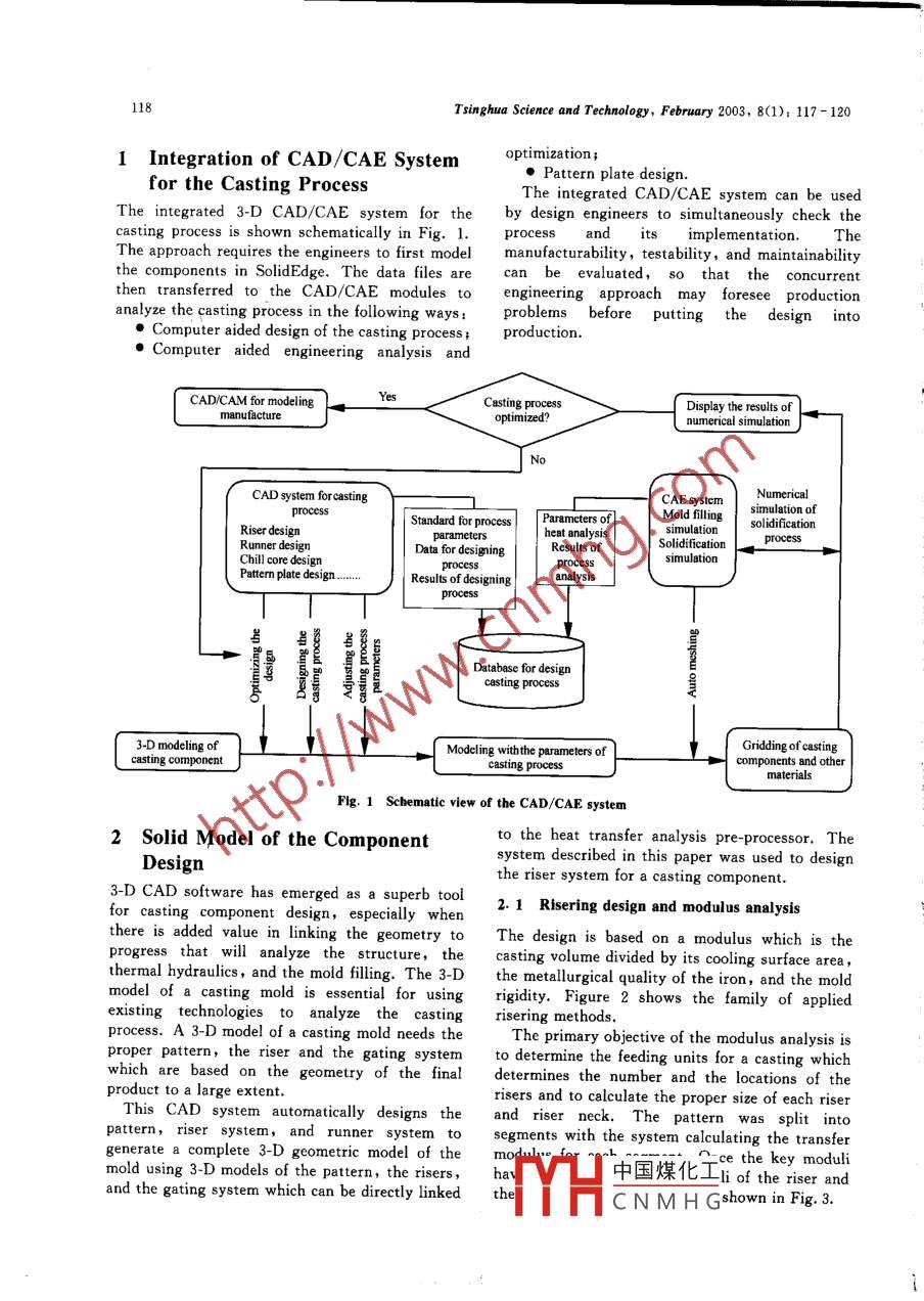 TSINGHUA SCIENCE AND TECHNOLOCYISSN 1007-0214 19/19 pp117- 120Volume 8,Number 1, February 2003Integration of CAD/CAE System for Casting Process Design'zHoU Jian(周艦), JING Tao (荊濤)""Department of Mechanical Engineering, Tsinghua University, Beijing 10084, ChinaAbstract; Concurrent engineering is needed to modernize the foundry industry and to reduce the scrap fromcastings and thus increase the economic profit. This paper presents an integrated 3-D CAD/CAE system for afoundry using concurrent engineering which considers casting structure, casting type, and manufacturingproperties in the CAD module to design the pouring system, the riser, the chill core and so on. A visualized .solid model is developed for the casting component with the model design enhanced by CAE analysis. Heattranster and fluid flow simulation are used to analyze the initial design. The whole product development processis analyzed using concurrent engineering methods. The aplication shows that the integrated system canimprove the fficiency of the design and manufacturing process of die casting.Key words: concurrent engineering; computer alded design (CAD)computer aided engineering (CAE);casting processconsidered and reviewedsimultaneouslyIntroductionthroughout all phases of the development cycle.Casting Irocess design plays a veryConcurrent engineering also provides earlyin the quality of casting components.recognition for any changes related to testing ,Conventionally, castingprocess design wasquality or maintenance. Concurrent engineeringperformedby foundry engineers who usedtheirtechnology integrates expertise from variousexperience to design the process. As a result,engineering disciplines during the design phase.development of a casting component takes a longWhen a casting process design is verified, it istime with much un-productive initial work. Toalready a testable and serviceable high qualitybecome more competitive in the challenging worlddesign. The whole focus of concurrent engineeringmarketplace, foundry engineers are trying tois on a“right first time" process, rather than onreduce the time and cost of development and tothe“redo-until-right”process that is so common inimprove the casting qualtyl1r8.the casting industry.In recent years, the concept of concurrentThis paper discusses an integrated 3-D CAD/engineering has been proposed as an efficientCAE system using concurrent engineering tmethod for designing and optimizing the castingachieve high quality components at low cost and inprocessmeetincreasingly stringenta shorter time. Engineers produce the first trialrequirements. In concurrent engineering, thecomponent using the CAD module (developed onproduct, the process and all life cycle issues arethe SolidEdge platform) for the casting process.After the mould and the casting have beendesigned, the initial and steady-state mouldReceived: 2001 12- 04; revised: 2002- 09-13* Supported by the National Natural Science Foundationtemperatures, the gate size and location and thefilling time can be optimized by using the CAEof China (No. 5990470)★* To whom correspondence should be addressed.module, which can numerically predict theE-mail : todd@sun. midwest. com. cn;occurrence of defects by analyzing the transportTel; 86- 10-62785854pher中國煤化工process."TYHCNMHG118Tsinghua Science and Technology, February 2003, 8(1); 117-1201 Integration of CAD/CAE Systemoptimization;●Pattern plate design.for the Casting ProcessThe integrated CAD/CAE system can be usedThe integrated 3-D CAD/CAE system for theby design engineers to simultaneously check thecasting process is shown schematically in Fig. 1.processandtsimplementation.TheThe approach requires the engineers to first modelmanufacturability, testability, and maintainabilitythe components in SolidEdge. The data files arecan be evaluated, so that the concurrentthen transferred to_ the CAD/CAE modules tengineering approach may foresee productionanalyze the casting process in the following ways;problems before putting the design into●Computer aided design of the casting process;production.●Computer aided engineering analysis andCAD/CAM for modeing'es_C asting processDisplay the resuts ofmanufactureoptimized?numnerical simulationNoCAD system forcastingCAE systmNumericalMoid flingsimulation ofStandard for process Paramcters ofsolifcationsimulationRiser designparametersheat analysisSolidifcationRunner designData for designingResults ofChill core designPattern plate design ....Results of designinganalysisDatabase for designcasting process量Gridding of casting3-D modeling ofModeling withthe parameters of8wt Paesscomponents and othercasting componentcasting process .materialsFig. 1 Schematic view of the CAD/CAE system2 Solid Model of the Componentto the heat transfer analysis pre-processor. Thesystem described in this paper was used to designDesignthe riser system for a casting component.3-D CAD software has emerged as a superb tool2. 1 Risering design and modulus analysisfor casting component design, especially whenthere is added value in linking the geometry toThe design is based on a modulus which is theprogress that will analyze the structure, thecasting volume divided by its cooling surface area,thermal hydraulics, and the mold flling. The 3-Dthe metallurgical quality of the iron, and the moldmodel of a casting mold is essential for usingrigidity. Figure 2 shows the family of appliedexisting technologies to analyze the castingrisering methods.process. A 3-D model of a casting mold needs theThe primary objective of the modulus analysis isproper pattern, the riser and the gating systemto determine the feeding units for a casting whichwhich are based on the geometry of the finaldetermines the number and the locations of theproduct to a large extent.risers and to calculate the proper size of each riserThis CAD system automatically designs theand riser neck. The pattern was split intopattern,riser system, and runner system tosegments with the system calcula