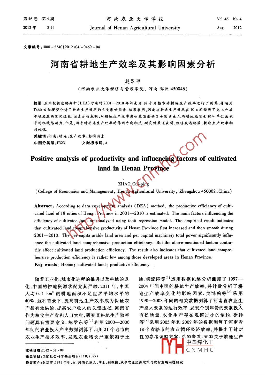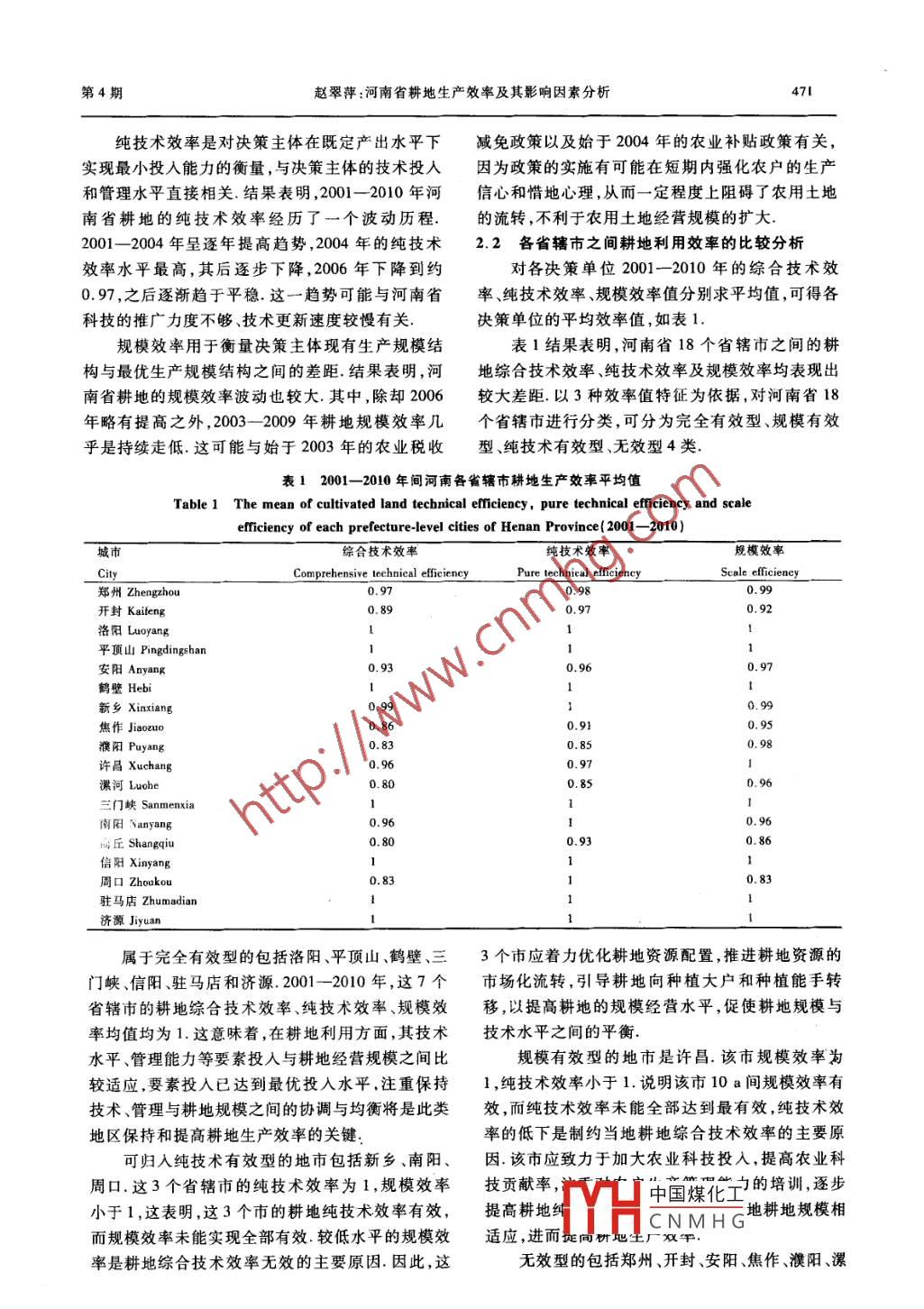 第46卷第4期河南農(nóng)業(yè)大學(xué)學(xué)報(bào)Vol. 46 No. 42012年8月Journal of Henan Agricultural UniversityAug.2012文章編號(hào):1000 - 2340(2012)04 - 0469 -04河南省耕地生產(chǎn)效率及其影響因素分析趙翠萍(河南農(nóng)業(yè)大學(xué)經(jīng)濟(jì)與管理學(xué)院,河南鄭州450046)摘要:應(yīng)用數(shù)據(jù)包絡(luò)分析(DEA)方法對(duì)2001- -2010 年河南省18個(gè)省轄市的耕地生產(chǎn)效率進(jìn)行了測(cè)算,并運(yùn)用Tobit回歸模型分析了耕地生產(chǎn)效率的主要影響因素.結(jié)果表明,河南省耕地生產(chǎn)效率在10a間經(jīng)歷了先上升后.平穩(wěn)發(fā)展的變化過(guò)程.因素分析表明,對(duì)耕地生產(chǎn)效率影響最顯著的2個(gè)因素是人均耕地經(jīng)營(yíng)面積和單位面積平均機(jī)械總動(dòng)力,但是,兩者對(duì)耕地生產(chǎn)效率的作用方向相反.研究結(jié)果還表明,經(jīng)濟(jì)發(fā)達(dá)地區(qū),耕地生產(chǎn)效率相對(duì)較低.關(guān)鍵詞:河南;耕地;生產(chǎn)效率;影響因素中圖分類號(hào):F323文獻(xiàn)標(biāo)志碼:APositive analysis of productivity and influencing factors of cultivatedland in Henan ProvinceZHAO Cui-ping(College of Economics and Management, Henan Agricultural University , Zhengzhou 450002 , China)Abstract: According to data envelopment analysis ( DEA) method, the productive efficiency of culti-vated land of 18 cities of Henan Province in 2001 - -2010 is estimated. The main factors influencing theefficiency of cultivated land are analyzed using tobit regression model. The empirical result indicatesthat cultivated land comprehensive productivity of Henan Province first increased and then smooth during2001- 2010. The per capita arable land area and per capital machinery total power significantly influ-ence the cultivated land comprehensive production efficiency. But the above-mentioned factors contra-rily affect cultivated land production efficiency. The result also indicates that cultivated land compre-hensive production efficiency is rather low among those developed areas in Henan Province.Key words: Henan; cultivated land ; productive efficiency隨著工業(yè)化、城市化進(jìn)程的推進(jìn)以及耕地的退地.梁流濤等(2}運(yùn)用數(shù)據(jù)包絡(luò)分析測(cè)度了1997-化,中國(guó)的耕地資源狀況尤其嚴(yán)峻.2011年,中國(guó)2004年間中國(guó)的耕地生產(chǎn)效率,并計(jì)量分析了耕人均0.1 hm2的耕地面積不足世界平均水平的地生產(chǎn)效率變化的影響因素.炱鴻琬等[}]采用40%.這種背景下,提高耕地生產(chǎn)效率成為保證農(nóng)1990--2008年間的相關(guān)數(shù)據(jù)測(cè)算了河南省農(nóng)業(yè)生產(chǎn)品有效供給.提高農(nóng)戶收人的關(guān)鍵途徑.河南省產(chǎn)投人要素的運(yùn)行效率,發(fā)現(xiàn)個(gè)別年份的要素投入作為糧食主產(chǎn)省和人口大省,研究其耕地生產(chǎn)效率有松弛量,農(nóng)業(yè)生產(chǎn)存在規(guī)模過(guò)小的制約.徐錚問(wèn)題具有重要意義.鮑學(xué)東等[1利用2000- -2006等'|)采用2005年和2009年的數(shù)據(jù)測(cè)算了河南省年間的農(nóng)業(yè)投人產(chǎn)出數(shù)據(jù)測(cè)算了四川'21個(gè)地市的18個(gè)省轄市的農(nóng)業(yè)循環(huán)經(jīng)濟(jì)效率,并提出了針對(duì)農(nóng)業(yè)生產(chǎn)技術(shù)效率,發(fā)現(xiàn)農(nóng)業(yè)增長(zhǎng)嚴(yán)重依賴于土性的參考調(diào)整方案.總的來(lái)看.現(xiàn)有關(guān)于耕地生產(chǎn)中國(guó)煤化工收稿日期:2012 -02 -08YHCNMH G基金項(xiàng)目:國(guó)家社會(huì)科學(xué)基金項(xiàng)目(11BJY085)作者簡(jiǎn)介:趙翠萍,1971年生,女,河南長(zhǎng)垣人,博士,副教授,從事農(nóng)業(yè)經(jīng)濟(jì)政策與農(nóng)村發(fā)展問(wèn)題研究.470河南農(nóng)業(yè)大學(xué)學(xué)報(bào)第46卷效率方面的研究缺乏進(jìn)一步的因素分析.本研究利本研究利用Tobit模型對(duì)河南省耕地生產(chǎn)效率用2001-2010年的《河南省統(tǒng)計(jì)年鑒》數(shù)據(jù),運(yùn)用的影響因素進(jìn)行分析時(shí),選取采用DEA方法對(duì)河DEA方法評(píng)價(jià)了河南省的耕地生產(chǎn)效率水平及變南省18個(gè)省轄市2001- -2010 年間耕地綜合技術(shù)化趨勢(shì),利用Tobit模型分析了耕地生產(chǎn)效率的影效率的測(cè)算值作為被解釋變量,選取與之對(duì)應(yīng)的人響因素及其作用方向和作用強(qiáng)度,以期為進(jìn)- -步提均耕地經(jīng)營(yíng)面積、人均GDP、單位面積機(jī)械總動(dòng)力升河南耕地生產(chǎn)效率提供技術(shù)支撐.作為解釋變量.1材料與方法2基于DEA的耕地生產(chǎn)效率分析1.1 數(shù)據(jù)來(lái)源選取河南省所轄鄭州市、開(kāi)封市、洛陽(yáng)市、平頂本研究數(shù)據(jù)來(lái)自2002- -2011年的《河南統(tǒng)計(jì)山市、安陽(yáng)市、鶴璧市、新鄉(xiāng)市、焦作市、濮陽(yáng)市、許年鑒》.運(yùn)用DEA方法計(jì)算河南省耕地生產(chǎn)效率昌市、漯河市、三門峽市、南陽(yáng)市、商丘市、信陽(yáng)市、時(shí),選取涵蓋自然資源、勞動(dòng)力、資金、技術(shù)等基本周口市、駐馬店市17個(gè)地級(jí)市以及濟(jì)源市1個(gè)省生產(chǎn)要素的年末實(shí)有耕地面積、農(nóng)業(yè)從業(yè)人員數(shù)直管市作為決策單元(DMU),各個(gè)決策單元之間量、農(nóng)用化肥使用量、農(nóng)藥使用量、農(nóng)用地膜使用在耕地資源、勞動(dòng)力