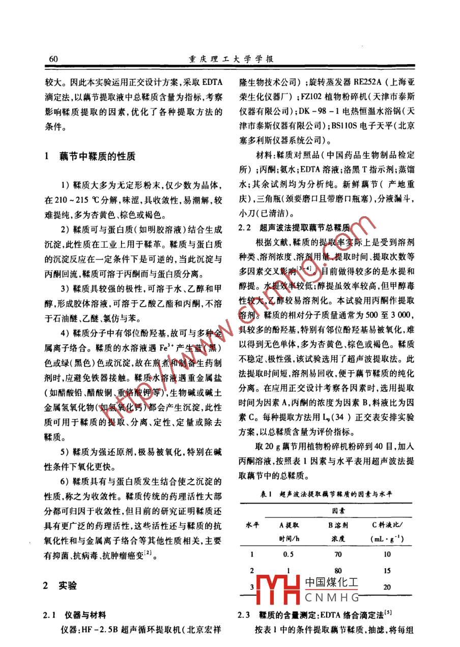 第25卷第2期重慶理工大學(xué)學(xué)報(bào)(自然科學(xué))2011年2月Vol 25 No. 2Journal of Chongqing University of Teehnology( Natural ScienceFeb.2011藕節(jié)鞣質(zhì)提取工藝鄒姝姝,蔣東,董杰,涂維,鄭貴元,李露(重慶理工大學(xué)藥學(xué)與生物工程學(xué)院,重慶400054)摘要:為了找到用超聲波法提取藕節(jié)鞣質(zhì)的最佳工藝,用EDTA絡(luò)合滴定法,以洛黑T指示劑的變色效果作為考察指標(biāo),測(cè)定提取的鞣質(zhì)含量。實(shí)驗(yàn)結(jié)果表明,超聲提取藕節(jié)鞣質(zhì)最佳工藝條件為10倍量的80%丙酮溶液,超聲提取120min,且影響力大小為:溶劑量>提取時(shí)間丙酮濃度關(guān)鍵詞:藕節(jié)鞣質(zhì);超聲波提取;EDTA絡(luò)合滴定中圖分類號(hào):S685.12文獻(xiàn)標(biāo)識(shí)碼:A文章編號(hào):1674-8425(2011)02-0059-03Extraction Technology of Intersecting TanninZOU Shu-shu, JIANG Dong, DONG Jie, TU Wei, ZHENG Gui-yuan, LI LuSchool of Pharmacy and Bioengineering, Chongqing University of Technology, Chongqing 400054, ChinAbstract: This experiment is the best craft of expecting to find the ultrasonic law and draw the festivalof the lotus root and tan the quality. By means of titrimetric law of EDTA complexometric titration, re-garded the result of changing color of Lip river black t indicator as the index of investigating, that de-termined and extracted tanned quality content. The experimental result shows that the best processconditions are 80% of the acetone solution of quantity of 10 times to draw the festival of the lotus rootand tan the quality in ultrasonic, ultrasonic is extracted 120 minutes, and the size of influence poweris the solvent amount draw time density of acetoneKey words: oujie tannin; ultrasonic extracting EDTA complexometric titration藕節(jié)中含有豐富的鞣質(zhì)成分。鞣質(zhì)是一種具壓、降血脂及改善肝腎功能等多種功用,且具有低有沉淀蛋白質(zhì)特性的多元酚類化合物,但因其結(jié)毒、安全的特點(diǎn),有較高的新藥開發(fā)前景,受到人構(gòu)復(fù)雜,人工合成不易。毒理及藥效學(xué)研究結(jié)果們的高度重視。目前,國(guó)內(nèi)對(duì)石榴皮鞣質(zhì)提取表明,由于其具有抗菌消炎、抗多種病原蟲感染性的研究報(bào)道較多,但由于鞣質(zhì)遇酸、堿及在高溫條疾病、抗乙肝病毒、抗腫瘤、抗脂質(zhì)過(guò)氧化、降血件下由葉想古法的報(bào)道分歧也中國(guó)煤化工CNMHG收稿日期:2010-11-08作者簡(jiǎn)介:鄒姝妹(1979—),女碩上研究生,主要從事藥物化學(xué)研究重慶理工大學(xué)學(xué)扎較大。因此本實(shí)驗(yàn)運(yùn)用正交設(shè)計(jì)方案,采取EDTA隆生物技術(shù)公司);旋轉(zhuǎn)蒸發(fā)器RE252A(上海亞滴定法,以藕節(jié)提取液中總鞣質(zhì)含量為指標(biāo)考察榮生化儀器廠);FZ02植物粉碎機(jī)(天津市泰斯影響鞣質(zhì)提取的因素,優(yōu)化了各種提取方法的儀器有限公司);DK-98-1電熱恒溫水浴鍋(天條件。津市泰斯儀器有限公司);BS110s電子天平(北京塞多利斯儀器系統(tǒng)公司)。1藕節(jié)中鞣質(zhì)的性質(zhì)材料:鞣質(zhì)對(duì)照品(中國(guó)藥品生物制品檢定所);丙酮;氨水;EDTA溶液;洛黑T指示劑;蒸餾1)鞣質(zhì)大多為無(wú)定形粉末,僅少數(shù)為晶體,水;其余試劑均為分析純。新鮮藕節(jié)(產(chǎn)地重在210~215℃分解,味澀,具收斂性,易潮解,較慶),三角瓶(頸要磨口且?guī)ヘ缙咳?,分液漏斗,難提純,多為杏黃色、棕色或褐色。小刀(已清潔)2)鞣質(zhì)可與蛋白質(zhì)(如明膠溶液)結(jié)合生成2.2超聲波法提取藕節(jié)總鞣質(zhì)沉淀,此性質(zhì)在工業(yè)上用于鞣革。鞣質(zhì)與蛋白質(zhì)根據(jù)文獻(xiàn)鞣質(zhì)的提取率實(shí)際上是受到溶劑的沉淀反應(yīng)在一定條件下是可逆的,當(dāng)此沉淀與種類、溶劑濃度溶劑用量提取時(shí)間提取次數(shù)等丙酮回流,鞣質(zhì)可溶于丙酬而與蛋白質(zhì)分離。多因素交叉影響。目前做得較多的是水提和3)鞣質(zhì)具較強(qiáng)的極性可溶于水、乙醇和甲醇提。水提效率較低;醇提雖效率較高但甲醇毒醇,形成膠體溶液,可溶于乙酸乙酯和丙酮,不溶性較大,乙醇較易溶劑化。本試驗(yàn)用內(nèi)酮作提取于石油醚、乙醚、氯仿與苯。溶劑。鞣質(zhì)的相對(duì)分子質(zhì)量通常為500至30004)鞣質(zhì)分子中有鄰位酚羥基故可與多種金具較多的酚羥基特別有鄰位酚羥基易被氧化難屬離子絡(luò)合。鞣質(zhì)的水溶液遇Fe·產(chǎn)生藍(lán)(黑)以得到無(wú)色單體,多為杏黃色棕色或褐色。鞣質(zhì)色或綠(黑色)色或沉淀故在煦煮和制備生藥制不穩(wěn)定、極性強(qiáng)該試駿選用了超聲波提取法。此劑時(shí),應(yīng)避免鐵器接觸。鞣質(zhì)水溶液遇重金屬鹽法提取時(shí)間短溶劑易回收,便于藕節(jié)鞣質(zhì)的純化(如醋酸鉛、醋酸銅、重鉻酸鉀等),生物堿或堿土分離。在應(yīng)用正交設(shè)計(jì)考察各因素時(shí),選用提取金屬氫氧化物(如氫氧化鈣)都會(huì)產(chǎn)生沉淀此性時(shí)間為因素A,丙酮的濃度為因素B料液比為因質(zhì)可用于鞣質(zhì)的提取、分離定性定量或除去素C。每種提取方法用L(34)正交表安排實(shí)驗(yàn)鞣質(zhì)。方案,以總鞣質(zhì)含量為評(píng)價(jià)指標(biāo)。5)鞣質(zhì)為強(qiáng)還原劑,極易被氧化,特別在堿取20g藕節(jié)用植物粉碎機(jī)粉碎到40目,加人性條件下氧化更快。丙酮溶液按照表1因素與水平表用超聲波法提