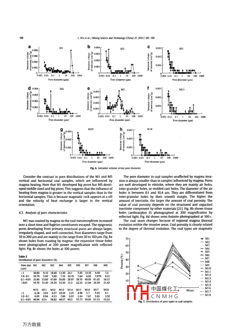 Mining Science and Technology( China)21(2011)185-190Contents lists available at Science DirectMining Science and Technology( China)ELSEVIERjournalhomepagewww.elsevier.com/locate/mstcResponse of coal reservoir porosity to magma intrusion in the shandong QjwuMine. chinaLi Wu.., Zhu Yanming.b, Chen Shangbin,b, Wang HuicSchool of Mineral Resources and Geoscience, China Universiry of Mining G Technology. Xuzhou 221008, ChinaKey Laboratory of CBM Resource and Reservoir-Generaning Process Ministry of Education, Xuzhou 221008. ChinaShunhe Mine of Etermal Coal Group Co, Ltd, Yongcheng 476600, ChinaARTICLE INFOA BSTRACTArticle history:The Qiwu Mine is located in the Ten Xian coal field of Shandong province. It experienced repeatedvolcanic activity. after the coal beds formed, where magma intrusion was significant. The effect of coalty after magma intrusion was studied by analysis of regional and mine structure and3 0ctober 2010magmatic activity. Experimental methods including maceral measurement under the microscope andetry were used for testing the pore structure. The authors believe that magma intrusioninto low-rank bituminous coal causes reservoir porosity to gradually increase: the closer to the magmaticrock a sample is, the less the porosity. The pore size distribution also changes. In the natural coal bed thepore size is mainly in the transitive and middle pore range. However, theto anthracite nebituminous coalto the magmatic rock and larger pores dominate Regional magma thermal evolution caused coal dose tomagmatic rock to be roasted, which reduced the volatile matter, developed larger holes, and destroyedplant tissue holes. The primary reason for a porosity decrease in the vicinity of magmatic rock is thatBituminite resulting from the roasting fills the holes that were present initiallyCopyright o 2011, China University of Mining Technology. All rights reserved.1. Introductionin magma intrusion zones and also did some research on thefeatures of pore structure and the impact of magma intrusion onA coal seam is a reservoir and it may produce gas. The degree of gas storage and out-gassing [12]. Zhang et al. studied factorsmetamorphism of the coal bed, the porosity, permeation, adsorp. influencing CBM generation in magma coal reservoirs. Theytivity, and the type of maceral are the main factors influencing coal determined that magma baking volatilized some organic matter inbed methane( CBM)generation, migration, and concentration( 1). the coal, which left many circular and tubular pores and improvedowever, magma intrusion changes many of the original charac- the porosity of the coal reservoir [13]. Fang et al analysed thehigh pressure squeezing Pores in the coal, and the character of the morphism with CBM formation, adsorption value, porosity develpores(quantity size, proportion of different type pores, and extent opment, and coal seam characteristics. They thought that theof connection between pores) can influence collection and trans. impact of coal metamorphism on CBM accumulation was reflectedmission of the gas. This is an important physical property of coal by the development of a coal reservoir porosity-fracture systemreservoirs having great influence on the occurrence of coal bed [14. Wang analysed the litho-structure of coal-bearing strata andethane[2].studied the magma intrusion mechanism with a scanning electronMuch work has been done studying the characteristicsreservoirs and the impact of magma intrusion on the coalrank, and coal bed methane [3-11. Experimental measurengas content, gas components, and the coal pore capacitythe safmicroscope. He summarized the impact of lamprophyre intrusionon coal seams, coal rank, and gas accumulation [15] So it is verysignificant to analyse coal reservoir characteristics in magmaamples were made by Lu et al. They analysed the gas components2. Geological introductionCorresponding author. School of Mineral Resources and CeoscieThe Qiwu Mine is located southwest of Shandong province, inUniversity of Mining Technology Xuzhou 221008, China. TeL: +86 138153E-mailaddress:Iiwucumt@126.com(Lwu中國煤化工 ession in the chengwu674-5264'S-see front matter Copyright c 2011, China University of Mining TechnologyCNMHGdoi:101016mstc201102008L wu et aL/ Mining Science and Technology( China )21(2011 )185-190region of the Zhong-Chao Para platform(Fig. 1)and has a coal- working pressure ranges from 0 to 207 MPa and the low pressurebearing area of 46 km?. It contains low-rank bituminous coal of the resolution ratio is 0.001 MPa, the high pressure resolution ratio isCarbonic and Permian strata where the main coal-bearing strata are 0.01 MPa, the contact angle between the mercury and the sample isfrom the Taiyuan formation of the upper Carbonic series and the140, the surface tension of mercury is 480 dyn/cm, and theShanxi formation of the upper Permian series. There are four diameter of the pores ranges from 60 to 3,600,000A.Amineral seams: the upper coal seam, Number 3: the lower of coal 1.5 cm x 1.5 cm x 2.0 cm coal sample was tested by first drying it atseam, Number 3 the lower coal seam, Number 12; and coal seam 60-70 for 24 h. It was then enclosed in an evacuated chamber toNumber 16. The average seam thickness is 8.15 m, and the average remove all the gas. the mercury was added to the chamber whentotal thickness of the upper and lower Number 3 seams is 6.18 m. the vacuum was below 50 um. Mercury was then forced into theThe latter accounts for 76% of the total commercial seam thickness. sample pores by increasing the pressure, mercury enters the biggerMagma intrusion is extensive but mainly occurs in the southen holes first followed by the smaller ones as the pressurepart of the coal field. It is much less in the middle part of the The mercury volume in the pores is obtained by capacitance varinorthem area. In the southern area intrusion occurs from explo- ations in a micro-bore capillary containing the mercury. The sampleration line 8. in the northem apex, to t