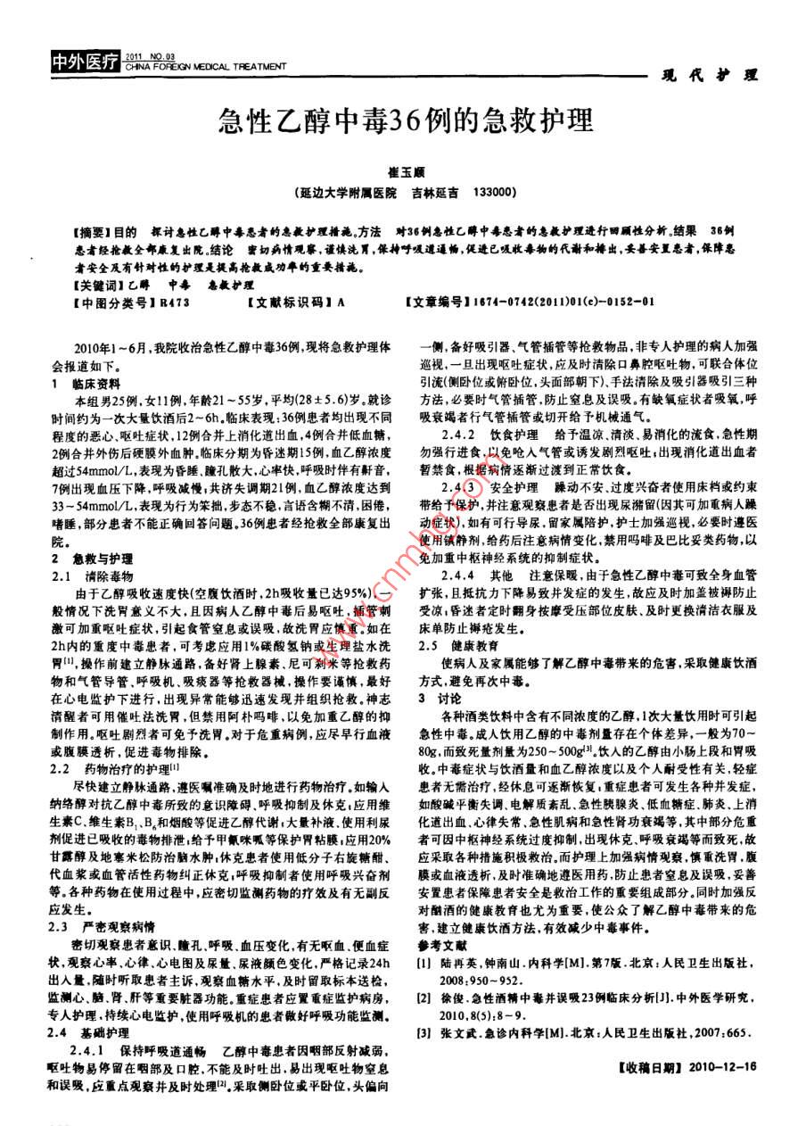 中外醫(yī)療GN MEDICAL TREATMENT現(xiàn)代護(hù)理急性乙醇中毒36例的急救護(hù)理崔玉順延邊大學(xué)附屬醫(yī)院吉林延吉133000【摘要】目的探討息性乙酈中惡者的息教護(hù)理措毳方法對(duì)36例急性乙醇中毒患者的息教護(hù)理透行國(guó)顧性分析結(jié)果36例患者經(jīng)搶全部康復(fù)出院結(jié)論婁切病情觀察,謚懊洗胃保掉呼嗄還逼促遜已吸收物的代謝和排出要善安夏者保陣亳者安全及有針耐性的護(hù)理是提高搶教成功阜的重要措毳【關(guān)鍵詞】乙醇中毒恚教護(hù)理【中圖分類號(hào)】R473【文獻(xiàn)標(biāo)識(shí)碼】A【文章編號(hào)】1674-0742(2011)01(c)-0152-2010年1~6月,我院收治急性乙醇中毒36例現(xiàn)將急教護(hù)理體側(cè)備好吸引器、氣管插管等搶救物品,非專人護(hù)理的病人加強(qiáng)會(huì)報(bào)道如下。巡視,一旦出現(xiàn)嘔吐癥狀,應(yīng)及時(shí)清除口鼻腔嘔吐物,可聯(lián)合體位1臨床資料引流(側(cè)臥位或俯臥位,頭面部朝下)、手法清除及吸引器吸引三種本組男25例,女1例,年於21~55歲,平均(28±5.6)歲就診方法,必要時(shí)氣管插管防止窒息及誤吸。有缺氧癥狀者吸氧,呼時(shí)間約為一次大量飲酒后2~6h,臨床表現(xiàn):36例患者均出現(xiàn)不同吸衰竭者行氣管插管或切開給予機(jī)械通氣程度的惡心嘔吐癥狀,12例合并上消化道出血4例合井低血糖2.4.2飲食護(hù)理給予溫涼清淡、易消化的流食,急性期2例合并外傷后硬膜外血腫臨床分期為昏迷期15例,血乙醇濃度勿強(qiáng)行進(jìn)食,以免嗆入氣管或誘發(fā)劇烈嘔吐;出現(xiàn)消化道出血者超過54mmo/L,表現(xiàn)為昏睡魔孔散大心率快呼吸時(shí)伴有鼾音,暫禁食根據(jù)病情逐漸過渡到正常飲食7例出現(xiàn)血壓下降呼吸減慢;共濟(jì)失調(diào)期2例,血乙醇濃度達(dá)到2.4.3安全護(hù)理躁動(dòng)不安、過度興奮者使用床檔或約束33-54mmol/L,表現(xiàn)為行為笨拙,步態(tài)不穩(wěn),言語(yǔ)含糊不清,困倦,帶給予保護(hù),并注意觀察患者是否出現(xiàn)尿潴留(因其可加重病人躁嗜睡部分患者不能正確回答問題。36例忠者經(jīng)搶救全部康復(fù)出動(dòng)癥狀),如有可行導(dǎo)尿,留家屬陪護(hù)護(hù)士加強(qiáng)巡視必要時(shí)遵醫(yī)院使用鎮(zhèn)靜劑給藥后注意病情變化,禁用嗎啡及巴比妥類藥物,以2急救與護(hù)理免加重中樞神經(jīng)系統(tǒng)的抑制癥狀。2.1清除毒物24.4其他注意保暖,由于急性乙醇中毒可致全身血管由于乙醇吸收速度快(空腹飲酒時(shí),2h吸收量已達(dá)95%)擴(kuò)張,且抵抗力下降易致并發(fā)癥的發(fā)生,故應(yīng)及時(shí)加蓋被褥防止般情況下洗胃意義不大,且因病人乙醇中毒后易嘔吐,插管刺受涼:昏迷者定時(shí)翻身按摩受壓部位皮膚、及時(shí)更換清潔衣服及激可加重嘔吐癥狀,引起食管窒息或誤吸,故洗胃應(yīng)慎重。如在床單防止懈瘡發(fā)生。2h內(nèi)的重度中毒患者,可考慮應(yīng)用1%碳酸氫鈉或生理鹽水洗2.5健康教育胃山,操作前建立靜脈通路,備好腎上腺素尼可剎米等搶教藥使病人及家屬能夠了解乙醇中毒帶來(lái)的危害,采取健康飲酒物和氣管導(dǎo)管、呼吸機(jī)、吸痰器等搶救器械,操作要謹(jǐn)慎,最好方式避免再次中毒在心電監(jiān)護(hù)下進(jìn)行,出現(xiàn)異常能夠迅速發(fā)現(xiàn)并組織搶救。神志3討論清醒者可用催吐法洗胃,但禁用阿樸嗎啡,以免加重乙醇的抑各種酒類飲料中含有不同濃度的乙醇次大量飲用時(shí)可引起制作用。嘔吐劇烈者可免予洗胃,對(duì)于危重病例,應(yīng)盡早行血液急性中毒成人飲用乙醇的中毒劑量存在個(gè)體差異,一般為70或腹膜透析,促進(jìn)毒物排除。80g,而致死量劑量為250~500g飲入的乙醇由小腸上段和胃吸2.2藥物治療的護(hù)理山收。中毒癥狀與飲酒量和血乙醇濃度以及個(gè)人耐受性有關(guān)輕癥今。盡快建立靜林通路遵醫(yī)囑準(zhǔn)確及時(shí)地進(jìn)行藥物治療如輸入患者無(wú)需治療經(jīng)休息可逐漸恢復(fù):重癥患者可發(fā)生各種井發(fā)癥,納絡(luò)醇對(duì)抗乙醇中毒所致的意識(shí)障礙呼吸抑制及休克;應(yīng)用維如酸堿平衡失調(diào)電解質(zhì)紊亂、急性胰腺炎、低血糖癥肺炎,上消生素C維生素B1B和煙酸等促進(jìn)乙醇代謝大量補(bǔ)液使用利尿化道出血心律失常急性肌病和急性腎功衰竭等,其中部分危重劑促進(jìn)已吸收的毒物排泄:給予甲氰咪呱等保護(hù)胃粘膜;應(yīng)用2。%者可因中樞神經(jīng)系統(tǒng)過度抑制,出現(xiàn)休克、呼吸衰竭等而致死,故甘露醇及地寥米松防治腦水腫休克患者使用低分子右旋糖酣、應(yīng)采取各種措施積極救治而護(hù)理上加強(qiáng)病情觀察慎重洗胃,腹代血漿或血管活性藥物糾正休克;呼吸抑制者使用呼吸興奮劑膜或血液透析,及時(shí)準(zhǔn)確地遵醫(yī)用藥防止患者室息及誤吸,妥善等。各種藥物在使用過程中,應(yīng)密切監(jiān)測(cè)藥物的療效及有無(wú)副反安置患者保障患者安全是救治工作的重要組成部分同時(shí)加強(qiáng)反應(yīng)發(fā)生對(duì)酗酒的健康教育也尤為重要,使公眾了解乙醇中毒帶來(lái)的危23嚴(yán)密觀察病情害建立健康飲酒方法,有效減少中毒事件。密切觀察患者意識(shí)魔孔呼吸、血壓變化,有無(wú)啊血、便血癥參考文獻(xiàn)狀,觀察心率、心律、