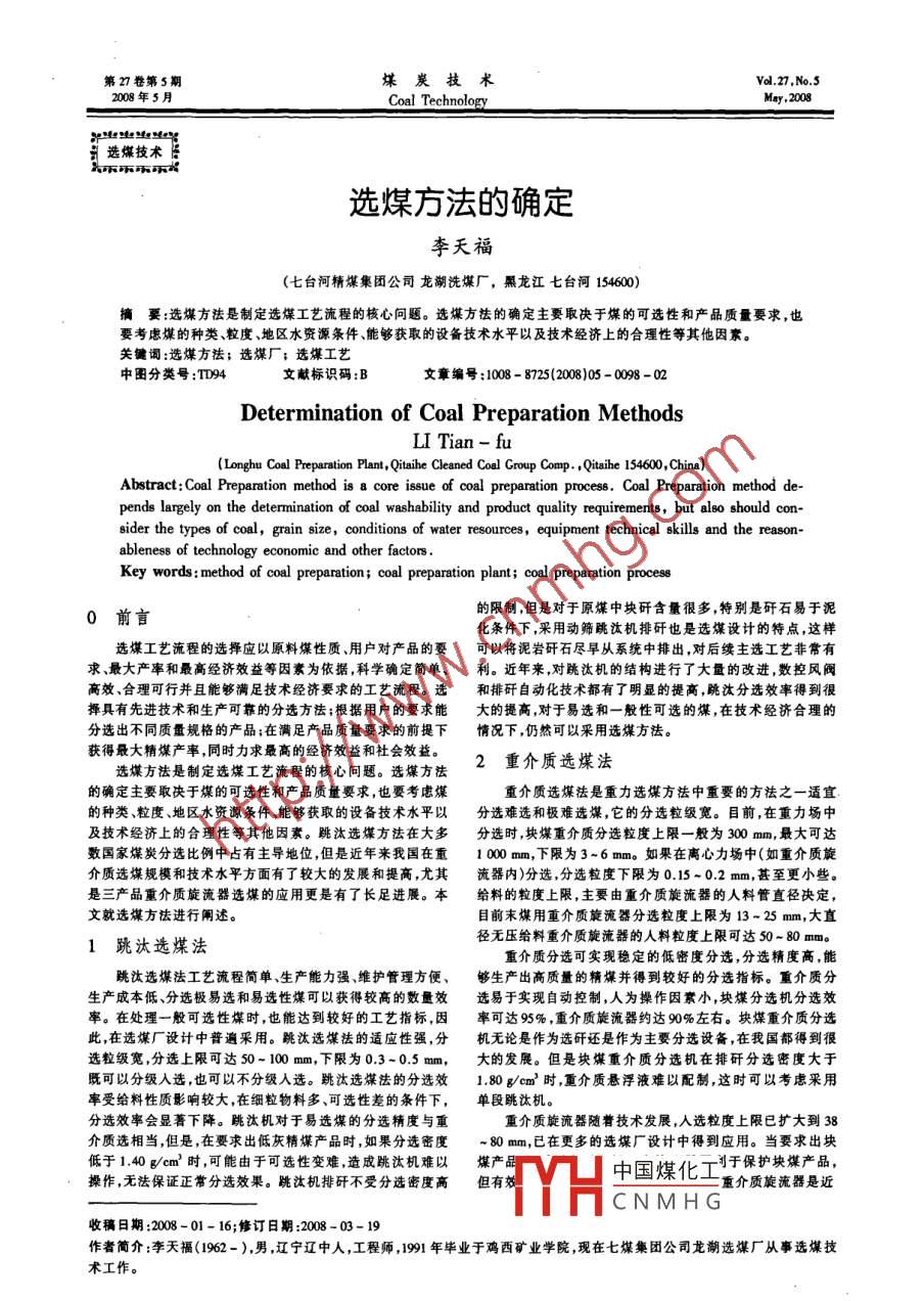 第27卷第5期煤炭技術(shù)val.27,No.s2008年5月Coal TechnologyMay,20089選煤技術(shù)隘不不不不成選煤方法的確定;李天福(七臺(tái)河精煤集團(tuán)公司龍湖洗煤廠,黑龍江七臺(tái)河154600) .摘要 :選煤方法是制定選煤工藝流程的核心問(wèn)題。選煤方法的確定主要取決于煤的可選性和產(chǎn)品質(zhì)量要求,也要考慮煤的種類、粒度、地區(qū)水資源條件、能夠獲取的設(shè)備技術(shù)水平以及技術(shù)經(jīng)濟(jì)上的合理性等其他因素。關(guān)鍵詞:選煤方法;選煤廠;選煤工藝中圖分類號(hào):TD94文獻(xiàn)標(biāo)識(shí)碼:B文章編號(hào):1008- 8725(2008)05 - 0098 -02Determination of Coal Preparation MethodsLI Tian- fu(Longhu Coal Preparntion Plant, Qitaihe Cleaned Coal Croup Comp. ,Qitaihe 154600,China)Abstract:Coal Preparation method is a core isue of coal preparation process. Coal Preparation method de-pends largely on the determnination of coal washability and product quality requirements, but also should con-sider the types of coal, grain size, conditions of water resources, equipment technical skills and the reason-ableness of technology economic and other factors.Key words : method of coal preparation; coal preparation plant; coal preparation process的限制,但是對(duì)于原煤中塊矸含量很多,特別是矸石易于泥0前言化條件下,采用動(dòng)篩跳汰機(jī)排矸也是選煤設(shè)計(jì)的特點(diǎn),這樣選煤工藝流程的選撣應(yīng)以原料煤性質(zhì)、用戶對(duì)產(chǎn)品的要可以將泥巖矸石盡早從系統(tǒng)中排出,對(duì)后續(xù)主選工藝非常有求、最大產(chǎn)率和最高經(jīng)濟(jì)效益等因素為依據(jù),科學(xué)確定簡(jiǎn)單、利。 近年來(lái),對(duì)跳汰機(jī)的結(jié)構(gòu)進(jìn)行了大量的改進(jìn),數(shù)控風(fēng)閥高效、合理可行并且能夠滿足技術(shù)經(jīng)濟(jì)要求的工藝流程。選和排矸自動(dòng)化技術(shù)都有了明顯的提高,跳汰分選效率得到很擇具有先進(jìn)技術(shù)和生產(chǎn)可靠的分選方法;根據(jù)用戶的要求能大的提高 ,對(duì)于易選和一般性可選的煤,在技術(shù)經(jīng)濟(jì)合理的分選出不同質(zhì)量規(guī)格的產(chǎn)品;在滿足產(chǎn)品質(zhì)量要求的前提下情況下,仍然可以采用選煤方法。獲得最大精煤產(chǎn)率,同時(shí)力求最高的經(jīng)濟(jì)效益和社會(huì)效益。2重介質(zhì)選煤法選煤方法是制定選煤工藝流程的核心問(wèn)題。選煤方法的確定主要取決于煤的可選性和產(chǎn)晶質(zhì)量要求,也要考慮煤重介質(zhì)選煤法是重力選煤方法中重要的方法之一適宜.的種類、粒度、地區(qū)水資源條件、能夠獲取的設(shè)備技術(shù)水平以分選難選和極難選煤,它的分選粒級(jí)寬。 目前,在重力場(chǎng)中及技術(shù)經(jīng)濟(jì)上的合理性等其他因素。跳汰選煤方法在大多分選時(shí) 塊煤重介質(zhì)分選粒度上限一般為300 mm,最大可達(dá)數(shù)國(guó)家煤炭分選比例中占有主導(dǎo)地位,但是近年來(lái)我國(guó)在重1 000 mm,下限為3~6 mm。如果在離心力場(chǎng)中(如重介質(zhì)旋介質(zhì)選煤規(guī)模和技術(shù)水平方面有了較大的發(fā)展和提高,尤其流器內(nèi))分選, ,分選粒度下限為0.15-0.2 mm,甚至更小些。是三產(chǎn)品重介質(zhì)旋流器選煤的應(yīng)用更是有了長(zhǎng)足進(jìn)展。本給料的粒度 上限,主要由重介質(zhì)旋流器的人料管直徑?jīng)Q定,文就選煤方法進(jìn)行闡述。目前末煤用重介質(zhì)旋流器分選粒度上限為13~ 25 mm,大直徑無(wú)壓給料重介質(zhì)旋流器的人料粒度上限可達(dá)50- 80 mm。1跳汰選煤法重介質(zhì)分選可實(shí)現(xiàn)穩(wěn)定的低密度分選,分選精度高,能跳汰選煤法工藝流程簡(jiǎn)單、生產(chǎn)能力強(qiáng)、維護(hù)管理方便、夠生產(chǎn) 出高質(zhì)量的精煤并得到較好的分選指標(biāo)。重介質(zhì)分生產(chǎn)成本低分選極易選和易選性煤可以獲得較高的數(shù)量效選易 于實(shí)現(xiàn)自動(dòng)控制,人為操作因素小,塊煤分選機(jī)分選效率。在處理一般可選性煤時(shí),也能達(dá)到較好的工藝指標(biāo),因率可達(dá)95%,重介質(zhì)旋流器約達(dá)90%左右。塊煤重介質(zhì)分選此,在選煤廠設(shè)計(jì)中普遍采用。跳汰選煤法的適應(yīng)性強(qiáng),分機(jī)無(wú)論 是作為選矸還是作為主要分選設(shè)備,在我國(guó)都得到很選粒級(jí)寬,分選上限可達(dá)50~ 100 mm,下限為0.3-0.5 mm,大的發(fā)展。但是塊煤重介質(zhì)分選機(jī)在排矸分選密度大于既可以分級(jí)人選,也可以不分級(jí)人選。跳汰選煤法的分選效1.80g/cm’時(shí),重介質(zhì)懸浮液難以配制,這時(shí)可以考慮采用率受給料性質(zhì)影響較大,在細(xì)粒物料多、可選性差的條件下,單 段跳汰機(jī)。分選效率會(huì)顯著下降。眺汰機(jī)對(duì)于易選煤的分選精度與重重介質(zhì)旋流器隨著技術(shù)發(fā)展,人選粒度上限已擴(kuò)大到38介質(zhì)選相當(dāng),但是,在要求出低灰精煤產(chǎn)品時(shí),如果分選密度~80 mm,已在更多的選煤廠設(shè)計(jì)中得到應(yīng)用。當(dāng)要求出塊低于1.40g/cm'時(shí),可能由于可選性變難,造成眺汰機(jī)難以煤產(chǎn)中國(guó)煤化工劃于保護(hù)塊煤產(chǎn)品,操作,無(wú)法保證正常分選效果。跳汰機(jī)排研不受分選密度高但有重介質(zhì)旋流器是近YHCNMHG收稿日期:
