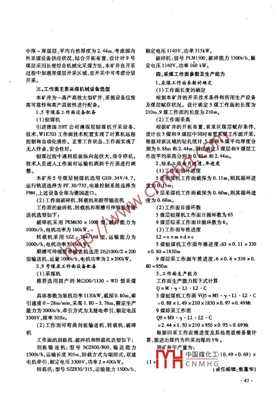 建元煤礦采煤工藝研究魯建國張新鵬(內(nèi)蒙古煤礦設(shè)計研究院有限責任公司,內(nèi)蒙古呼和浩特010010;內(nèi)蒙古榮達煤業(yè)集團有限公司,內(nèi)蒙古鄂爾多斯017000)摘要:根據(jù)建元煤礦 煤層賦存條件,經(jīng)過比選確定了各個煤層的采煤工藝,合理設(shè)置相關(guān)參數(shù),保證礦井的生產(chǎn)能力。關(guān)鍵詞:煤礦;采煤工藝;生產(chǎn)能力doi:10. 3969/j. issn. 1008 -0155. 2012.05022中圖分類號:F272.5;TD822文章編號:1008 -0155(2012)05 -0046 -02內(nèi)蒙古鄂托克旗建元煤焦化有限責任公司建根據(jù)煤層賦存狀況,結(jié)合國內(nèi)外采煤裝備水.元煤礦,隸屬于內(nèi)蒙古鄂托克旗建元煤焦化有限責平,該煤層可采用長壁滾簡采煤機綜合機械化采煤任公司,礦井所在地為鄂爾多斯市鄂托克旗阿爾巴方法、螺旋鉆采煤法及刨煤機機械化采煤方法三種斯蘇木。設(shè)計-井兩面,生產(chǎn)能力為1. 20MVa。高產(chǎn)高效采煤方法。一煤層賦存特征長壁滾簡采煤機綜合機械化采煤方法適用地1、5號謀層質(zhì)條件廣泛,生產(chǎn)率高,但是能耗較大,- -般在厚度5號煤層位于二疊系下統(tǒng)山西組第二巖段中0.8m~1.3m的煤層中采用爬底板式采煤機,由于部,煤層自然厚度0-1.40m,平均0.89m,可采區(qū)開采高度較小,工人工作條件差,移架推溜困難,特儲量利用厚度0. 70 ~1. 40m,平均0. 88m,煤層結(jié)別是在工作面設(shè)備出現(xiàn)故障的情況下,設(shè)備運輸、構(gòu)簡單,一般不含夾矸,局部含1層夾矸,夾矸巖性維修困難。為深灰-黑灰色泥巖或炭質(zhì)泥巖。頂板巖性為深螺旋鉆采煤法是解決薄煤層開采、提高煤炭資灰色泥巖或砂質(zhì)泥巖,底板巖性為砂質(zhì)泥巖泥巖源回收率的一種新型的采煤方法,該采煤技術(shù)能夠或炭質(zhì)泥巖。屬對比可靠,基本全區(qū)可采的較穩(wěn)定實現(xiàn)工作面無人開采,安全性能好,煤炭資源回收煤層。率高,但其設(shè)備布置較為困難,國內(nèi)成套布置的工2.9號謀層作面較少,該采煤技術(shù)實際應(yīng)用時間短,現(xiàn)場應(yīng)用9號煤層位于二疊系下統(tǒng)山西組第一巖段中較少,無成熟的經(jīng)驗可借鑒,具有- -定風險性。部,煤層自然厚度0.76 -6.90m,平均3.12m,可采刨煤機機械化采煤方法為目前薄煤層普遍采區(qū)儲量采用厚度0.76 ~5.60m,平均2. 44m,全區(qū)用的采煤方法,該采煤方法結(jié)構(gòu)簡單,能耗較低,塊發(fā)育且基本全區(qū)可采。煤層結(jié)構(gòu)簡單~復(fù)雜,含夾煤產(chǎn)率高,粉煤及煤塵少,司機不用跟機操作,安全矸0-6層,一般1 ~3層,由南向東北部夾矸層數(shù)性好,普遍適用于1. 3m以下的薄煤層中。有所增多。夾矸巖性為灰黑色泥巖及炭質(zhì)泥巖??紤]薄煤層采煤的適應(yīng)性、安全性、技術(shù)性及頂板巖性為泥巖及炭質(zhì)泥巖,局部為黏土巖,底板可操作性的要求,結(jié)合本礦井5號煤層實際特點,為砂質(zhì)泥巖及砂質(zhì)黏土巖,局部為炭質(zhì)泥巖。屬對適合選用技術(shù)成熟的刨煤機機械化采煤方法,設(shè)計比可靠,基本全區(qū)可采的較穩(wěn)定煤層。推薦采用刨煤機機械化采煤方法。二、采煤方法的選擇2.9號煤層采謀方法選擇1.5號煤層采煤方法選擇中國煤化工昌于管理,煤層為收稿日期:2011-12-27作者簡介:魯建國( 1979- ) .工學(xué)碩士.工程師.畢業(yè)于西安科技大MHC N M H G礦設(shè)計研究院有限責任公司礦并所任職:張新鵬(1978 -),畢業(yè)于西安礦業(yè)學(xué)院采礦工程專業(yè).現(xiàn)任內(nèi)蒙古榮達煤業(yè)集團有限公司總工程師?!?6.中厚~厚煤層,平均自然厚度為2.44m,考慮國內(nèi)額定電壓1140V ,功率315kW.外采煤設(shè)備供應(yīng)狀況,結(jié)合開拓布置,設(shè)計對9號破碎機:型號PLM1500,破碎能力1500/h, 額煤層采用長壁綜合機械化采煤方法,本礦井在開采定電壓1140V ,功率160 kW。過程中如遇厚煤層開采區(qū)域,在開采中可考慮分層四、采煤工作面參數(shù)及生產(chǎn)能力開采。1、采煤工作面參數(shù)的確定三、工作面主要采煤機械設(shè)備選型(1)工作面長度的確定本礦井為一高產(chǎn)高效大型礦井,采掘設(shè)備應(yīng)按根據(jù)本礦井的開采技術(shù)條件和所用生產(chǎn)設(shè)備高可靠性和高產(chǎn)高效性進行配備。及煤層賦存狀況。設(shè)計確定5煤工作面的長度為1、5號煤層工作面設(shè)備配備210m,9煤工作面的長度為210m。(1)刨煤機(2)工作面采高引進德國DBT公司薄煤層刨煤機開采設(shè)備、根據(jù)礦井的開拓布置,首采區(qū)煤層賦存條件,技術(shù), W1E703工作面技術(shù)配置實現(xiàn)了計算札遠程設(shè)計在5煤和9煤層中同時布置采煤工作面開采,控制和自動化操作。正常工作狀態(tài),工作面實現(xiàn)了根據(jù)對該區(qū)域的鉆孔統(tǒng)計,5煤和9煤平均厚度分無人作業(yè),安全性好。別為0.88m和2.44m ,因此確定5煤層和9煤層工刨煤過程中遇到底板縱向起伏大,指令停機,作面平均采高分別為0. 88m和2. 44m。技術(shù)人員進入工作面對運輸機調(diào)斜千斤頂進行調(diào)2、綜采工作面月進度、年進度整。(1)工作面循環(huán)進度本礦井5號煤層刨煤機選用CH9. 34V/4. 7,5層刨煤機工作面截深為0. 11m,則其循環(huán)進運行軌道選擇為PF. 30/732 ,電液控制系統(tǒng)選擇為度為0. 11m;PM4,.上述設(shè)備全部為德國進口。9層采煤機工作面截深為0.60m,則其循環(huán)進(2)工