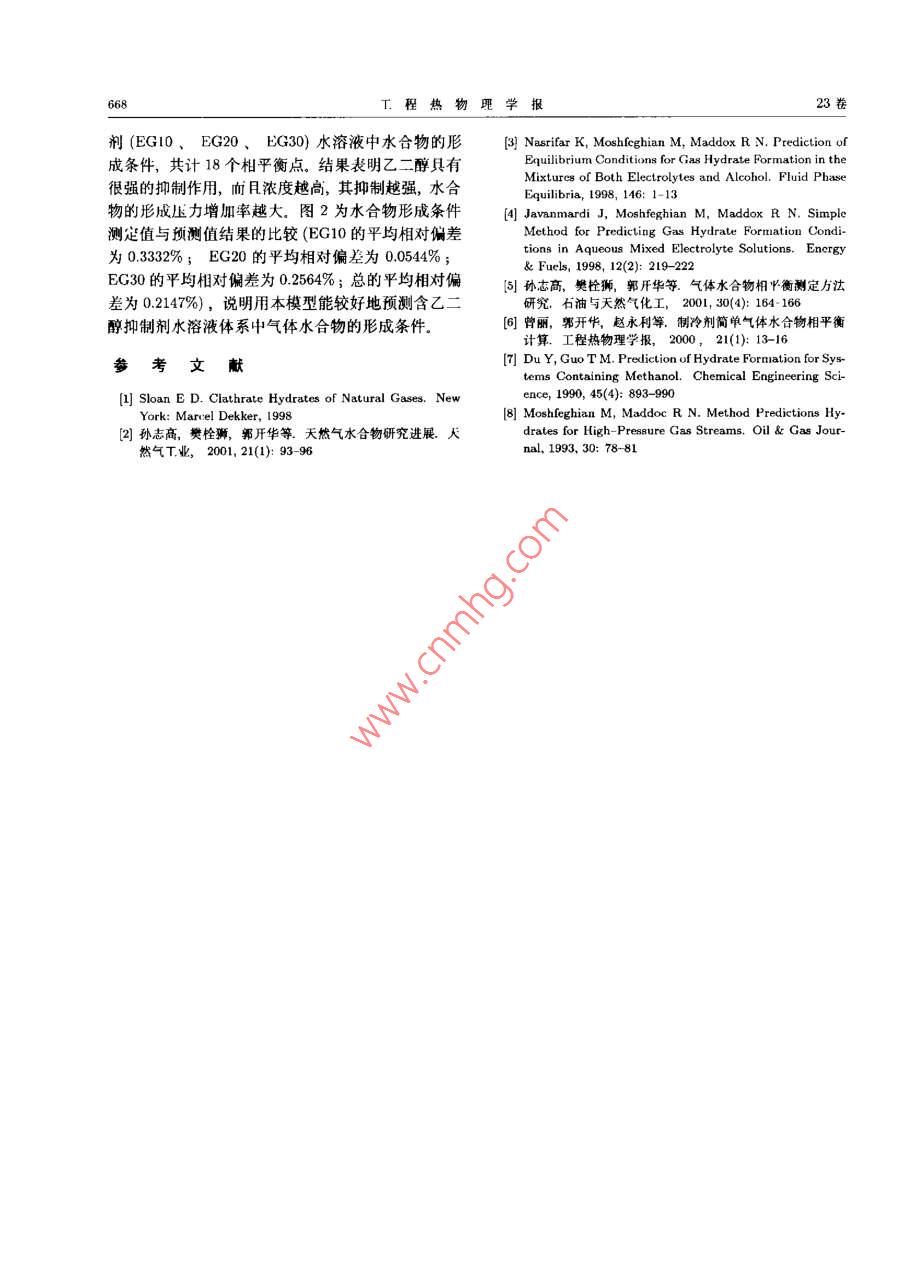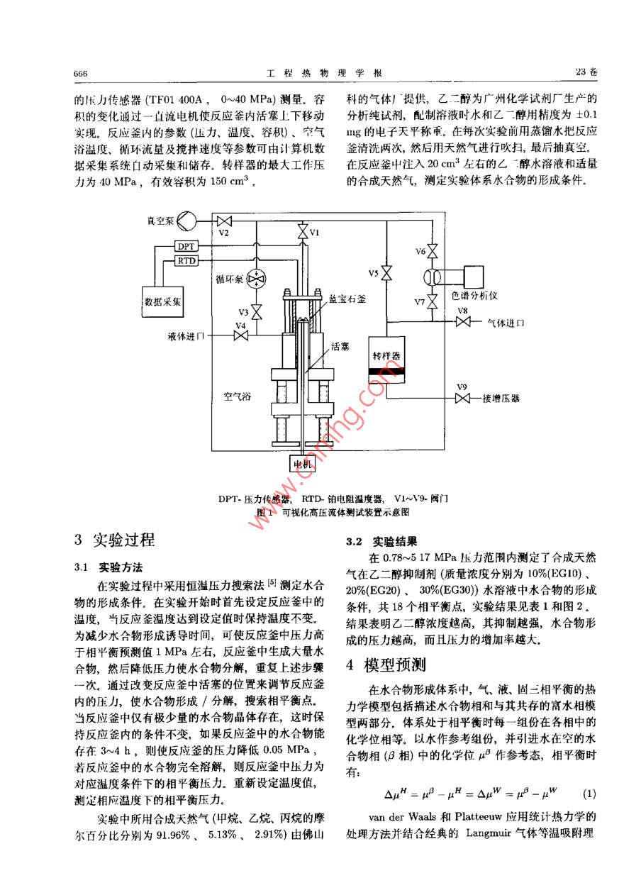 第23卷第6期工程熱物理學報Vol 23, No 62002年11月JOURNAL OF ENGINEERING THERMOPHYSICSNov.2002含乙二醇水合物形成條件理論與實驗研究孫志高1樊栓獅2郭開華2王如竹(1.上海交通大學機械與動力工程學院,上海200030;2.中國科學院廣州能源研究所,廣東廣州510070摘要利用可視化高壓流體測試裝置在078~57MPa壓力范圍內測定了乙二醇水溶液中合成天然氣(甲烷、乙烷和丙烷的混合物)水合物的形成條件,根據(jù) van der waals- Platteeuw的理想溶液等溫吸附理論和 Moshfeghian-Maddocd的敞學糗型,給出了含抑制劑體系氣體水合物相平衡計算數(shù)學模型.計算結果表明該模型可較好地預測含抑制劑(乙二醉)體系的水合物形成條件關鍵詞氣體水合物;乙二醇;相平衡;測定;預測中圖分類號TK026文獻標識碼:A文章編號:0253-231X(2002)06-066504THEORETICAL AND EXPERIMENTAL INVESTIGATIONON THE HYDRATE FORMATION CONDITIONSCONTAINING ETHYLENE GLY COLSUN Zhi-Gao! FAN Shuan-Shi2 GUO Kai-Hua2 WANG Ru-Zhu'(1. School of Mechanical Engineering, Shanghai Jiaotong University, Shanghai 200030, China;Abstract A set of visual high-pressure fluid measurement system is used to measure hydrate forma-tion conditions of synthetic natural gas, mixed by methane, ethane and propane, in aqueous solutionsof ethylene glycol in the pressure range of 0. 78 5 17 MPa. Based on van der Waals-Platteeuw adsorption isotherm theory and the model of Moshfeghian-Maddoc, a calculation model for gas hydratequilibrium included inhibitor has been developed. The calculation results show that the model canwell predict gas hydrate formation conditions in aqueous solutions of ethylene glycolKey words gas hydrate; ethylene glycol; Phase equilibrium; measurement; prediction1前言壓力范圍內水合物的形成條件進行了測定,建立了含抑制劑體系氣體水合物形成條件計算模型,并對氣體水合物是在一定的壓力和溫度條件下由氣本文所研究的體系進行了相平衡預測計算體分子填充水分子形成的晶格形成的種籠形晶體2實驗裝置有【型、[型和H型三種2。氣體水合物技術的圖1為實驗所用可視化高壓流體測試裝置示意應用已從最初的石油、天然氣工業(yè)擴展到化工、能圖,主要包括反應釜、攪拌與體積調節(jié)裝置、數(shù)據(jù)采源、環(huán)境等領域,在石油與天然氣的生產和輸送過集系統(tǒng)、真空泵、循環(huán)泵、恒溫空氣浴及氣相色譜分程形成的水合物會堵塞管道和設備,為防止水合物析儀等.反應釜是一可變容積的全透明藍寶石釜,的生成,一般采用添加抑制劑(甲醇、乙二醇)的方最有效工作體積為100cm3,最高工作壓力可達法2-4,含抑制劑氣體水合物形成條件的研究對石40MPa,溫度調節(jié)范圍為-20~120°.反應釜中油和天然氣工業(yè)具有重要的實用意義。我們利用可物質可通過攪拌器或循環(huán)泵進行混合,循環(huán)泵的最視化高壓流體測試裝置村含乙二醇體系的合成天然大流量為21.5cm3/h.反應釜中的溫度由鉑電阻測氣(甲烷、乙烷和丙烷的混合物)在078~57MPa量,精度為±0K;壓力用精度為0.060%(即24kPa)收稿日期:2001-11-23;修訂日期:200207-29基金項目國家自然科學基金資助項目(No0176051);廣東省自然科學基金資助項日(No.90039)作者簡介:孫志高(1967-),男,江蘇揚州人,講師,博+牛,主要從事水合物相態(tài)和儲氣技術等的研究物理學報的壓力傳感器(TF014004,0~40MPa)測量.容科的氣體丿提供,乙一醉為廣州化學試劑廠生產的積的變化通過一直流電機使反應釜內活塞上下移動分析純試劑,配制溶液時水和乙醇用精度為±0.1實現(xiàn),反應釜內的參數(shù)(力、溫度、容積)、空氣mg的電子天平稱幣。在每次實驗前用蒸餾水把反應浴溫度、循環(huán)流量及攪拌速度等參數(shù)可由計算機數(shù)釜清洗兩次,然后用天然氣進行吹掃,最后抽真空,據(jù)采集系統(tǒng)自動采集和儲存。轉樣器的最大工作壓在反應釜屮注入20cm3左右的乙醇水溶液和適量力為40MPa,有效容積為150cm的合成天然氣,測定實驗體系水合物的形成條件真空系6RTD循環(huán)泉數(shù)據(jù)采集益寶石釜v這色分析儀一氣體進口液體進冂活塞轉樣器空氣浴接增壓器電機DPT壓力傳感器,RTD鉑電阻溫度器,Vl~v9-網門圖1可視化高壓流體測試裝置示意圖3實驗過程32實驗結果在078~517MPa壓力范圍內測定了合成天然31實驗方法氣在乙二醇抑制劑(質量濃度分別為10%(EGI0在實驗過程中采用恒溫壓力搜索法同測定水合%(EG20)、30%(EG30))水溶液中水合物的形成物的形成條件,在實驗開始時首先設定反應釜中的條件,共18個相平衡點,實驗結果見表1和圖2溫度,當反應釜溫度達到設定值時保持溫度不變結果表明乙二醇濃度越高,其抑制越強,水合物形為減少水合物形成誘導時間,可使反應釜中壓力高成的壓力越高,而且壓力的增加率越大于相平衡預測值1MPa左右,反應釜中生成大量水合物,然后降低壓力使水合物分解,重復上述步驟4模型預測次,通過改變反應釜中活塞的位置來調節(jié)反應釜在水合物形成體系中,氣、液、固二相平衡的熱內的壓力,使水合物形成/分解,搜索相平衡點力學模型包括描述水合物相和與其共存的富水相模當反應釜中僅有極少量的水合物晶體存在,這時保型兩部分,體系處于相平衡時每一組份在各相中的持反應釜內的條件不變,如果反應金中的水合物能化學位相等.以水作參考組份,并引進水在空的水存在3~4h,則使反應金的壓力降低005MPa,合物相(B相)中的化學位p作參考態(tài),相平衡時若反應釜中的水合物完全溶解,則反應釜