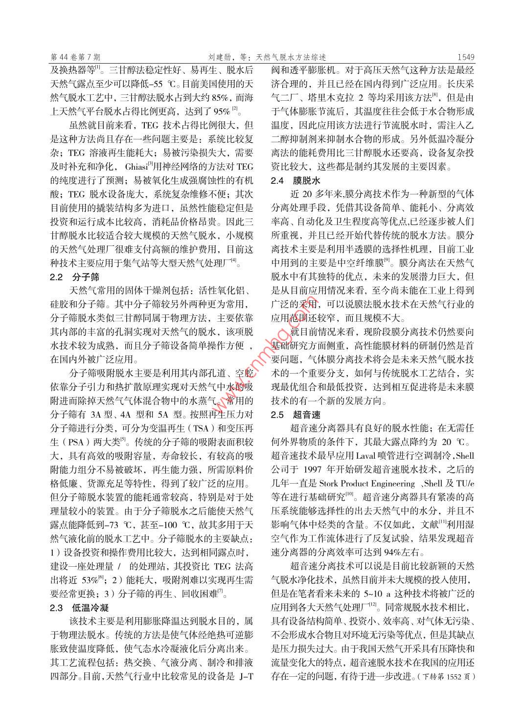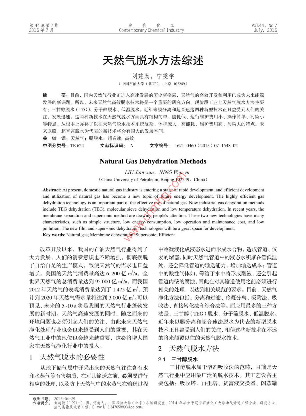 第44卷第7期化工Vvo1.44. No.72015年7月Contemporary Chemical IndustryJuly,2015天然氣脫水方法綜述劉建勛,寧雯宇(中國(guó)石油大學(xué)(北京),北京102249 )摘要:目前,國(guó)內(nèi)天然氣行業(yè)正進(jìn)入高速發(fā)展的歷史新格局,天然氣的高效開(kāi)發(fā)和利用已成為未來(lái)能源發(fā)展的新課題。所以,未來(lái)天然氣高效脫水技術(shù)將是-“ 個(gè)重要的研究方向。現(xiàn)階段工業(yè)上天然氣脫水方法主要有:三甘醇脫水(TEG)、分子篩脫水、低溫脫水。近年來(lái)膜分離和超音速這兩種新型技術(shù)正日益受到人們的關(guān)注,發(fā)展迅速。這兩種新技術(shù)在天然氣脫水方面具有結(jié)構(gòu)簡(jiǎn)單、能耗低、運(yùn)行維護(hù)費(fèi)用小、操作簡(jiǎn)單、污染小等特點(diǎn)。從根本上彌補(bǔ)了以往天然氣脫水技術(shù)系統(tǒng)復(fù)雜、體積龐大、高能耗、維護(hù)費(fèi)用高、污染大的特點(diǎn)。未來(lái)以膜、超音速脫水為代表的新技術(shù)將會(huì)有很大的發(fā)展空間。關(guān)鍵詞:天然氣;膜脫水;超音速;高效中圖分類號(hào): TE 624文獻(xiàn)標(biāo)識(shí)碼: A文章編號(hào): 1671-0460 (2015) 07-1548-02Natural Gas Dehydration MethodsLIU Jian-xun, NING Wen-yu( China University of Petroleum, Bejjing 102249,China)Abstract: At present, domestic natural gas industry is entering a stage of rapid development, and efficient developmentand utilization of natural gas has become a new topic of future energy development. The highly efcient gasdehydration technology is an important part of the efective use of natural gas. Now industrial gas dehydration methodsinclude TEG dehydration (TEG), molecular sieve dehydration and low temperature dehydration. In recent years, themembrane separation and supersonic method are drawing people's attention. These two new technologies have manycharateristics, such as simple structure, low energy consumption, low operation and maintenance cost, and lowpollution. The new film and supersonic dehydration technologies will be a great space for development.Key words: Natural gas; Membrane dehydration; Supersonic; Efficient改革開(kāi)放以來(lái),我國(guó)的石油天然氣行業(yè)得到了中冷凝液化成液態(tài)水進(jìn)而形成水合物,造成管道、儀大力發(fā)展,人們的消費(fèi)意識(shí)也不斷增強(qiáng),徹底擺脫表的堵塞,同時(shí)天然氣管道中的液態(tài)水積聚在管低洼了自給自足的生產(chǎn)模式,致使天然氣的需求也8益處,還會(huì)降低管道的輸送能力,增加輸送成本;管道增長(zhǎng)。美國(guó)的天然氣消費(fèi)量高達(dá)6 200億m/a,全中的酸性氣體如,等溶于水中將形成酸液,還會(huì)引起:世界天然氣的總消費(fèi)量達(dá)到95000億m'/a,而我國(guó)管道內(nèi)壁的腐蝕,因此在對(duì)其輸送使用之前必須進(jìn)行2012年天然氣的表觀消費(fèi)量達(dá)到了1475億m',預(yù)相關(guān)的處理,以達(dá)到相關(guān)規(guī)范的要求。目前,天然氣計(jì)到2020年天然氣需求量將達(dá)到3000億m'。可以凈化方法包括:分離和過(guò)濾、冷凝分離、吸附法、吸預(yù)見(jiàn),未來(lái)的5~10 a將是我國(guó)的天然氣行業(yè)蓬勃發(fā)收法、直接轉(zhuǎn)化法和綜合法等。而應(yīng)用最多的三種方展的新時(shí)期。天然氣高速發(fā)展的同時(shí),隨之而來(lái)的法是:三甘醇(TEG)脫水、分子篩脫水、低溫脫水。環(huán)境問(wèn)題也必須引起人們的關(guān)注,由此未來(lái)天然氣近年來(lái)以膜分離和超音速法脫水為代表的新型脫水凈化處理行業(yè)也會(huì)也來(lái)越受到人們的重視,其在天技術(shù)正日益受到人們的關(guān)注,相信這些新技術(shù)在不遠(yuǎn)然氣工業(yè)中的地位也會(huì)越來(lái)越重要,這必將增大國(guó)的將來(lái)顛 覆以往的天然氣脫水技術(shù)。家在天然氣凈化行業(yè)中的投入。2天然氣脫水方法1天然氣脫水的必要性2.1 三甘醇脫水從地下儲(chǔ)氣層中開(kāi)采出來(lái)的天然氣往往含有水三甘醇脫水屬于溶劑吸收法的范疇,目前是天和水蒸氣等有害物質(zhì),在對(duì)其輸送之前,必須要進(jìn)行然氣行業(yè)中應(yīng)用最廣泛的脫水技術(shù)。其工藝設(shè)備主相應(yīng)的處理,以及防止天然氣中的水蒸氣在輸送過(guò)程要包括: 吸收塔、再生塔、貧富液交換器、閃蒸罐收到日期: 2015-04-29.作者簡(jiǎn)介:劉建勛(1991-), 男,河南人,中國(guó)石油大學(xué)(北京)在讀研究生,2014年畢業(yè)于遼寧石油化工大學(xué)油氣儲(chǔ)運(yùn)工程專業(yè),研究方向:油氣集輸及地面工程。E-mail: 1 347058893@qq.com.第44卷第7期劉建勛,等:天然氣脫水方法綜述1549及換熱器等"。三甘醇法穩(wěn)定性好、易再生、脫水后閥和透平膨脹機(jī)。對(duì)于高壓天然氣這種方法是最經(jīng)天然氣露點(diǎn)至少可以降低- -55 C。目前美國(guó)使用的天濟(jì)合理的,并且已經(jīng)在國(guó)內(nèi)得到廣泛應(yīng)用。長(zhǎng)慶采然氣脫水工藝中,三甘醇法脫水占到大約85%,而海氣二廠、塔里木克拉2等均采用該方法”,但是由上天然氣平臺(tái)脫水占得比例更高,達(dá)到了95%”。于氣體膨脹節(jié)流后,其溫度往往會(huì)低于水合物形成雖然就目前來(lái)看,TEG 技術(shù)占得比例很大,但溫度,因此應(yīng)用該方法進(jìn)行節(jié)流脫水時(shí),需注人乙是這種方法尚且存在一.些問(wèn)題主要是:系統(tǒng)比較復(fù)二醇抑制劑來(lái)抑