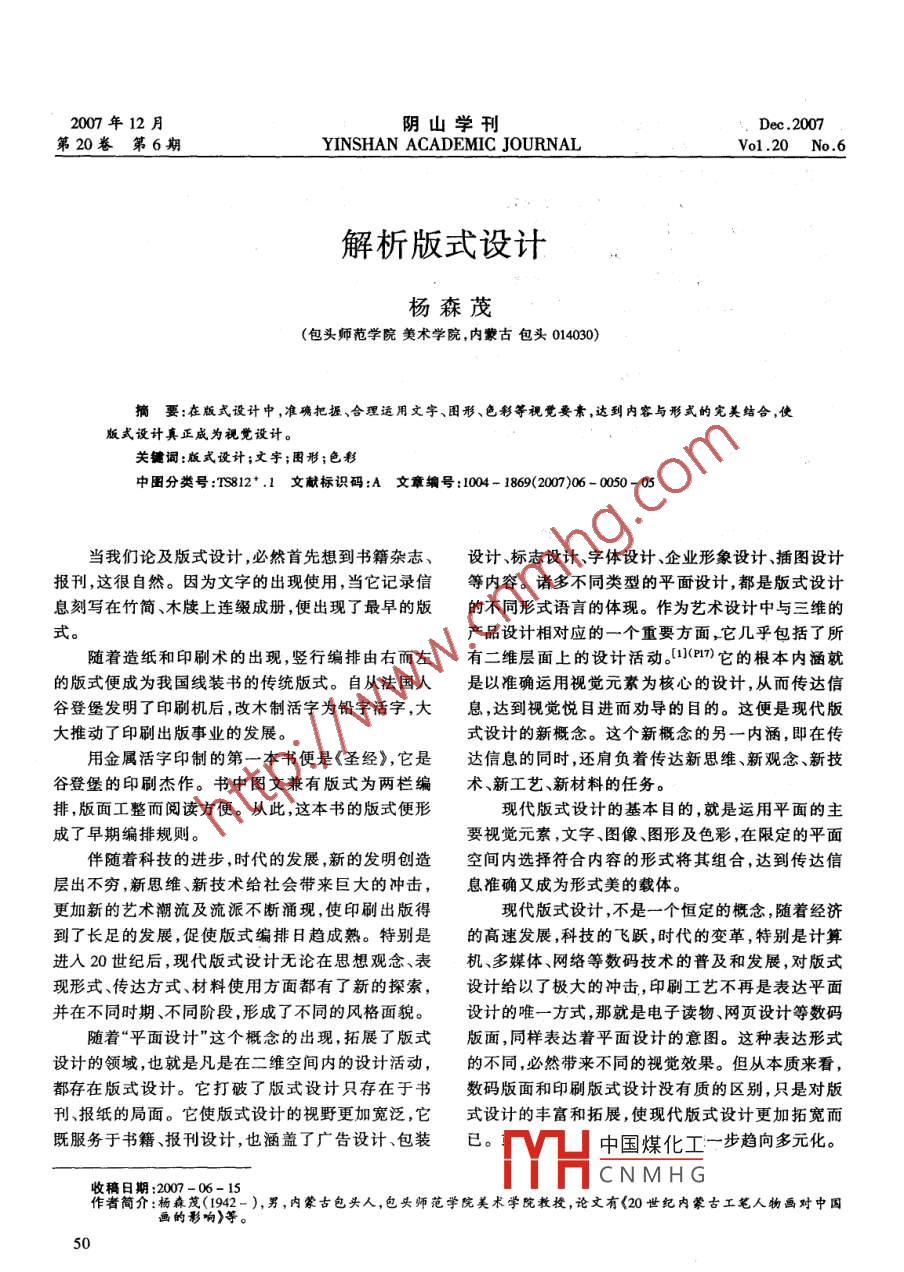 2007年12月陰山學(xué)刊Dec .2007.第20卷. 第6期YINSHAN ACADEMIC JOURNALVo1.20 No.6解析版式設(shè)計(jì)楊森茂(包頭師范學(xué)院美術(shù)學(xué)院,內(nèi)蒙古包頭014030)摘要:在版式設(shè)計(jì)中 ,準(zhǔn)確把握、合理運(yùn)用文字、困形、色彩等視覺(jué)要素,達(dá)到內(nèi)容與形式的完美結(jié)合,使版式設(shè)計(jì)真正成為視覺(jué)設(shè)計(jì)。關(guān)鍵詞:版式設(shè)計(jì);文字;困形;色彩中團(tuán)分類號(hào):TS812*.1文獻(xiàn)標(biāo)識(shí)碼:A 文章編 號(hào):1004- 1869(2007)06 - 0050- 05當(dāng)我們論及版式設(shè)計(jì),必然首先想到書籍雜志、設(shè)計(jì)、標(biāo)志設(shè)計(jì)、字體設(shè)計(jì)、企業(yè)形象設(shè)計(jì)、插圖設(shè)計(jì)報(bào)刊,這很自然。因?yàn)槲淖值某霈F(xiàn)使用,當(dāng)它記錄信等內(nèi)容。諸多不同類型的平面設(shè)計(jì),都是版式設(shè)計(jì)息刻寫在竹簡(jiǎn)、木牘上連綴成冊(cè),便出現(xiàn)了最早的版的不同形式語(yǔ)言的體現(xiàn)。作為藝術(shù)設(shè)計(jì)中與三維的式。產(chǎn)品設(shè)計(jì)相對(duì)應(yīng)的一個(gè)重要方面,它幾乎包括了所隨著造紙和印刷術(shù)的出現(xiàn),豎行編排由右而左有二維層面上的設(shè)計(jì)活動(dòng)。(1](P17)它的根本內(nèi)涵就的版式便成為我國(guó)線裝書的傳統(tǒng)版式。自從法國(guó)人是以準(zhǔn)確運(yùn)用視覺(jué)元素為核心的設(shè)計(jì),從而傳達(dá)信谷登堡發(fā)明了印刷機(jī)后,改木制活字為鉛字活字,大息,達(dá)到視覺(jué)悅目進(jìn)而勸導(dǎo)的目的。這便是現(xiàn)代版大推動(dòng)了印刷出版事業(yè)的發(fā)展。式設(shè)計(jì)的新概念。這個(gè)新概念的另一內(nèi)涵,即在傳.用金屬活字印制的第一本書便是《圣經(jīng)》,它是達(dá)信息的同時(shí),還肩負(fù)著傳達(dá)新思維、新觀念、新技谷登堡的印刷杰作。書中圖文兼有版式為兩欄編術(shù)、新工藝、新材料的任務(wù)。排,版面工整而閱讀方便。從此,這本書的版式便形現(xiàn)代版式設(shè)計(jì)的基本目的,就是運(yùn)用平面的主成了早期編排規(guī)則。要視覺(jué)元素,文字、圖像、圖形及色彩,在限定的平面伴隨著科技的進(jìn)步,時(shí)代的發(fā)展,新的發(fā)明創(chuàng)造空間內(nèi)選擇符合內(nèi)容的形式將其組合,達(dá)到傳達(dá)信層出不窮,新思維、新技術(shù)給社會(huì)帶來(lái)巨大的沖擊,息準(zhǔn)確又成為形式美的載體。更加新的藝術(shù)潮流及流派不斷涌現(xiàn),使印刷出版得現(xiàn)代版式設(shè)計(jì),不是一個(gè)恒定的概念,隨著經(jīng)濟(jì)到了長(zhǎng)足的發(fā)展,促使版式編排日趨成熟。特別是.的高速發(fā)展,科技的飛躍,時(shí)代的變革,特別是計(jì)算進(jìn)入20世紀(jì)后,現(xiàn)代版式設(shè)計(jì)無(wú)論在思想觀念、表機(jī)、多媒體、網(wǎng)絡(luò)等數(shù)碼技術(shù)的普及和發(fā)展,對(duì)版式現(xiàn)形式、傳達(dá)方式材料使用方面都有了新的探索,設(shè)計(jì)給以了極大的沖擊,印刷工藝不再是表達(dá)平面并在不同時(shí)期、不同階段,形成了不同的風(fēng)格面貌。設(shè)計(jì)的唯一方式,那就是電子讀物、網(wǎng)頁(yè)設(shè)計(jì)等數(shù)碼隨著“平面設(shè)計(jì)”這個(gè)概念的出現(xiàn),拓展了版式版面,同樣表達(dá)著平面設(shè)計(jì)的意圖。這種表達(dá)形式設(shè)計(jì)的領(lǐng)域,也就是凡是在二維空間內(nèi)的設(shè)計(jì)活動(dòng),的不同,必然帶來(lái)不同的視覺(jué)效果。但從本質(zhì)來(lái)看,都存在版式設(shè)計(jì)。它打破了版式設(shè)計(jì)只存在于書數(shù)碼版面和印刷版式設(shè)計(jì)沒(méi)有質(zhì)的區(qū)別,只是對(duì)版刊、報(bào)紙的局面。它使版式設(shè)計(jì)的視野更加寬泛,它式設(shè)計(jì)的豐富和拓展,使現(xiàn)代版式設(shè)計(jì)更加拓寬而既服務(wù)于書籍、報(bào)刊設(shè)計(jì),也涵蓋了廣告設(shè)計(jì)、包裝.已。中國(guó)煤化工一步趨向多元化。MHCNMHG收稿日期:2007 -06-15作者簡(jiǎn)介:楊森茂(1942-),男,內(nèi)蒙古包頭人,包頭師范學(xué)院美術(shù)學(xué)院教授,論文有<20世紀(jì)內(nèi)蒙古工筆人物畫對(duì)中國(guó)畫的影響)等。50把握好視覺(jué)語(yǔ)言的表達(dá)方式,才能較好地落實(shí)設(shè)計(jì)-、現(xiàn)代版式設(shè)計(jì)的基本原則意圖,表達(dá)好主題思想。版式設(shè)計(jì)本身不是目的,設(shè)計(jì)是為了更好的準(zhǔn)(一)文字要素一- 獲取信息的主要渠道。確傳達(dá)信息的一-種手段。版式設(shè)計(jì)中尤為主要的是文字。關(guān)鍵是諸多設(shè)版式設(shè)計(jì)的基本目的,是用設(shè)計(jì)的手段,將文計(jì)的標(biāo)題、副題、正文、注解等都離不開文字。讀者字、圖形、色彩等組織起來(lái),用最獨(dú)特、最準(zhǔn)確和最精在諸多設(shè)計(jì)中獲取信息的主渠道是文字,因而所用細(xì)的形式為讀者提供準(zhǔn)確的信息。這就要版面條理文字清晰、易辨、規(guī)范、統(tǒng)一是最起碼的條件。要想清晰,主題鮮明突出,起到誘導(dǎo)和增強(qiáng)讀者的注目力運(yùn)用好文字,首先要掌握文字的字體和字號(hào)。.和理解力的作用。文字的表現(xiàn)形式是字體,不同的字體字號(hào)給人版